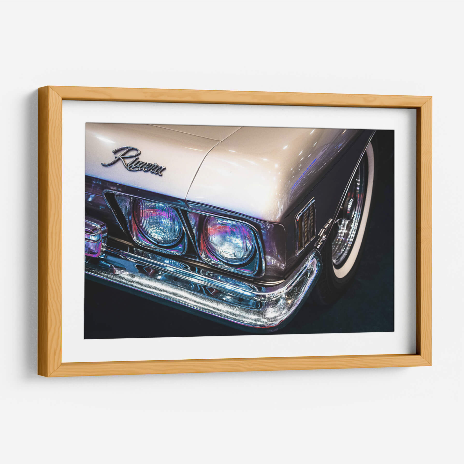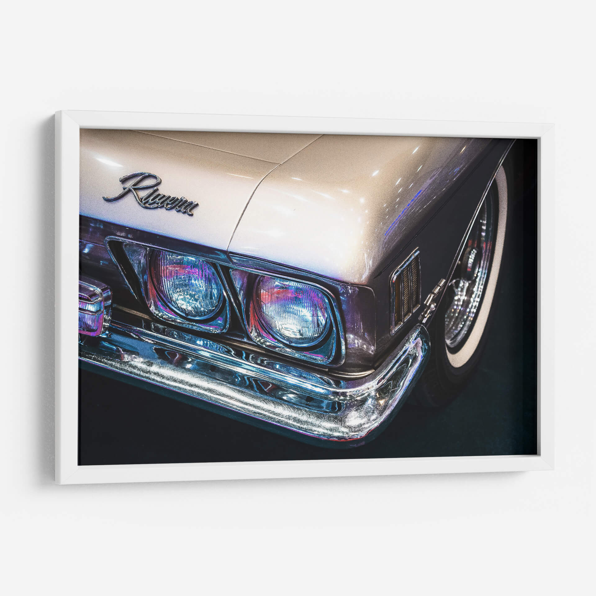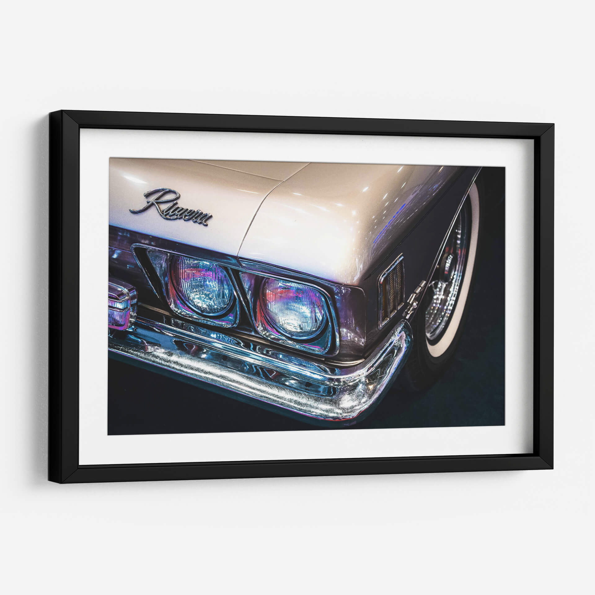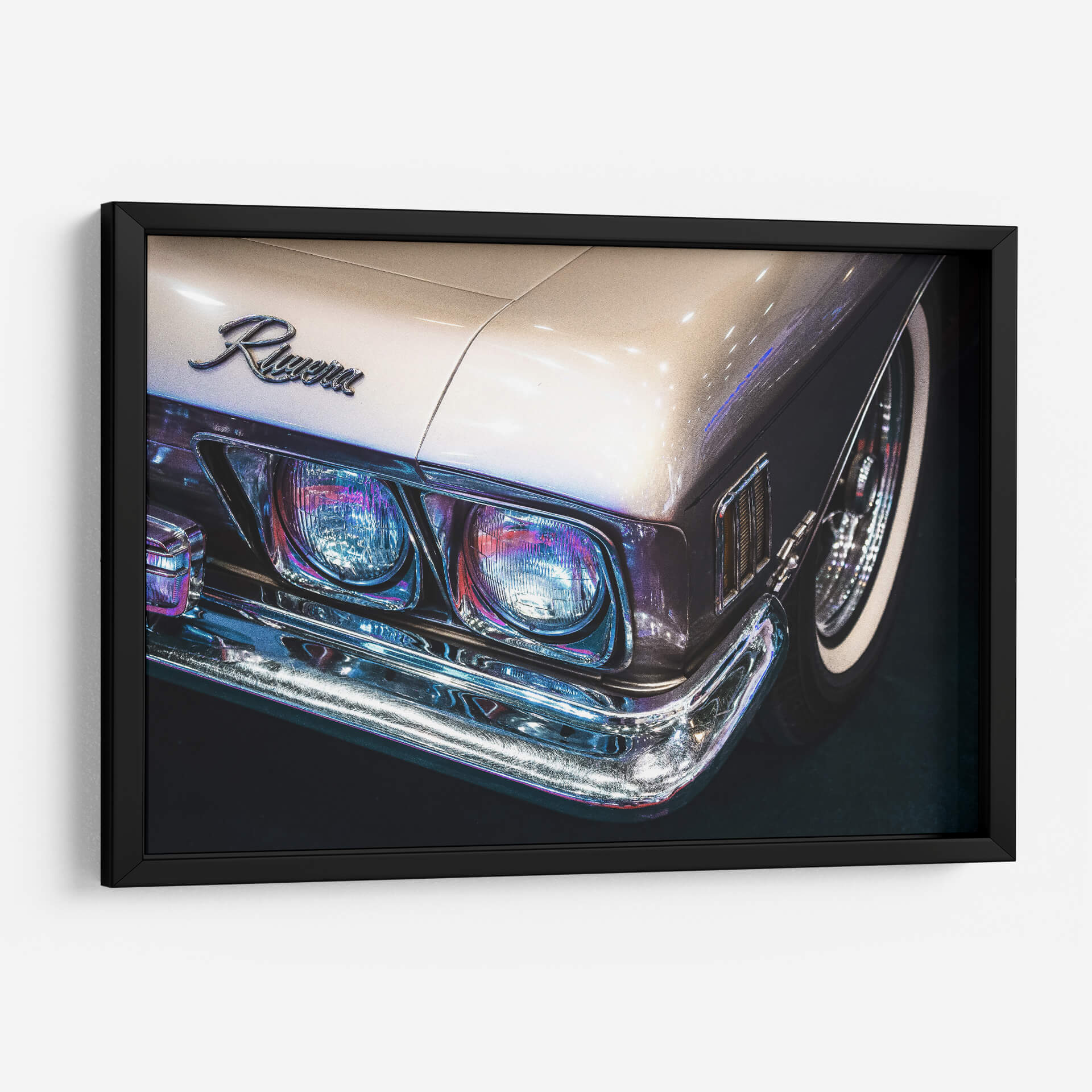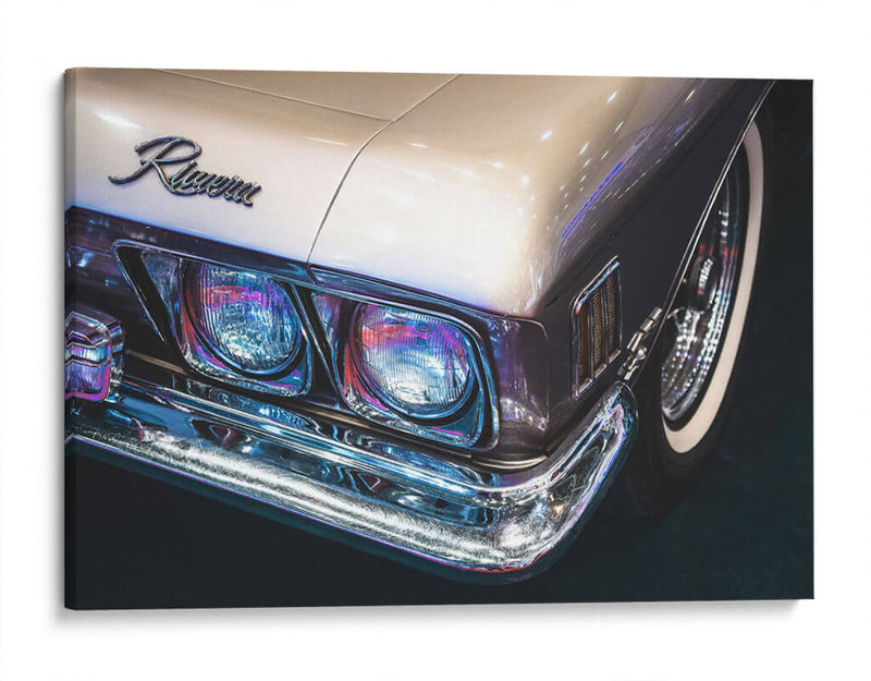 Captura la esencia de la nostalgia automotriz con este impresionante cuadro decorativo del Buick Riviera. Esta obra de arte se centra en los detalles icónicos del frontal del vehículo, destacando los faros dobles con reflejos vibrantes y el distintivo cromado que evoca una era de elegancia y potencia. Los colores predominantes, una mezcla de blancos nacarados y profundos tonos oscuros, se complementan con toques de morado y azul iridiscente en los reflejos de las luces, creando una atmósfera sofisticada y ligeramente retro. El estilo fotográfico, con un enfoque detallado en las curvas y el brillo del metal, aporta una sensación de lujo y precisión. Este cuadro es perfecto para los amantes de los coches clásicos y aquellos que buscan añadir un toque de carácter vintage a su decoración. Imagina este lienzo como el punto focal en tu sala de estar, garaje o estudio, invitando a la conversación y evocando recuerdos de una época dorada del diseño automotriz. Su composición dinámica y la calidad de la imagen hacen de este cuadro decorativo una pieza única para cualquier espacio que celebre el diseño y la historia del automóvil.