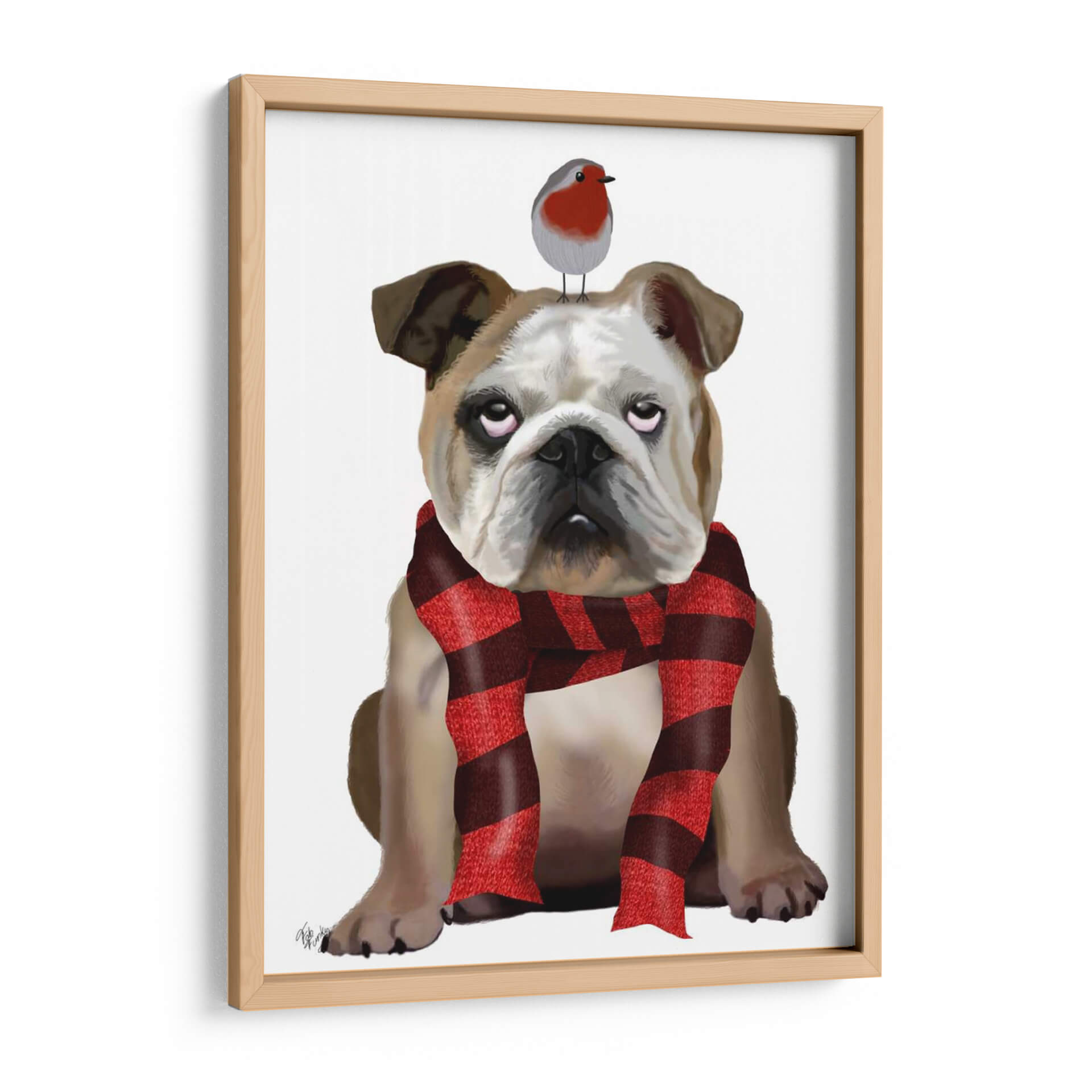 Embellece tu hogar con este encantador cuadro decorativo de un Bulldog Inglés luciendo una bufanda a rayas rojas y marrones, con un pequeño petirrojo posado en su cabeza. La obra, titulada 'Bulldog Inglés, Bufanda Y Robin' y creada por el artista Fab Funky, presenta un estilo contemporáneo y detallado que captura la personalidad única de esta querida raza. Los tonos cálidos de la bufanda contrastan sutilmente con el pelaje del perro y el vibrante rojo del petirrojo, creando una paleta de colores acogedora y atractiva. La composición centrada en el animal, con un fondo neutro, permite que la figura principal destaque, convirtiéndola en un punto focal ideal para cualquier habitación. Este cuadro es perfecto para amantes de los perros, entusiastas de la moda animal y cualquiera que busque añadir un toque de humor y calidez a su decoración. Imagina esta pieza en tu sala de estar, estudio u oficina, aportando una dosis de carácter y conversación. El detallado trabajo en la expresión del bulldog y las texturas de la bufanda añaden profundidad y realismo, haciendo de esta obra de arte una adición memorable a tu colección de decoración de pared.