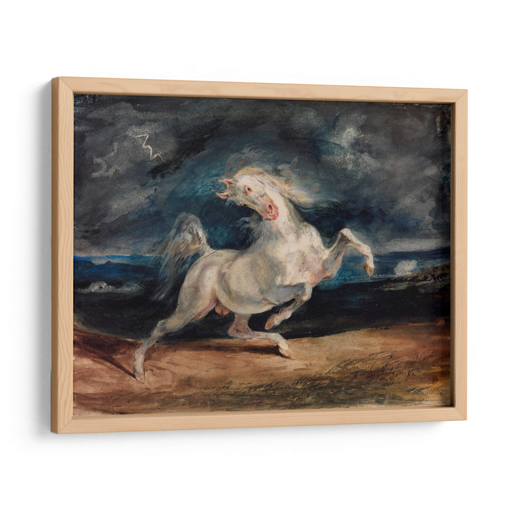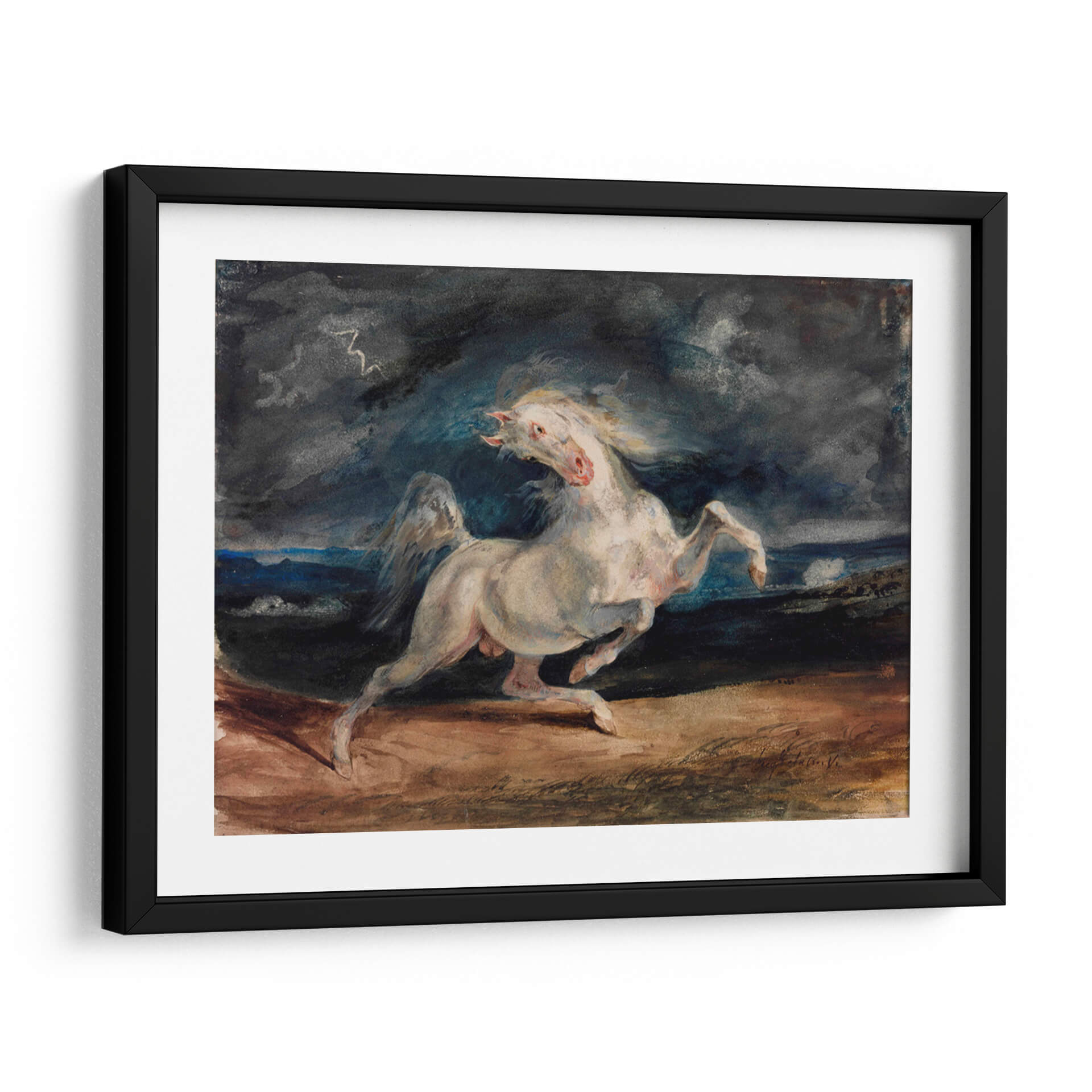 Captura la fuerza y el drama de la naturaleza con este impactante cuadro decorativo "Caballo asustado por una tormenta" del aclamado artista Eugène Delacroix. La obra maestra presenta un corcel blanco en plena carrera, con su crin al viento y una expresión de agitación que refleja la furia de un cielo tormentoso. Las nubes oscuras y densas, surcadas por relámpagos, crean un telón de fondo sombrío y cargado de energía, contrastando dramáticamente con la pureza y la vitalidad del animal. La paleta de colores, dominada por tonos grises, azules profundos y marrones terrosos, acentúa la atmósfera tensa y emocionante de la escena. Delacroix, maestro del Romanticismo, utiliza pinceladas expresivas y un juego de luces y sombras para infundir a la obra un dinamismo y una profundidad emocional excepcionales. Este cuadro decorativo es perfecto para aquellos que buscan añadir un toque de intensidad y movimiento a su hogar u oficina, convirtiéndose en un punto focal que evoca poder, resiliencia y la indomable conexión entre la criatura y los elementos. Ideal para salones, estudios o cualquier espacio que desee una dosis de arte dramático y evocador.