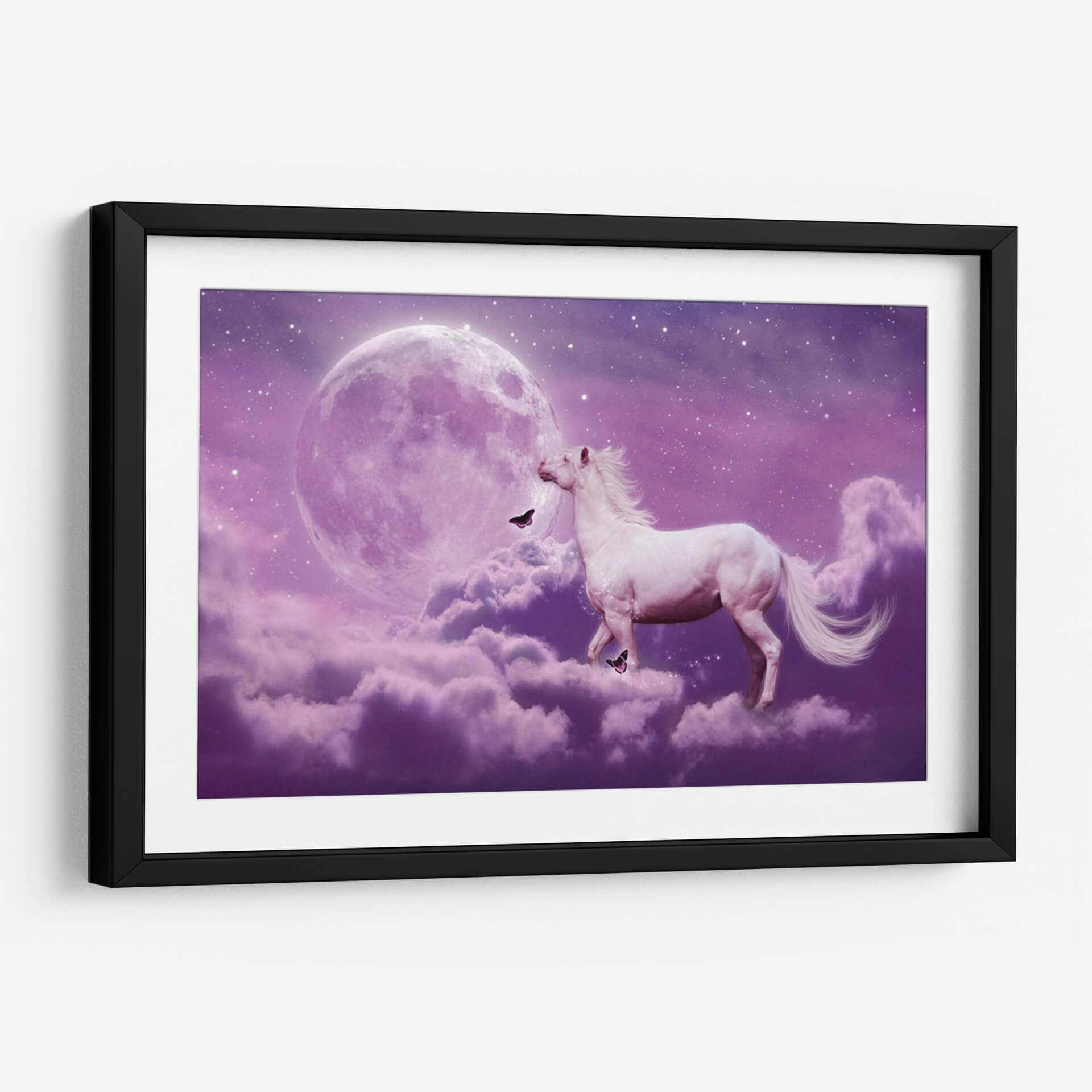 Sumérgete en un paisaje onírico con "Caballo Lunar", una obra de arte digital que evoca la magia y la serenidad del cosmos. Esta pieza cautivadora presenta un majestuoso caballo blanco, cuya figura etérea parece flotar entre nubes púrpuras y un cielo estrellado. La imponente luna llena, teñida de un suave tono lavanda, domina el fondo, creando una atmósfera de ensueño y misterio. Mariposas delicadas revolotean alrededor del caballo, añadiendo un toque de fantasía y delicadeza a la composición. Los colores predominantes, una sinfonía de púrpuras y blancos, transmiten calma y tranquilidad, haciendo de este cuadro una adición perfecta para cualquier espacio que busque inspiración y paz. Su estilo, cercano al surrealismo fantástico, permite que la imaginación vuele, ideal para dormitorios, salas de estar o cualquier rincón donde desees infundir una sensación de maravilla y escapar de lo cotidiano. "Caballo Lunar" no es solo una decoración; es una invitación a explorar los límites de la fantasía y la belleza serena, un punto focal que inspira sueños y conversaciones. Añade un toque de encanto celestial y serenidad a tu hogar con este cuadro decorativo único.
