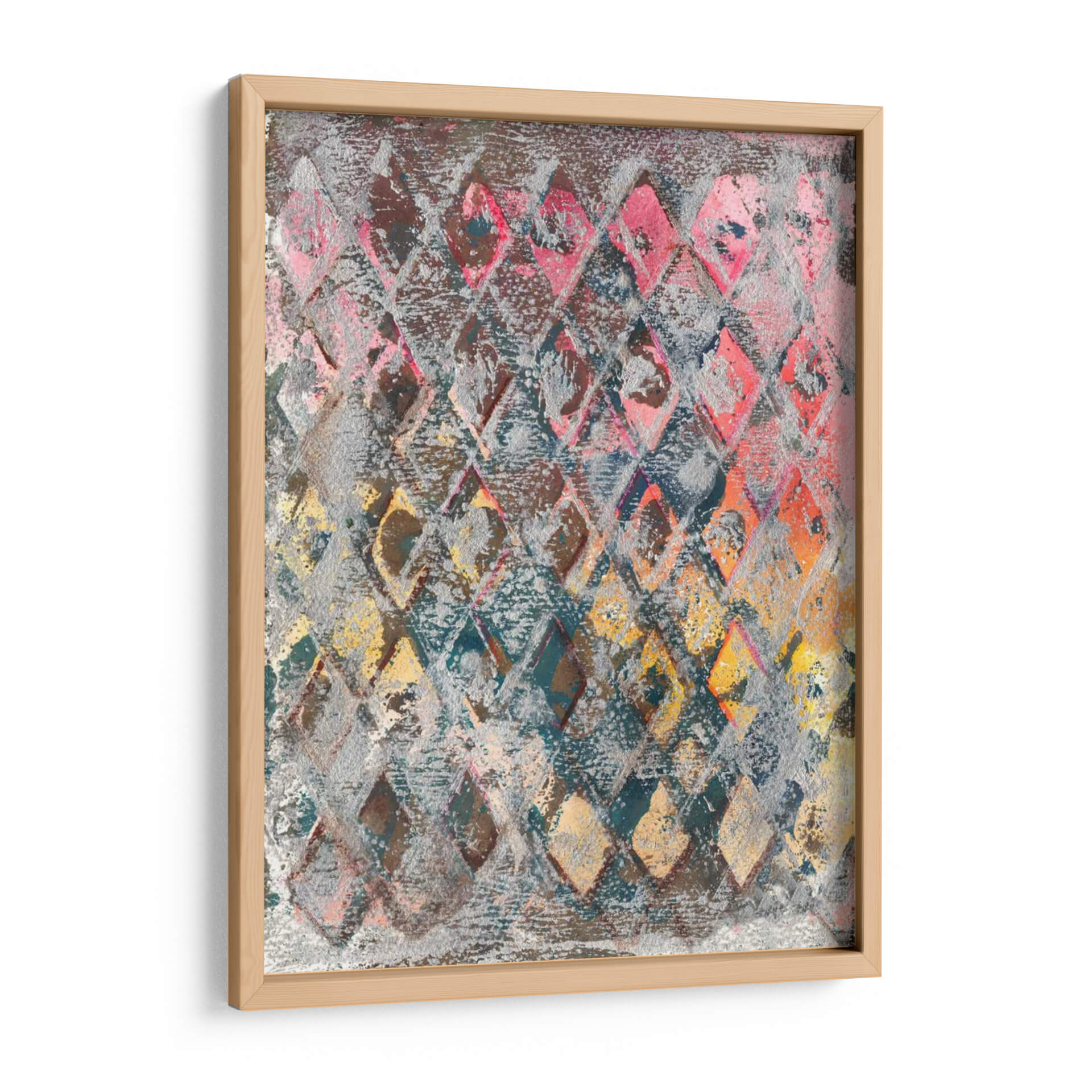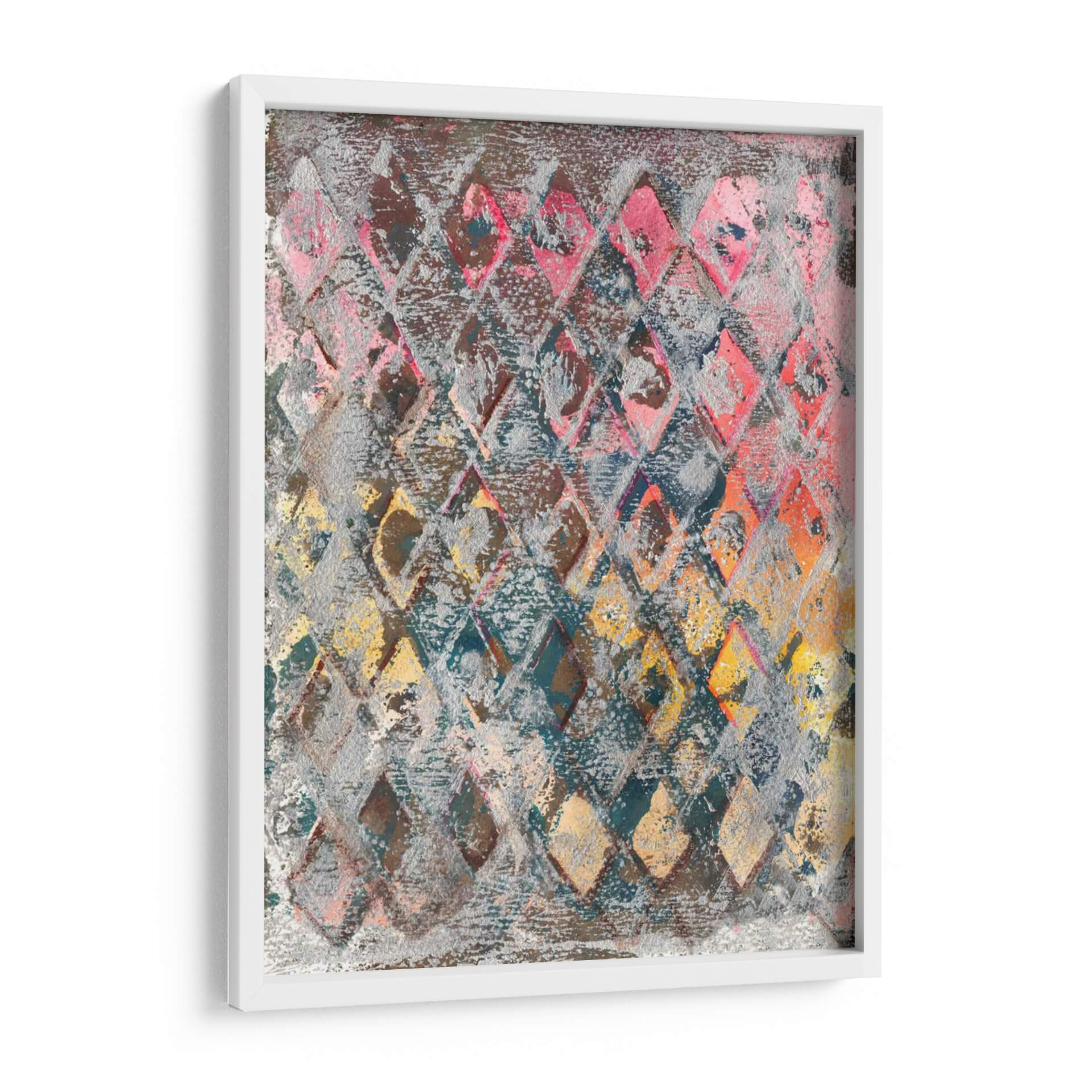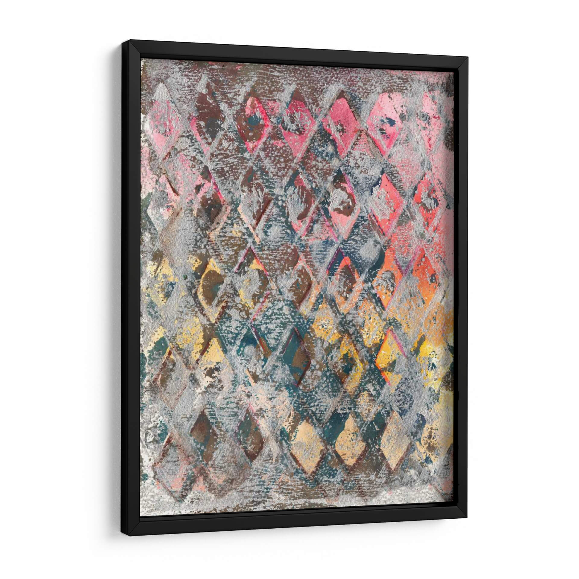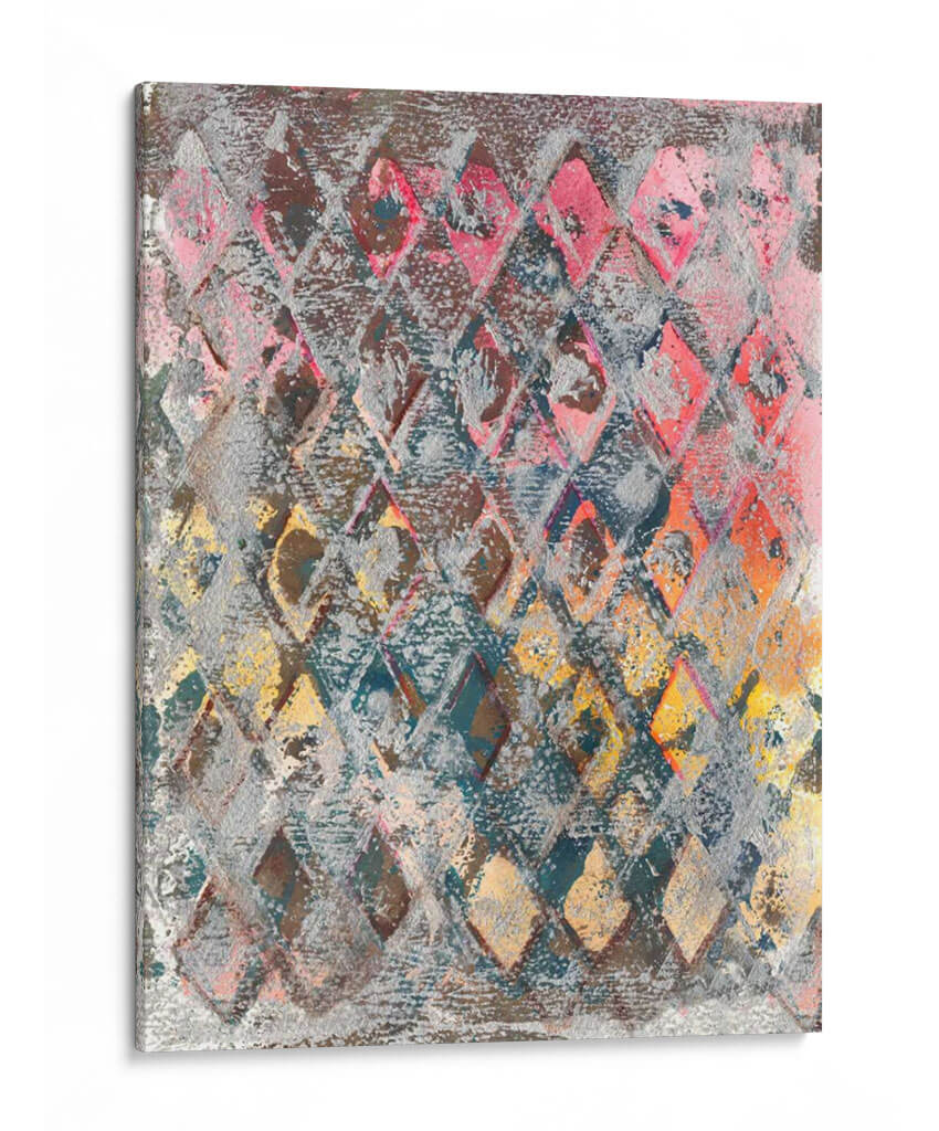 Sumérgete en la vibrante energía de "Cableado Para La Primavera Iii", una obra de arte contemporáneo que irradia dinamismo y un toque de sofisticación. Este cuadro decorativo presenta una intrincada red de rombos en tonos variados, desde profundos azules y grises hasta cálidos rosas, naranjas y amarillos, creando un efecto visual cautivador. La textura rica y la superposición de colores sugieren una profundidad y complejidad que invitan a la contemplación. El estilo abstracto, con reminiscencias de patrones textiles o celosías, aporta un elemento moderno y a la vez orgánico a la composición. Es una pieza versátil, ideal para espacios que buscan un acento de color y carácter, como una sala de estar contemporánea, un estudio creativo o incluso un dormitorio principal con una paleta de colores más neutra para que esta obra destaque. "Cableado Para La Primavera Iii" no es solo un elemento decorativo, sino una expresión artística que añade profundidad, interés visual y un toque de color primaveral a cualquier ambiente, transformando paredes vacías en declaraciones de estilo audaces. Déjate inspirar por la fusión de formas geométricas y la expresividad cromática que Joyce Combs ha plasmado en esta pieza única.