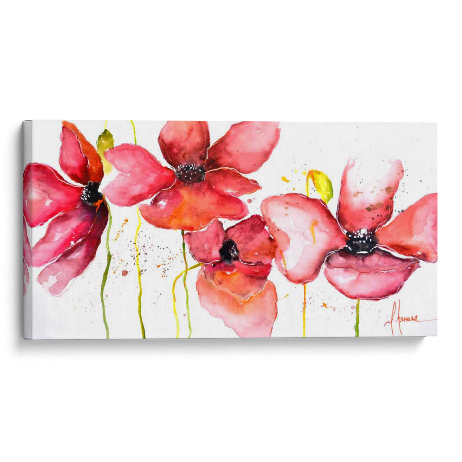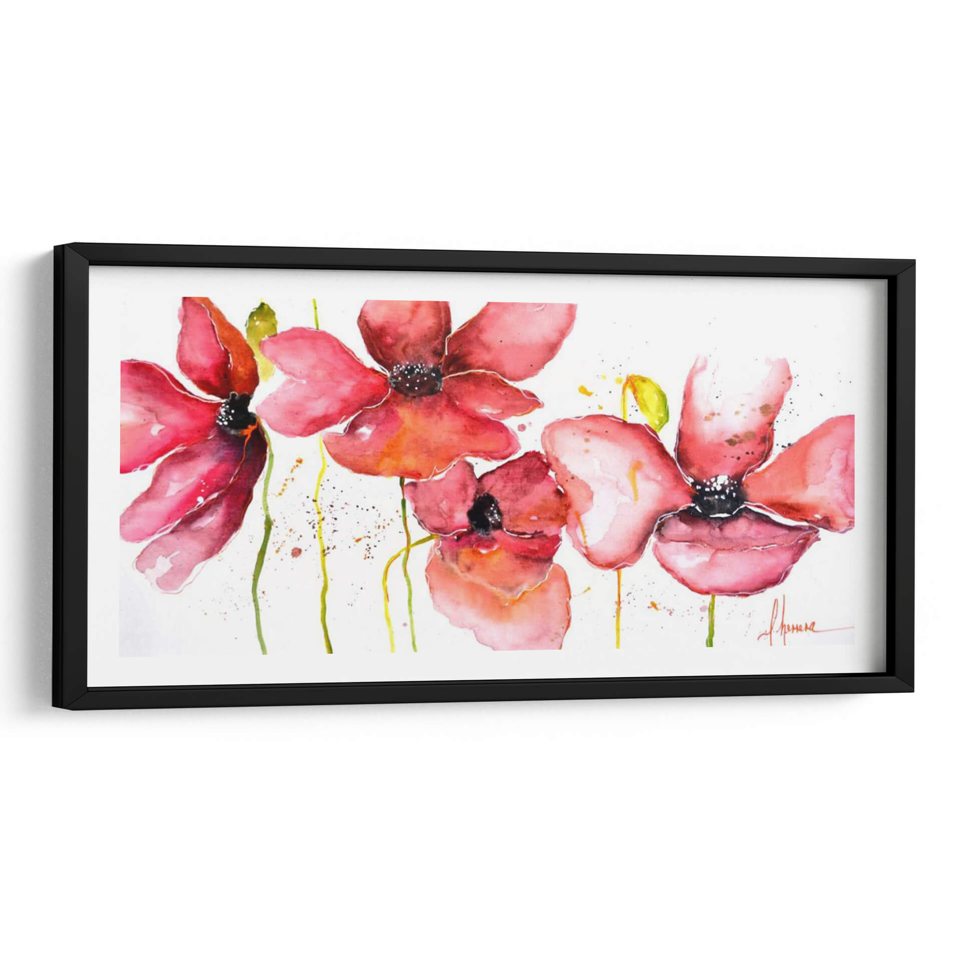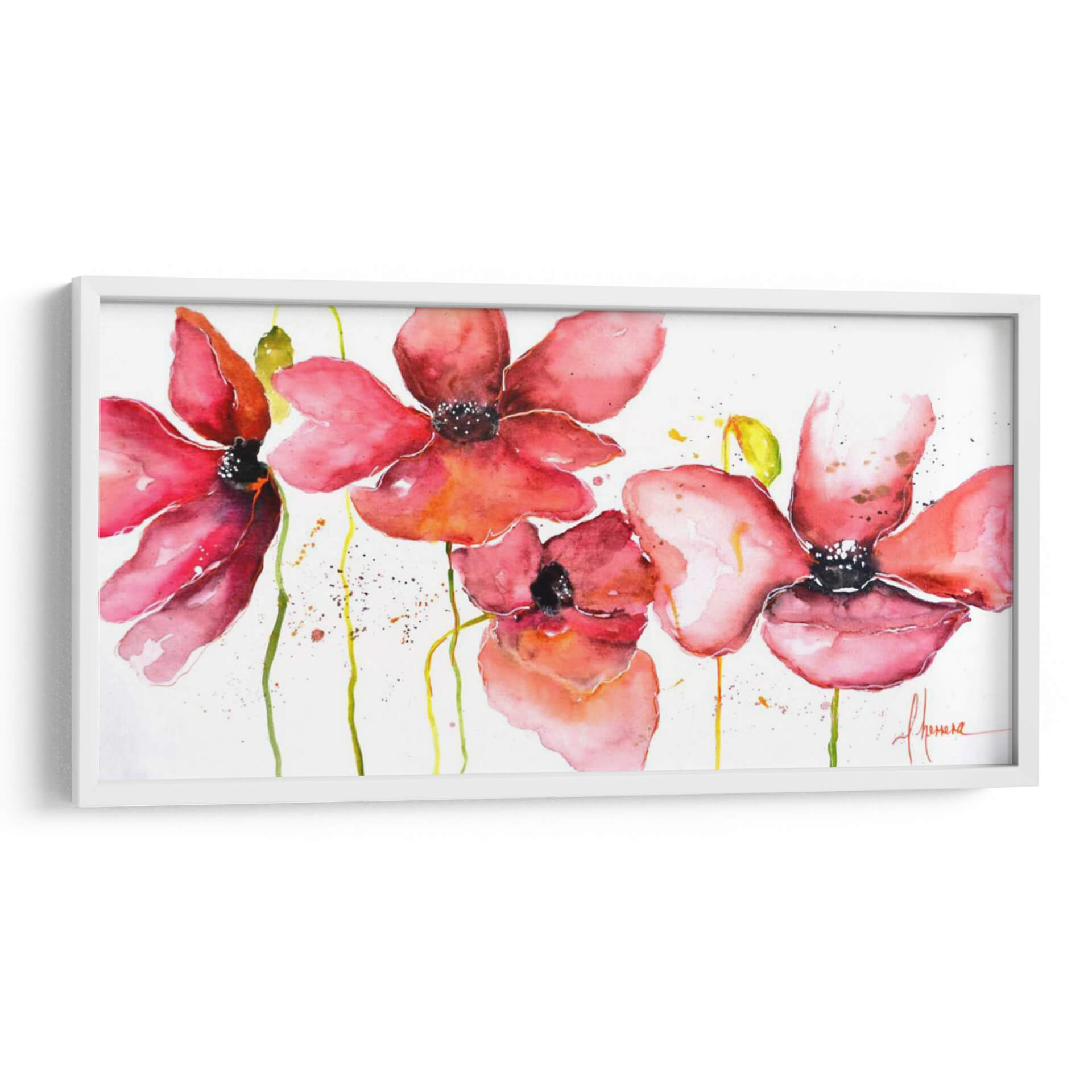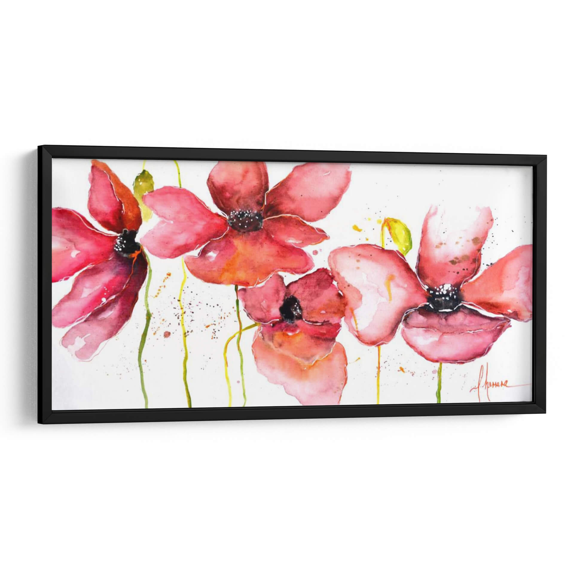 Sumérgete en la delicadeza y el vibrante encanto de "Campo", una obra de arte que captura la esencia de la naturaleza con una perspectiva fresca y contemporánea. La artista Leticia Herrera nos presenta una composición floral etérea, donde las amapolas rojas y rosadas emergen sobre un fondo blanco y limpio, salpicado con sutiles toques de amarillo y verde. La técnica de acuarela utilizada aporta una fluidez y transparencia únicas, creando pétalos que parecen danzar al viento y tallos que se extienden con gracia. La paleta de colores, dominada por cálidos rojos y rosados intensos, evoca sentimientos de pasión, alegría y vitalidad, mientras que las pinceladas sueltas y las manchas de pintura añaden un toque de espontaneidad y modernidad. Este cuadro decorativo es una invitación a la contemplación, ideal para infundir vida y un soplo de aire fresco en cualquier espacio. Su estilo contemporáneo y su temática floral lo convierten en una pieza versátil, perfecta para salones, dormitorios o incluso oficinas, añadiendo un punto de color y una atmósfera serena. "Campo" es más que una imagen; es una experiencia visual que conecta con la belleza efímera de las flores y la energía positiva de la naturaleza.