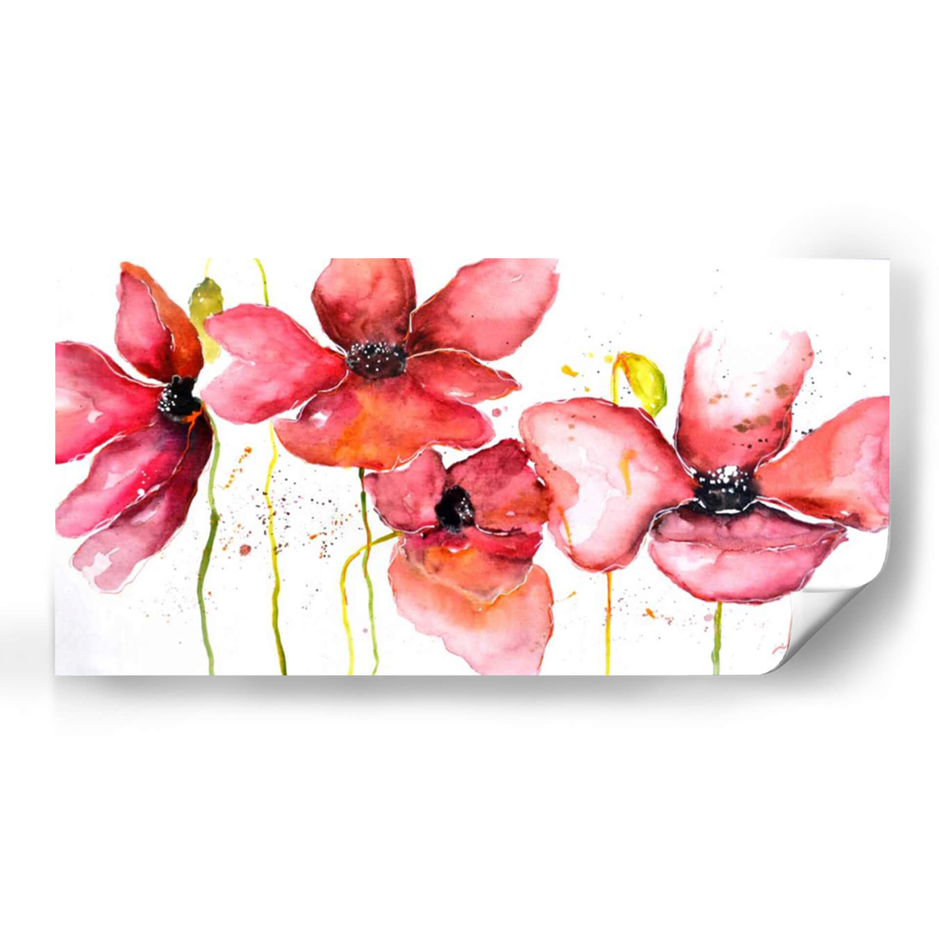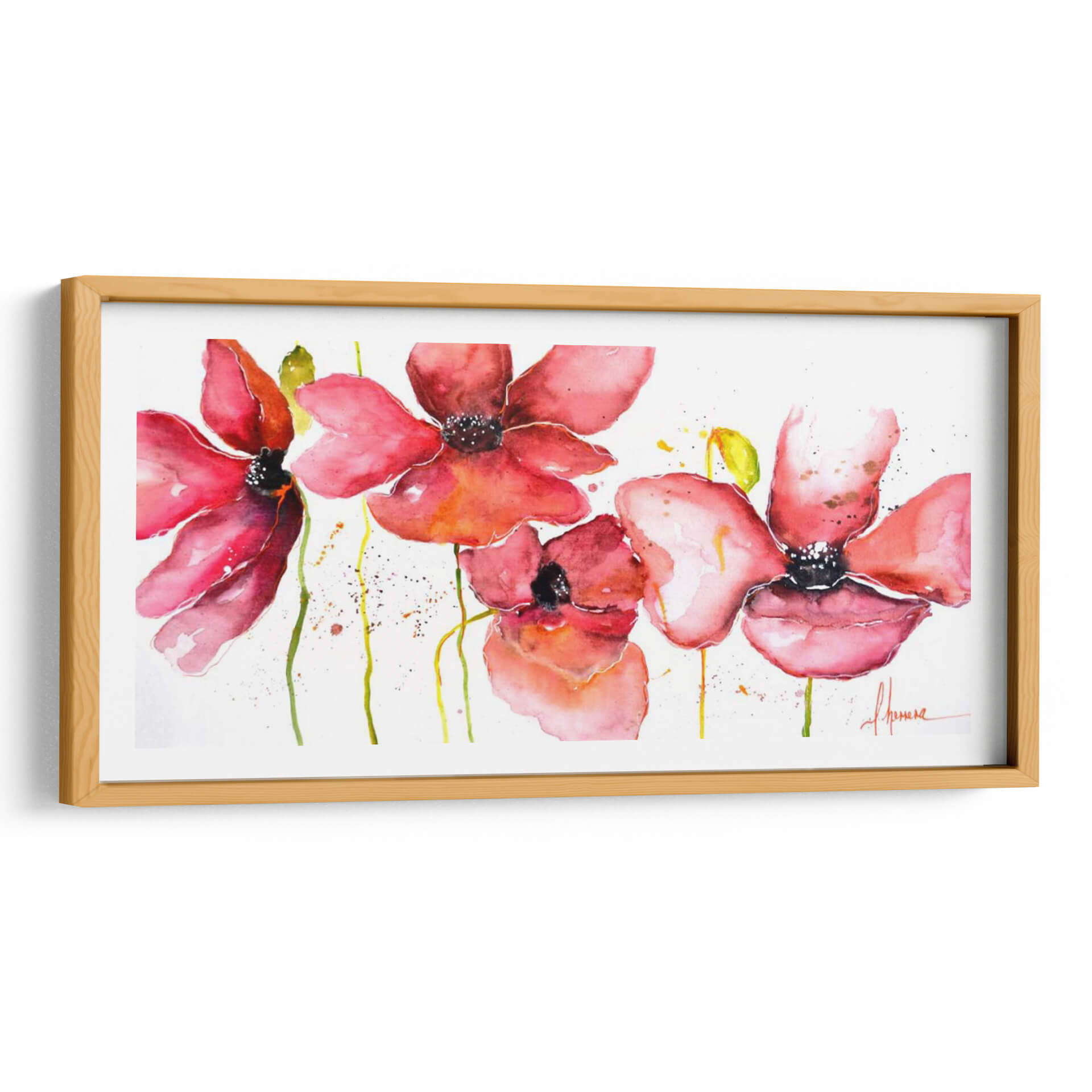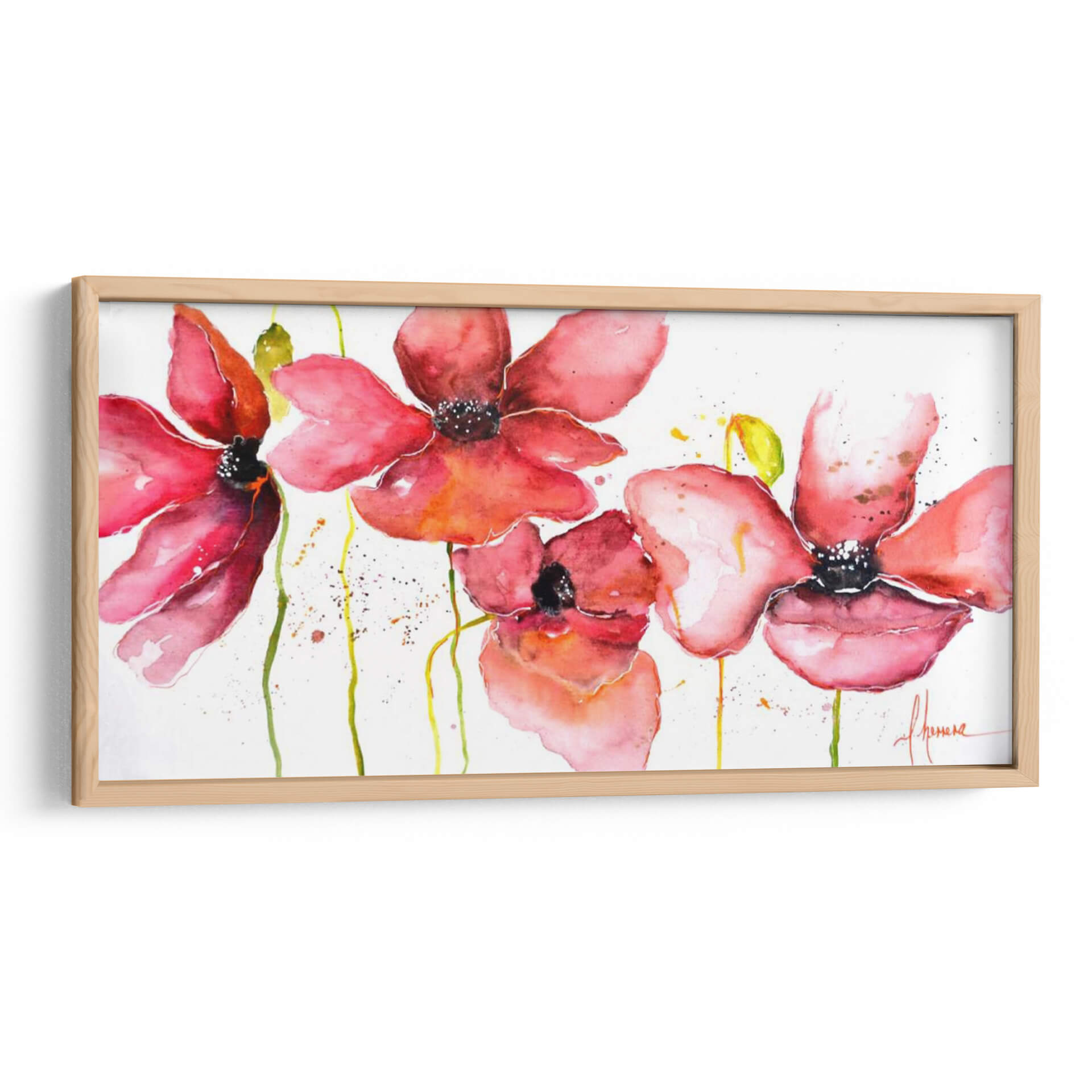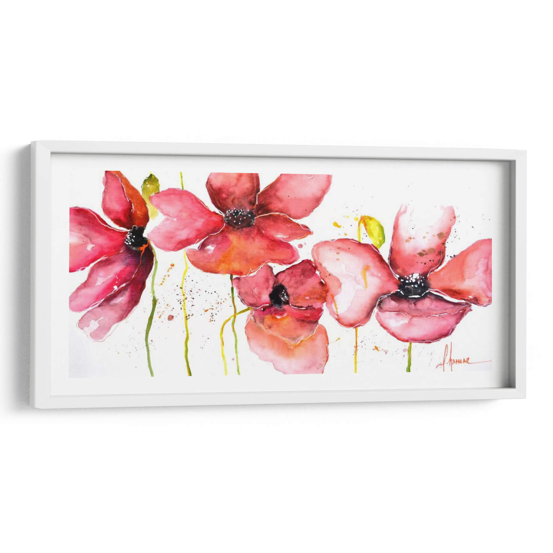 Sumérgete en la delicadeza y el vibrante encanto de "Campo", una obra de arte que captura la esencia de la naturaleza con una perspectiva fresca y contemporánea. La artista Leticia Herrera nos presenta una composición floral etérea, donde las amapolas rojas y rosadas emergen sobre un fondo blanco y limpio, salpicado con sutiles toques de amarillo y verde. La técnica de acuarela utilizada aporta una fluidez y transparencia únicas, creando pétalos que parecen danzar al viento y tallos que se extienden con gracia. La paleta de colores, dominada por cálidos rojos y rosados intensos, evoca sentimientos de pasión, alegría y vitalidad, mientras que las pinceladas sueltas y las manchas de pintura añaden un toque de espontaneidad y modernidad. Este cuadro decorativo es una invitación a la contemplación, ideal para infundir vida y un soplo de aire fresco en cualquier espacio. Su estilo contemporáneo y su temática floral lo convierten en una pieza versátil, perfecta para salones, dormitorios o incluso oficinas, añadiendo un punto de color y una atmósfera serena. "Campo" es más que una imagen; es una experiencia visual que conecta con la belleza efímera de las flores y la energía positiva de la naturaleza.