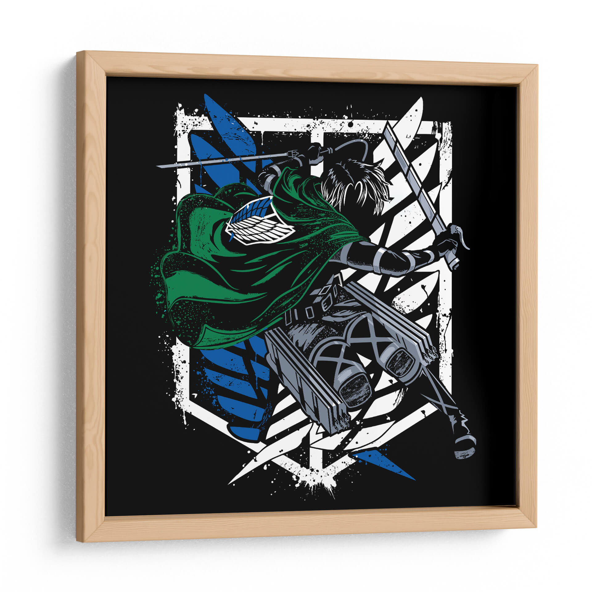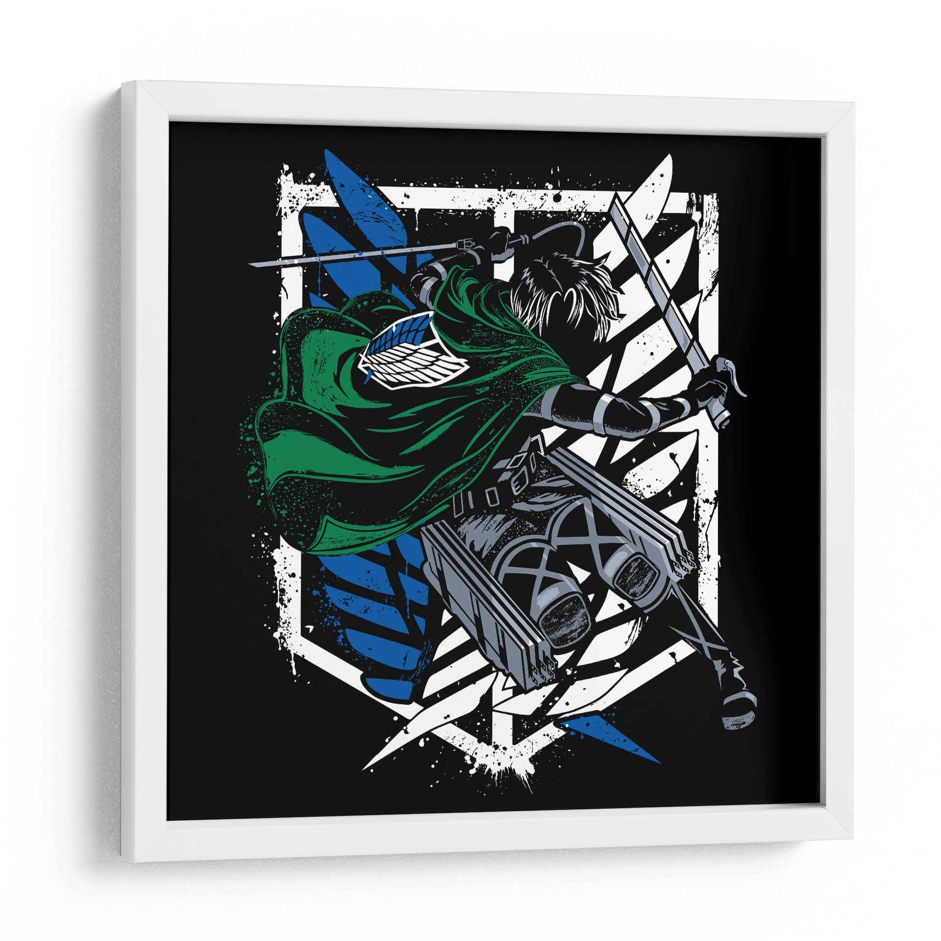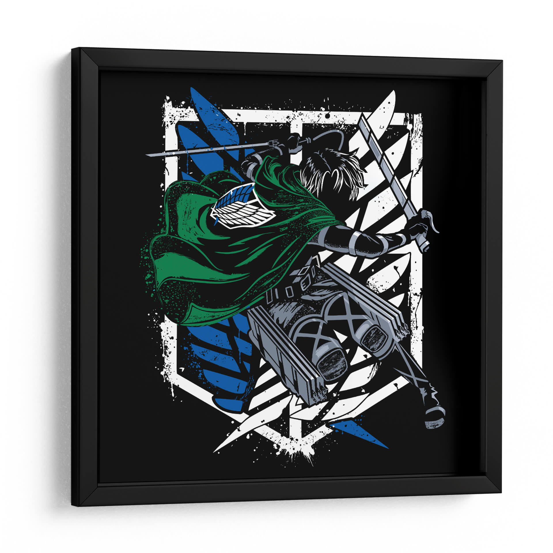 Captura la esencia de la acción y la determinación con este impactante cuadro decorativo del Capitán Levi Ackerman. La obra presenta una figura dinámica, envuelta en su icónico manto verde, empuñando dos espadas con una pose de combate intensa. El contraste entre el negro profundo del fondo y los vibrantes azules y blancos del emblema de las Alas de la Libertad crea un efecto visual potente y moderno. Los detalles de salpicaduras de pintura añaden una textura cruda y enérgica, que evoca el fragor de la batalla y la fuerza inquebrantable del personaje. Este arte de pared es perfecto para los aficionados que buscan infundir a sus espacios un espíritu de valentía y resistencia. Ideal para dormitorios, salas de estar o estudios, este cuadro decorativo se convertirá en un punto focal cautivador, inspirando coraje y admiración. Su estilo gráfico y audaz lo hace un complemento excepcional para decoraciones contemporáneas o temáticas, añadiendo un toque de carácter y una narrativa visual que resuena con la intensidad del universo del que proviene.