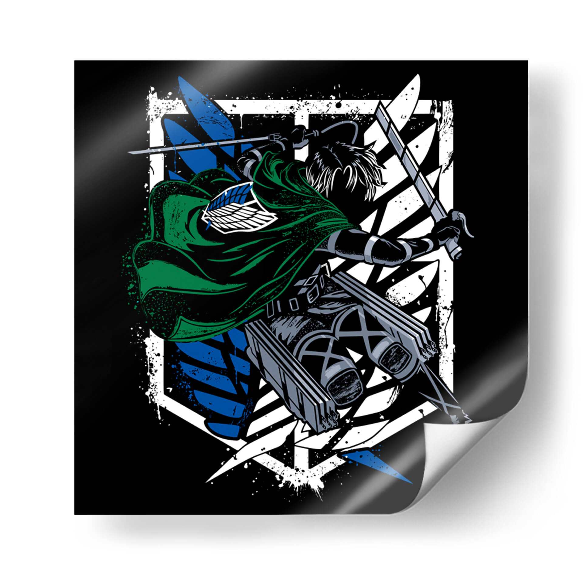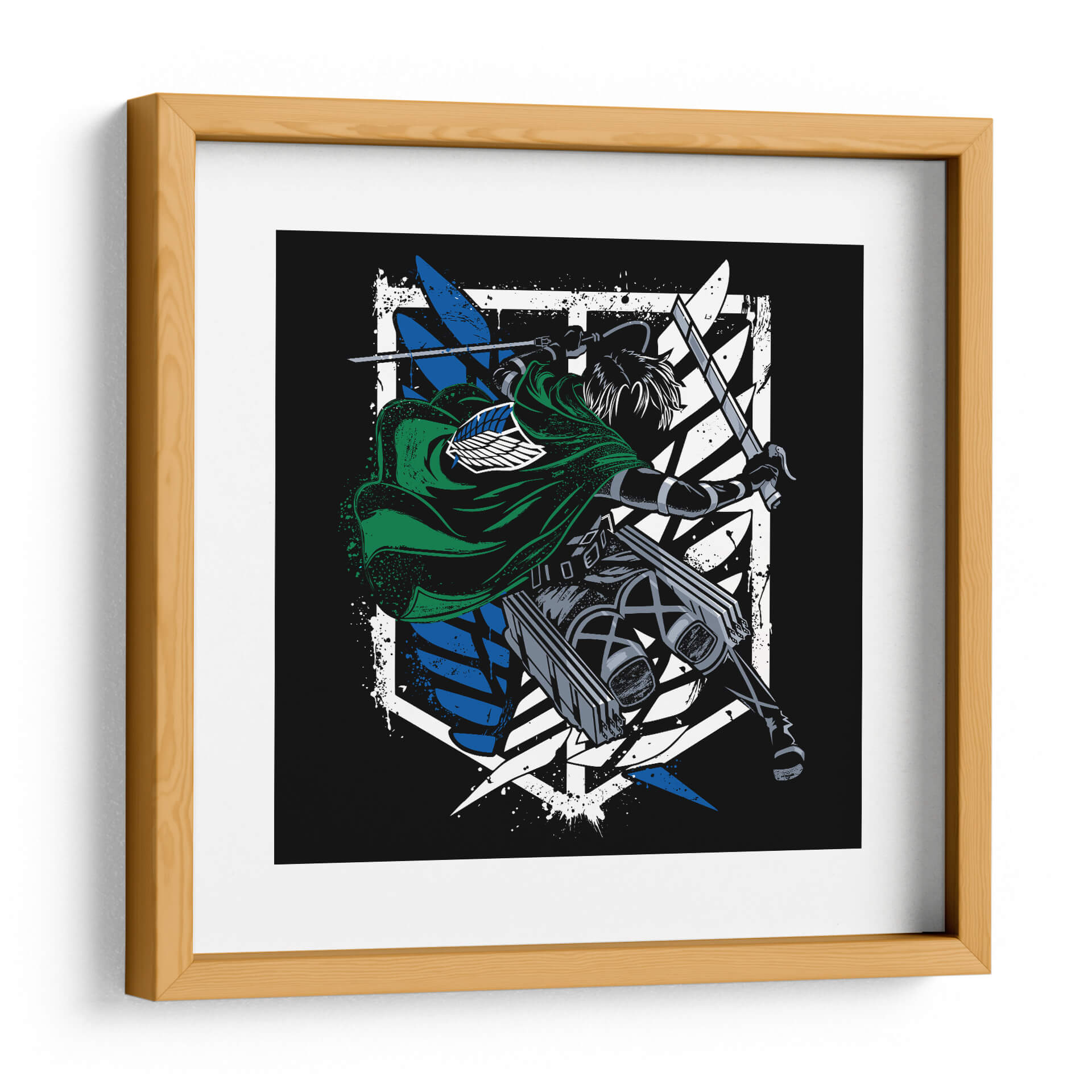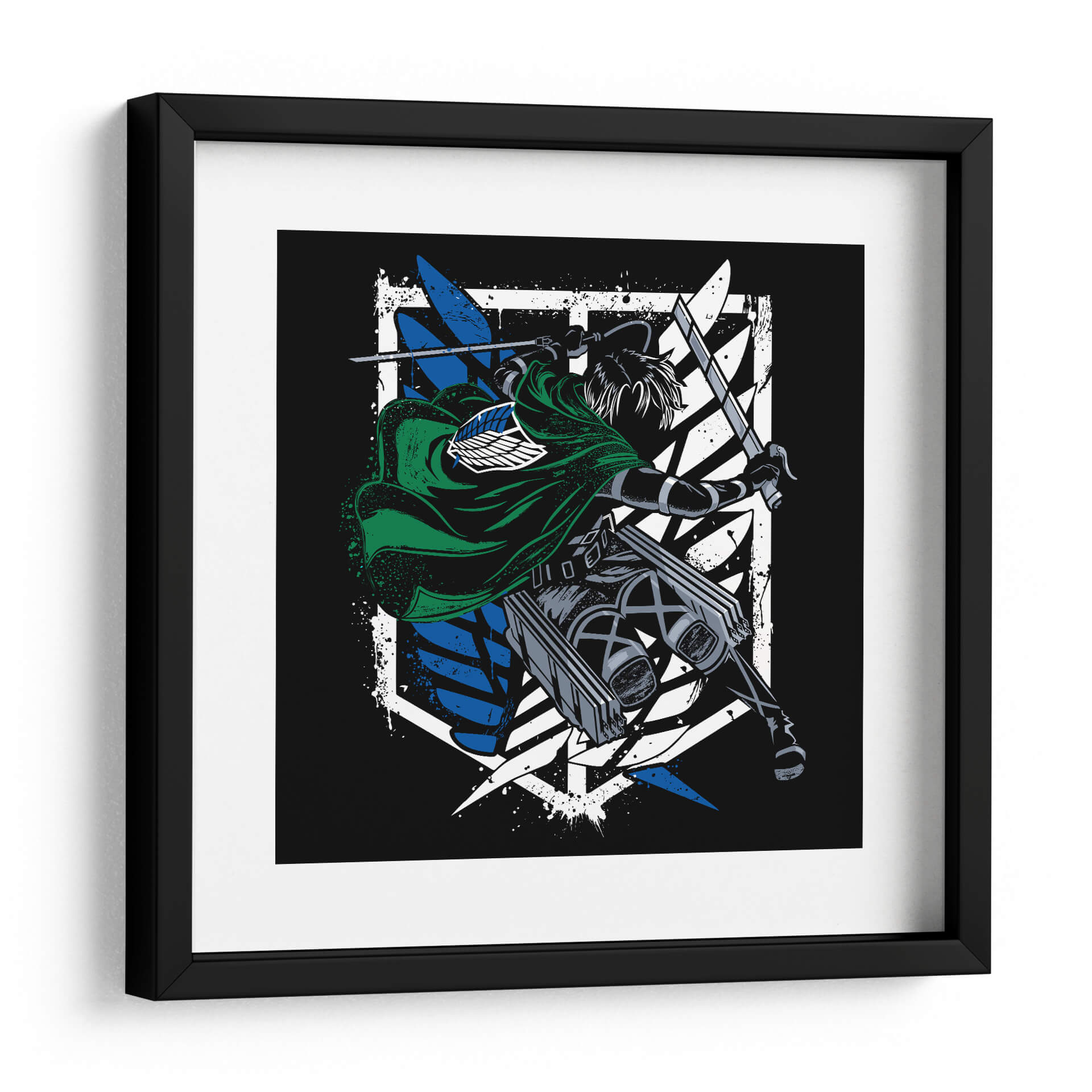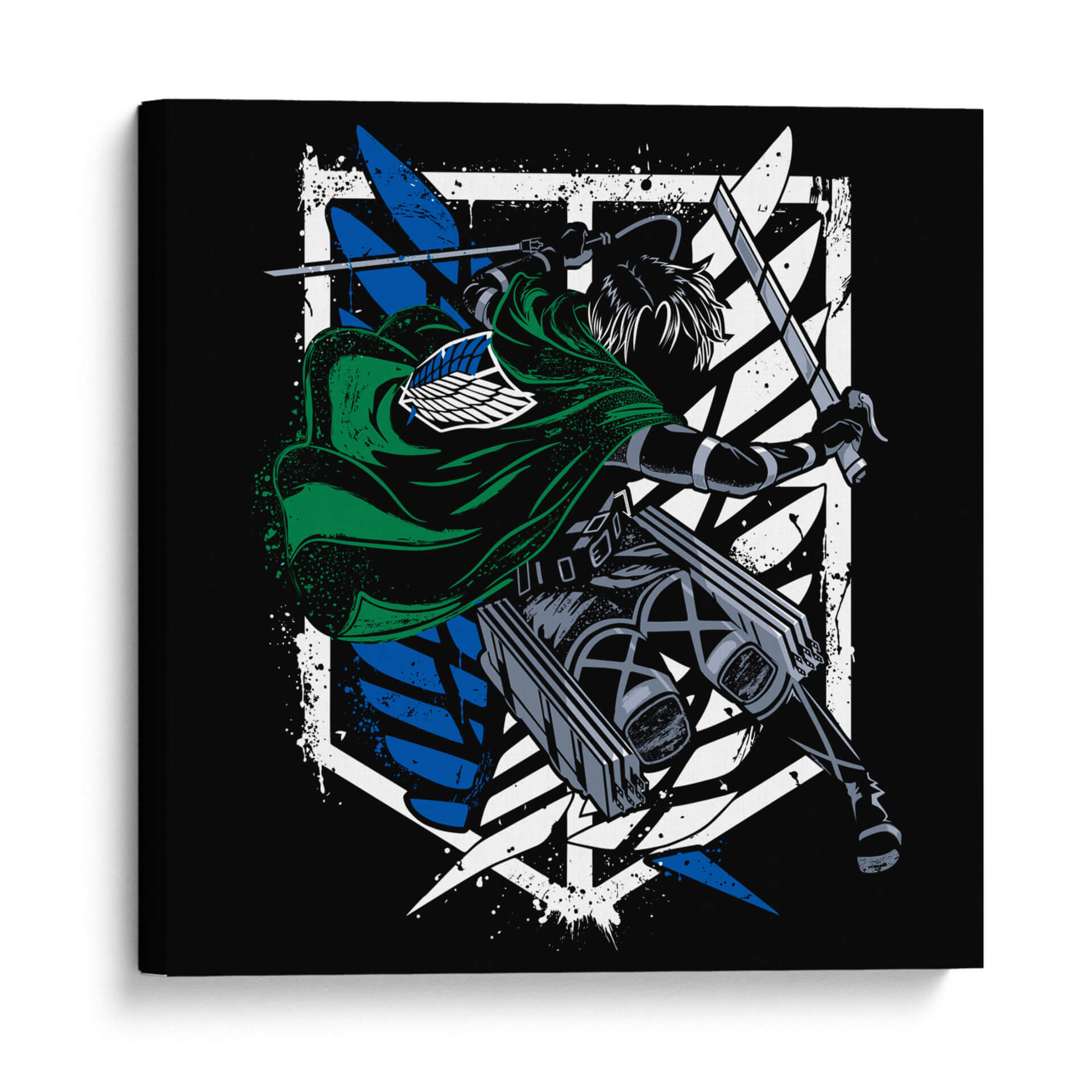 Captura la esencia de la acción y la determinación con este impactante cuadro decorativo del Capitán Levi Ackerman. La obra presenta una figura dinámica, envuelta en su icónico manto verde, empuñando dos espadas con una pose de combate intensa. El contraste entre el negro profundo del fondo y los vibrantes azules y blancos del emblema de las Alas de la Libertad crea un efecto visual potente y moderno. Los detalles de salpicaduras de pintura añaden una textura cruda y enérgica, que evoca el fragor de la batalla y la fuerza inquebrantable del personaje. Este arte de pared es perfecto para los aficionados que buscan infundir a sus espacios un espíritu de valentía y resistencia. Ideal para dormitorios, salas de estar o estudios, este cuadro decorativo se convertirá en un punto focal cautivador, inspirando coraje y admiración. Su estilo gráfico y audaz lo hace un complemento excepcional para decoraciones contemporáneas o temáticas, añadiendo un toque de carácter y una narrativa visual que resuena con la intensidad del universo del que proviene.