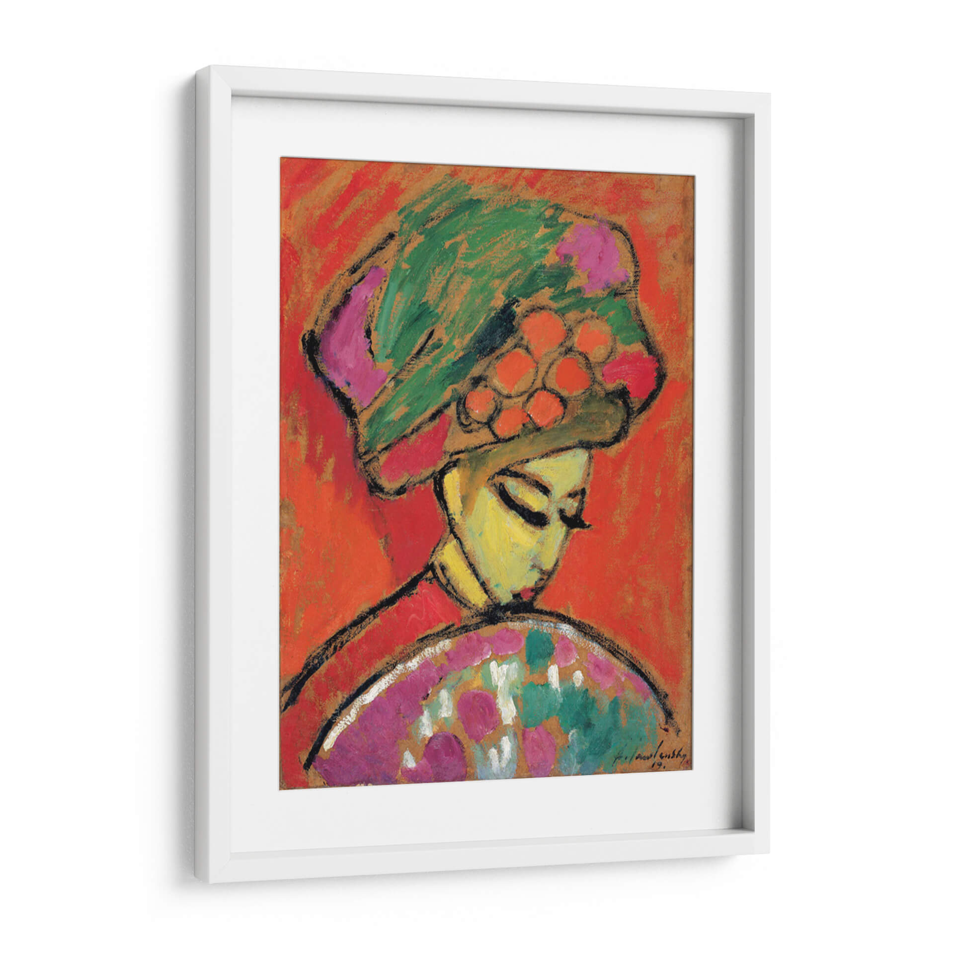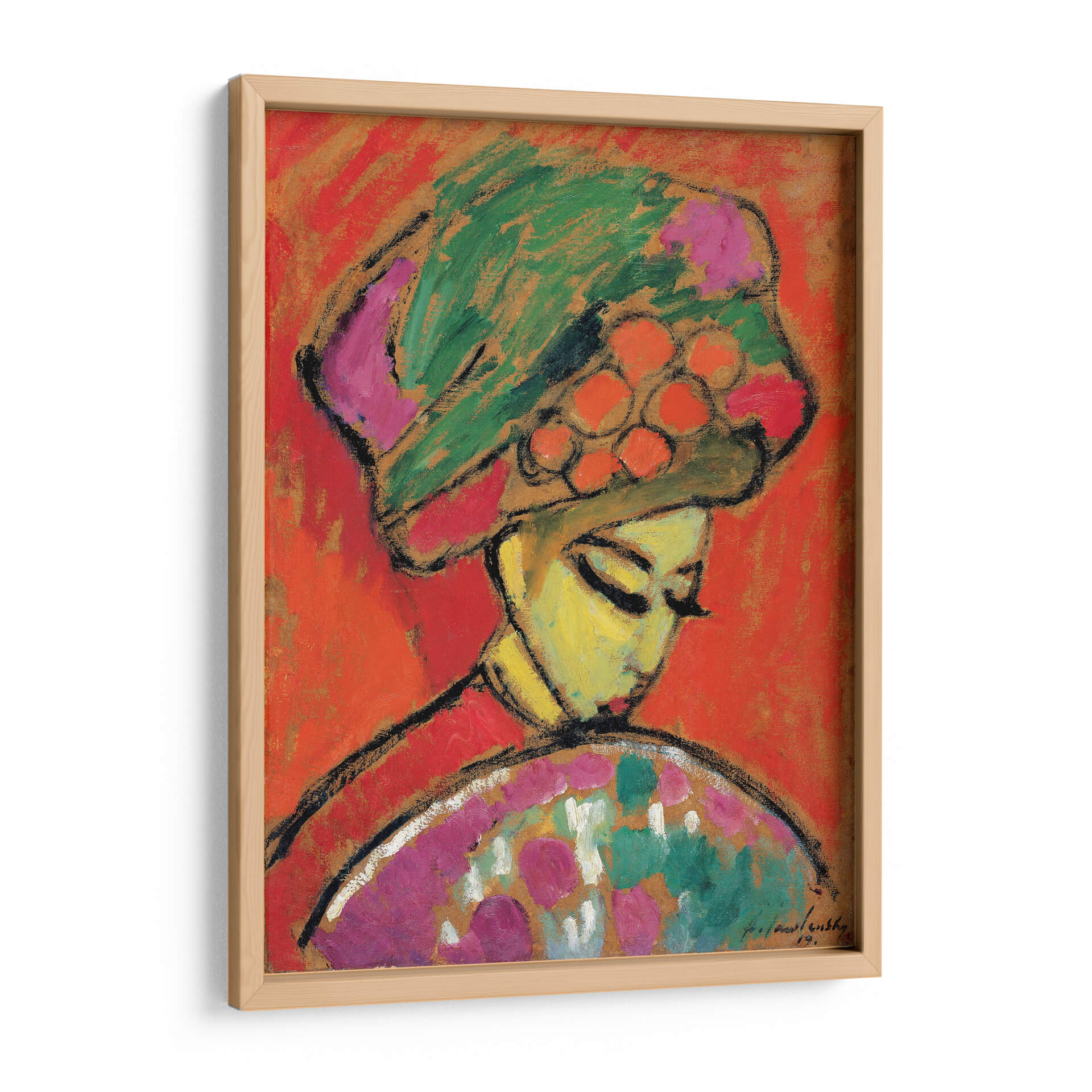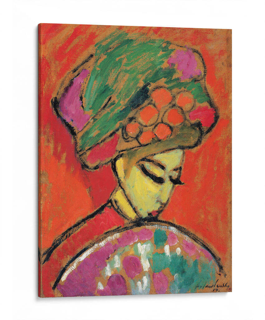 Sumérgete en la vibrante expresión artística de "Chica con sombrero de flores", una obra maestra del renombrado artista Alexej von Jawlensky. Este cuadro decorativo captura la esencia de la feminidad y la elegancia a través de audaces trazos y una paleta de colores intensos. La figura central, adornada con un elaborado sombrero floral, irradia una serena contemplación, con sus ojos cerrados y una postura que invita a la introspección. El fondo enérgico de tonos anaranjados y rojizos contrasta maravillosamente con los verdes, rosas y naranjas del sombrero y el vestido, creando una composición visualmente impactante. El estilo expresionista de Jawlensky se manifiesta en la simplificación de las formas y la intensidad emocional, haciendo de esta pieza un foco de atención en cualquier espacio. Ideal para quienes buscan infundir vitalidad y un toque de sofisticación moderna en su hogar u oficina, este cuadro decorativo es una invitación a apreciar la belleza en la simplicidad y la fuerza del color. Transforma tu pared en una galería personal con esta pieza que evoca pasión y estilo.