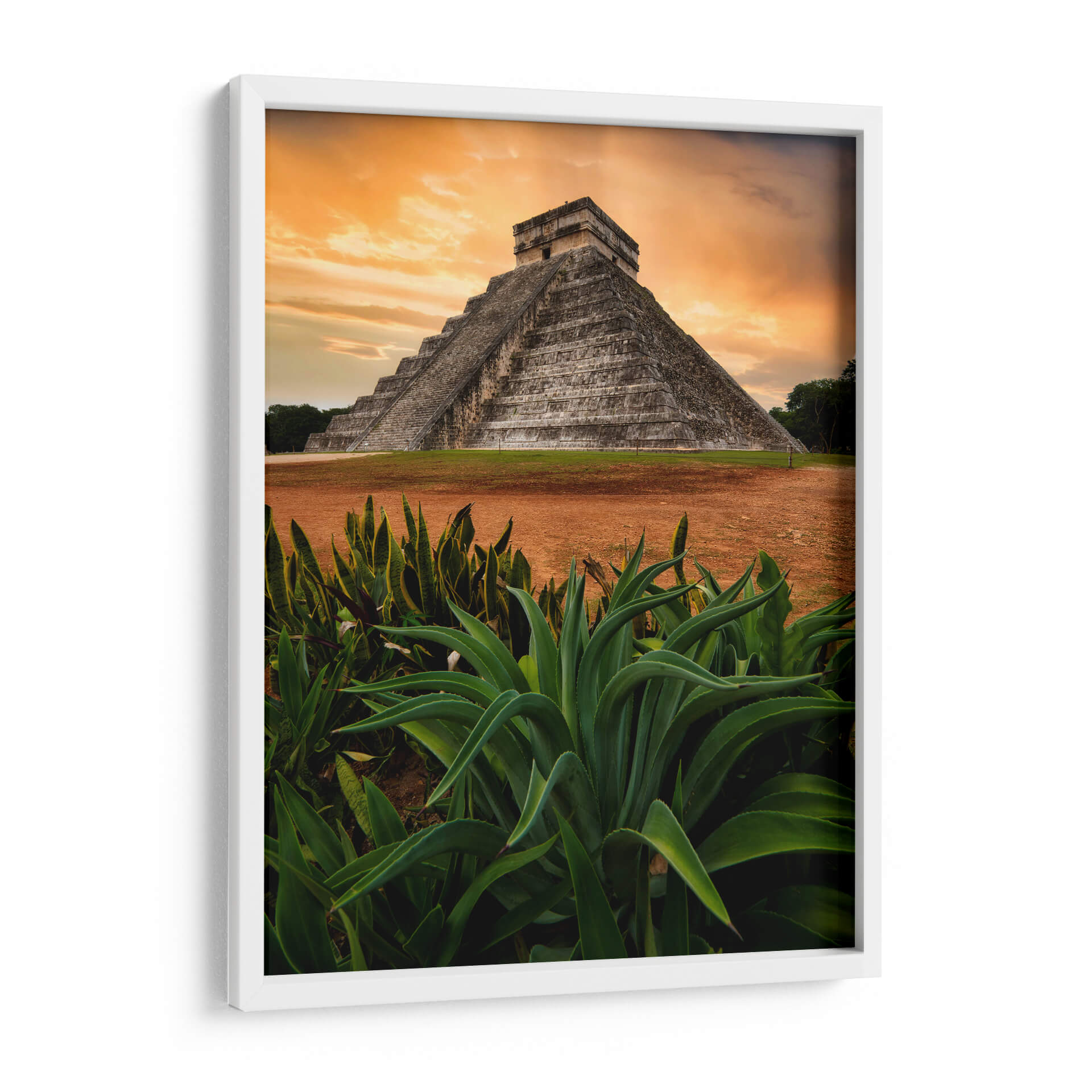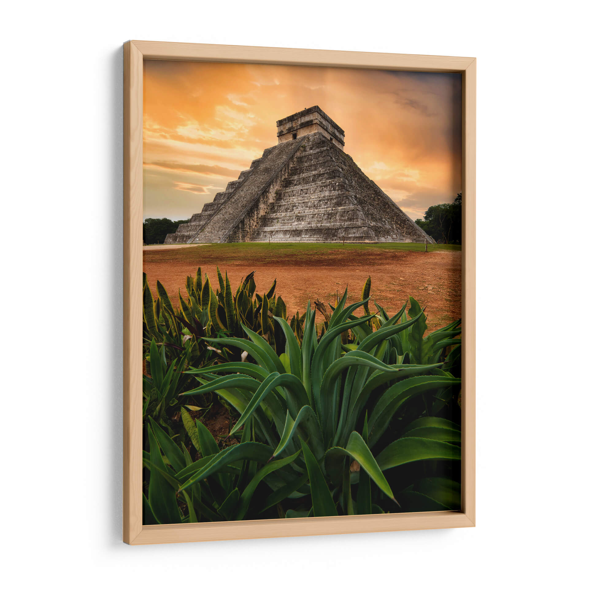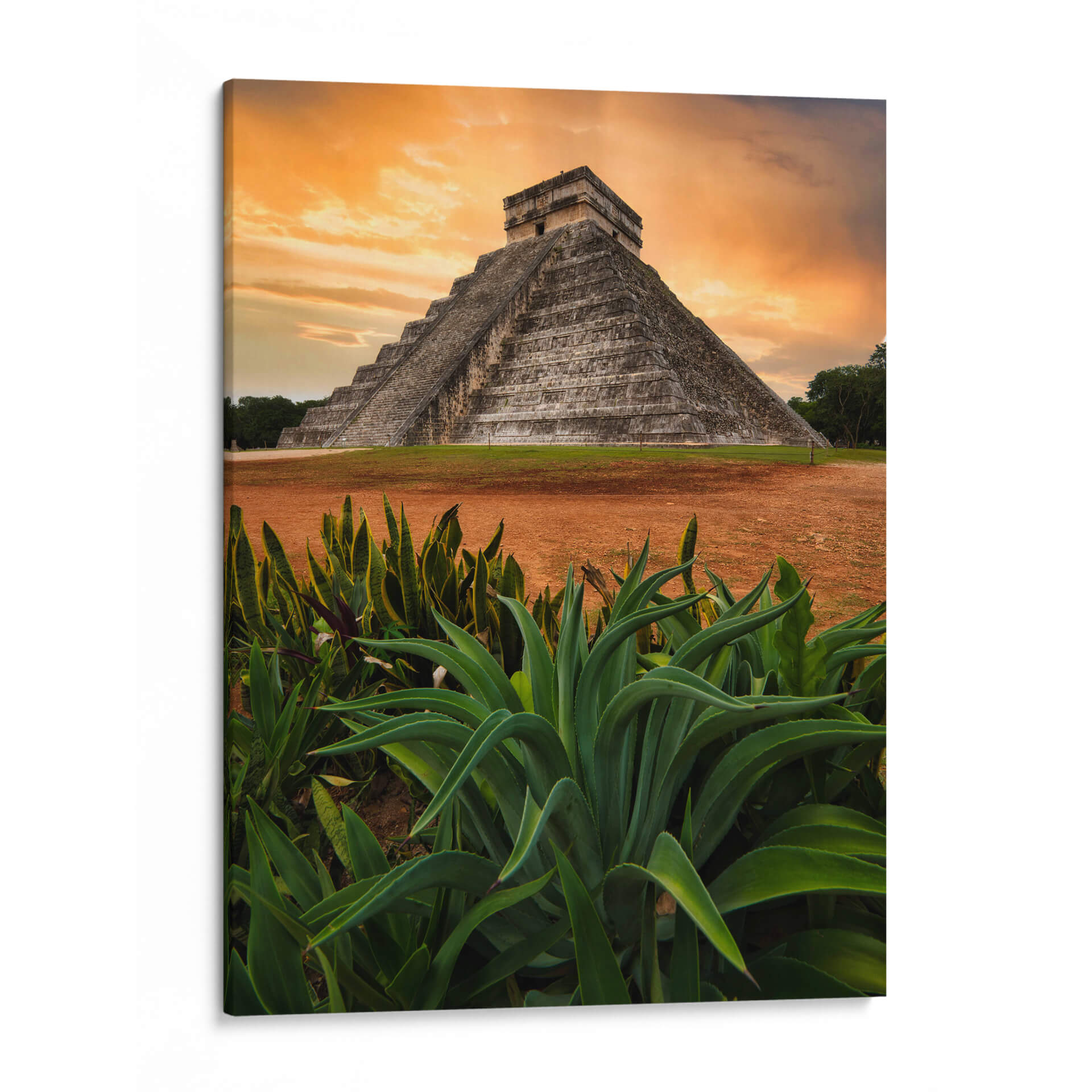 Sumérgete en la majestuosidad de Chichén Itzá con este impresionante cuadro decorativo que captura la esencia de una de las maravillas del mundo. La obra presenta la icónica pirámide de Kukulkán, imponente y detallada, bajo un cielo crepuscular teñido de tonos anaranjados y dorados que irradian calidez y misterio. Las exuberantes y vibrantes plantas verdes en primer plano añaden un contraste natural y orgánico, creando una composición equilibrada y visualmente cautivadora. Este cuadro decorativo evoca una sensación de historia, aventura y la belleza atemporal de la civilización Maya. Ideal para aquellos que buscan infundir a su hogar u oficina un toque de esplendor histórico y la serenidad de la naturaleza. La fotografía de Jorge Vargas, con su cuidadosa composición y manejo de la luz, transforma este icónico sitio arqueológico en una pieza de arte moderna, perfecta para añadir profundidad y carácter a cualquier espacio. Un recordatorio visual de viajes pasados o un anhelo de futuras exploraciones, este lienzo es una adición significativa para los amantes de la historia, la arquitectura y la decoración inspirada en destinos exóticos. Su paleta de colores, que combina la calidez del atardecer con la frescura del follaje, se adapta a diversos estilos decorativos, desde lo rústico hasta lo contemporáneo, aportando un aire de sofisticación y descubrimiento a tus paredes.