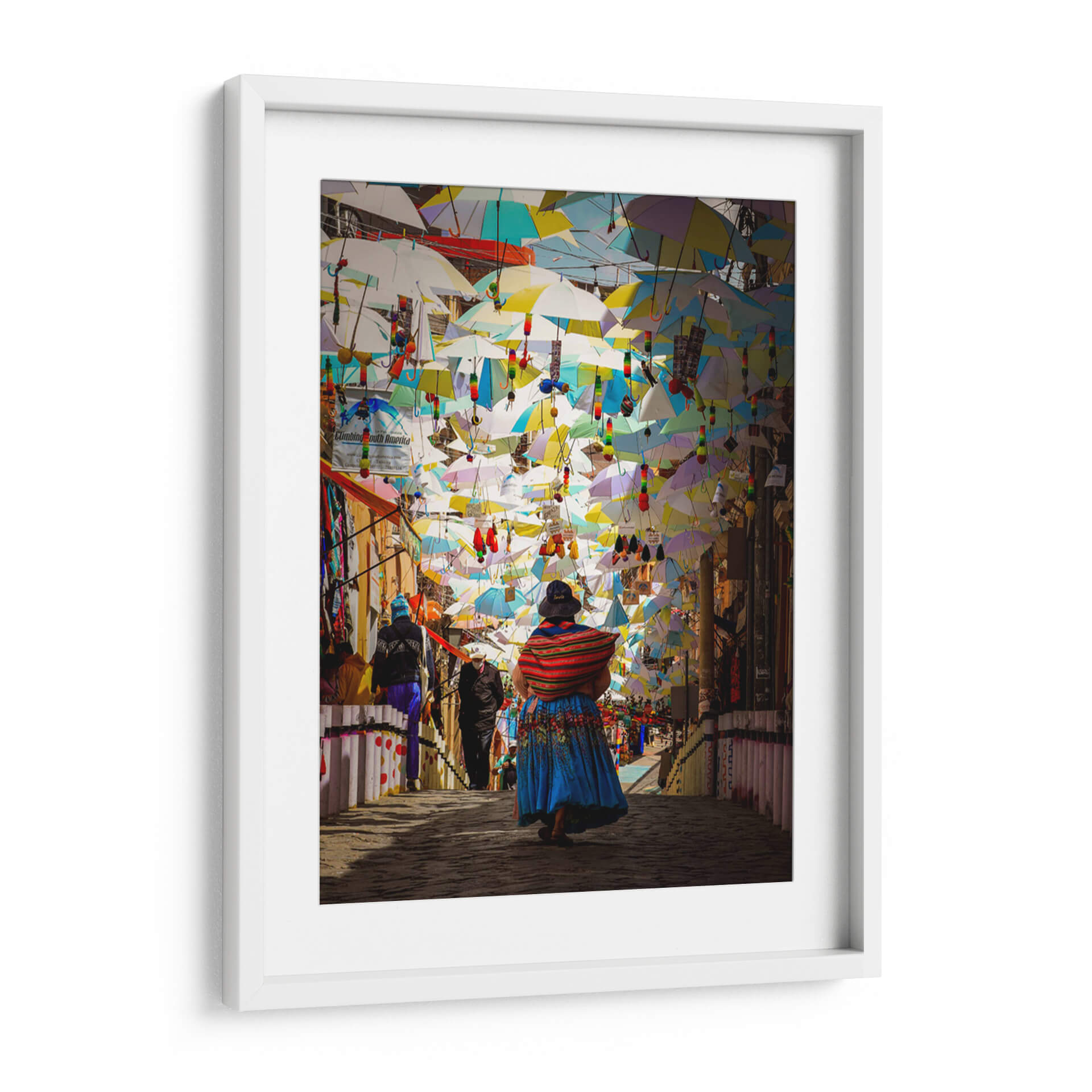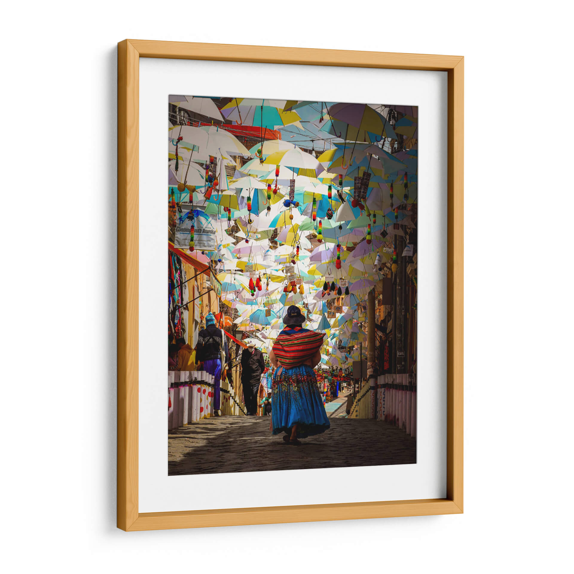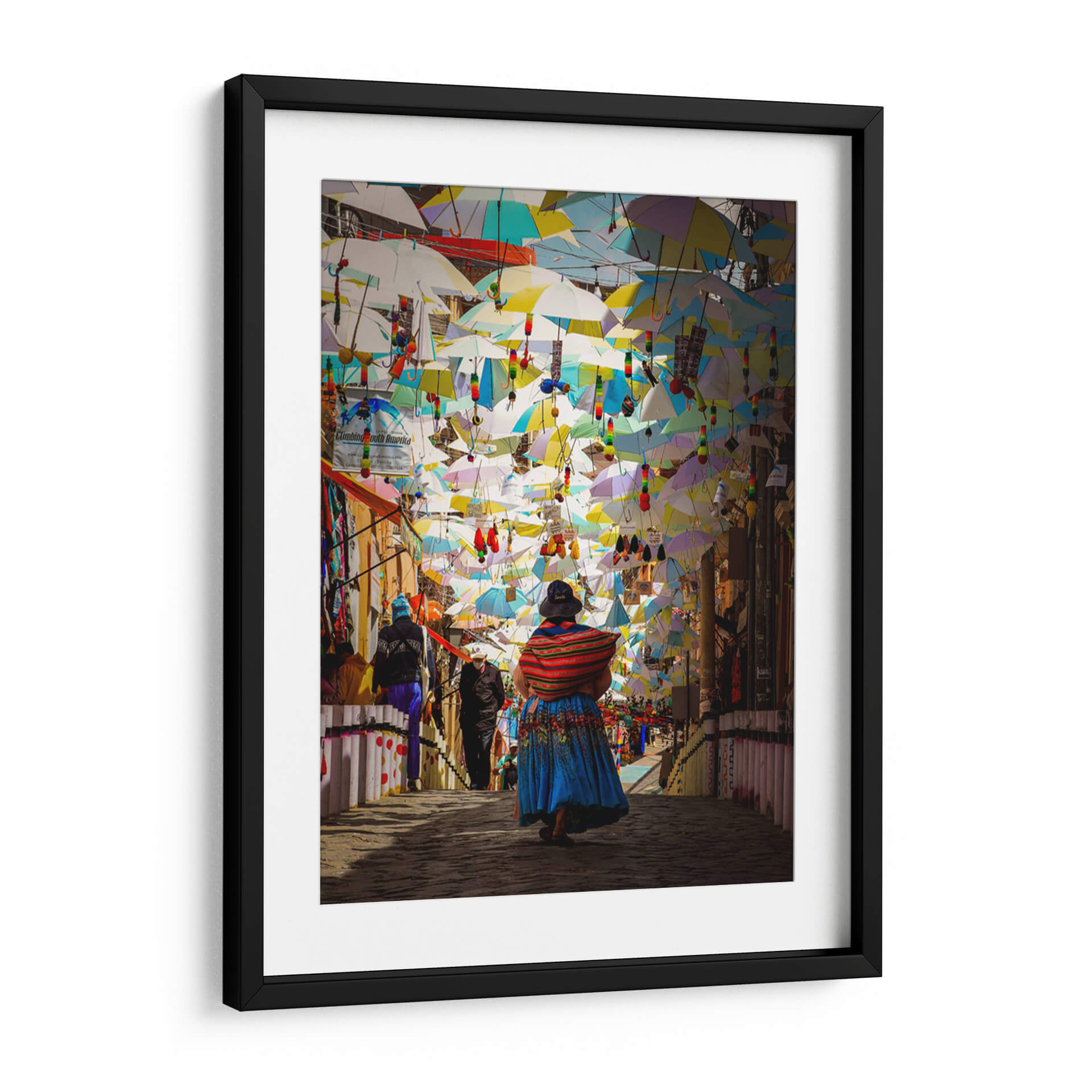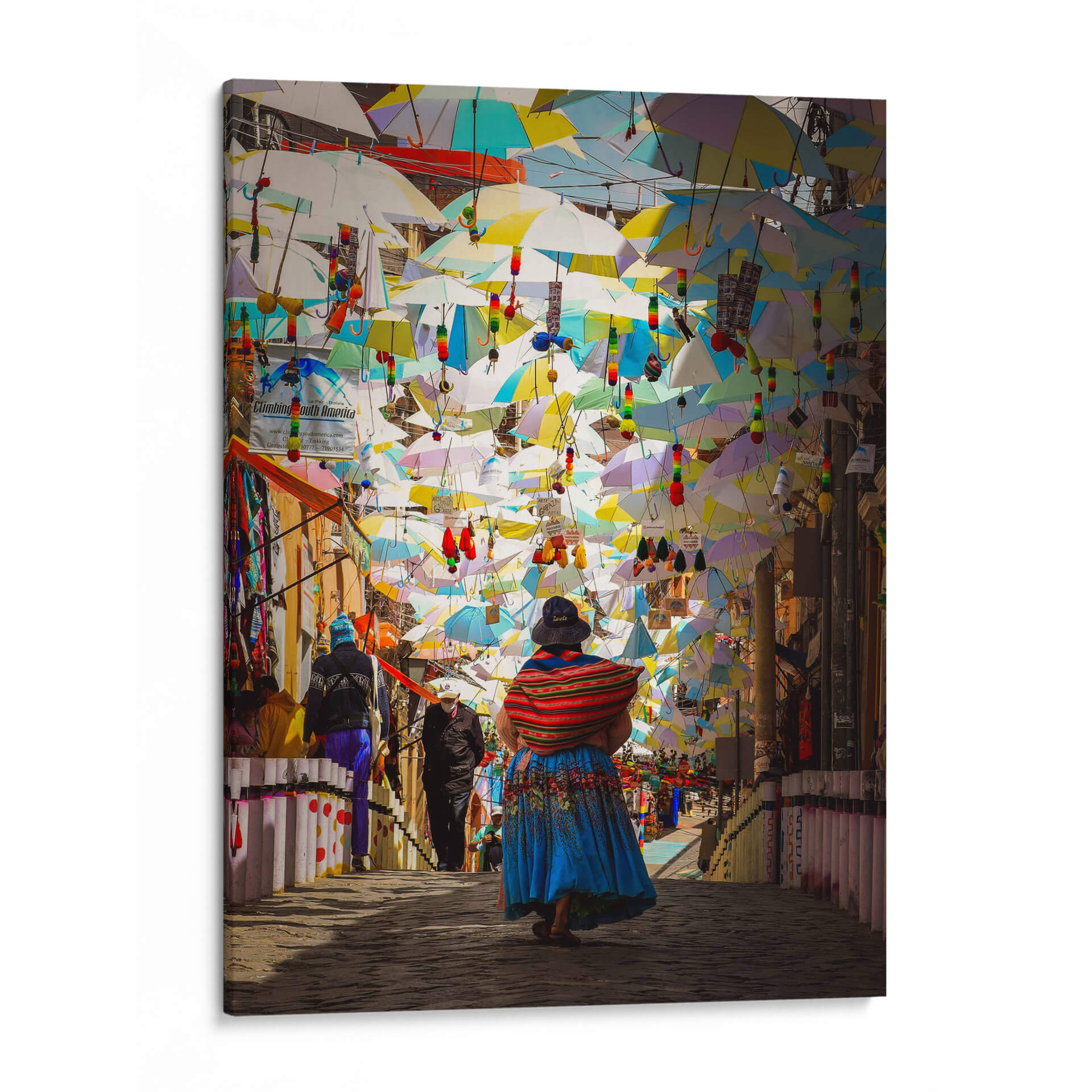 Sumérgete en la vibrante atmósfera de 'Colores Bolivianos - La Paz, Bolivia', una obra de arte que captura la esencia festiva y cultural de esta icónica ciudad andina. La imagen te transporta a una calle adoquinada adornada con un dosel de paraguas de colores brillantes y vibrantes, creando un túnel visual lleno de alegría y vida. En primer plano, una figura femenina vestida con un atuendo tradicional boliviano, con una falda azul floreada y un colorido poncho, camina alejándose del espectador, invitándote a explorar la escena. La paleta de colores es un festín para los sentidos, con predominancia de tonos pastel y vivos como el amarillo, azul, verde y rosa, salpicados por los detalles coloridos de las decoraciones colgantes. El estilo de la obra es fotográfico y realista, pero con una composición que resalta la perspectiva y la profundidad, haciendo que te sientas parte de la escena. Esta pieza es perfecta para quienes buscan inyectar energía, alegría y un toque de exotismo cultural en sus hogares u oficinas. Ideal para salas de estar, comedores o pasillos, este cuadro decorativo es una ventana a la riqueza cultural de Bolivia, un recordatorio constante de la belleza encontrada en las tradiciones y las celebraciones.