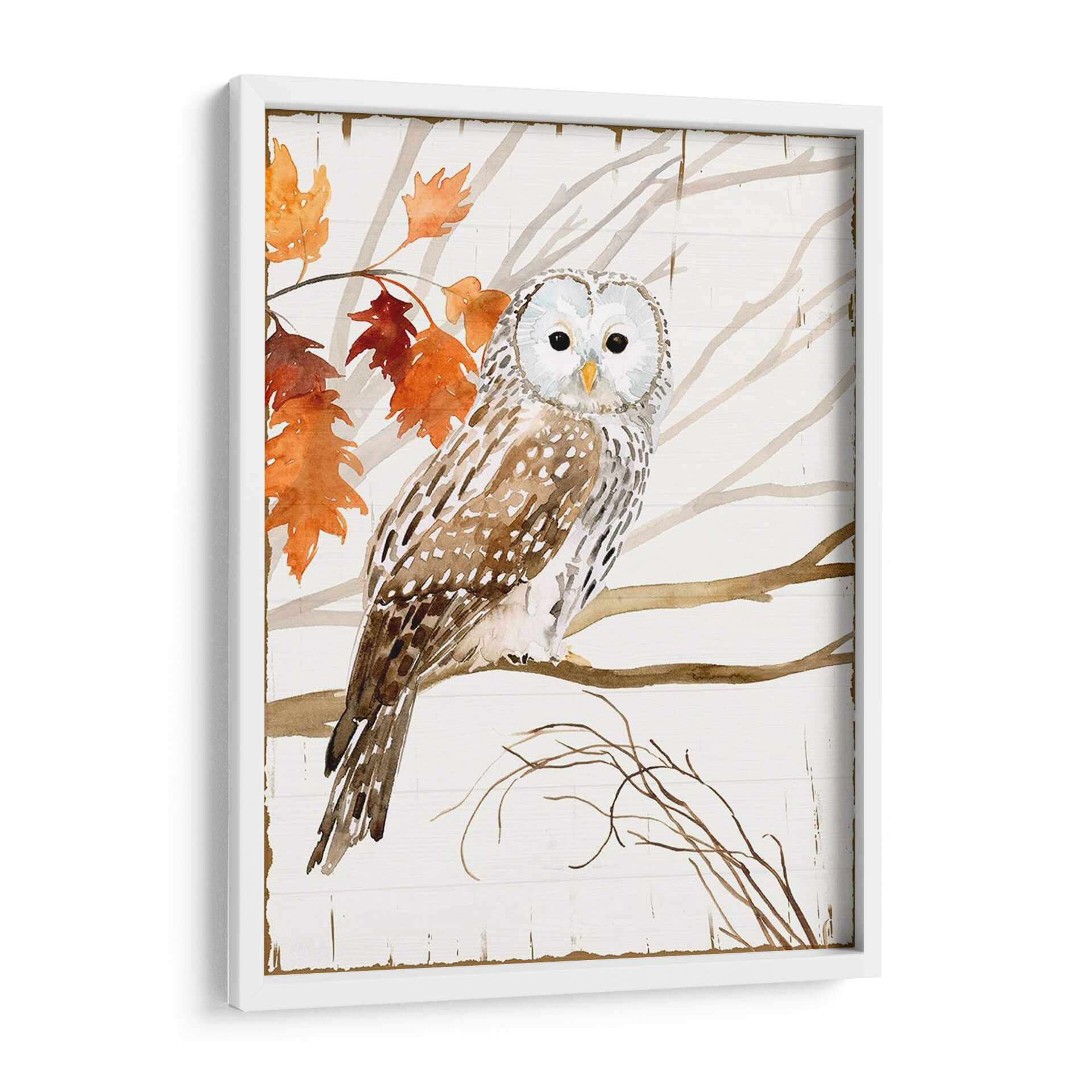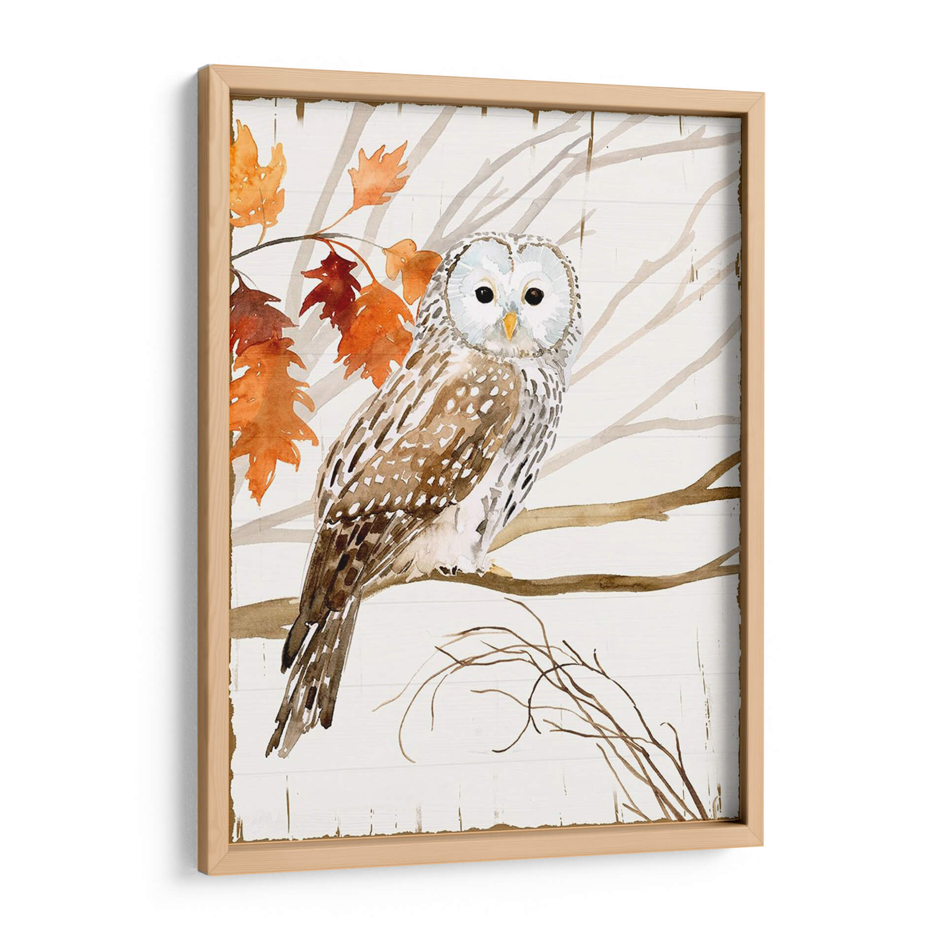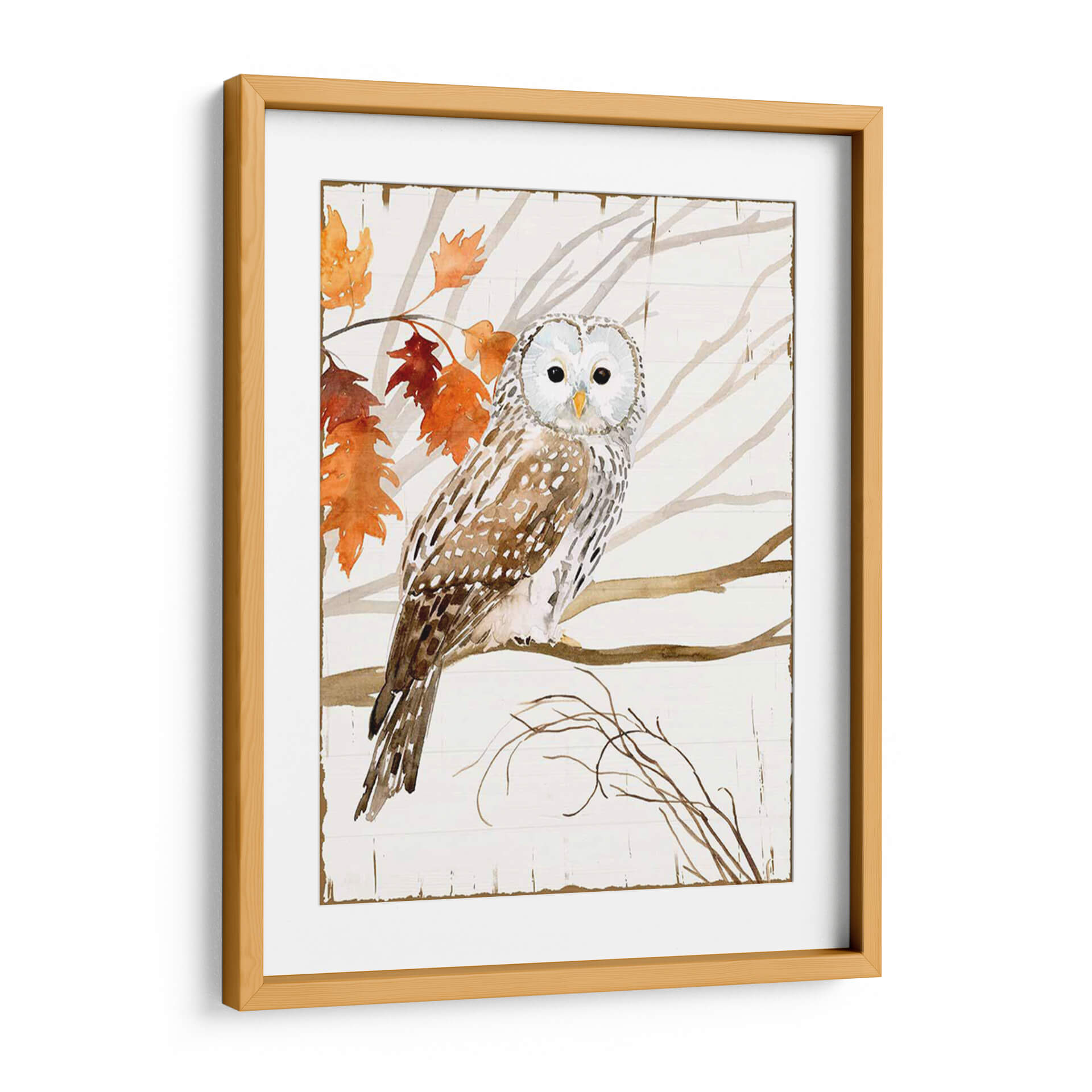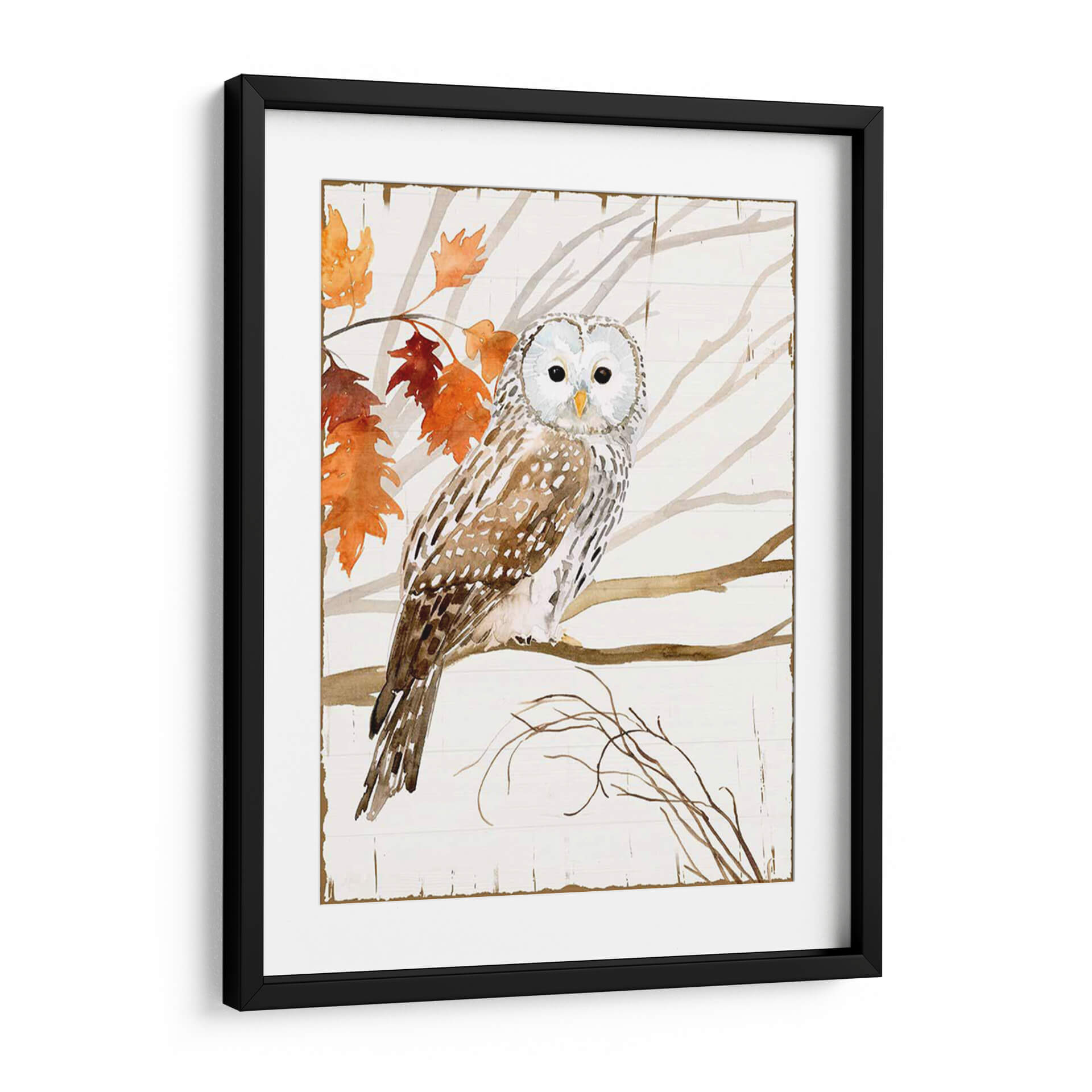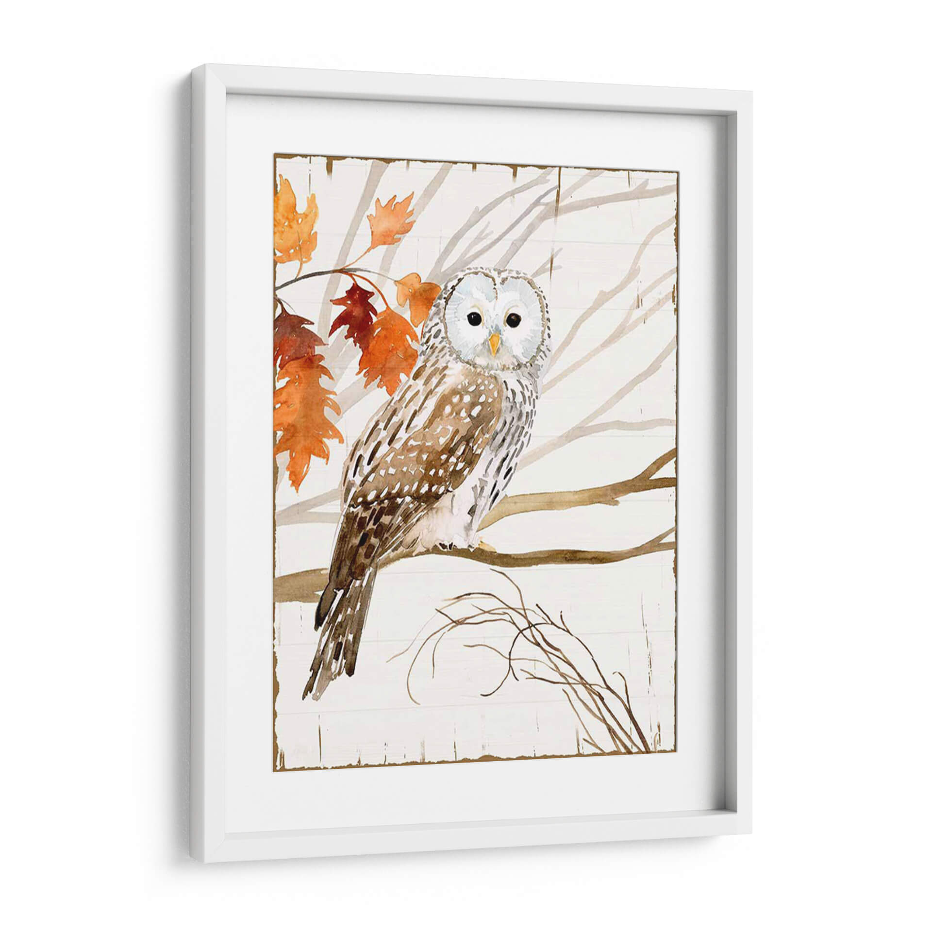 Sumérgete en la serenidad de la naturaleza con "Cosecha Búho I", una cautivadora obra de arte de Victoria Borges. Este cuadro decorativo captura la majestuosidad de un búho posado en una rama, rodeado de las hojas otoñales en vibrantes tonos naranjas y rojizos, contrastando suavemente con el fondo de madera rústica en blanco. La técnica de acuarela utilizada por Borges aporta una delicadeza única, con trazos fluidos y una paleta de colores cálidos y terrosos que evocan calma y conexión con el entorno natural. Los ojos penetrantes del búho invitan a la contemplación, mientras que la composición equilibrada y el estilo ligeramente rústico hacen de esta pieza un elemento decorativo versátil. Ideal para añadir un toque de elegancia natural a tu sala de estar, un ambiente acogedor a tu dormitorio o un punto focal inspirador en tu estudio. "Cosecha Búho I" no es solo una imagen, es una ventana a la tranquilidad del bosque, perfecta para quienes buscan infundir paz y belleza en sus espacios. Descubre la magia de la fauna y la estación en esta exquisita pieza de arte de pared.