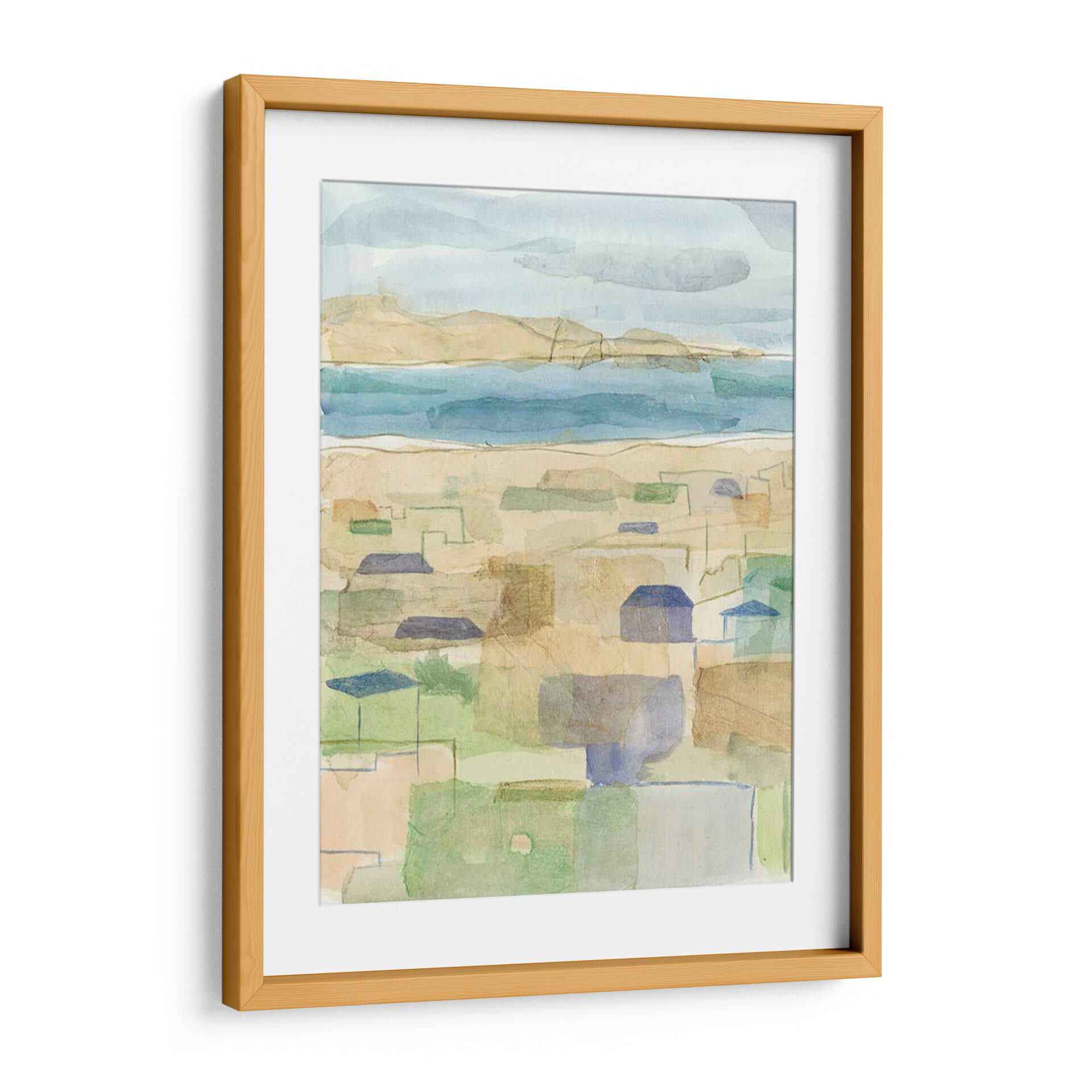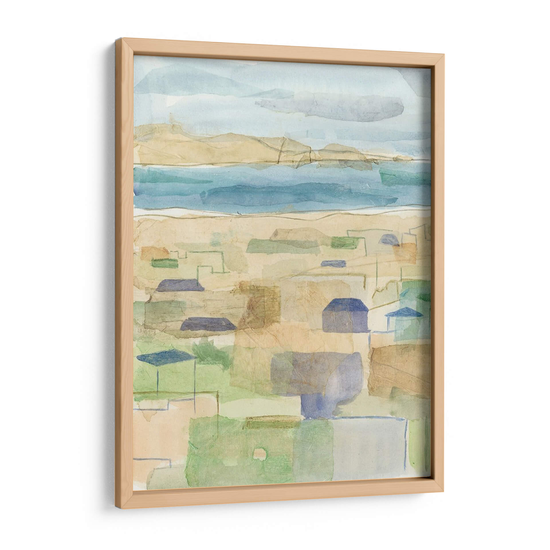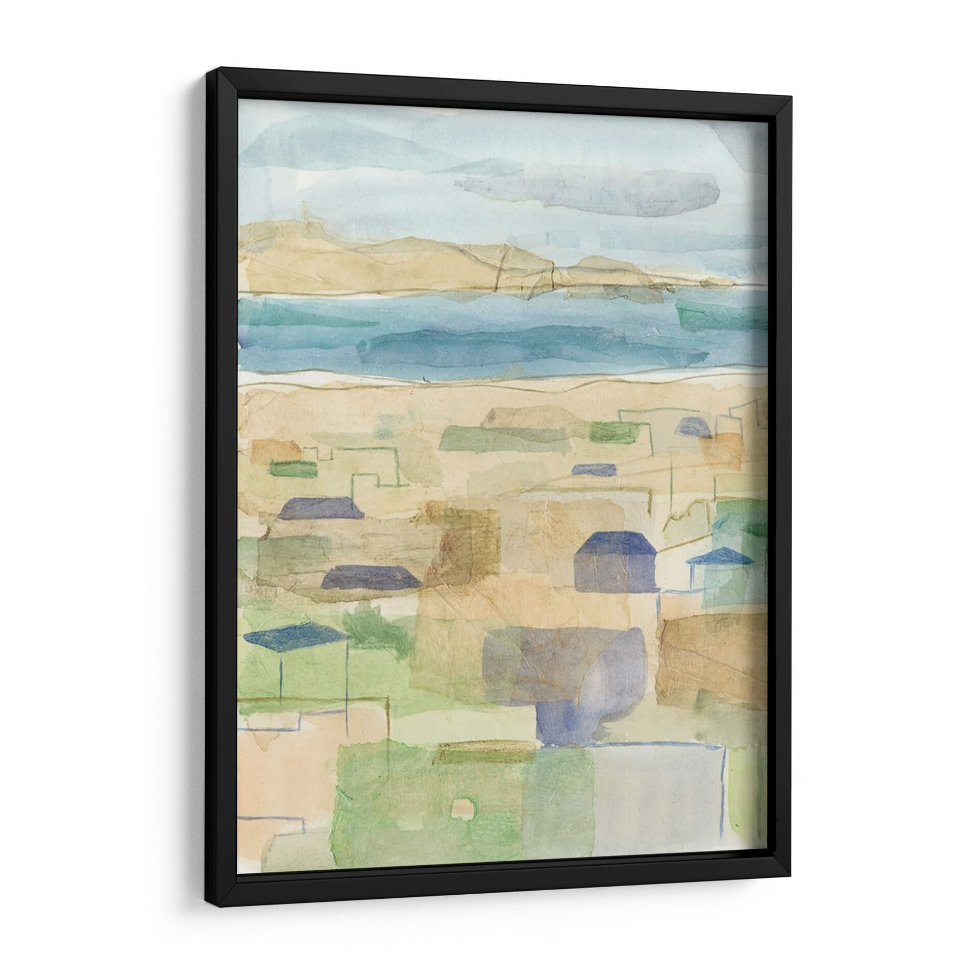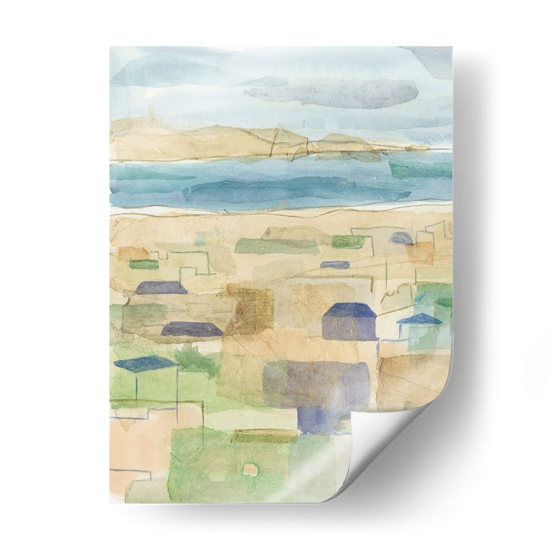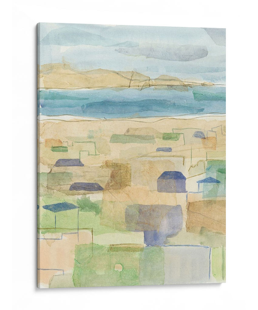 Sumérgete en la serenidad de 'Costa Mediterránea I', una obra de arte cautivadora que evoca la brisa marina y la arquitectura bañada por el sol. Esta pieza, creada por Megan Meagher, presenta un paisaje estilizado que fusiona la costa con un entramado de formas geométricas que sugieren casas y calles. La paleta de colores, dominada por tonos suaves de azul, arena, verde y toques de terracota, crea una atmósfera de calma y ligereza, perfecta para cualquier espacio que busque transmitir paz y sosiego. El estilo abstracto y la técnica de acuarela digital, que imita las texturas sutiles del papel, invitan a la contemplación y añaden una dimensión de profundidad. Ideal para salones, dormitorios o estudios, este cuadro decorativo es una invitación a evocar la sensación de unas vacaciones eternas y una conexión con la naturaleza y la arquitectura mediterránea. Añade un toque de sofisticación relajada y un aire de ensueño costero a tu hogar con esta pieza única.