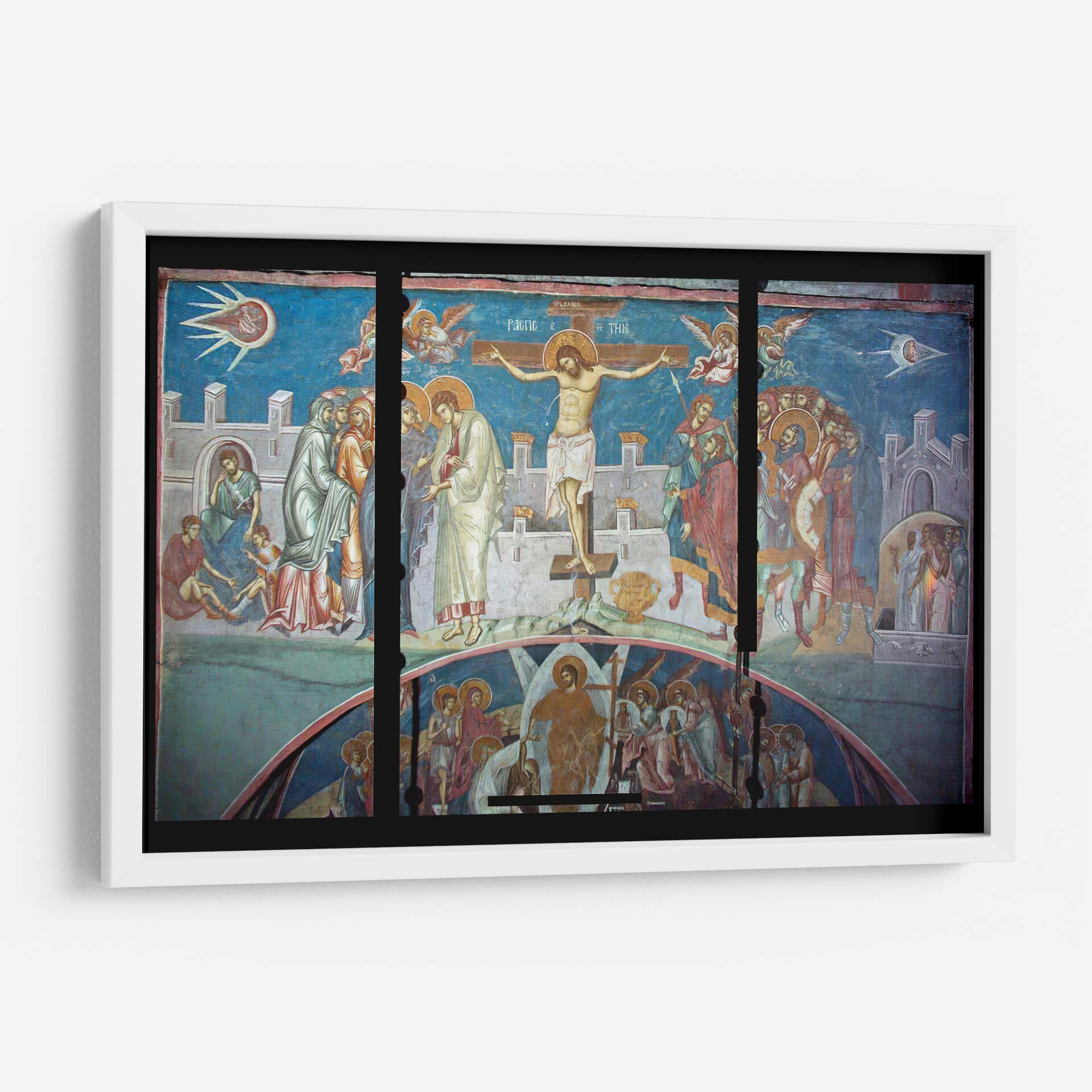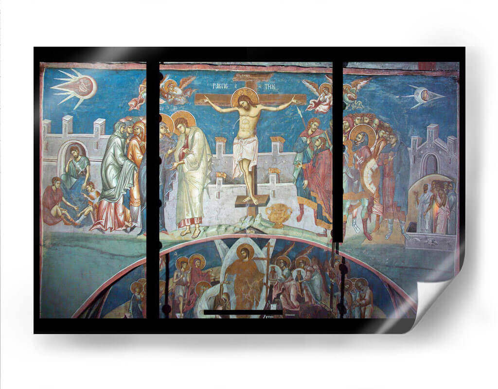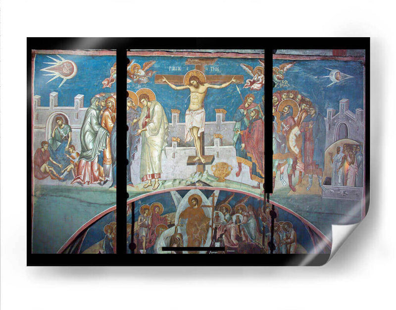 Sumérgete en la profunda espiritualidad de "Crucifixión de Cristo", una obra de arte conmovedora que captura un momento trascendental de fe y sacrificio. Esta pieza presenta una representación vívida y detallada de la crucifixión, con Jesús en la cruz como figura central, rodeado por un elenco de personajes bíblicos que expresan duelo y devoción. La paleta de colores, dominada por azules celestiales, rojos intensos y tonos tierra, crea una atmósfera solemne y poderosa, acentuada por la iluminación dramática y las figuras angulosas típicas del arte bizantino o medieval. La composición, dividida en paneles que recuerdan a un fresco histórico, guía la mirada a través de la narrativa, desde los ángeles en el cielo hasta las figuras al pie de la cruz y una procesión celestial en la parte inferior. Esta obra es perfecta para espacios que buscan infundir un sentido de reverencia y profundidad, como una sala de estudio, una capilla privada o un comedor donde se valora la reflexión y el arte con significado. Añade un toque de historia y espiritualidad a tu decoración con esta representación icónica que trasciende el tiempo.