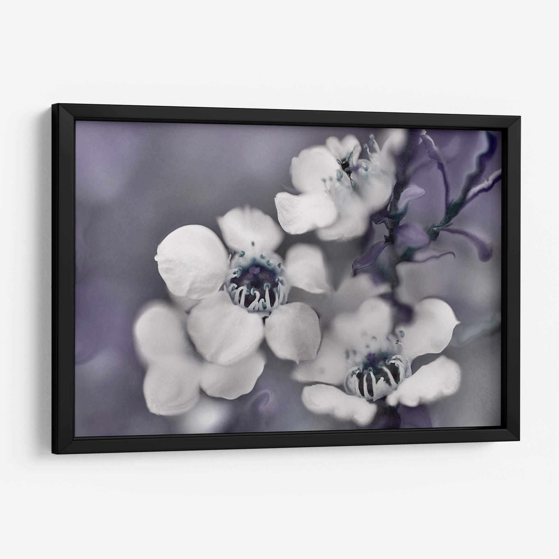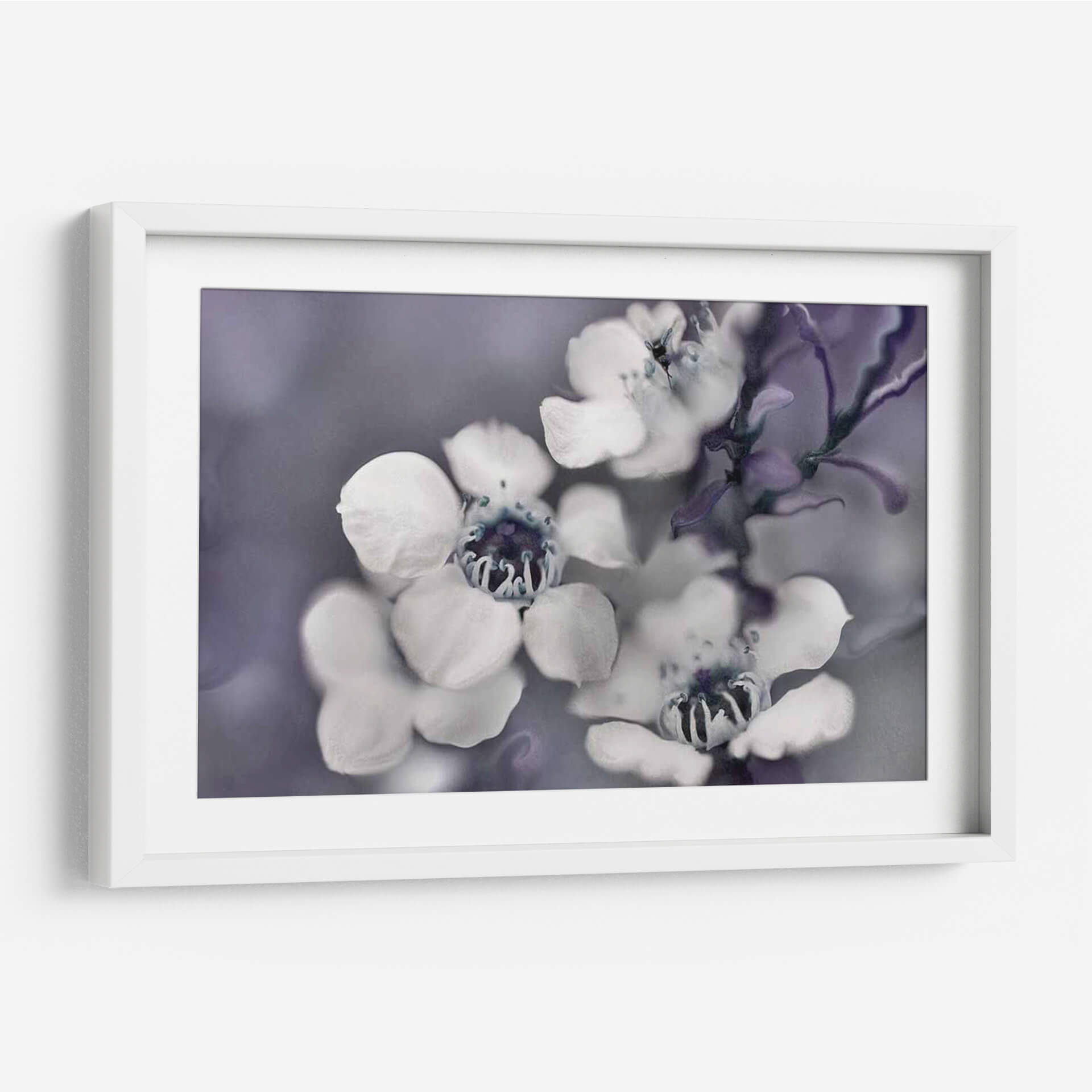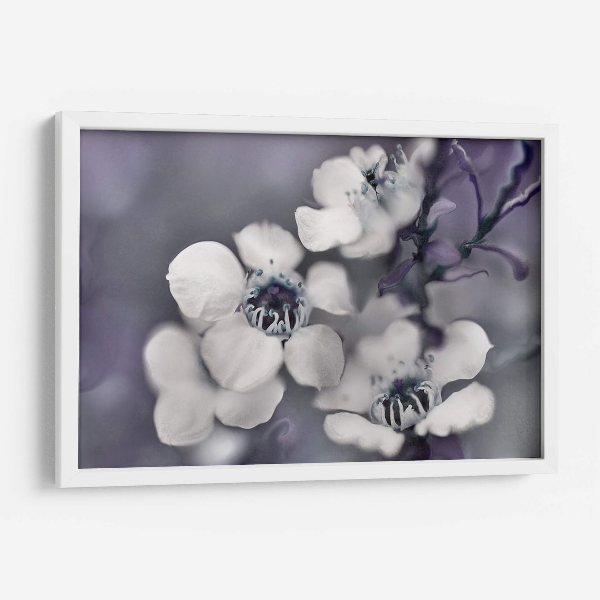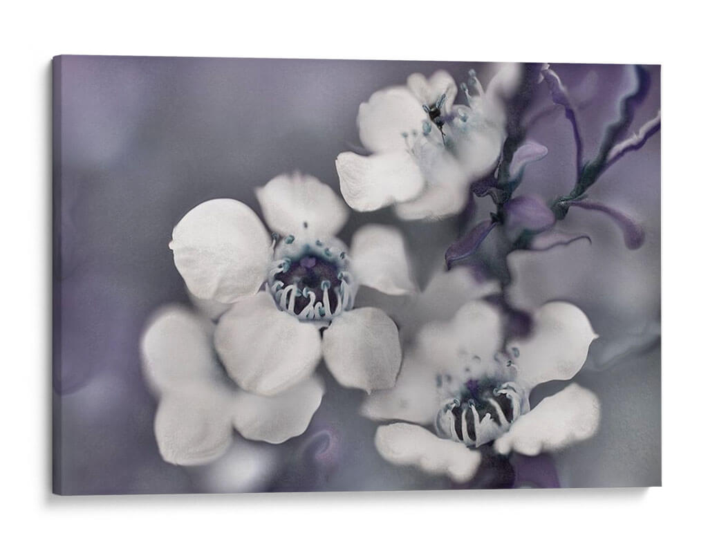 Sumérgete en la delicadeza etérea de "Cuentos de una Glen II Encantada", una obra maestra floral que captura la esencia efímera de la naturaleza. Este cuadro decorativo presenta un primer plano íntimo de flores delicadas, con pétalos blancos que contrastan suavemente contra un fondo de tonos grises y púrpuras apagados. La composición se centra en la belleza intrincada de los centros de las flores, con detalles en azul profundo que añaden un toque de misterio. El estilo fotográfico, con un enfoque suave y una atmósfera de ensueño, evoca una sensación de calma y serenidad, ideal para crear un oasis de paz en tu hogar u oficina. Las sutiles variaciones de color y la textura sutil invitan a la contemplación, haciendo de esta pieza un punto focal sereno para cualquier espacio. Perfecta para quienes buscan añadir un toque de elegancia natural y un aire de misterio encantador a su decoración.