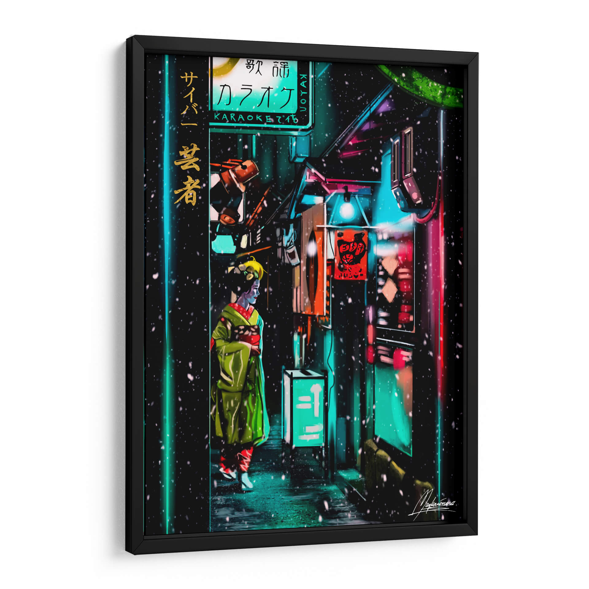 Sumérgete en el vibrante y enigmático mundo de "CYBER GEISHA" de Mayka ienova, una obra de arte digital que fusiona la estética tradicional japonesa con un toque futurista y ciberpunk. La pieza presenta a una geisha en un callejón urbano bañado por la luz neón de letreros en japonés, con una atmósfera de noche lluviosa o nevada que añade un velo de misterio. Los colores dominantes son azules eléctricos, verdes intensos y rojos vibrantes, creando un contraste cautivador que atrae la mirada. La composición, centrada en la figura de la geisha, invita a la reflexión sobre la coexistencia de lo antiguo y lo moderno, lo orgánico y lo tecnológico. Este cuadro decorativo es perfecto para quienes buscan añadir un toque de intriga y sofisticación a su hogar u oficina. Ideal para espacios que buscan un punto focal audaz y moderno, como salones contemporáneos, estudios o incluso dormitorios con un estilo urbano. "CYBER GEISHA" no es solo una imagen, es una invitación a explorar un universo donde la tradición se encuentra con la vanguardia, convirtiendo cualquier pared en una ventana a una narrativa visual fascinante y llena de energía.