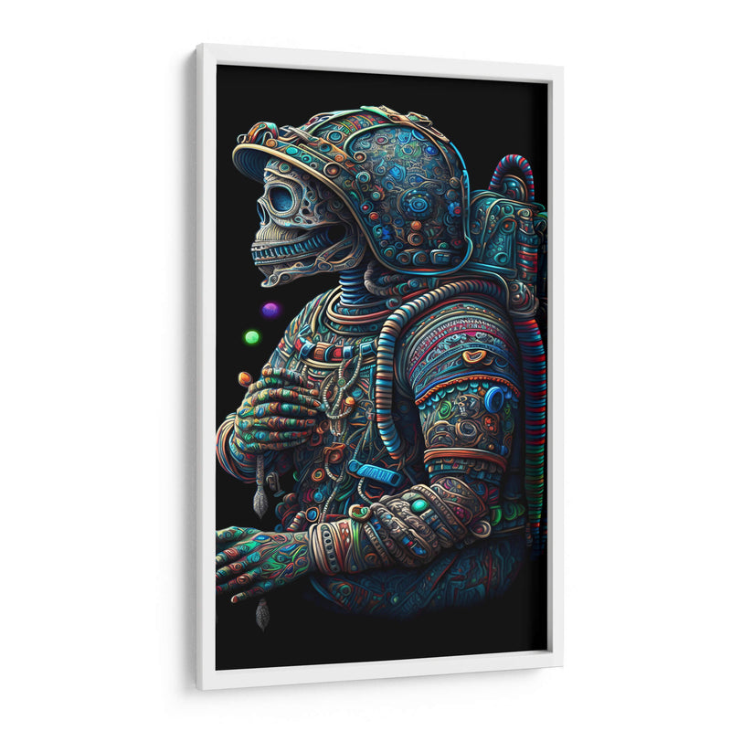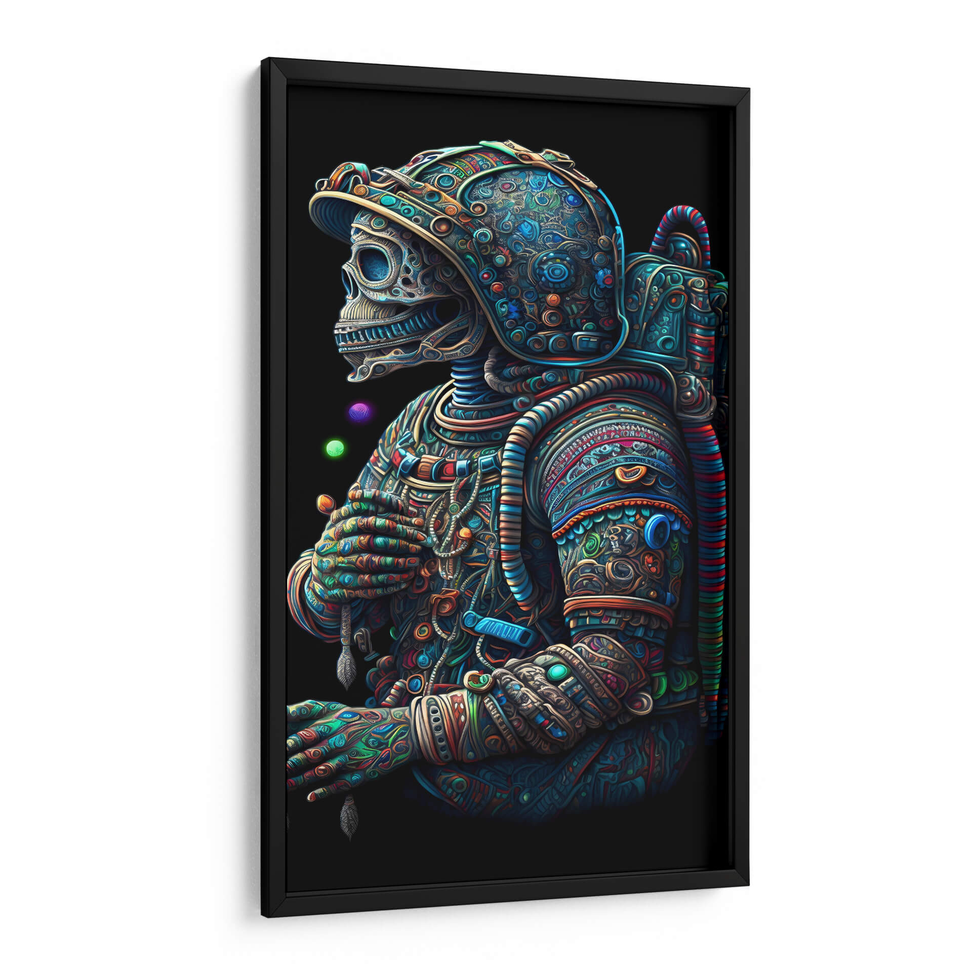Sumérgete en el fascinante mundo de "DiosMaya9", una obra de arte digital que desafía las convenciones y cautiva la imaginación. Esta pieza, creada por el visionario artista dangarlop, presenta una figura esquelética adornada con un intrincado traje que evoca un estilo steampunk y de alta tecnología, adornado con detalles que recuerdan a la rica iconografía mesoamericana. La paleta de colores es vibrante y audaz, con predominio de azules profundos, turquesas y toques de rojo y dorado, creando un contraste impactante contra el fondo negro. Cada elemento, desde el casco ornamentado hasta los intrincados patrones en la armadura, está cargado de simbolismo y complejidad visual. "DiosMaya9" no es solo un cuadro decorativo; es una declaración de estilo, una fusión de lo ancestral y lo futurista que invita a la reflexión. Ideal para espacios modernos, oficinas creativas o salas de estar que buscan un punto focal único y lleno de carácter. Transforma tu hogar con este arte de pared que combina misterio, tecnología y herencia cultural, generando conversaciones y admiración. Una pieza que representa la evolución, la conexión y la intriga.