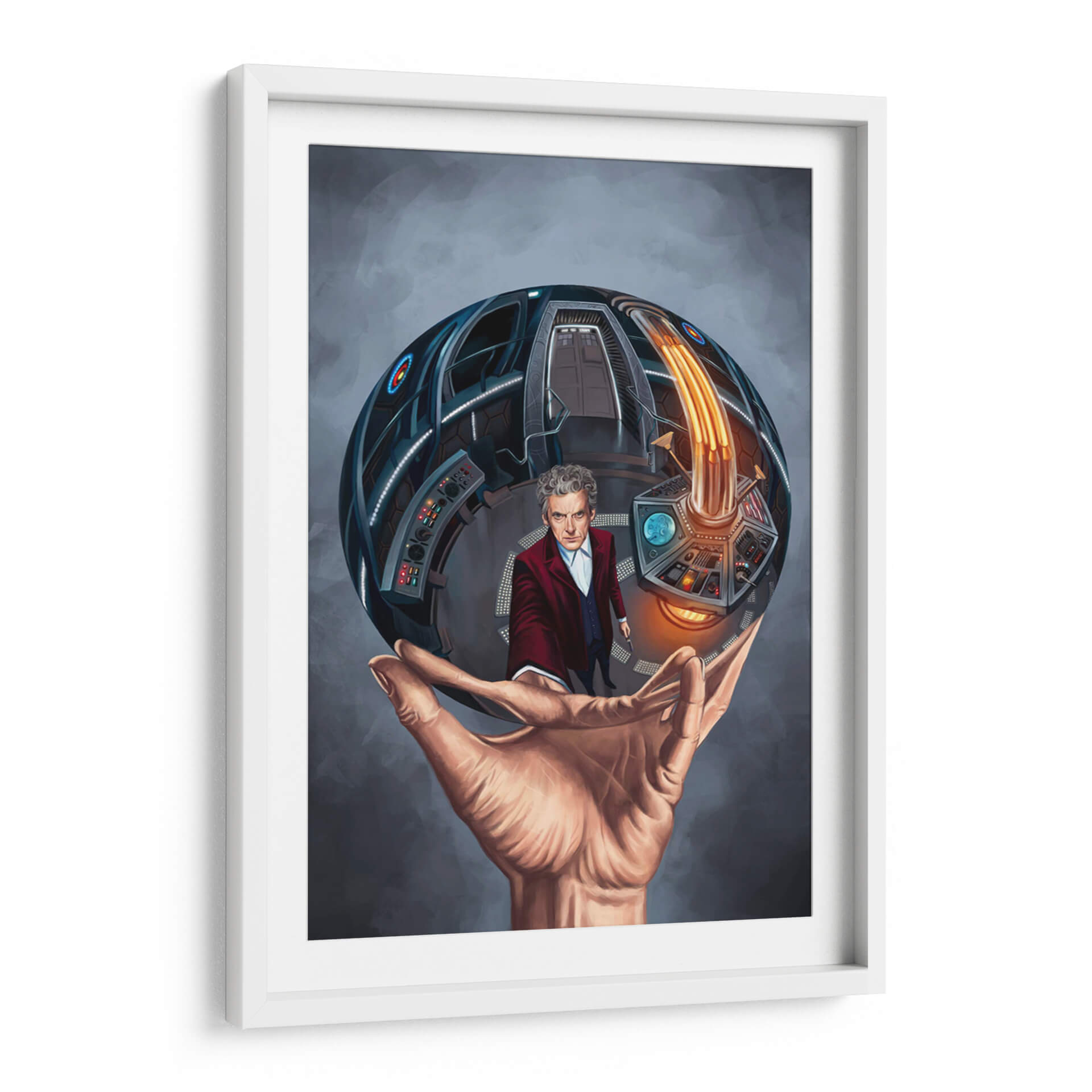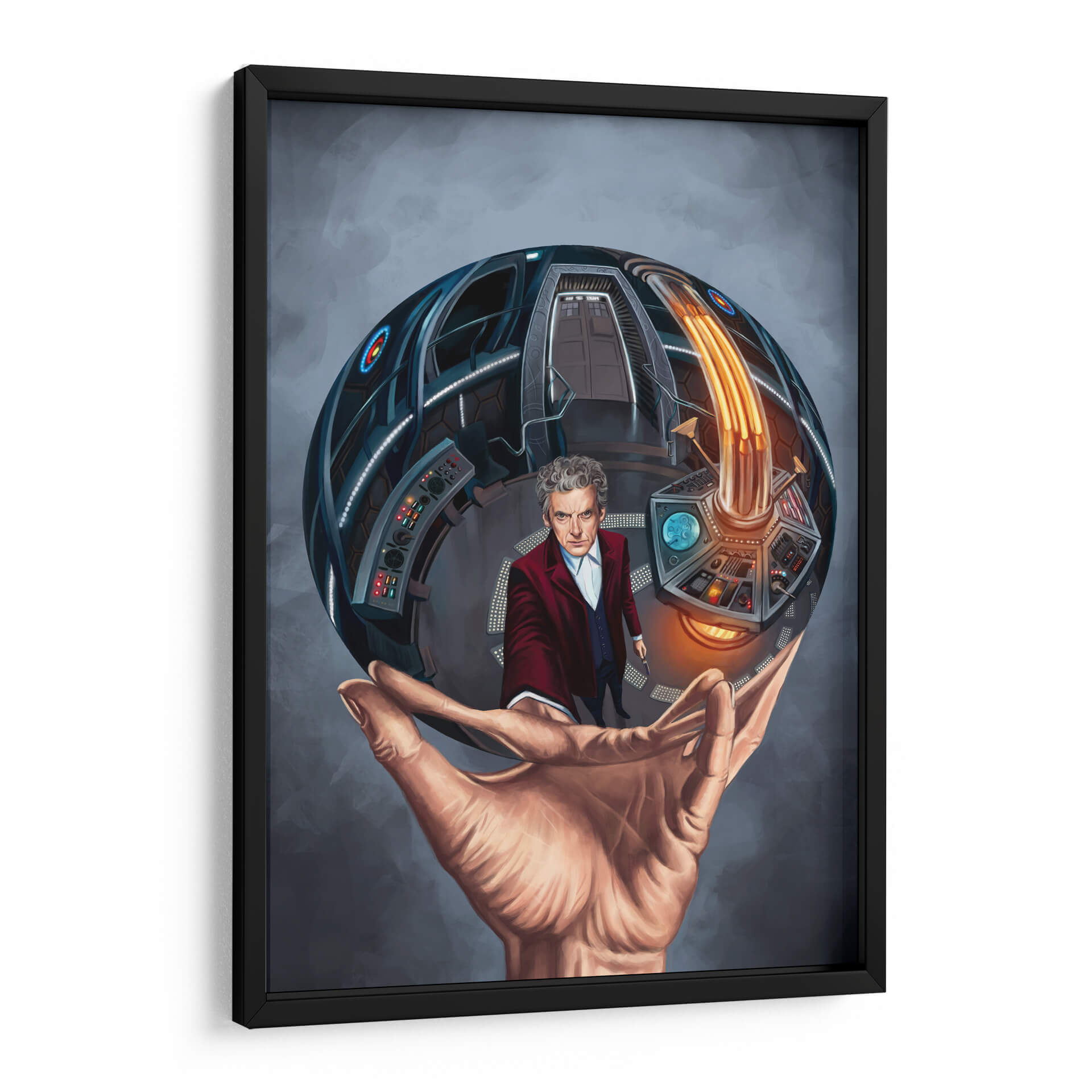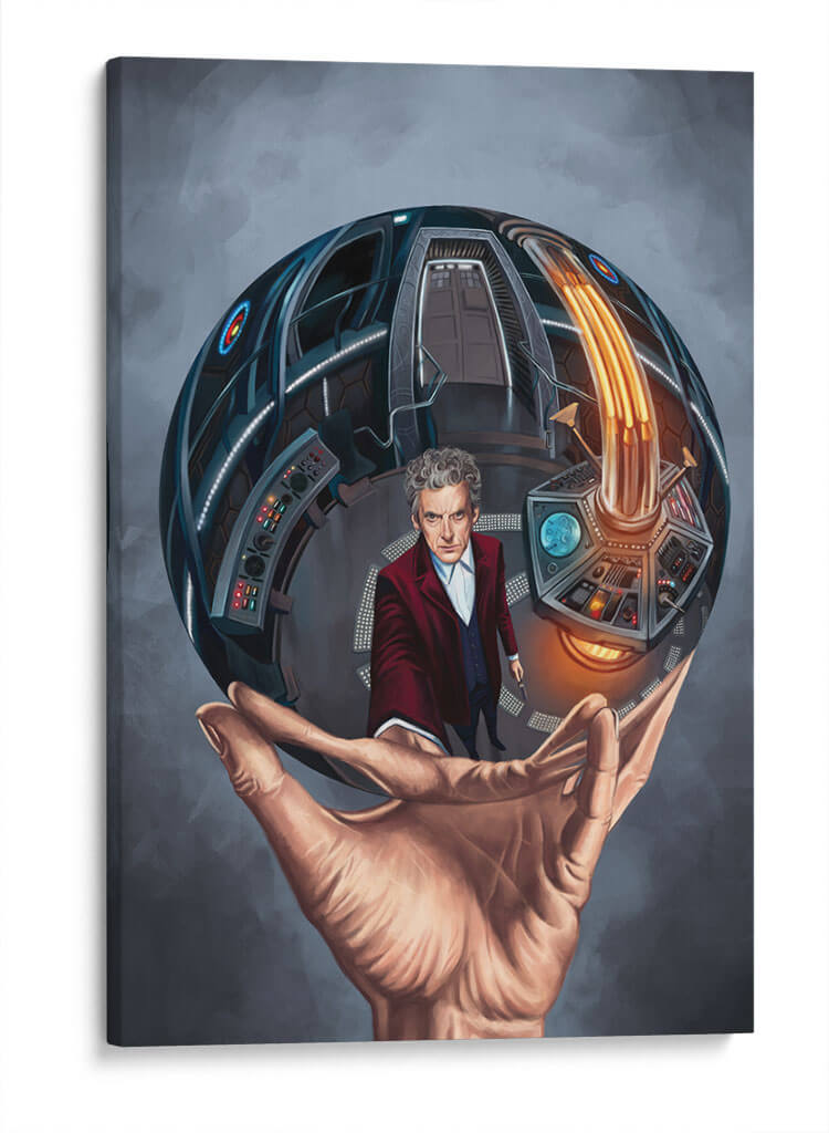 Sumérgete en el fascinante universo de la ciencia ficción con este cautivador cuadro decorativo inspirado en "Doctor Who". La obra presenta una representación artística de un personaje icónico dentro de una esfera detallada que evoca la icónica TARDIS, sostenida por una mano humana que simboliza la conexión entre la realidad y la fantasía. Los tonos grises predominantes del fondo contrastan con los vibrantes azules y naranjas del interior de la esfera, creando una atmósfera de misterio y aventura. El estilo de la ilustración es detallado y realista, con un enfoque en la expresión del personaje y la complejidad tecnológica del interior de la nave. Este cuadro es perfecto para los fanáticos de la serie o para quienes buscan una pieza de arte única que inyecte un toque de imaginación y nostalgia a su hogar u oficina. Ideal para salas de estar, estudios o incluso dormitorios, este cuadro decorativo se convertirá en un punto focal que invita a la conversación y a la contemplación de las infinitas posibilidades del tiempo y el espacio. Añade un toque de aventura y estilo a tu decoración con esta pieza excepcional que celebra el espíritu explorador y la imaginación desbordante.