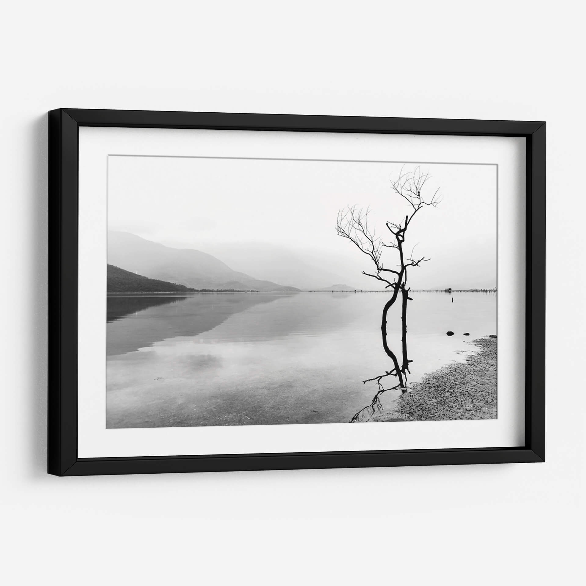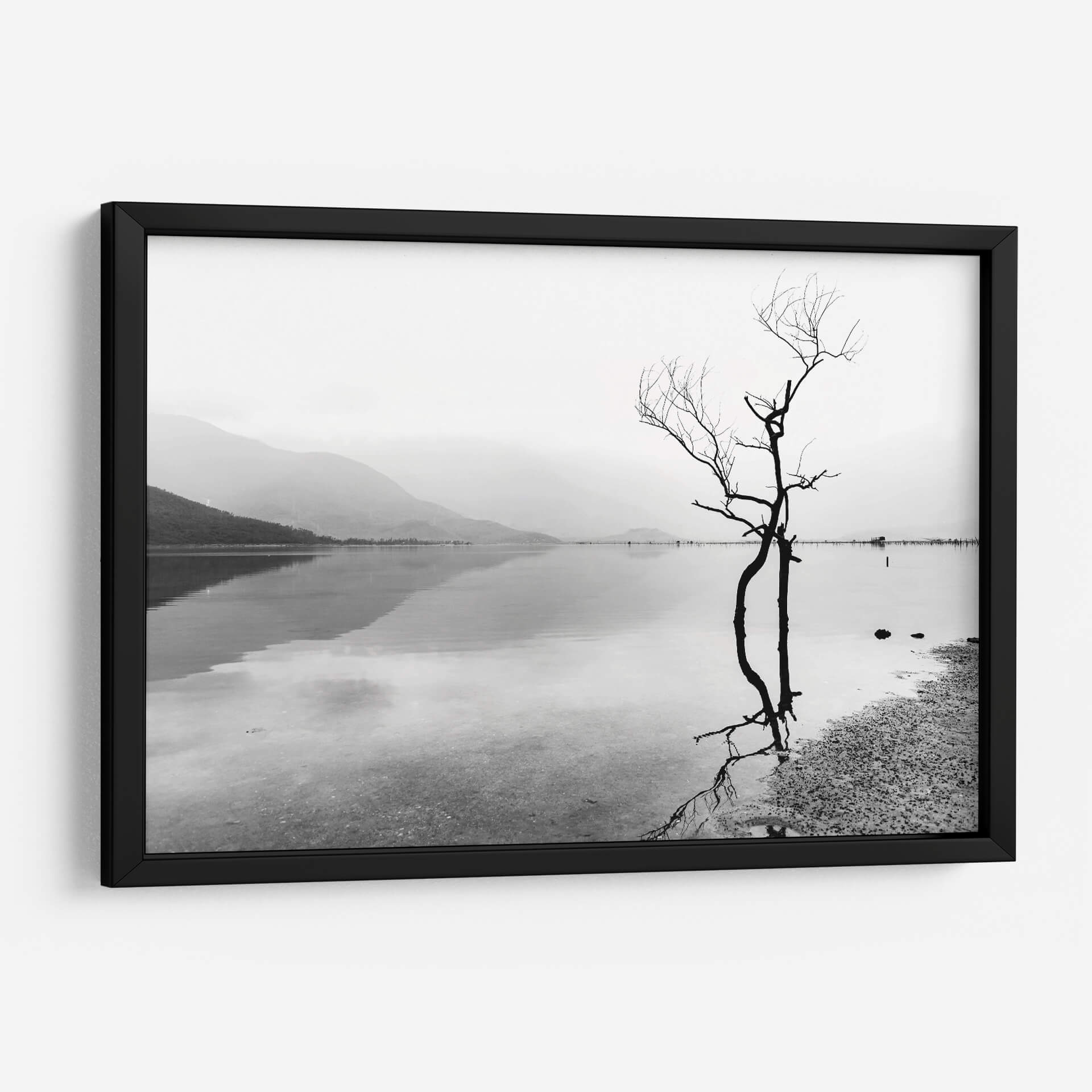 Sumérgete en la serena belleza de 'Donde el Cielo Toca el Lago - Vietnam', una obra de arte que captura la esencia mística de un paisaje etéreo. Esta pieza, firmada por Wandering Pixels Co., te transportará a un lugar de tranquilidad y reflexión. La fotografía en blanco y negro se centra en la silueta de un árbol desnudo que se alza con gracia en la orilla de un lago sereno, sus ramas extendiéndose como intrincados dibujos contra un cielo brumoso y unas montañas lejanas que se difuminan en la distancia. El reflejo del árbol y del paisaje en el agua crea un efecto hipnótico y simétrico, duplicando la calma visual de la escena. La paleta monocromática, rica en matices de gris, evoca una atmósfera de paz profunda y contemplación, perfecta para espacios que buscan un toque de sofisticación y serenidad. Ideal para salones, dormitorios o estudios que anhelan una conexión con la naturaleza y un refugio visual del bullicio diario, este cuadro decorativo se convertirá en un punto focal que invita a la introspección y a la admiración de la belleza sutil. Transforma tu hogar en un santuario de calma con esta cautivadora imagen.