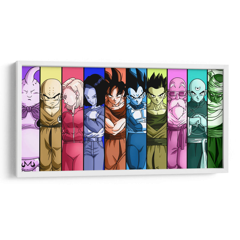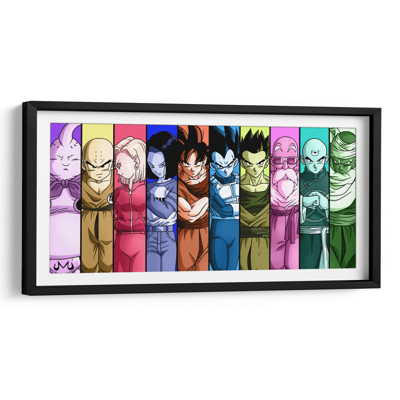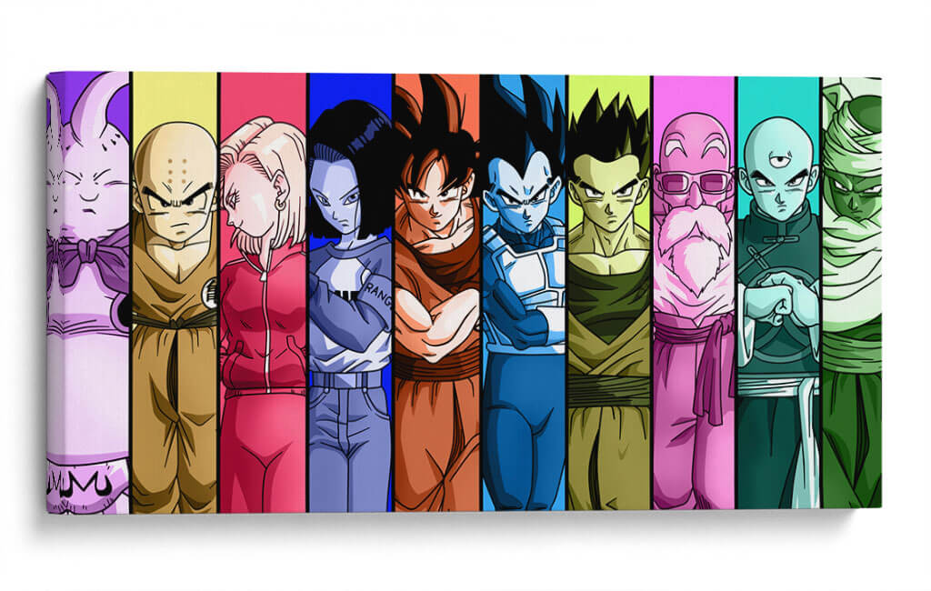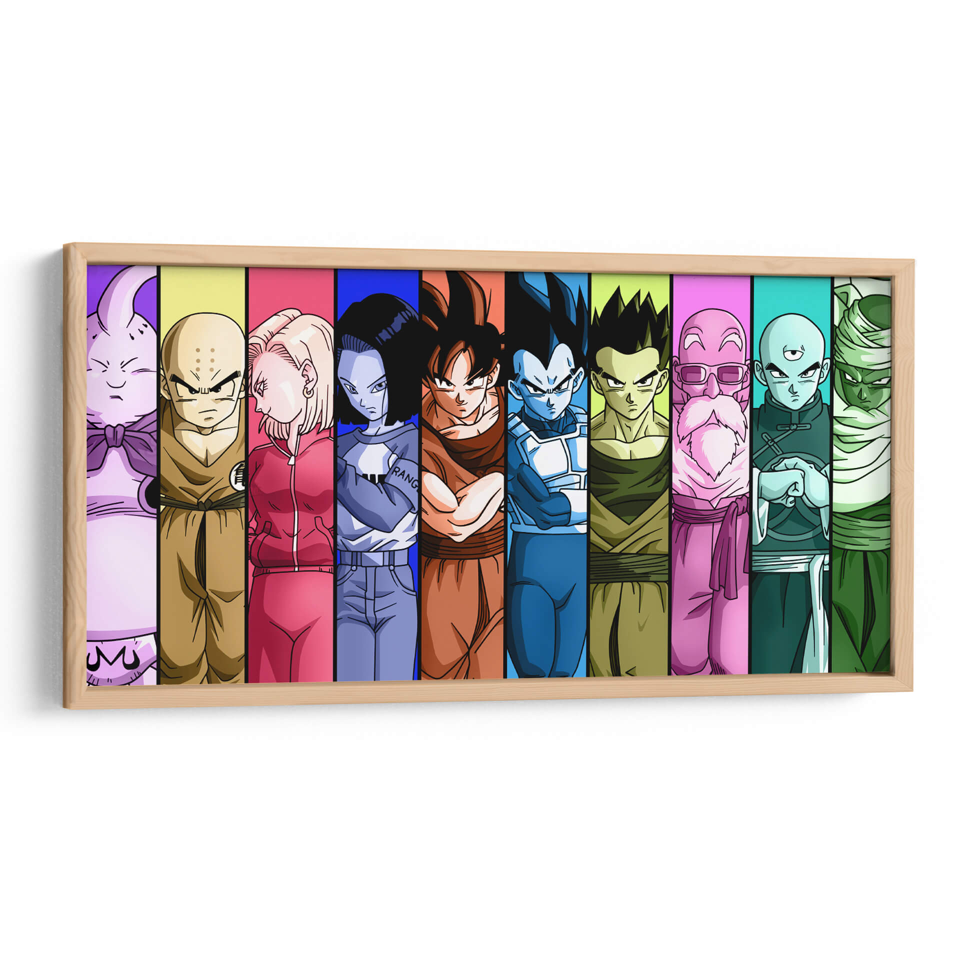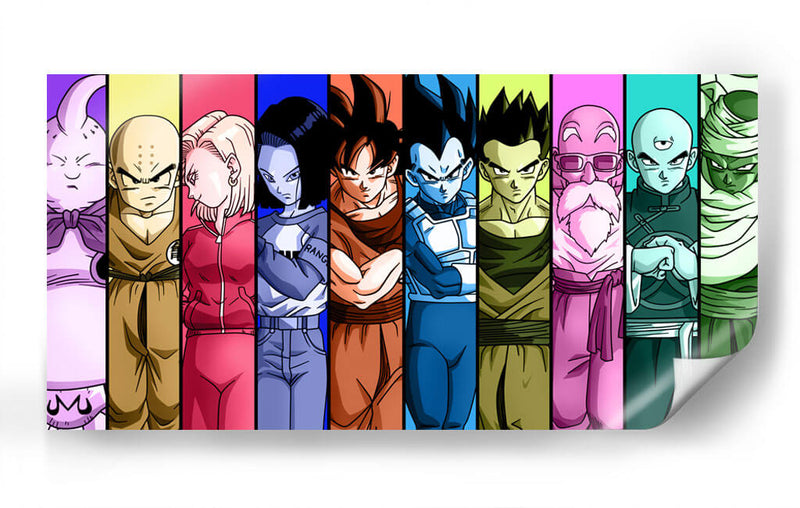Revive la épica saga de Dragon Ball Z con este vibrante cuadro decorativo que captura la esencia de sus personajes más icónicos. Dividida en franjas verticales de colores vivos que contrastan y armonizan, cada sección presenta a un héroe o villano emblemático, desde la imponente presencia de Majin Buu hasta la determinación de Vegeta y la lealtad de Goku. La paleta de colores es audaz y saturada, con tonos morados, amarillos, rosas, azules y verdes que aportan energía y dinamismo a la composición. Este estilo gráfico, inspirado en el anime, es perfecto para añadir un toque de nostalgia y emoción a cualquier espacio, ya sea una sala de estar moderna, una habitación de gaming o un despacho. La disposición de los personajes crea un flujo visual atractivo, invitando al espectador a recorrer la historia a través de sus rostros y vestimentas características. Ideal para los fanáticos de la serie y para quienes buscan una pieza de arte de pared que irradie poder, amistad y aventura. Transforma tu hogar en un santuario para los guerreros Z y celebra el legado de una de las franquicias más queridas de todos los tiempos con este impresionante cuadro decorativo.