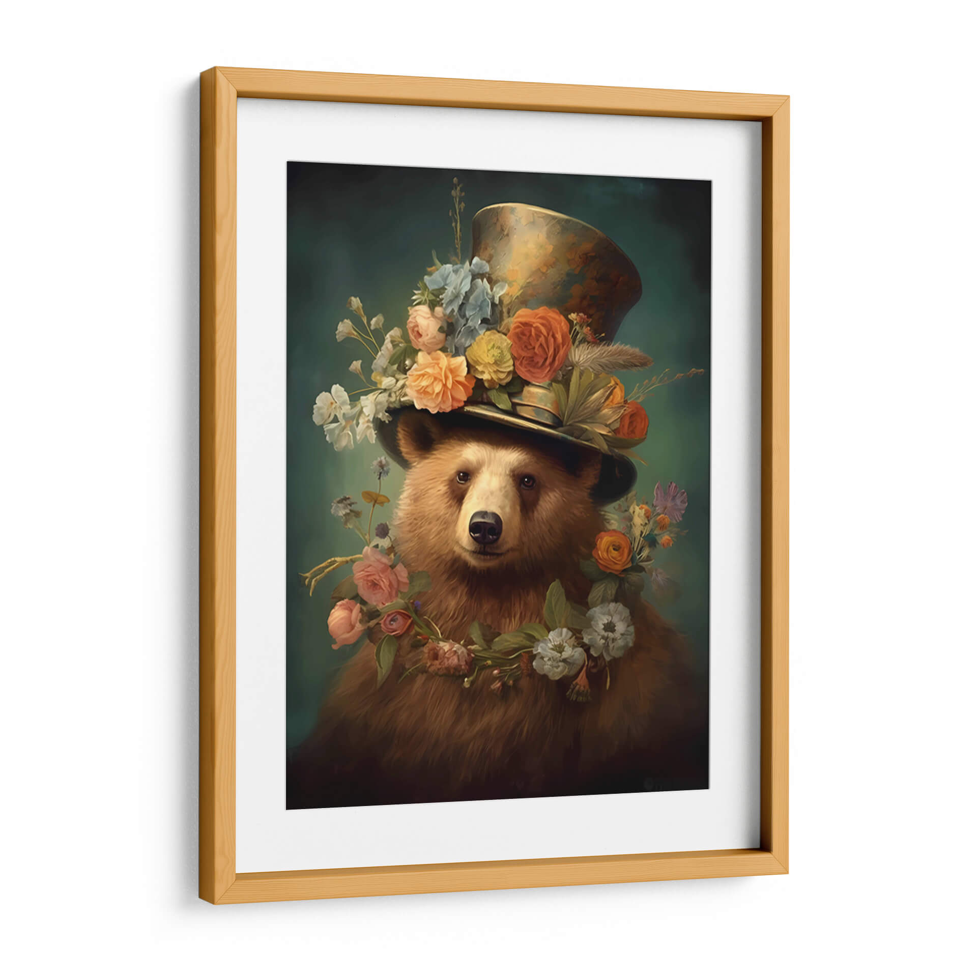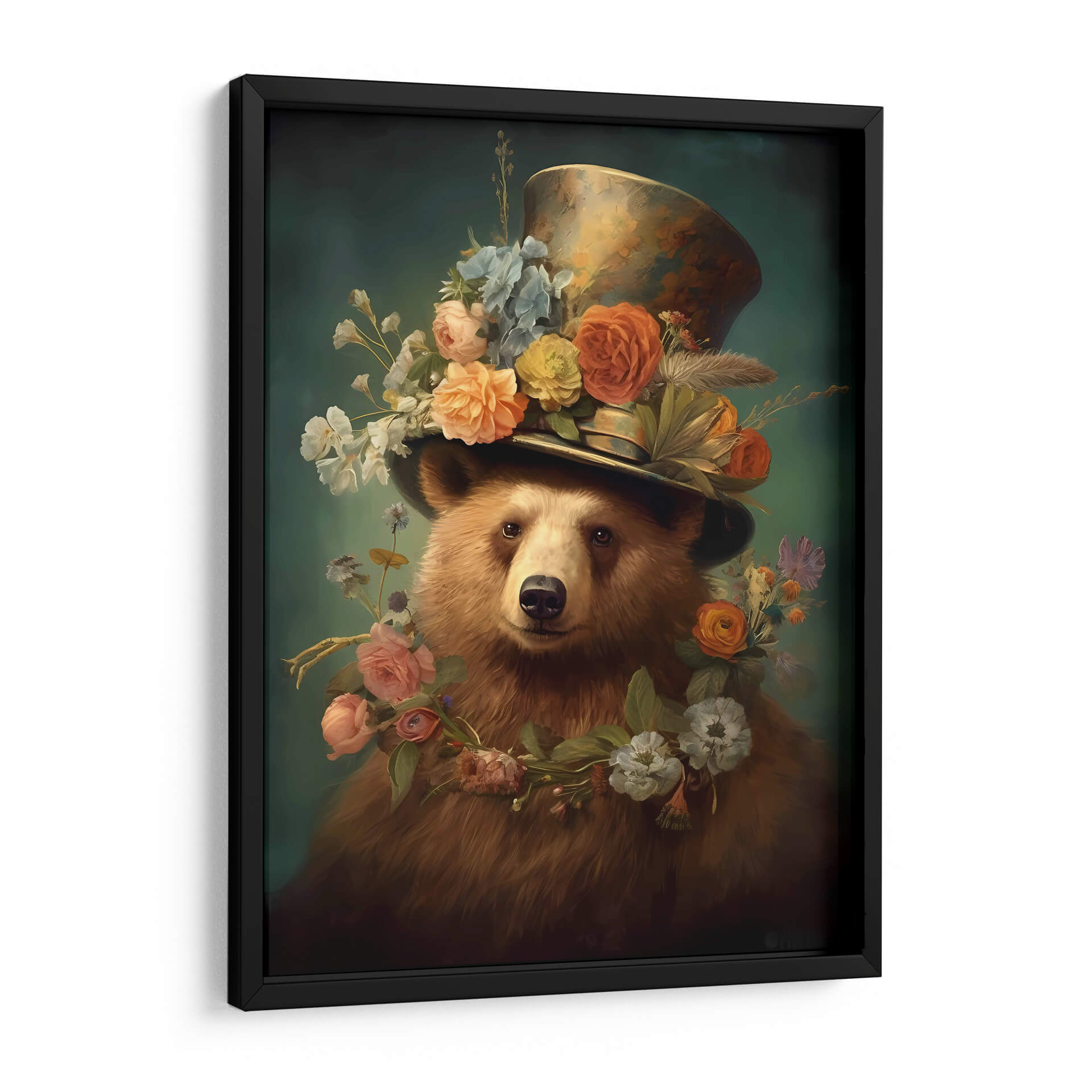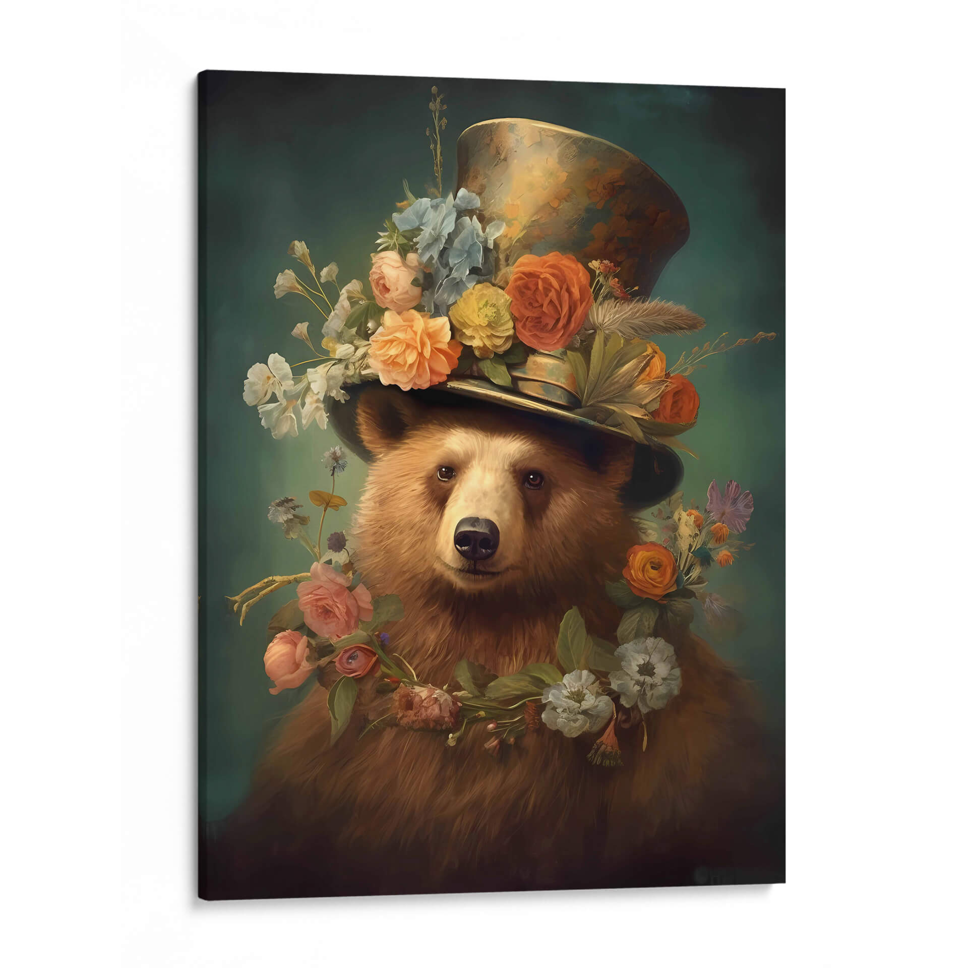 Este cautivador cuadro decorativo, titulado "El Oso" por Jessica CA, presenta un retrato de un oso con un sombrero de copa adornado con exuberantes flores. La obra utiliza una paleta de colores rica y profunda, con tonos tierra cálidos que contrastan maravillosamente con los vibrantes naranjas, rosas y azules de las flores, todo ello sobre un fondo verde oscuro y atmosférico. La composición se centra en el rostro del oso, transmitiendo una sensación de tranquilidad y una elegancia inesperada, casi regia, gracias al sombrero y las guirnaldas florales. El estilo podría definirse como un realismo mágico o surrealismo amable, donde la naturaleza y la fantasía se entrelazan de forma armoniosa. Es una pieza que evoca curiosidad y ternura, perfecta para añadir un toque de originalidad y sofisticación a cualquier espacio. Ideal para salones, estudios o incluso dormitorios que busquen una declaración de estilo única y un punto de conversación. "El Oso" es más que una simple imagen; es una invitación a la imaginación y un toque de belleza natural con un giro encantador, ideal para quienes buscan arte que cuente una historia y despierte emociones.