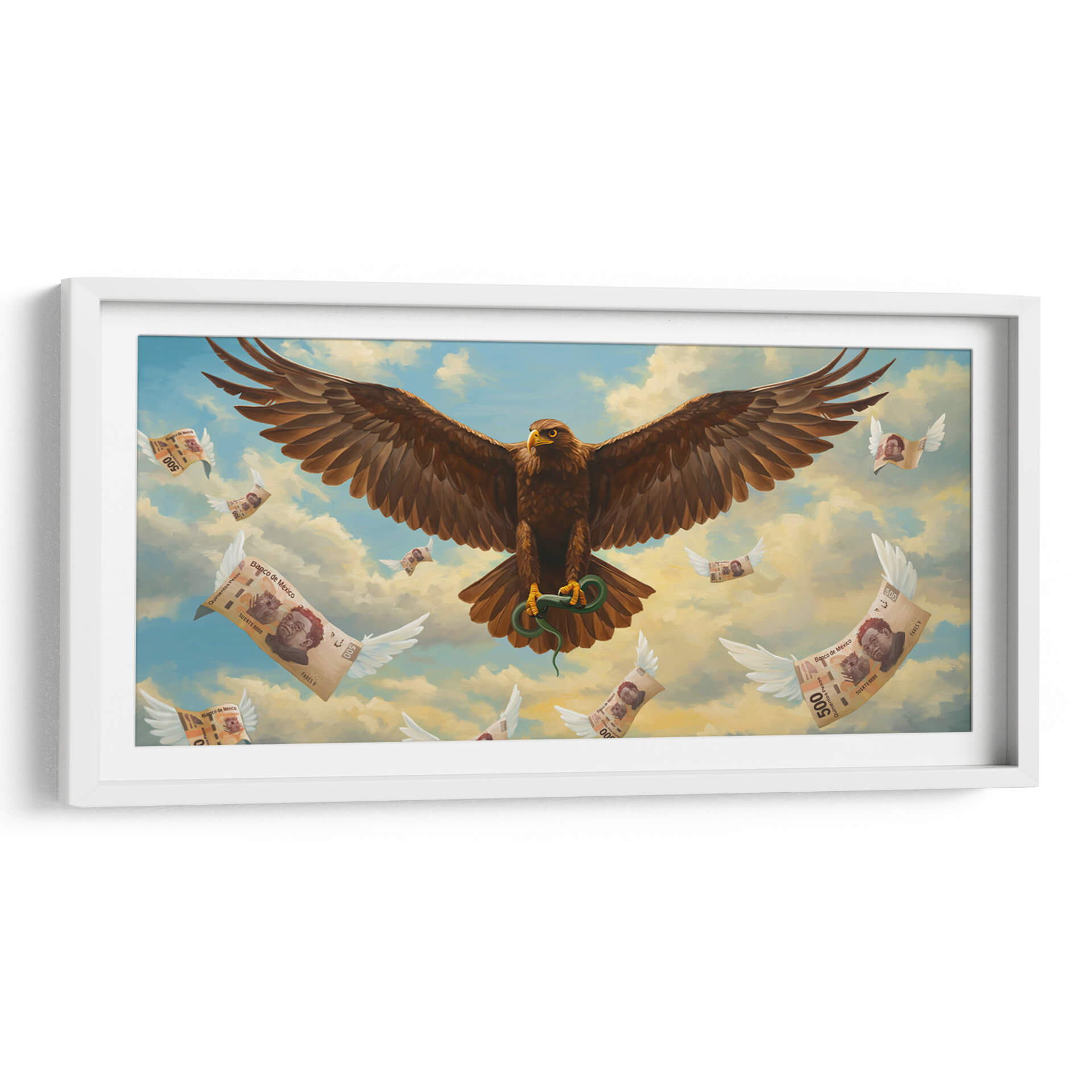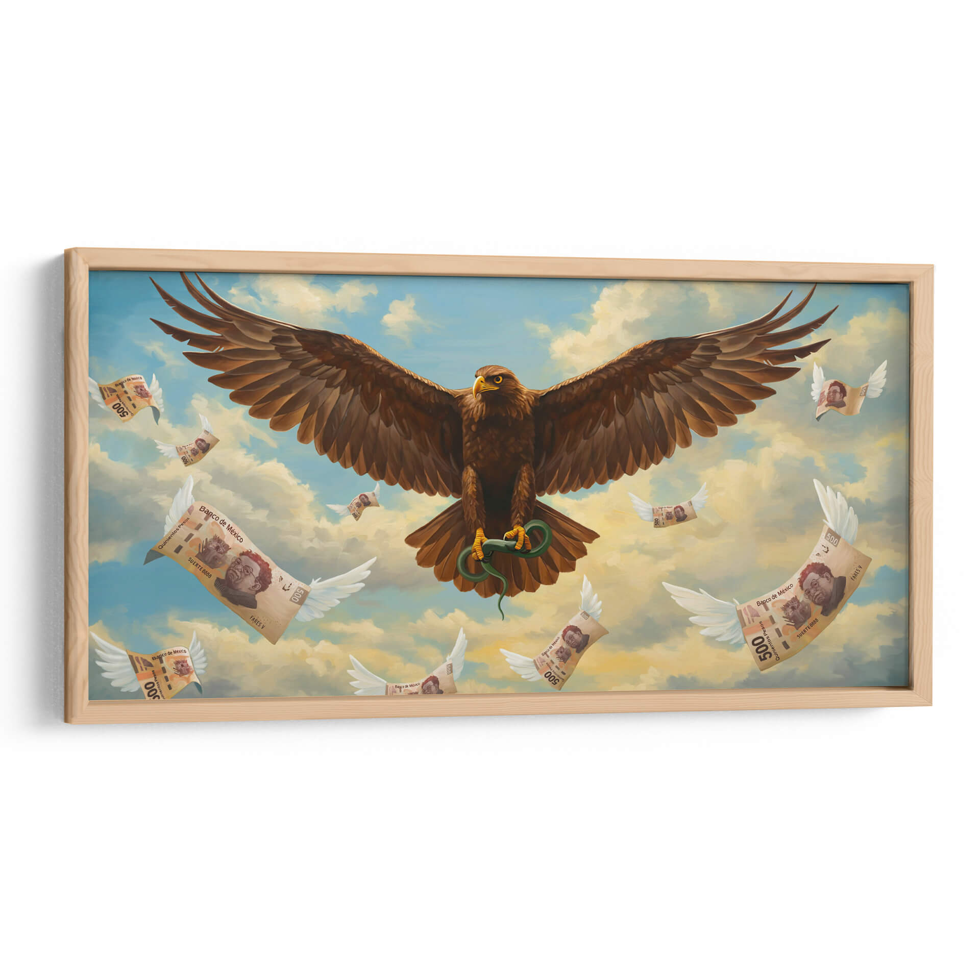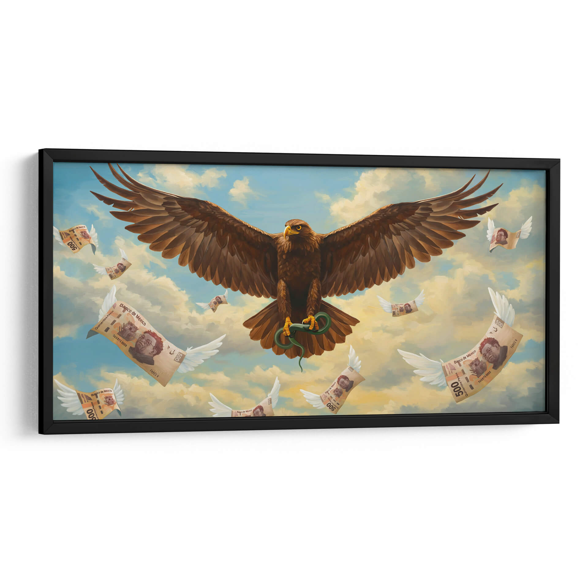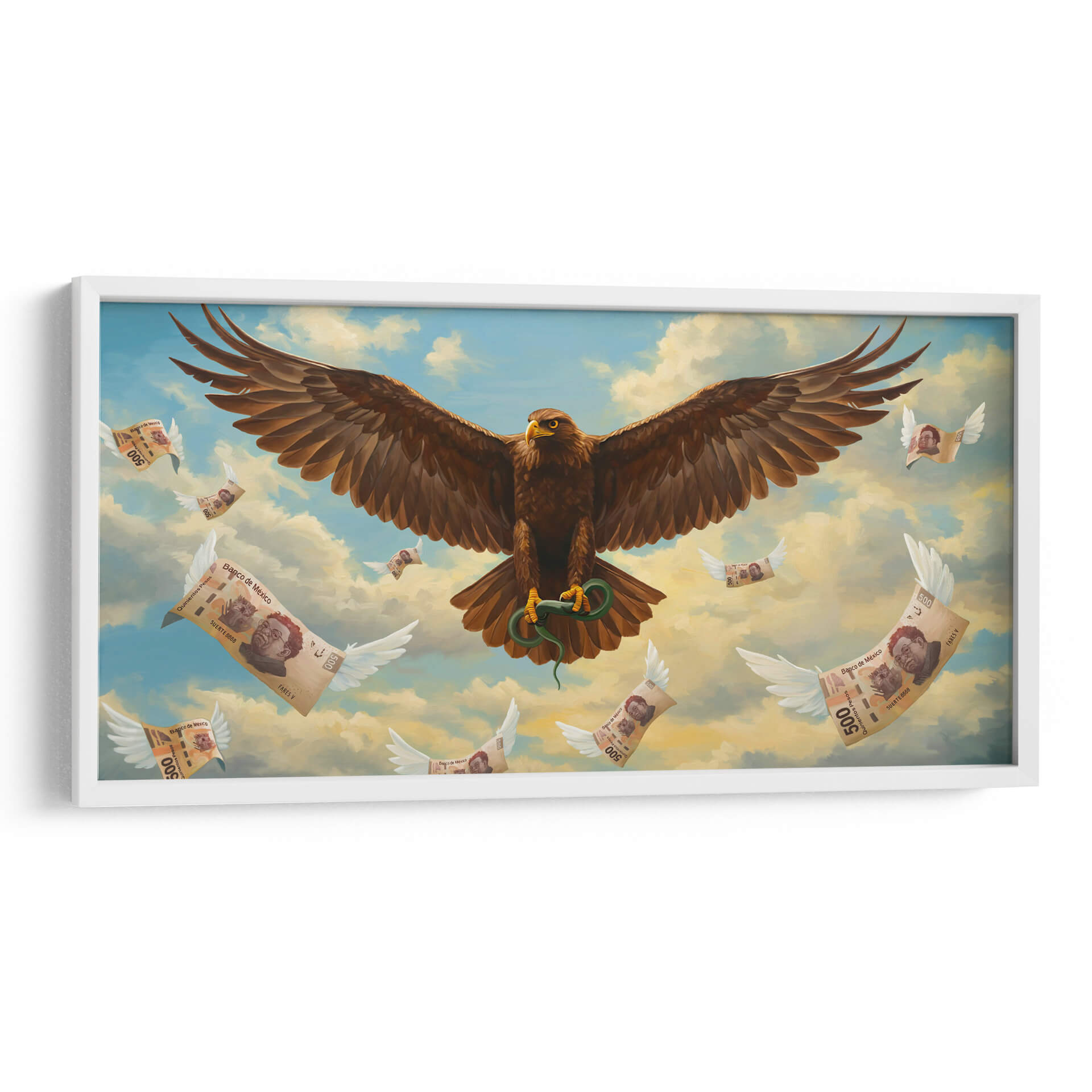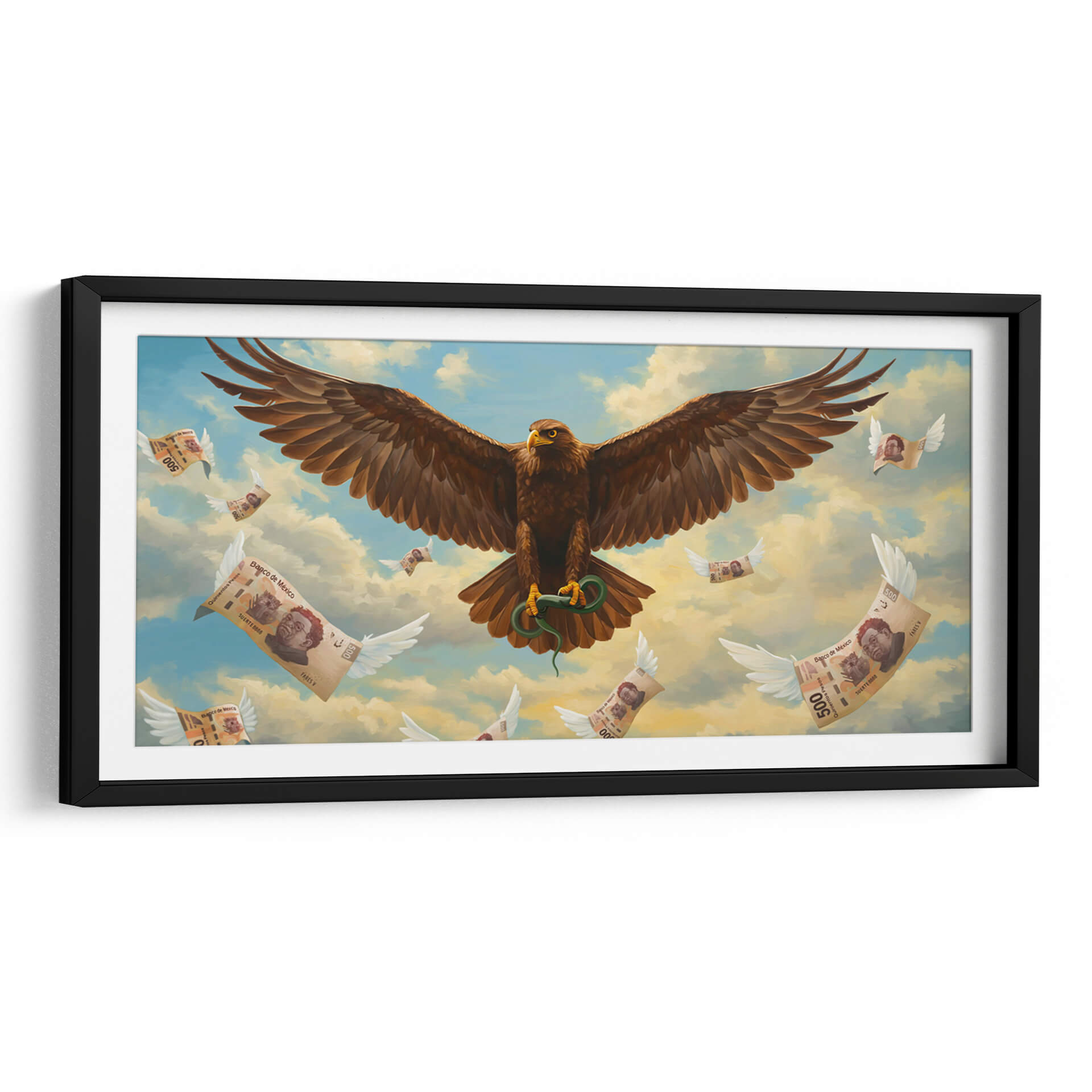 Este cautivador cuadro decorativo, "El Peso Está Por Las Nubes" de Fares Verdugo, te transporta a un cielo vibrante donde un majestuoso águila real despliega sus alas, aferrando una serpiente en sus garras. La obra se sumerge en una paleta de colores celestes y ocres, creando una atmósfera de poder y movimiento. El estilo realista con toques surrealistas del artista da vida a billetes de quinientos pesos mexicanos, cada uno con alas blancas, que revolotean como pájaros en el aire, añadiendo un elemento de fantasía y comentario social. La composición dinámica, centrada en el águila y la caída de la moneda, evoca una sensación de fuerza, libertad y la volatilidad de los mercados. Este cuadro es ideal para espacios que buscan un punto focal audaz y reflexivo, como oficinas, salas de estar o estudios, añadiendo un toque de intriga y conversación a la decoración. La detallada representación del águila y los billetes, junto con el cielo nublado y luminoso, crea una pieza que es tanto estéticamente impresionante como conceptualmente rica, perfecta para quienes aprecian el arte contemporáneo con profundidad. Descubre la fuerza y el simbolismo de esta obra única.
