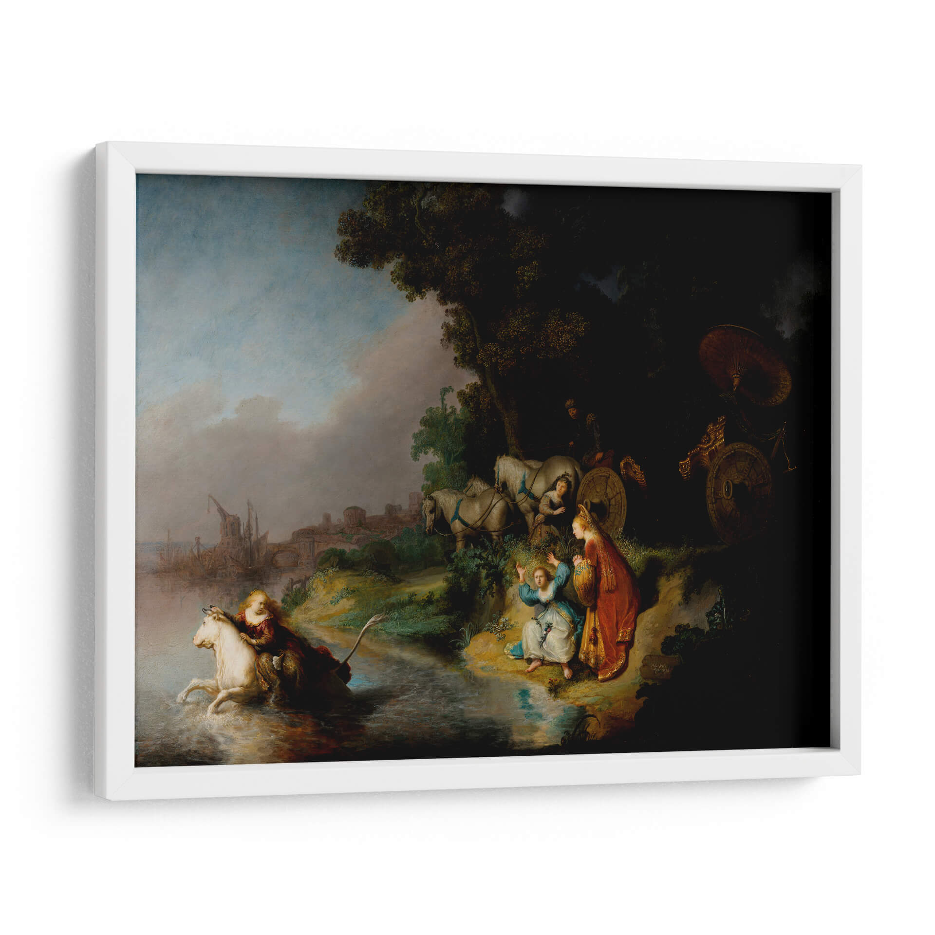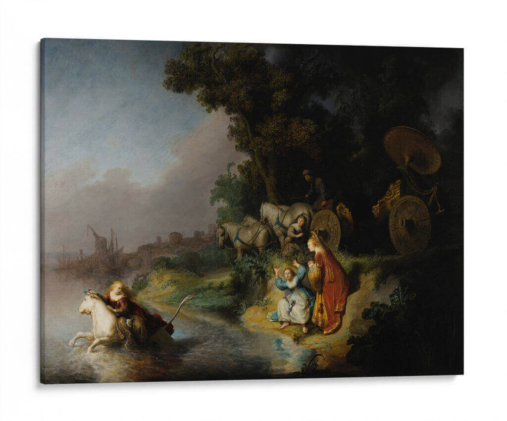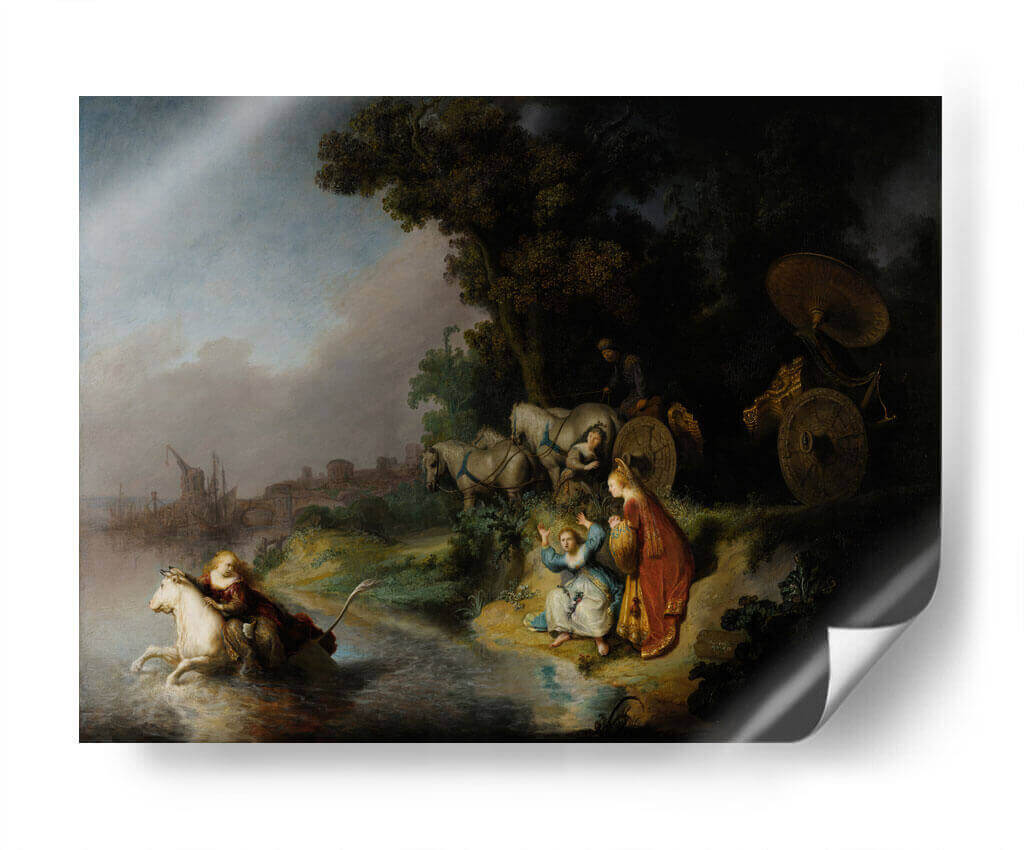 Sumérgete en la dramática narrativa de 'El rapto de Europa', una obra maestra que captura un momento de intensa emoción y movimiento. Rembrandt van Rijn nos transporta a una escena mitológica donde figuras humanas y animales interactúan en un paisaje evocador, marcado por un cielo tormentoso y una vegetación exuberante que se funde con la oscuridad. La composición, con su juego de luces y sombras, dirige la mirada hacia los personajes centrales y el acto que da nombre a la pintura, creando una atmósfera de urgencia y destino. Los tonos tierra, azules profundos y toques dorados se entrelazan para construir una paleta rica y sombría que acentúa la profundidad y el realismo de la escena. Este cuadro decorativo es una pieza ideal para añadir un toque de historia y arte clásico a tu hogar u oficina, inspirando conversaciones y admiración. Perfecto para aquellos que buscan una decoración de pared con carácter, profundidad y una conexión con las grandes obras de la historia del arte, esta representación clásica aportará un aire de sofisticación y drama a cualquier estancia, convirtiéndose en un punto focal inolvidable.