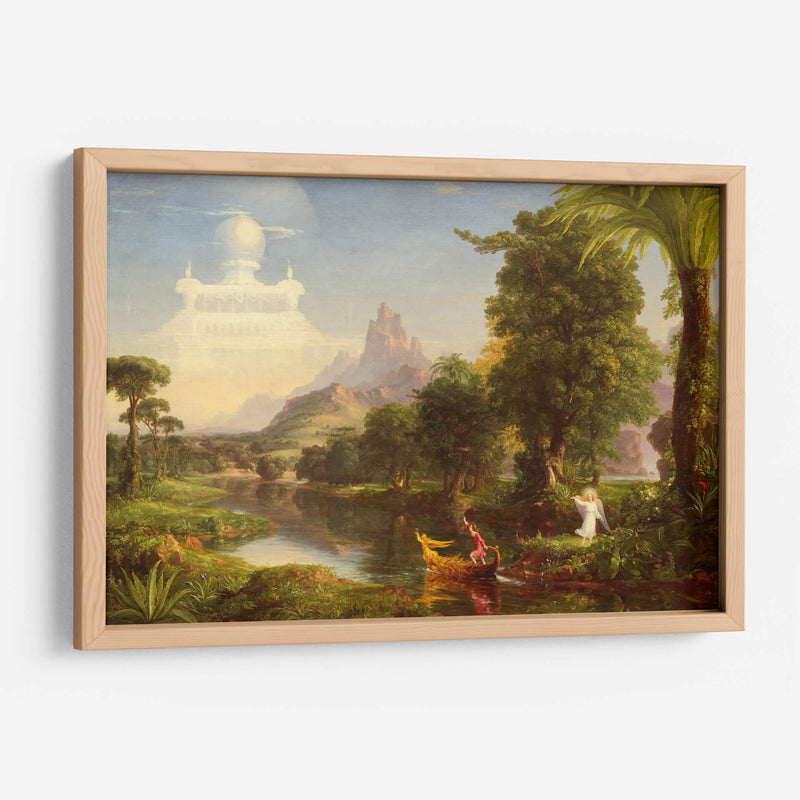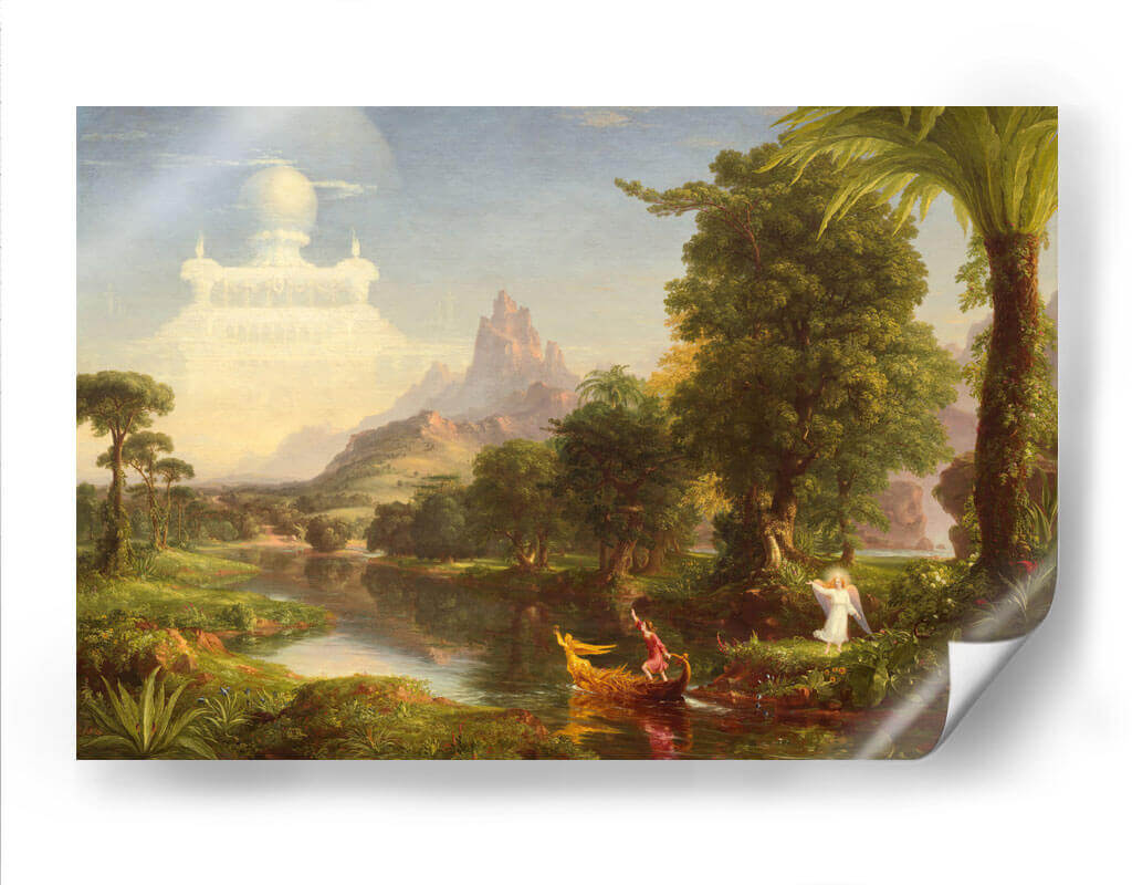 Embárquese en "El Viaje de la Vida: Juventud", una obra maestra de Thomas Cole que captura la exuberancia y la promesa de la vida. Este cuadro decorativo transporta al espectador a un paisaje idílico, donde un río sereno fluye a través de una vegetación exuberante y montañas majestuosas se alzan en el horizonte. La escena está iluminada por una luz celestial que emana de una estructura etérea en las nubes, sugiriendo un destino espiritual o un ideal inalcanzable. En primer plano, una figura en una embarcación dorada parece iniciar una travesía, guiada o recibida por una figura angelical en la orilla. La vibrante paleta de verdes, azules y tonos tierra, junto con el estilo romántico del paisajismo americano, crea una atmósfera de asombro, esperanza y aventura. "El Viaje de la Vida: Juventud" es perfecto para infundir inspiración y un sentido de propósito en cualquier espacio, ya sea una sala de estar, un estudio o una oficina. Este cuadro decorativo es una invitación a contemplar el inicio de un gran viaje, lleno de potencial y maravilla, ideal para aquellos que buscan arte que eleve el espíritu y fomente la reflexión sobre el camino de la vida.