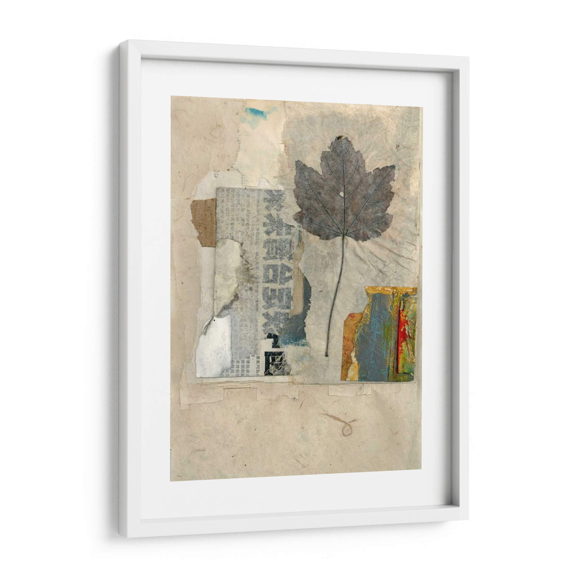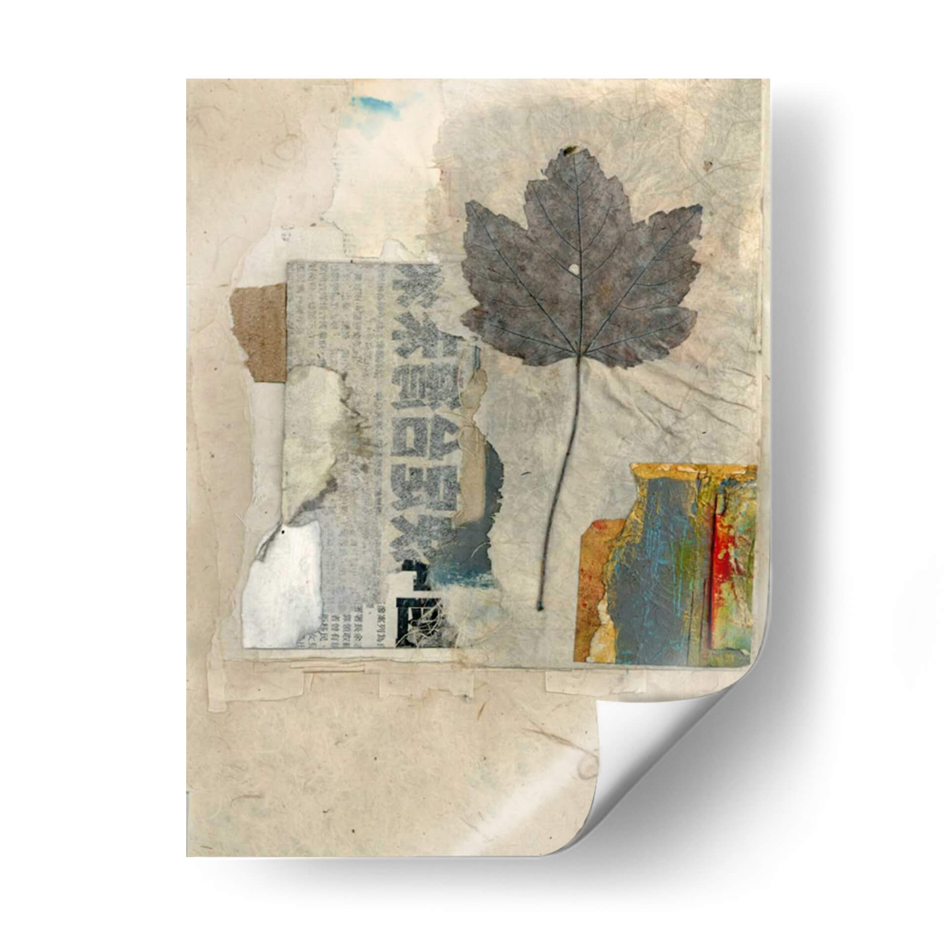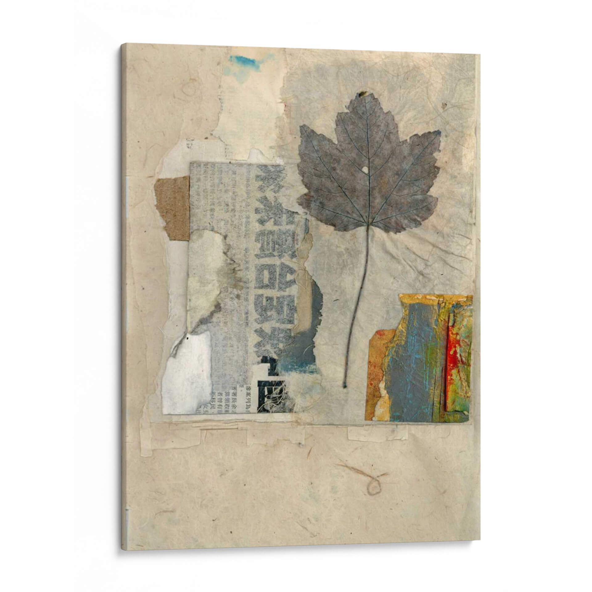 Sumérgete en la delicada belleza de "Elementos Naturales Iii", una obra de arte textil que evoca la serenidad y la conexión con la naturaleza. Esta pieza, creada por Elena Ray, presenta una hoja de arce grisácea y detallada, suspendida sobre un fondo texturizado de papel reciclado y fragmentos de periódico. La paleta de colores se centra en tonos tierra, beiges y grises, salpicada sutilmente por toques de azul y los vibrantes colores de una textura similar a la corteza en la esquina inferior derecha. El estilo de collage y assemblage confiere a la obra una profundidad y una narrativa visual únicas, invitando a la contemplación y al descubrimiento de sus capas. "Elementos Naturales Iii" es perfecta para añadir un toque orgánico y sofisticado a cualquier espacio, ya sea un hogar acogedor, una oficina moderna o un estudio creativo. Su atmósfera tranquila y reflexiva la convierte en un punto focal ideal para crear un ambiente de calma y apreciación por la belleza efímera del mundo natural. Descubre la armonía de texturas y la sutileza del color en este cuadro decorativo que celebra la esencia de la naturaleza a través de una perspectiva artística contemporánea. Ideal para quienes buscan inspiración en lo sencillo y lo cotidiano.