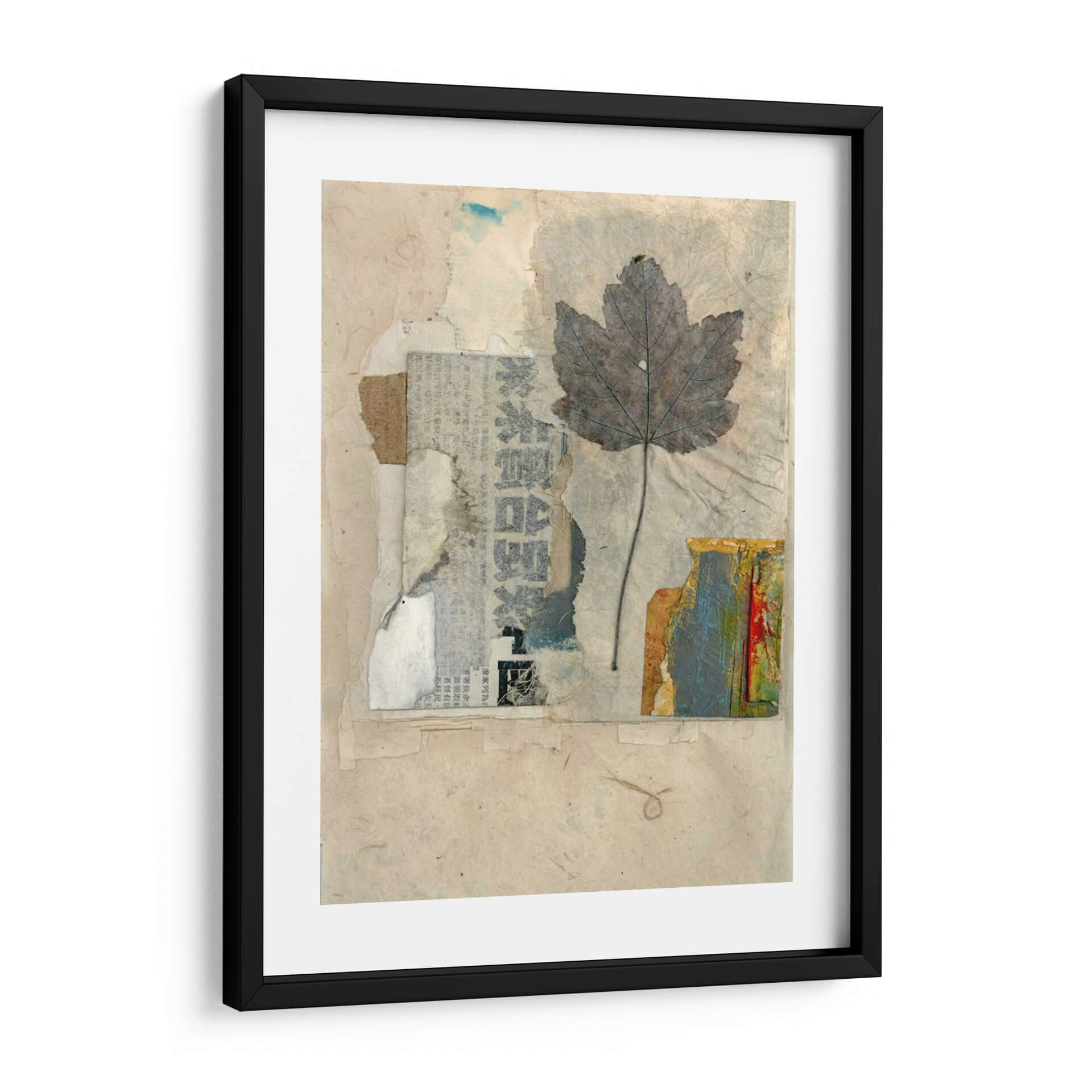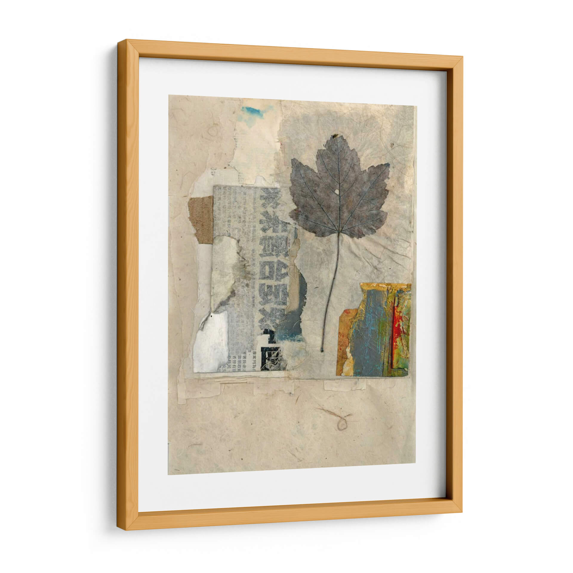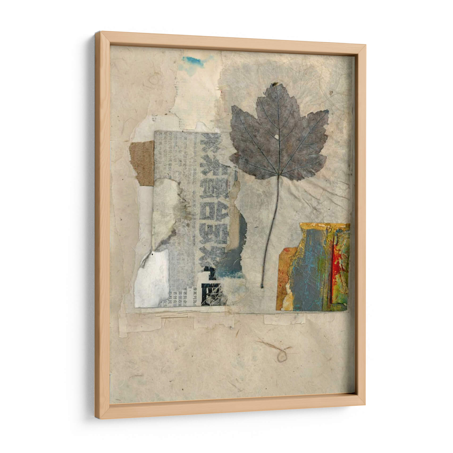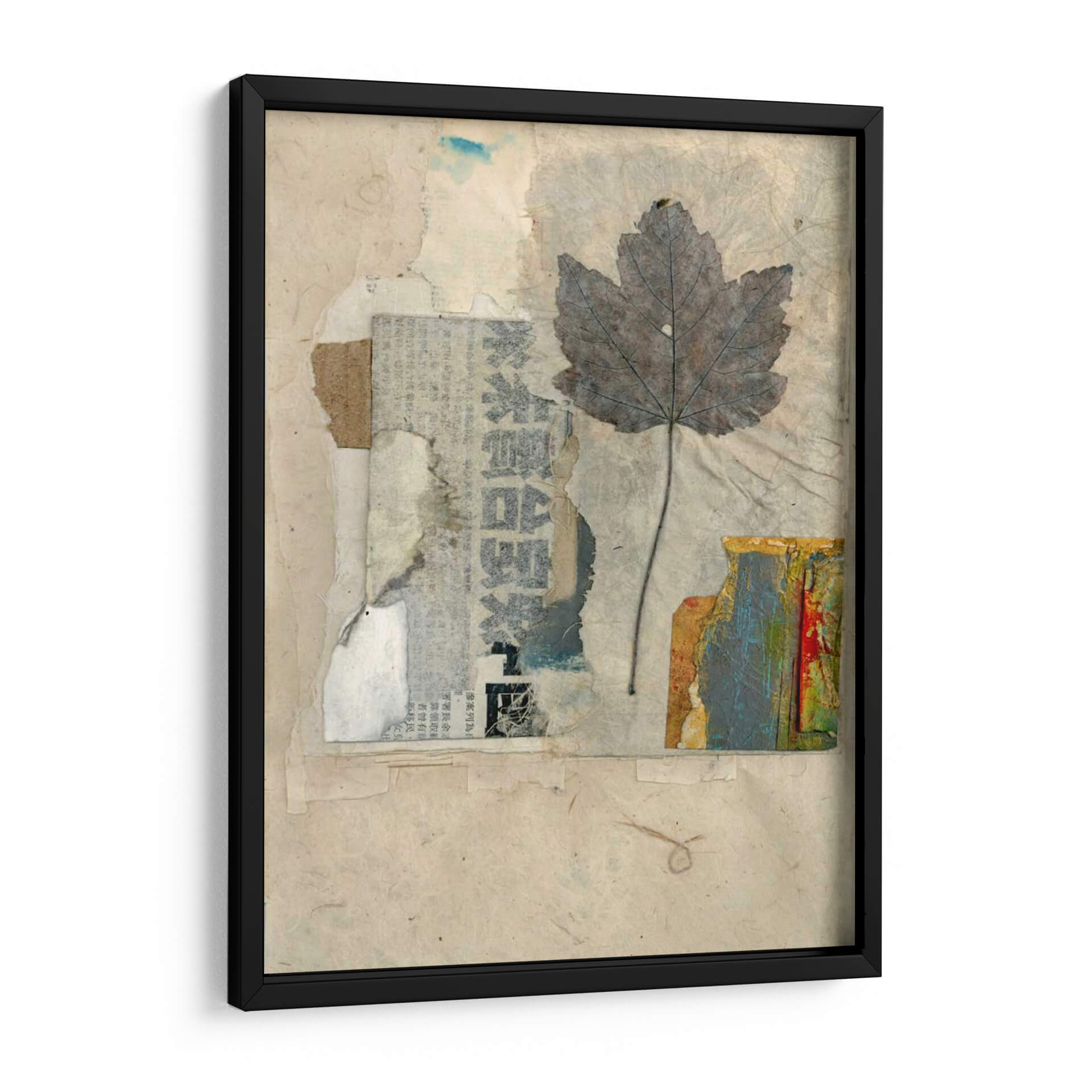 Sumérgete en la delicada belleza de "Elementos Naturales Iii", una obra de arte textil que evoca la serenidad y la conexión con la naturaleza. Esta pieza, creada por Elena Ray, presenta una hoja de arce grisácea y detallada, suspendida sobre un fondo texturizado de papel reciclado y fragmentos de periódico. La paleta de colores se centra en tonos tierra, beiges y grises, salpicada sutilmente por toques de azul y los vibrantes colores de una textura similar a la corteza en la esquina inferior derecha. El estilo de collage y assemblage confiere a la obra una profundidad y una narrativa visual únicas, invitando a la contemplación y al descubrimiento de sus capas. "Elementos Naturales Iii" es perfecta para añadir un toque orgánico y sofisticado a cualquier espacio, ya sea un hogar acogedor, una oficina moderna o un estudio creativo. Su atmósfera tranquila y reflexiva la convierte en un punto focal ideal para crear un ambiente de calma y apreciación por la belleza efímera del mundo natural. Descubre la armonía de texturas y la sutileza del color en este cuadro decorativo que celebra la esencia de la naturaleza a través de una perspectiva artística contemporánea. Ideal para quienes buscan inspiración en lo sencillo y lo cotidiano.