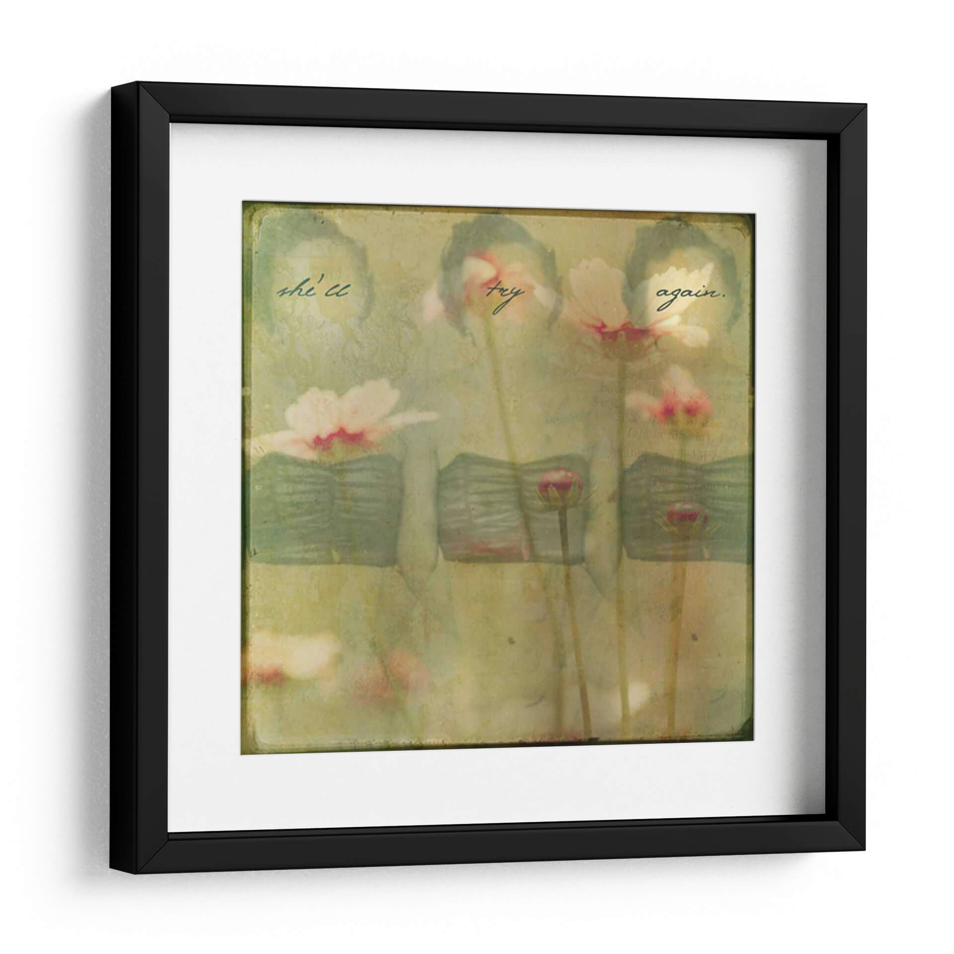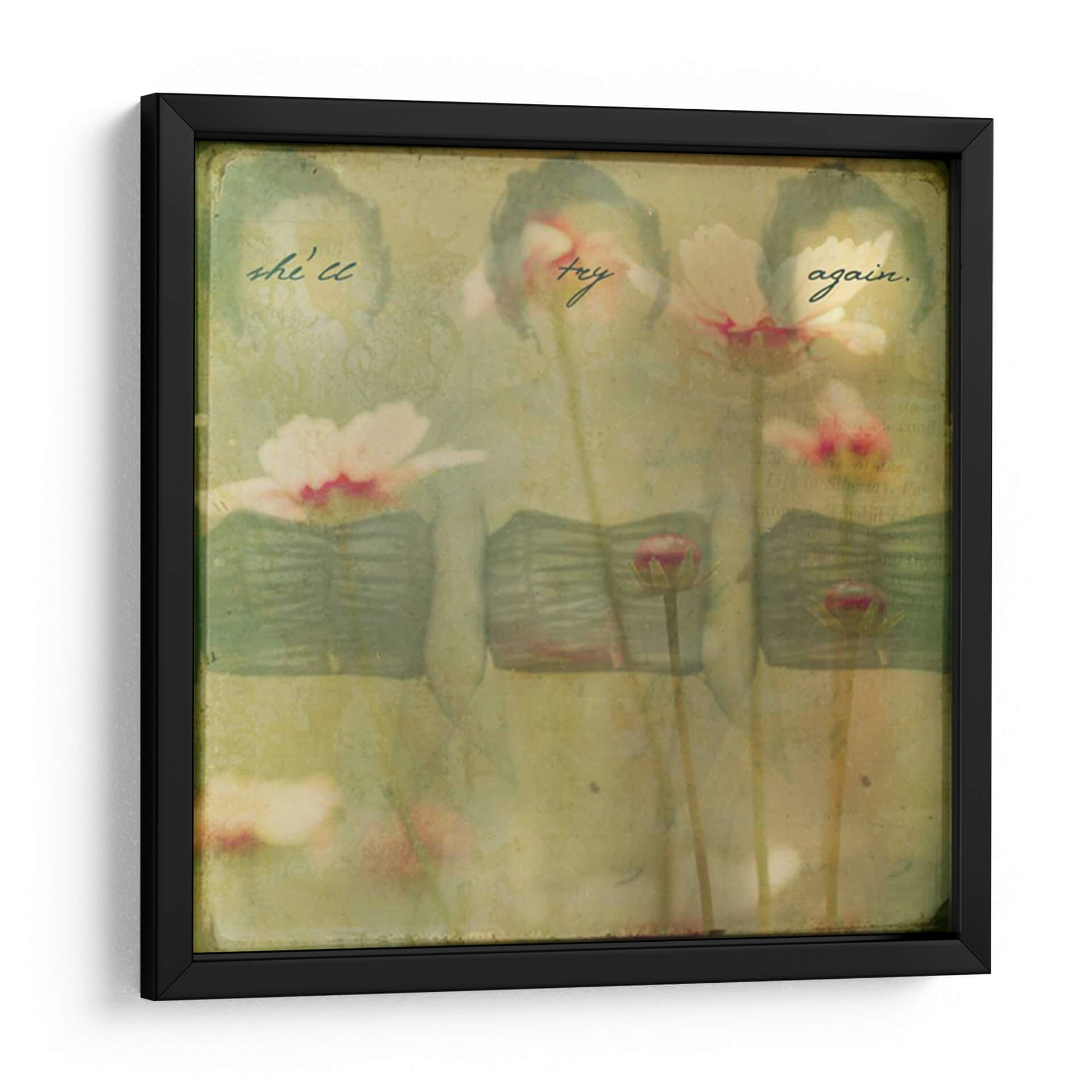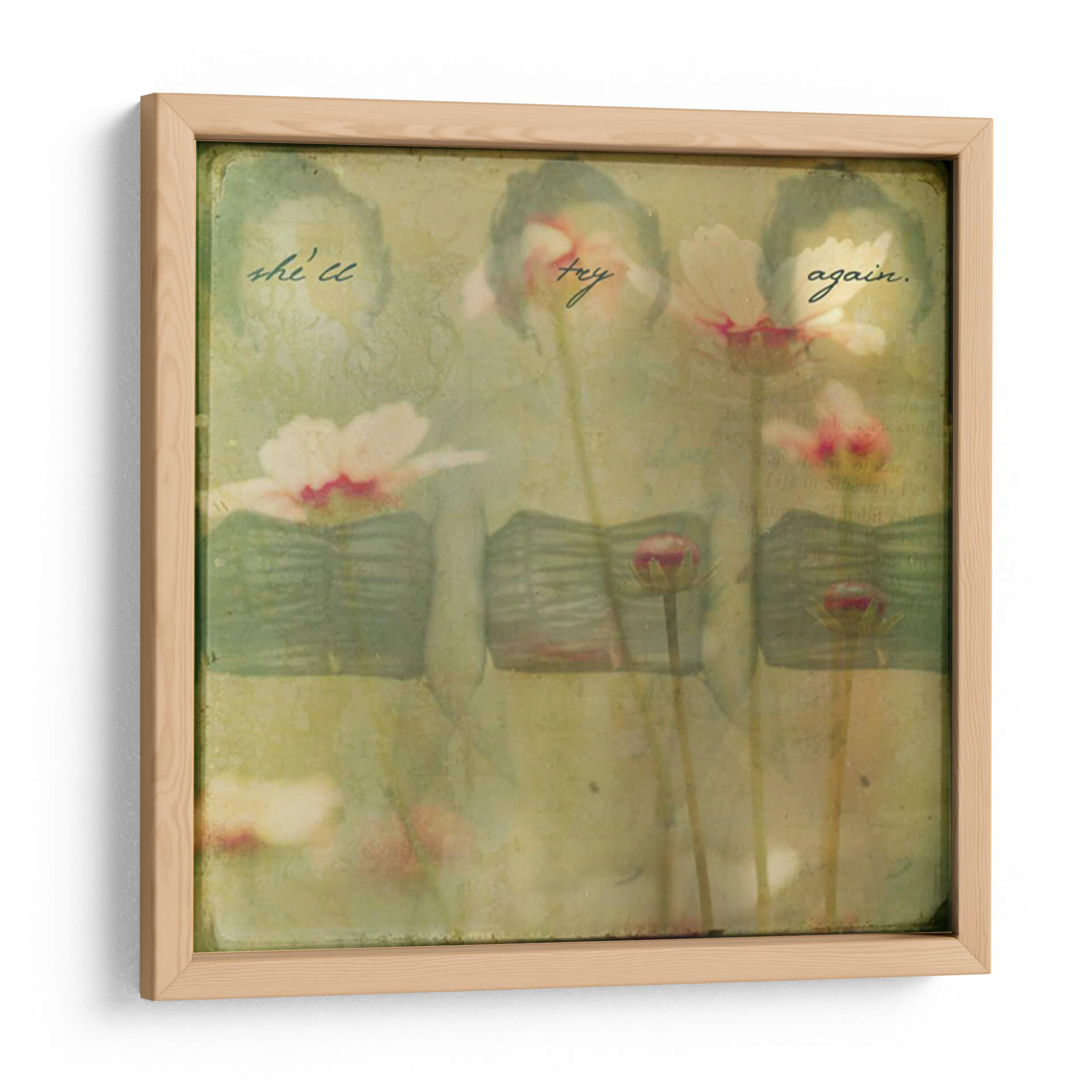 Sumérgete en la delicadeza y la perseverancia con "Ella III", una obra de arte que evoca una atmósfera etérea y reflexiva. La pieza presenta figuras femeninas etéreas, sutilmente superpuestas y rodeadas de flores delicadas, creando una composición onírica. La paleta de colores se centra en tonos verdes y sepia, con toques de rosa y blanco en las flores, que aportan suavidad y un aire vintage. La textura de fondo sugiere páginas de un libro antiguo, añadiendo profundidad y un carácter melancólico. El estilo, una mezcla de fotografía intervenida y arte digital, transmite una sensación de ensueño y nostalgia. El texto escrito a mano, "she'll try again", infunde un mensaje de resiliencia y esperanza, haciendo de este cuadro decorativo una pieza inspiradora. Es ideal para espacios que buscan un toque de introspección y belleza sutil, como un dormitorio sereno, un rincón de lectura acogedor o una sala de estar que aspire a la calma y la elegancia. Este cuadro decorativo abstracto de Jennifer Jorgensen invita a la contemplación, convirtiéndose en un punto focal de conversación y serenidad en cualquier ambiente.