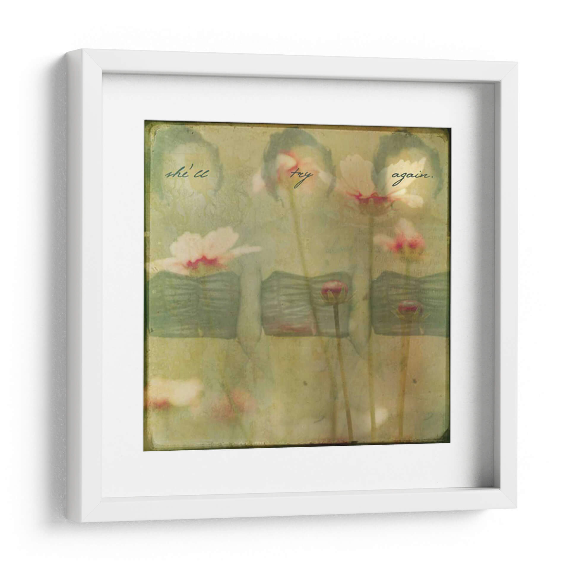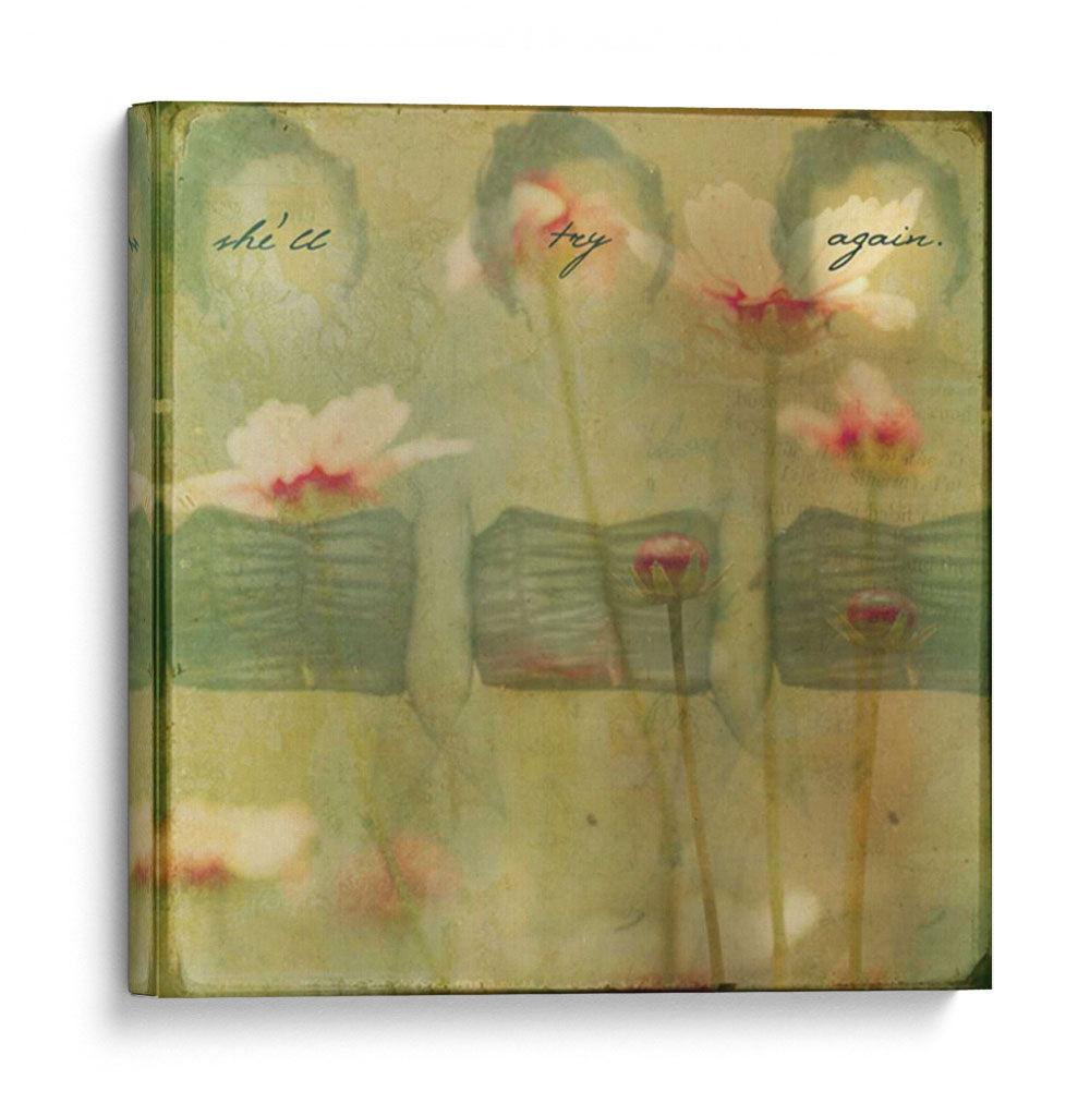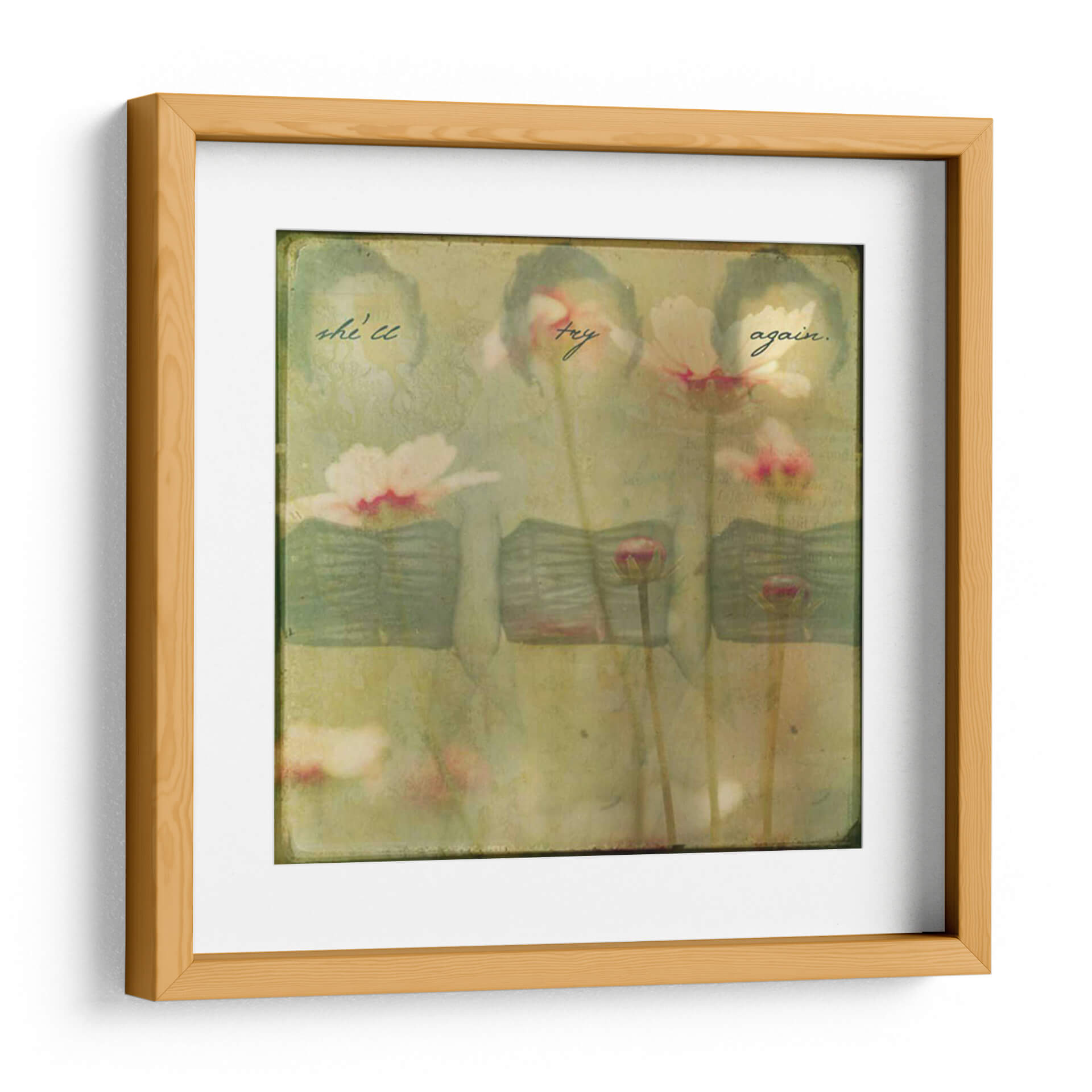 Sumérgete en la delicadeza y la perseverancia con "Ella III", una obra de arte que evoca una atmósfera etérea y reflexiva. La pieza presenta figuras femeninas etéreas, sutilmente superpuestas y rodeadas de flores delicadas, creando una composición onírica. La paleta de colores se centra en tonos verdes y sepia, con toques de rosa y blanco en las flores, que aportan suavidad y un aire vintage. La textura de fondo sugiere páginas de un libro antiguo, añadiendo profundidad y un carácter melancólico. El estilo, una mezcla de fotografía intervenida y arte digital, transmite una sensación de ensueño y nostalgia. El texto escrito a mano, "she'll try again", infunde un mensaje de resiliencia y esperanza, haciendo de este cuadro decorativo una pieza inspiradora. Es ideal para espacios que buscan un toque de introspección y belleza sutil, como un dormitorio sereno, un rincón de lectura acogedor o una sala de estar que aspire a la calma y la elegancia. Este cuadro decorativo abstracto de Jennifer Jorgensen invita a la contemplación, convirtiéndose en un punto focal de conversación y serenidad en cualquier ambiente.