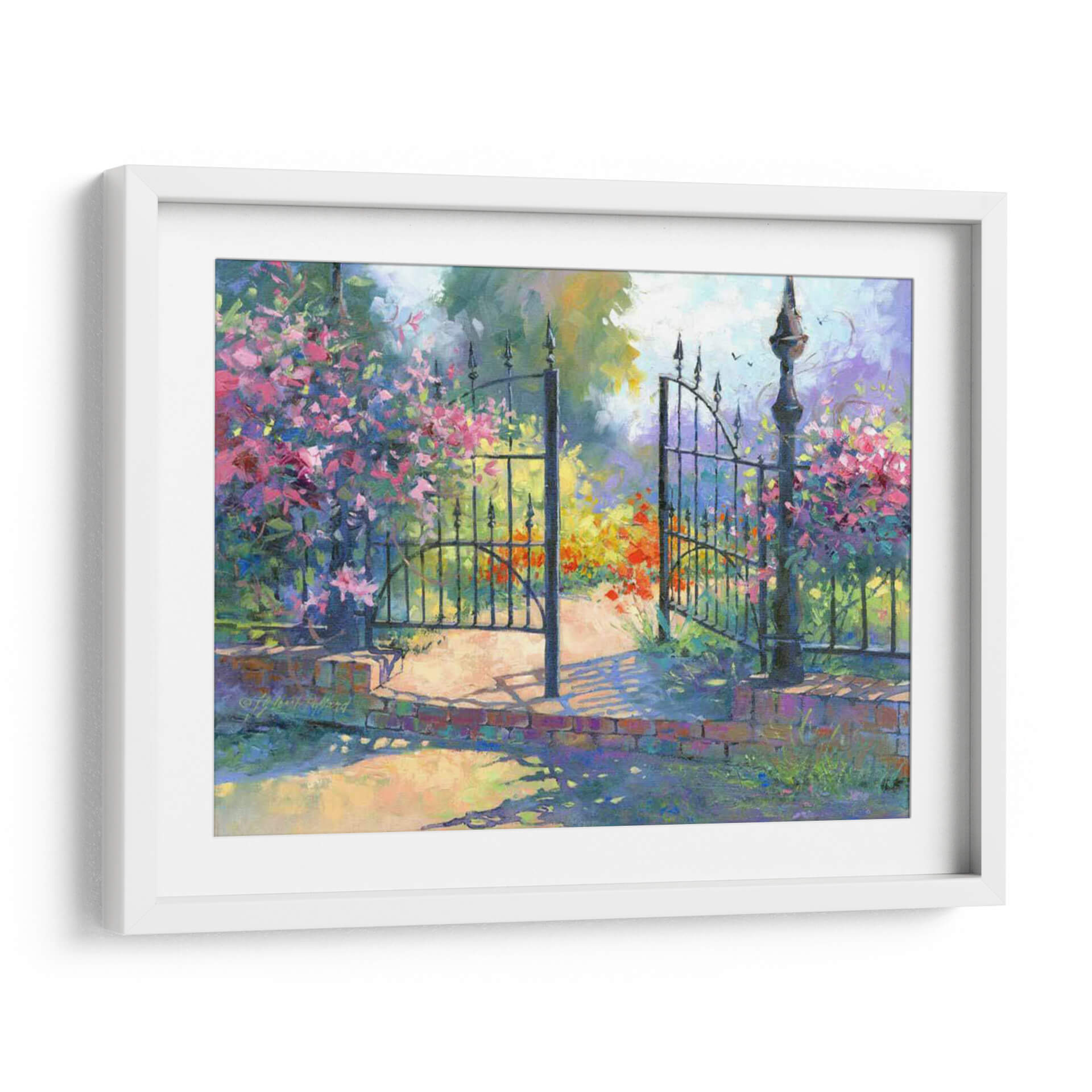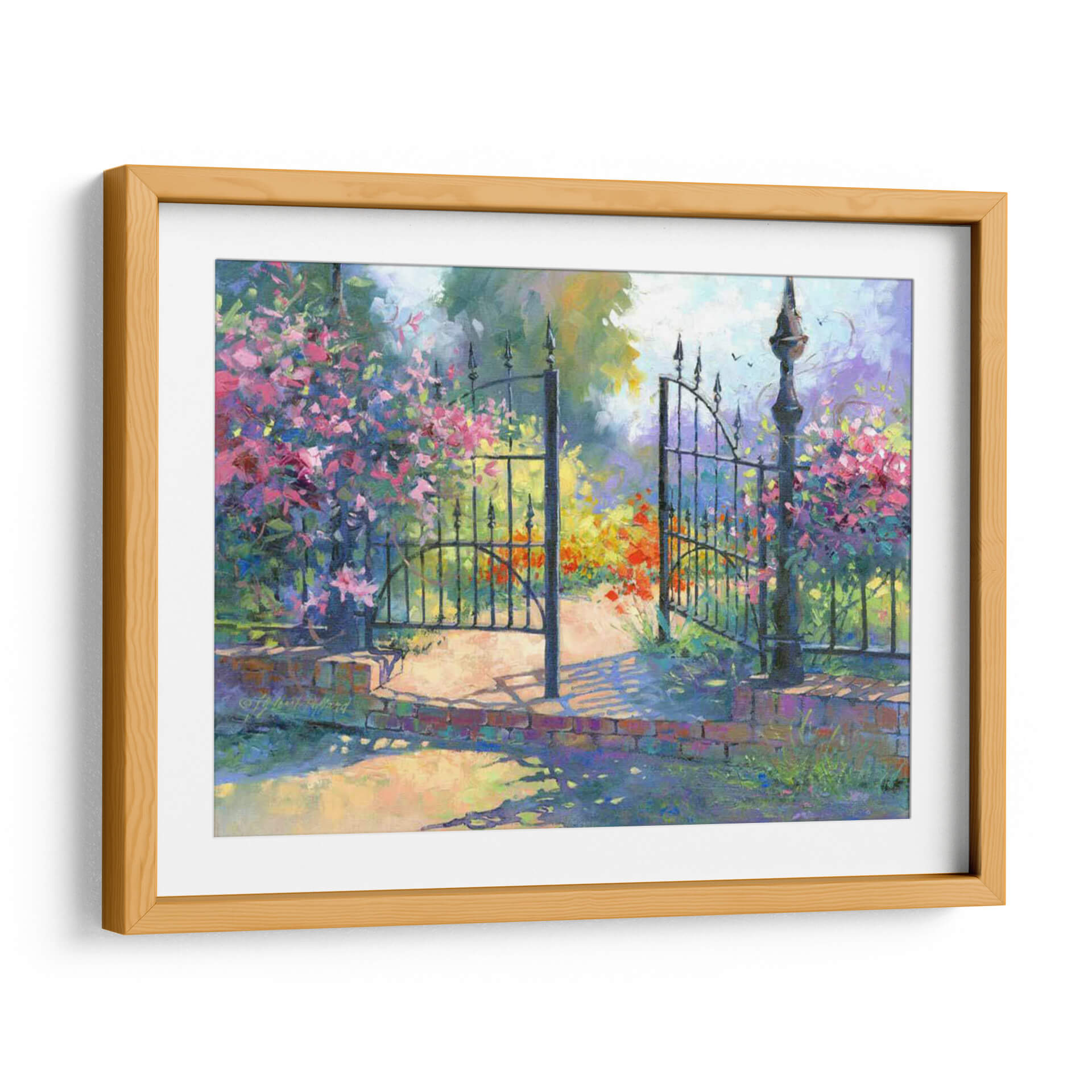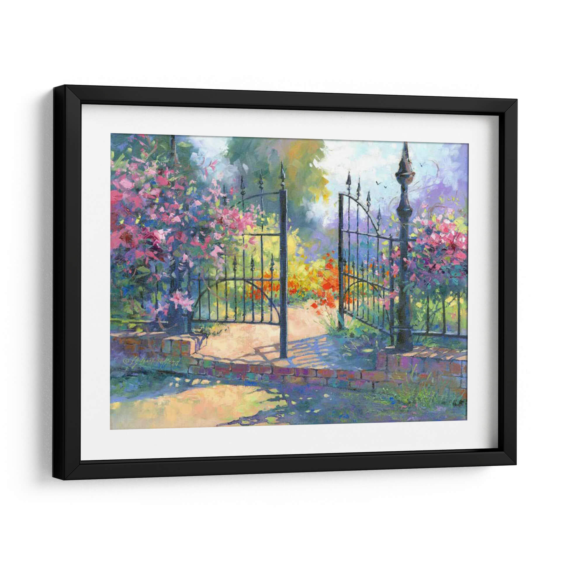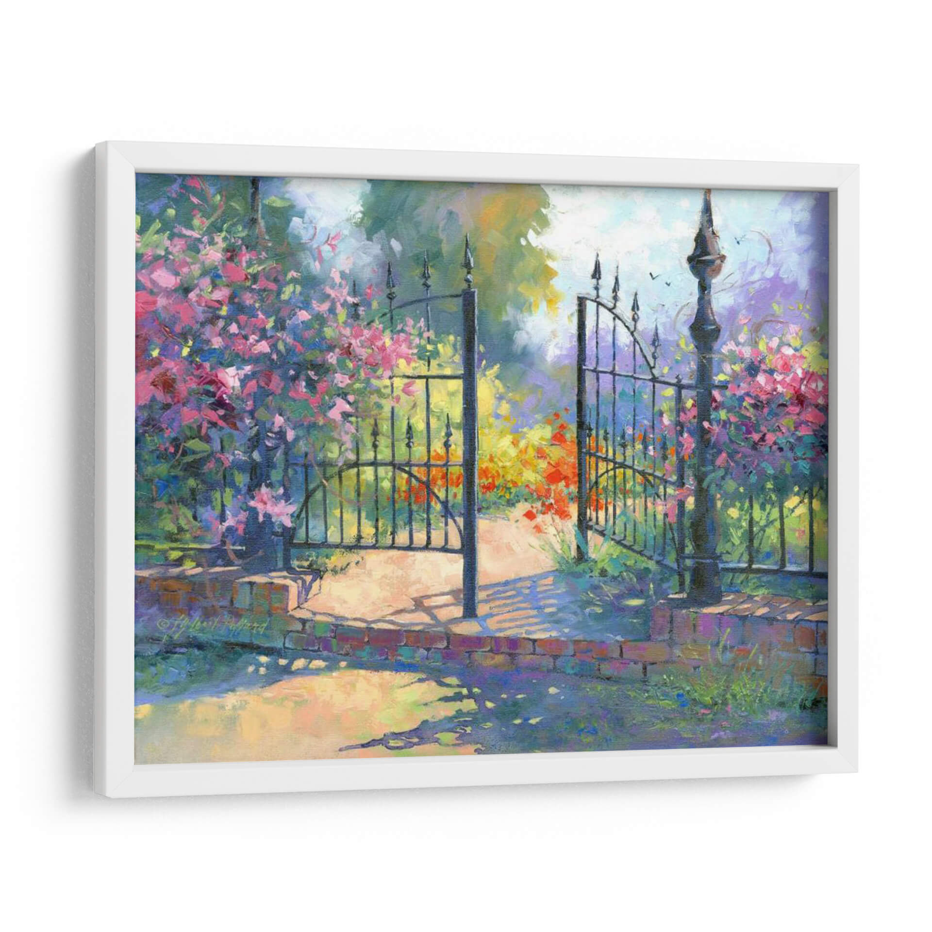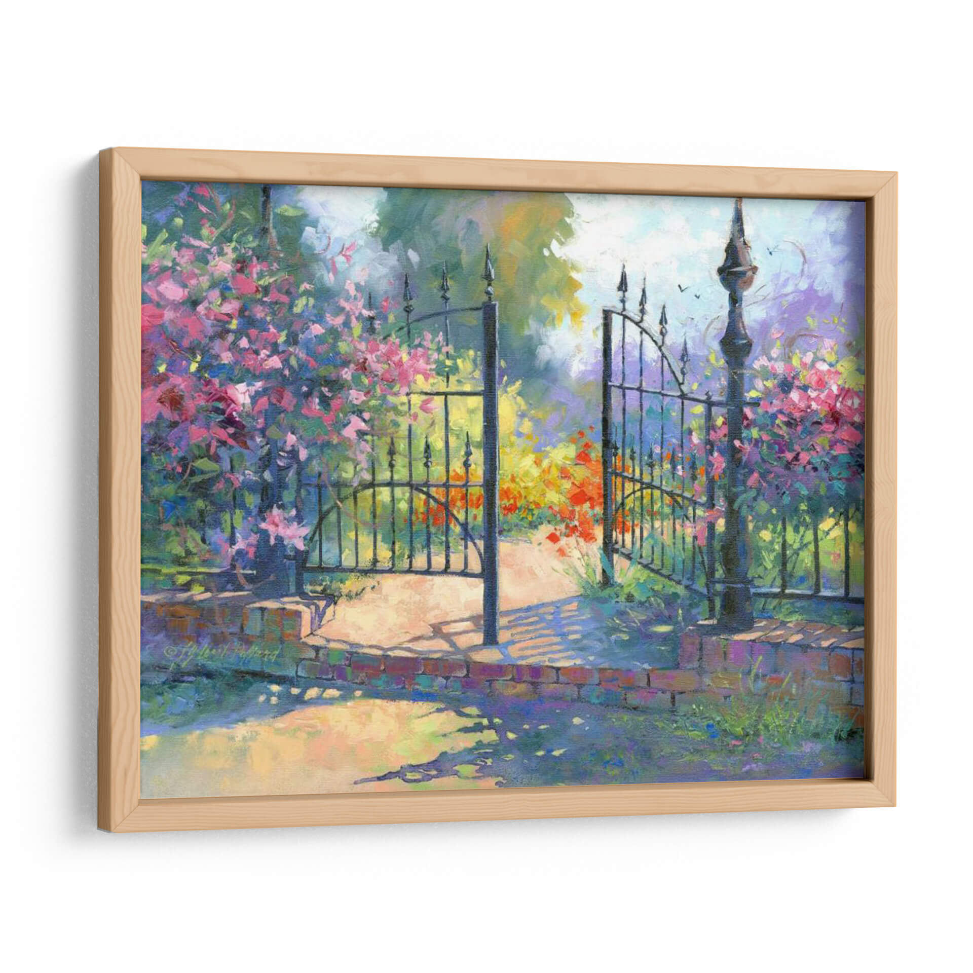 Adéntrate en un oasis de color y serenidad con 'En El Jardín', una obra maestra impresionista que captura la esencia de un jardín florecido y exuberante. La artista Julie G. Pollard nos transporta a un espacio idílico a través de pinceladas vibrantes y una paleta de colores rica y saturada. El cuadro presenta un portal ornamentado de hierro forjado, parcialmente abierto, invitando al espectador a explorar un sendero bañado por la luz del sol. A ambos lados, cascadas de flores en tonos fucsia, rosa, naranja y amarillo estallan en vida, contrastando delicadamente con el follaje verde y los tonos violetas del fondo. La luz juega un papel fundamental, proyectando sombras danzantes sobre el camino de ladrillos y creando una atmósfera cálida y acogedora. Esta pieza evoca una sensación de paz, descubrimiento y la belleza efímera de la naturaleza en su máximo esplendor. Es ideal para añadir un toque de romanticismo y vitalidad a cualquier hogar u oficina, convirtiéndose en un punto focal que invita a la contemplación y al disfrute visual. 'En El Jardín' es más que una decoración; es una ventana a un paraíso personal.