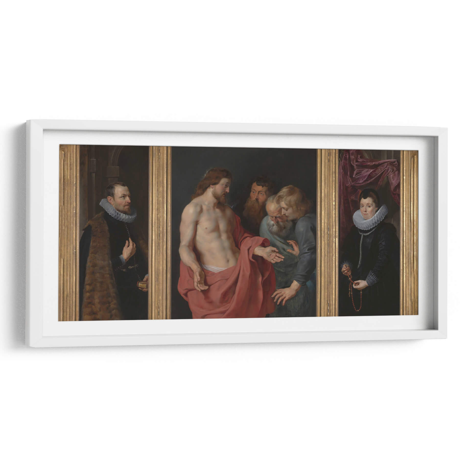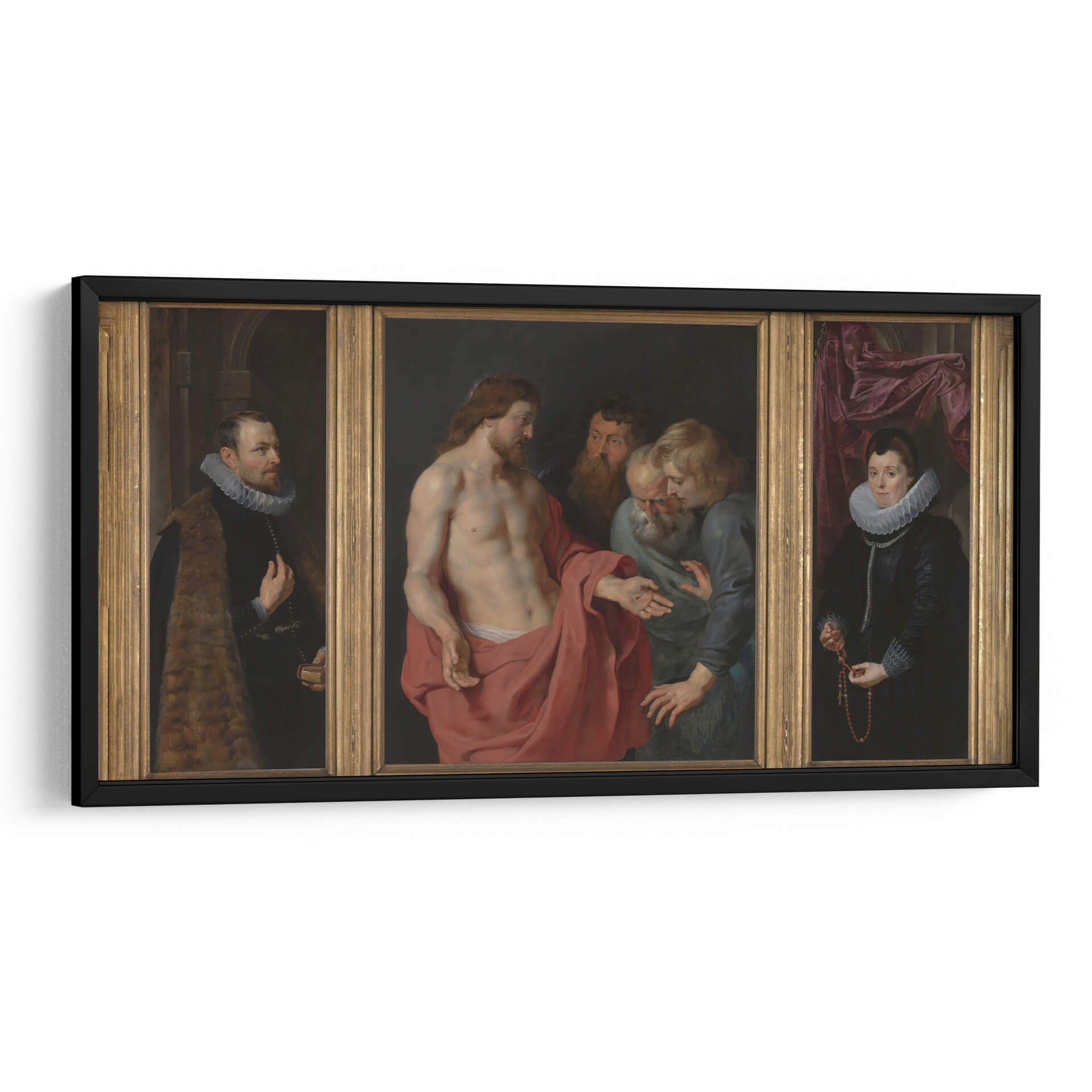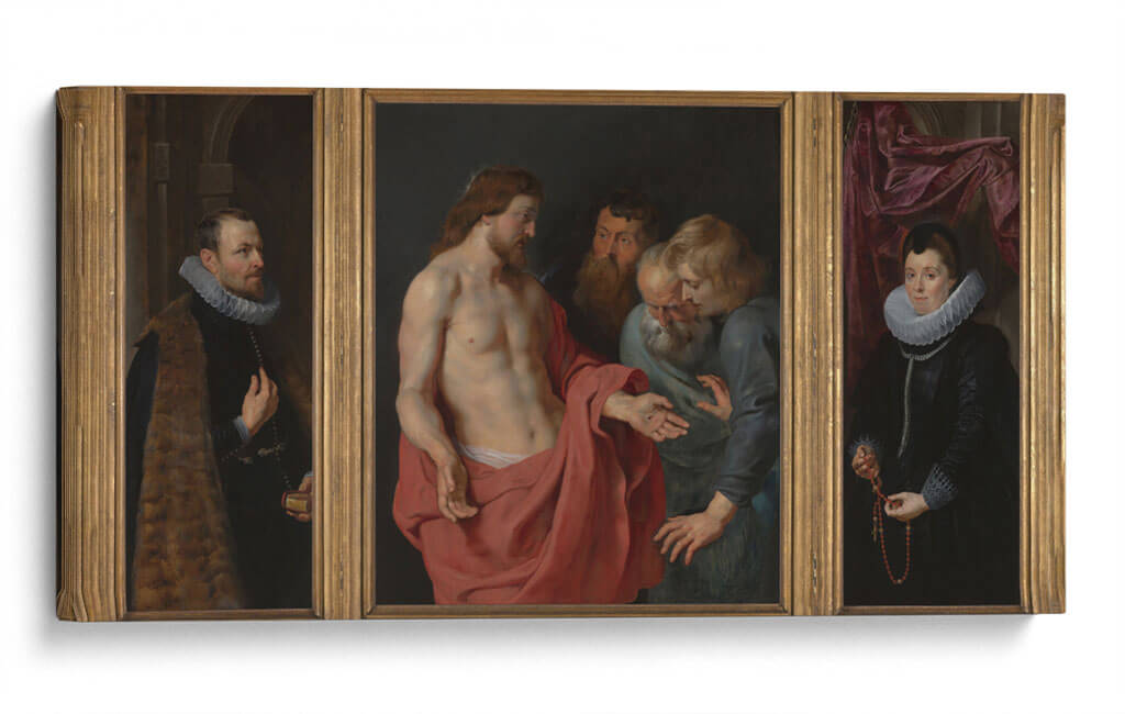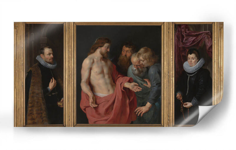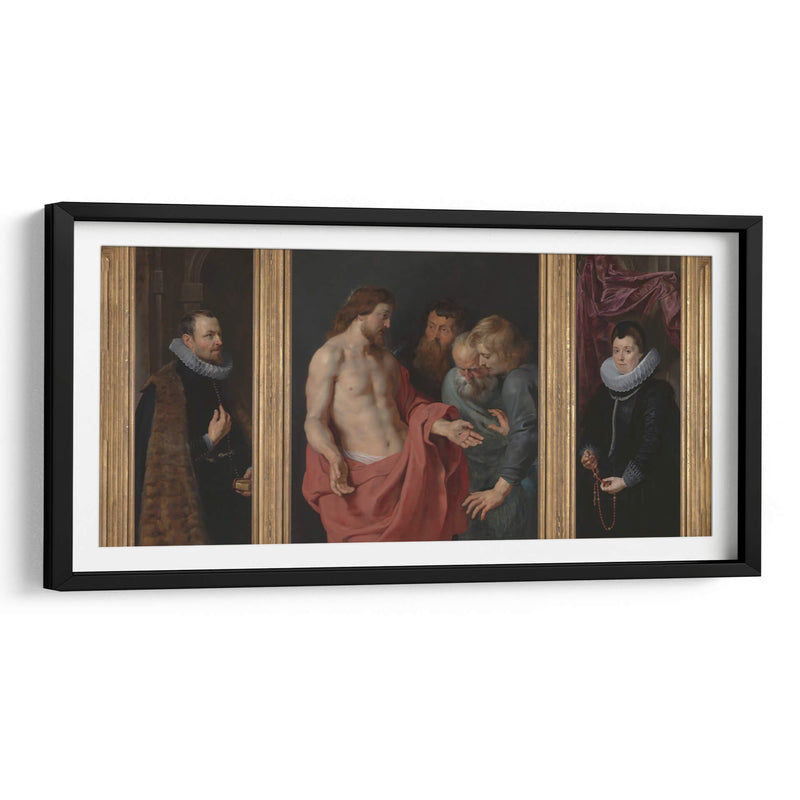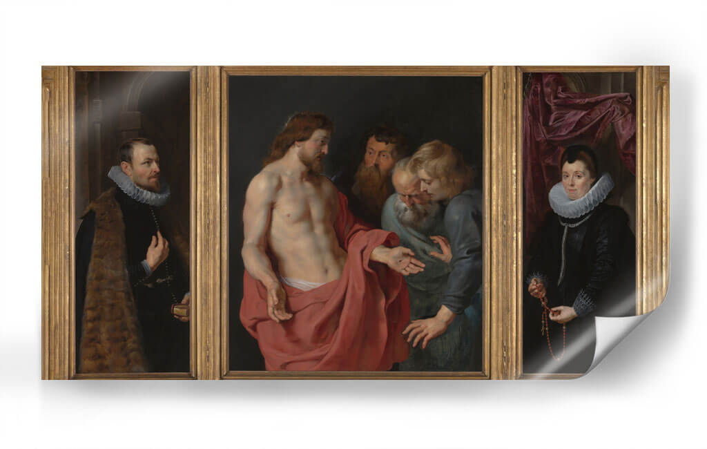 Sumérgete en la profundidad emocional y el detalle barroco de "Epitafio de Nikolaas Rockox y su esposa Adriana Pérez", una obra maestra que captura la esencia de la devoción y la elegancia. Este tríptico presenta una escena central poderosa donde Jesucristo interactúa con figuras masculinas, transmitiendo un mensaje de fe y redención. En los paneles laterales, Nikolaas Rockox y Adriana Pérez son retratados con una dignidad y riqueza que reflejan su estatus y piedad. La paleta de colores, dominada por tonos tierra, rojos intensos y azules profundos, crea una atmósfera solemne y a la vez vibrante. El juego de luces y sombras, característico del estilo barroco, añade dramatismo y realismo a cada figura, invitando a la contemplación. La composición se organiza de manera equilibrada, guiando la mirada a través de las tres escenas interconectadas. Este cuadro decorativo es ideal para quienes buscan infundir sus espacios con una sensación de historia, espiritualidad y refinamiento artístico. Perfecto para salones, estudios o cualquier lugar donde se desee un punto focal de gran impacto visual y conceptual. Añade un toque de clasicismo atemporal a tu decoración con esta impresionante reproducción de una obra icónica.