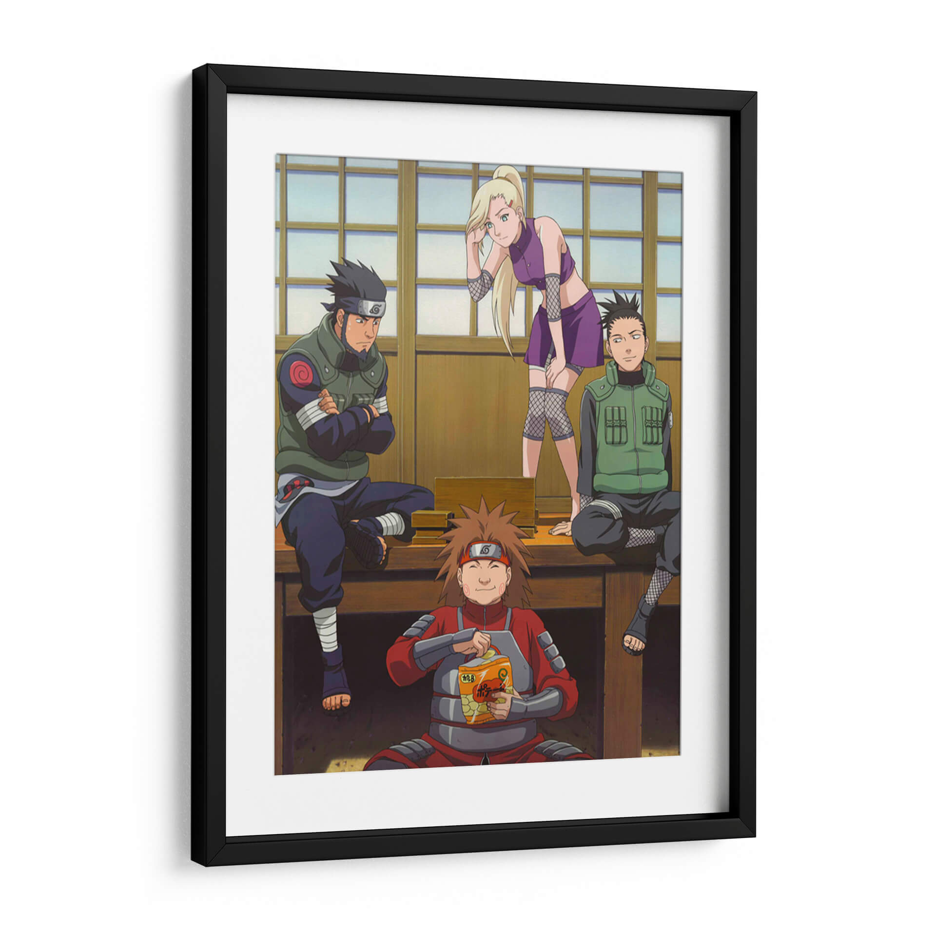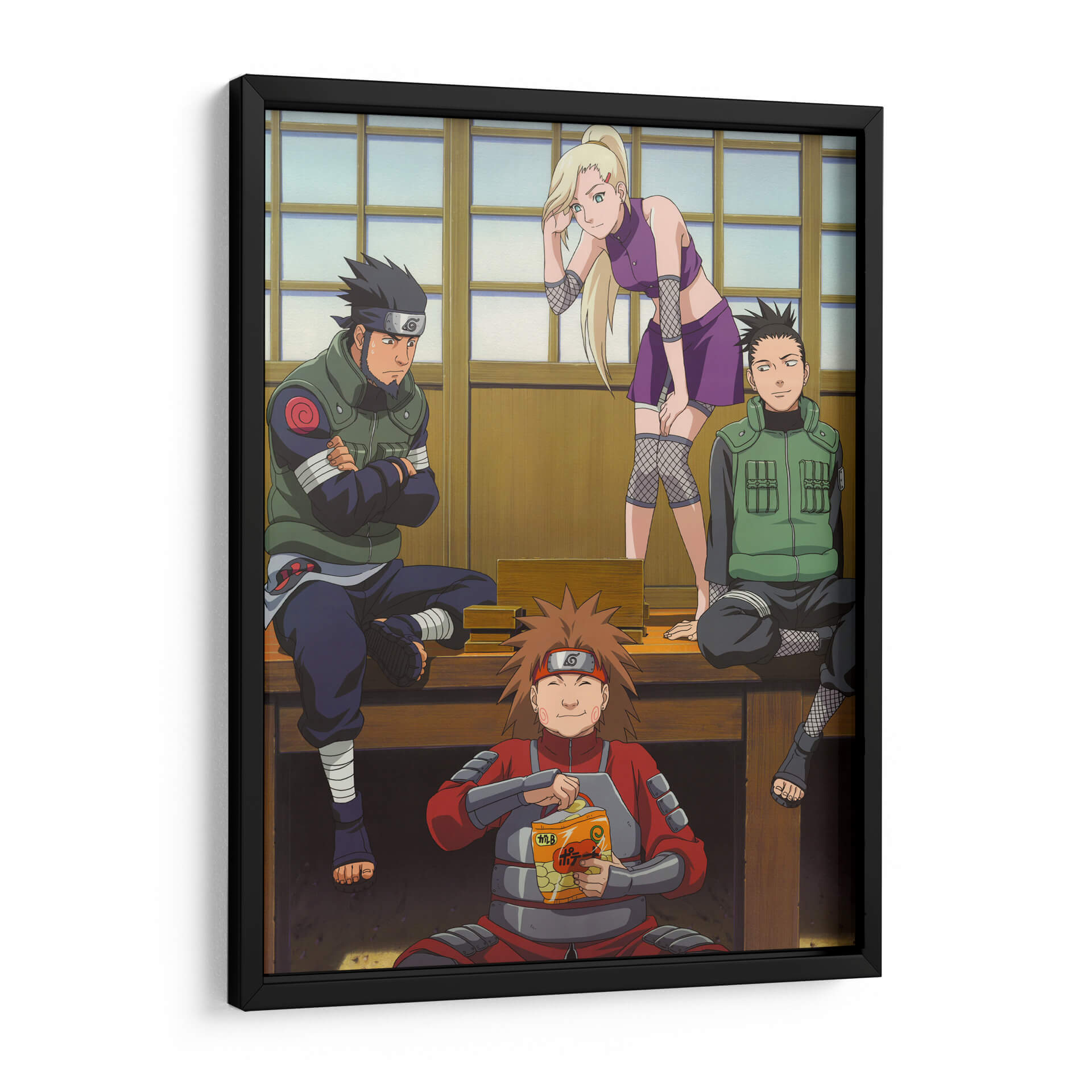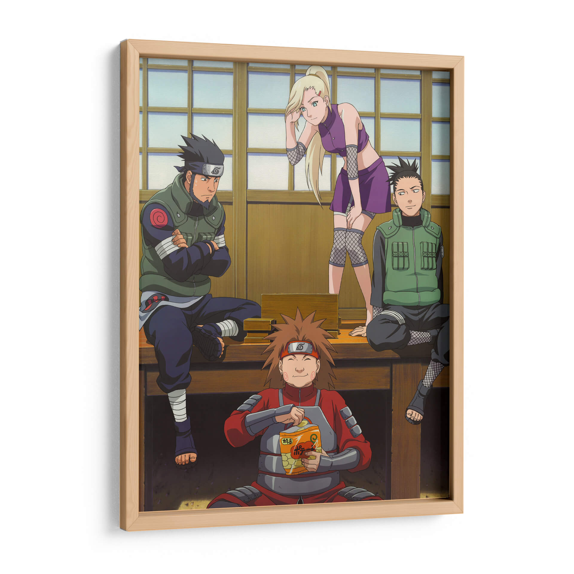 Este cautivador cuadro decorativo, titulado "Equipo 10", captura la esencia de un momento de camaradería y relajación entre un grupo de jóvenes ninjas. La obra presenta a cuatro personajes en un interior con una gran ventana de madera que ilumina la escena con una luz suave y natural, creando una atmósfera de calidez y familiaridad. En primer plano, un personaje con cabello rojizo y traje rojo está sentado, absorto en un paquete de aperitivos, mientras que un segundo personaje, con cabello oscuro y un chaleco verde, se reclina pensativo con los brazos cruzados. Detrás de ellos, una figura femenina rubia, vestida de púrpura, se apoya elegantemente, y otro personaje con cabello oscuro y un chaleco verde similar se sienta a la derecha. La paleta de colores es predominantemente cálida, con tonos de madera, verdes militares y toques de púrpura, lo que añade profundidad y un aire de autenticidad. El estilo de ilustración detallada, reminiscentes de anime, evoca nostalgia y una conexión emocional. "Equipo 10" es ideal para añadir un toque de cultura pop y personalidad a salas de estar, dormitorios o estudios, sirviendo como un punto focal que invita a la conversación y evoca el espíritu de la amistad y la aventura.