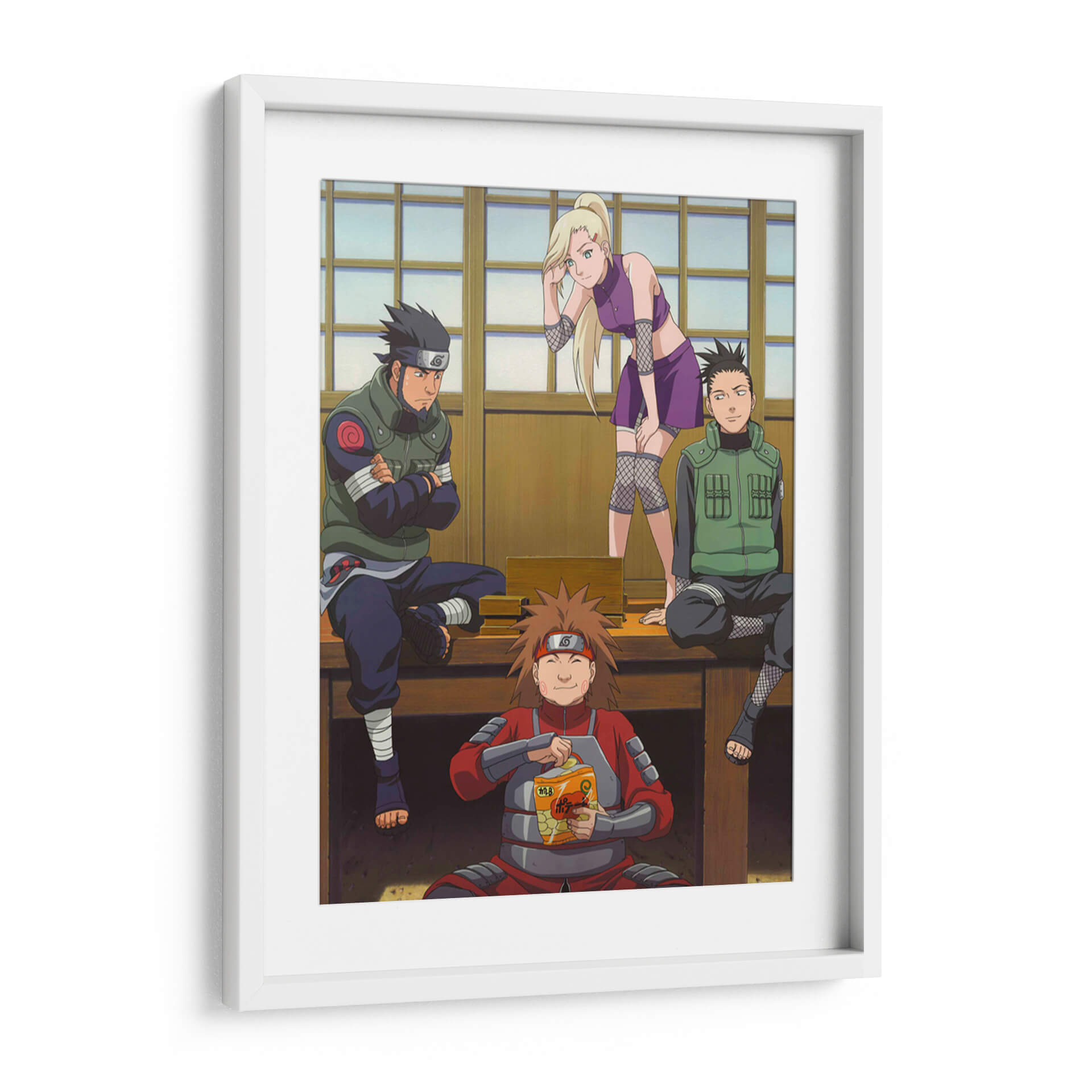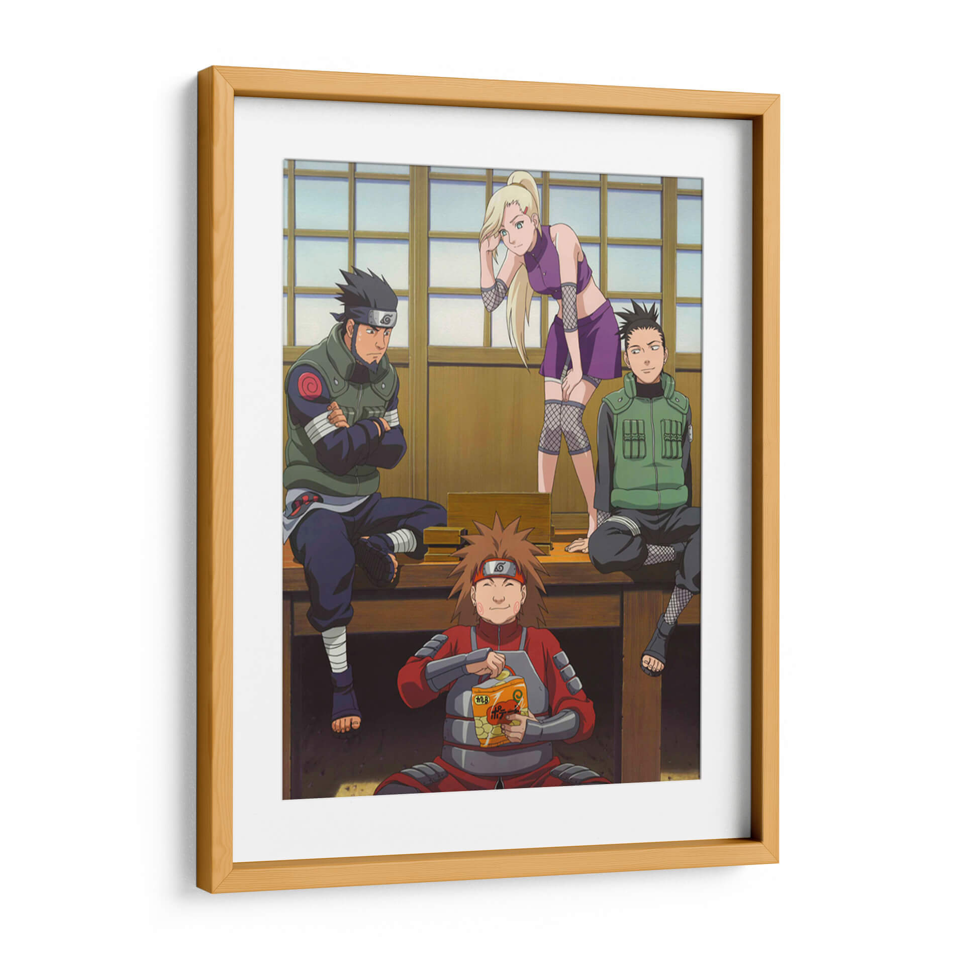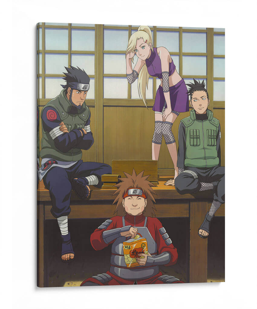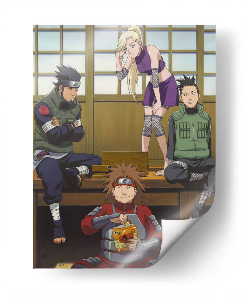 Este cautivador cuadro decorativo, titulado "Equipo 10", captura la esencia de un momento de camaradería y relajación entre un grupo de jóvenes ninjas. La obra presenta a cuatro personajes en un interior con una gran ventana de madera que ilumina la escena con una luz suave y natural, creando una atmósfera de calidez y familiaridad. En primer plano, un personaje con cabello rojizo y traje rojo está sentado, absorto en un paquete de aperitivos, mientras que un segundo personaje, con cabello oscuro y un chaleco verde, se reclina pensativo con los brazos cruzados. Detrás de ellos, una figura femenina rubia, vestida de púrpura, se apoya elegantemente, y otro personaje con cabello oscuro y un chaleco verde similar se sienta a la derecha. La paleta de colores es predominantemente cálida, con tonos de madera, verdes militares y toques de púrpura, lo que añade profundidad y un aire de autenticidad. El estilo de ilustración detallada, reminiscentes de anime, evoca nostalgia y una conexión emocional. "Equipo 10" es ideal para añadir un toque de cultura pop y personalidad a salas de estar, dormitorios o estudios, sirviendo como un punto focal que invita a la conversación y evoca el espíritu de la amistad y la aventura.