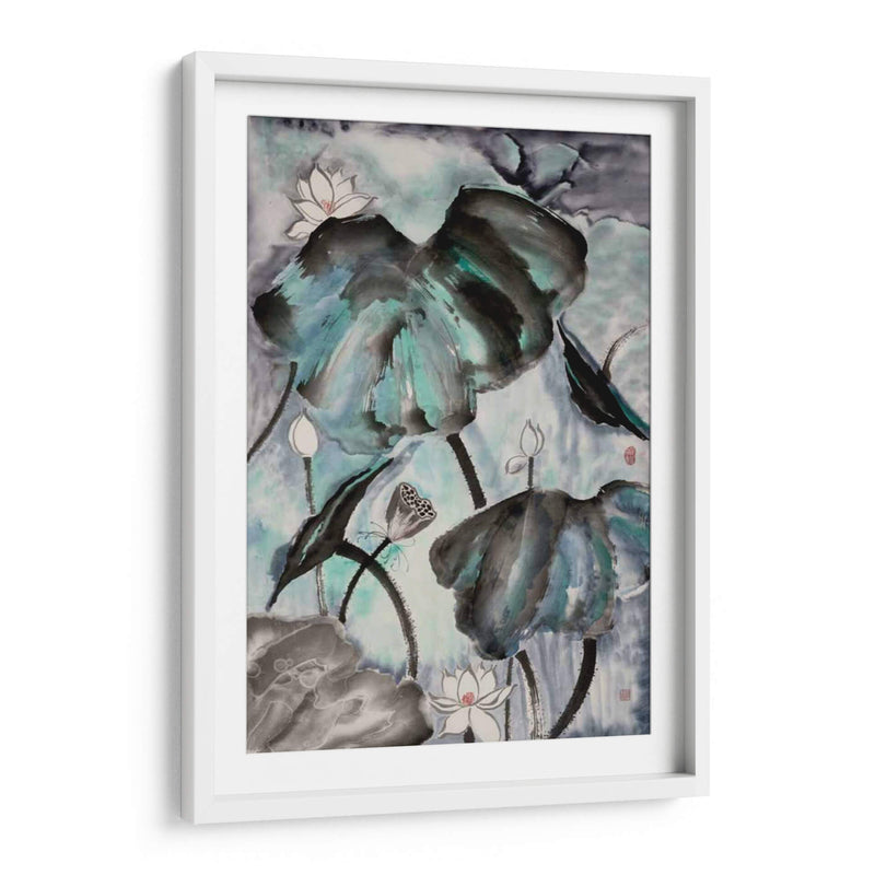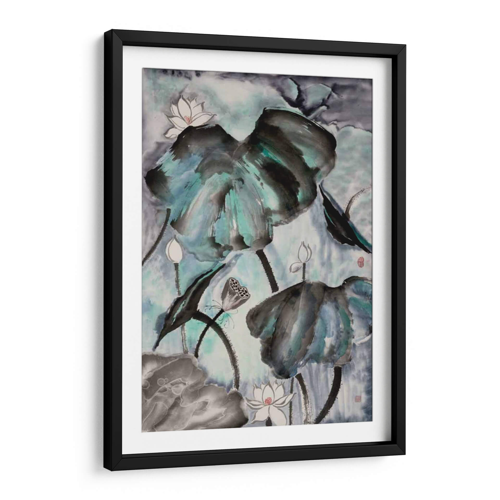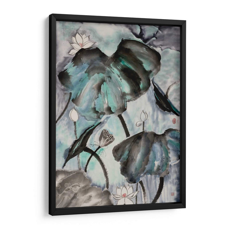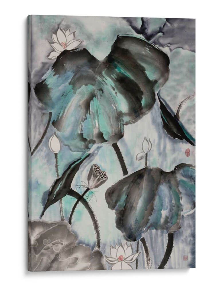 Sumérgete en la serena belleza de "Estudio De Loto Con Azul Verde Ii", una obra de arte contemporáneo que captura la esencia de la naturaleza con una delicadeza excepcional. Esta pieza, inspirada en el arte oriental, presenta flores de loto en diferentes etapas de floración y en su ciclo de vida, incluyendo sus características vainas seminales. La paleta de colores, dominada por suaves tonos de azul verdoso, grises profundos y toques de blanco, evoca una atmósfera de tranquilidad y contemplación. Las pinceladas fluidas y la técnica de sumi-e, o pintura a tinta, otorgan a la obra una cualidad etérea y un movimiento orgánico, como si las flores danzaran sobre el fondo acuoso. Los grandes pétalos oscuros contrastan sutilmente con las delicadas flores blancas y los capullos emergentes, creando una composición visualmente atractiva y equilibrada. "Estudio De Loto Con Azul Verde Ii" es ideal para añadir un toque de sofisticación y calma a cualquier espacio, ya sea un dormitorio, una sala de estar o una oficina, invitando a la reflexión y al bienestar. Este cuadro decorativo es una puerta de entrada a la paz interior y la armonía estética para tu hogar u oficina, destacando la maestría del artista Nan Rae en la representación de la flora acuática.