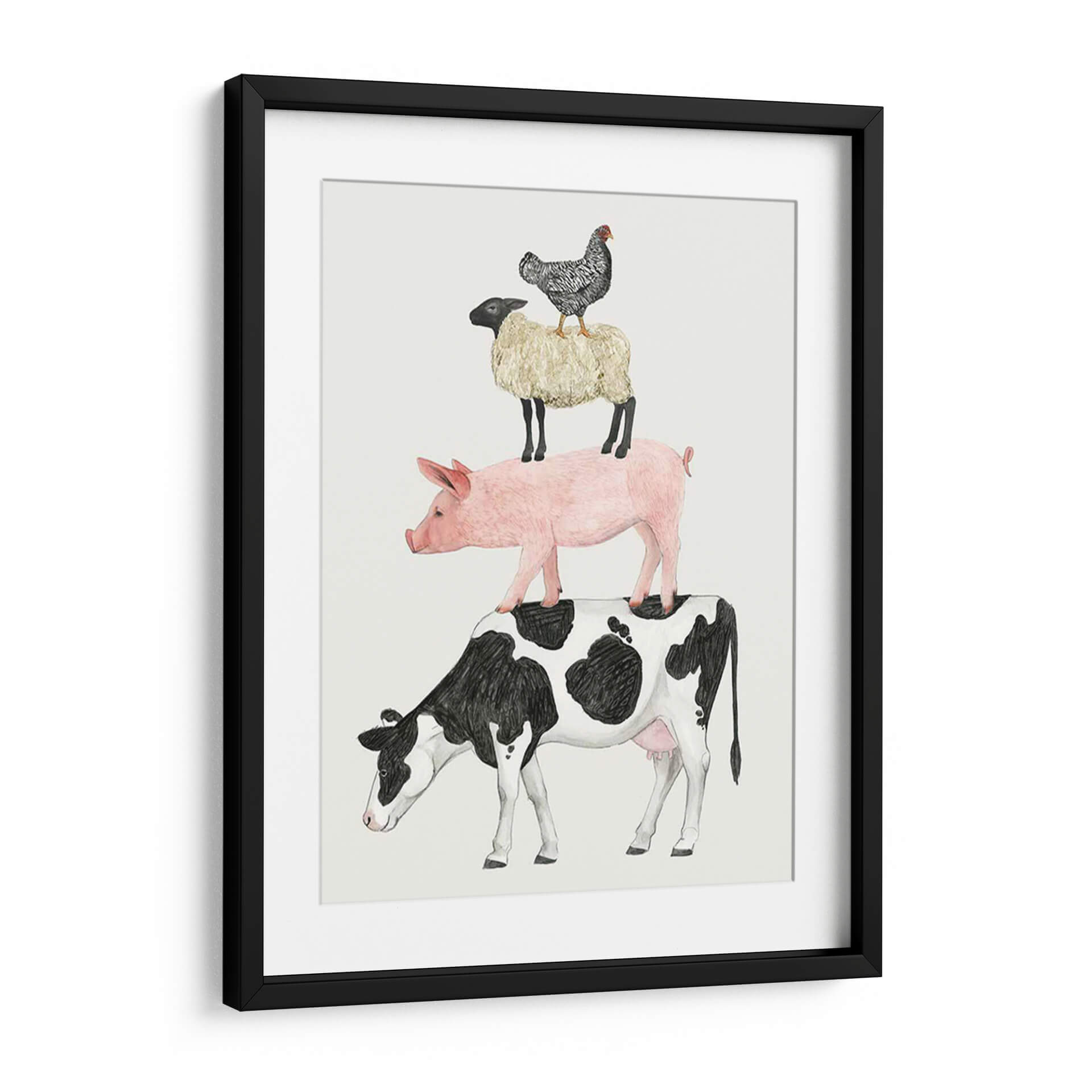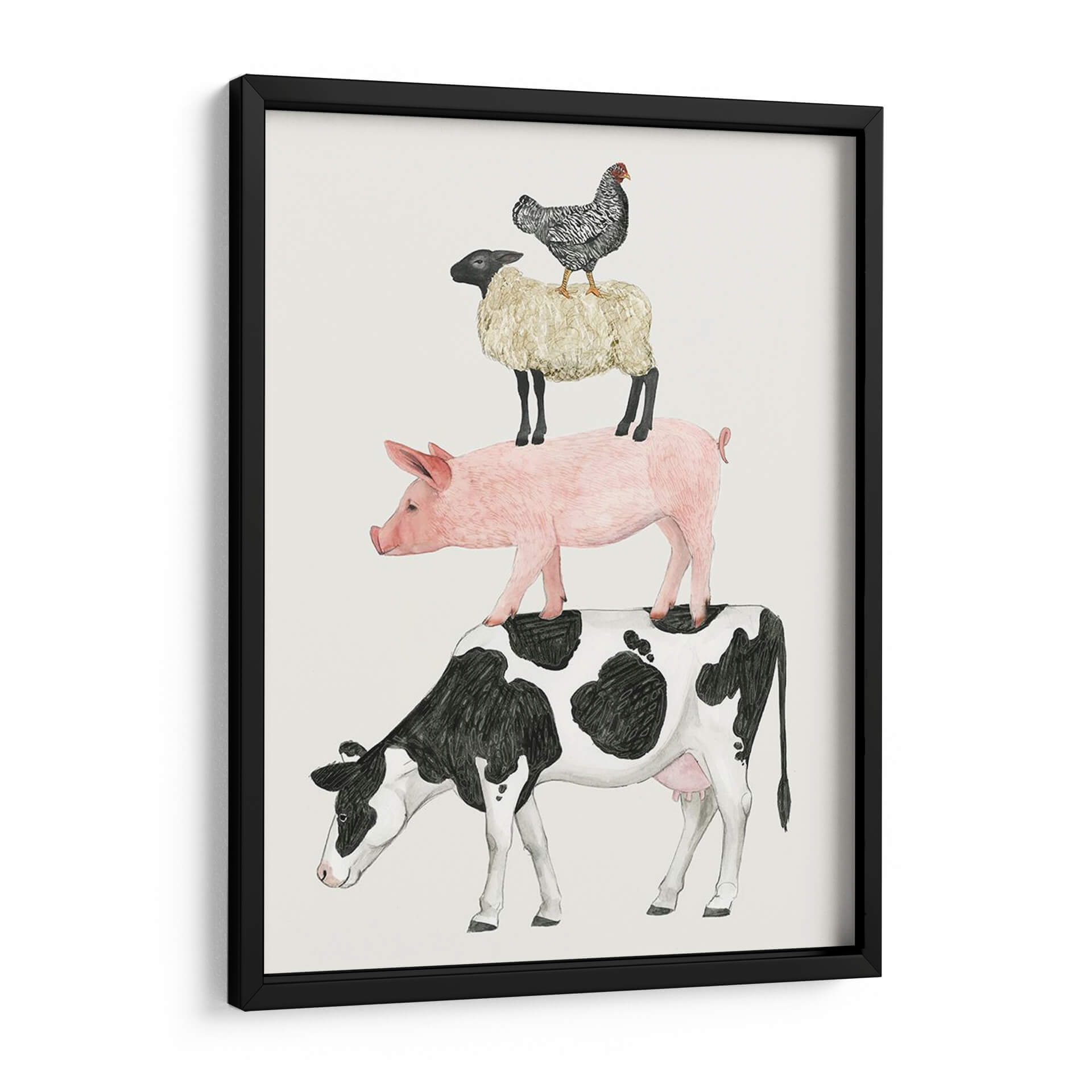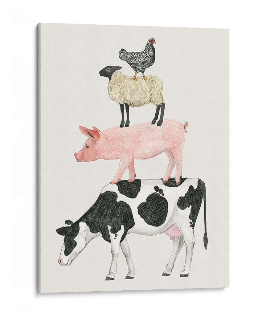 Sumérgete en el encanto rústico de "Familia De Tierras De Cultivo Vi", una obra de arte que celebra la armonía de la vida en la granja con un toque whimsical. Este cuadro decorativo presenta una encantadora pila de animales de granja: una vaca Holstein en la base, seguida de un cerdo rosado y coronada por una oveja lanuda y una gallina curiosa. La artista Grace Popp utiliza una paleta de colores suaves y naturales, dominada por tonos tierra, blancos y negros, que crean una atmósfera serena y acogedora. El estilo de ilustración, con un ligero aire de acuarela, aporta una delicadeza y calidez a la composición. Ideal para añadir un toque de carácter y alegría a la decoración de tu hogar, ya sea en la cocina, el comedor o incluso como un elemento divertido en la habitación de los niños. Este cuadro es una pieza que evoca la sencillez y la conexión con la naturaleza, perfecta para quienes buscan un arte que inspire sonrisas y converse con su entorno. Su diseño versátil se adapta a diversos estilos decorativos, desde el rústico y country hasta el moderno y ecléctico, aportando siempre un punto de interés visual y una narrativa única. Transforma tu espacio con esta entrañable representación de la vida rural.