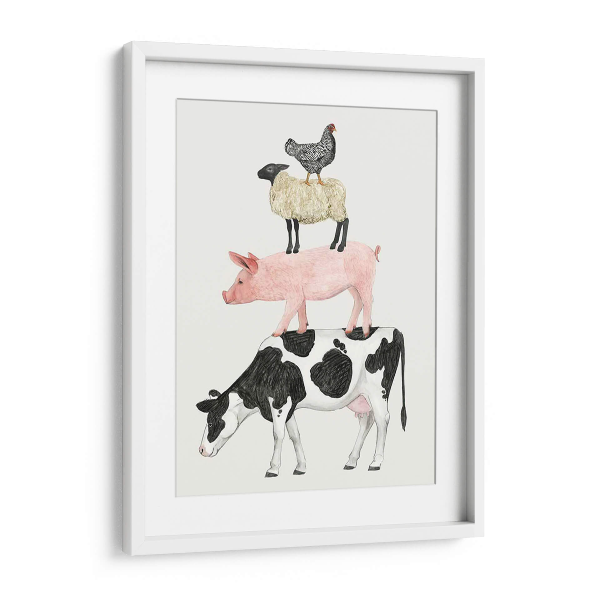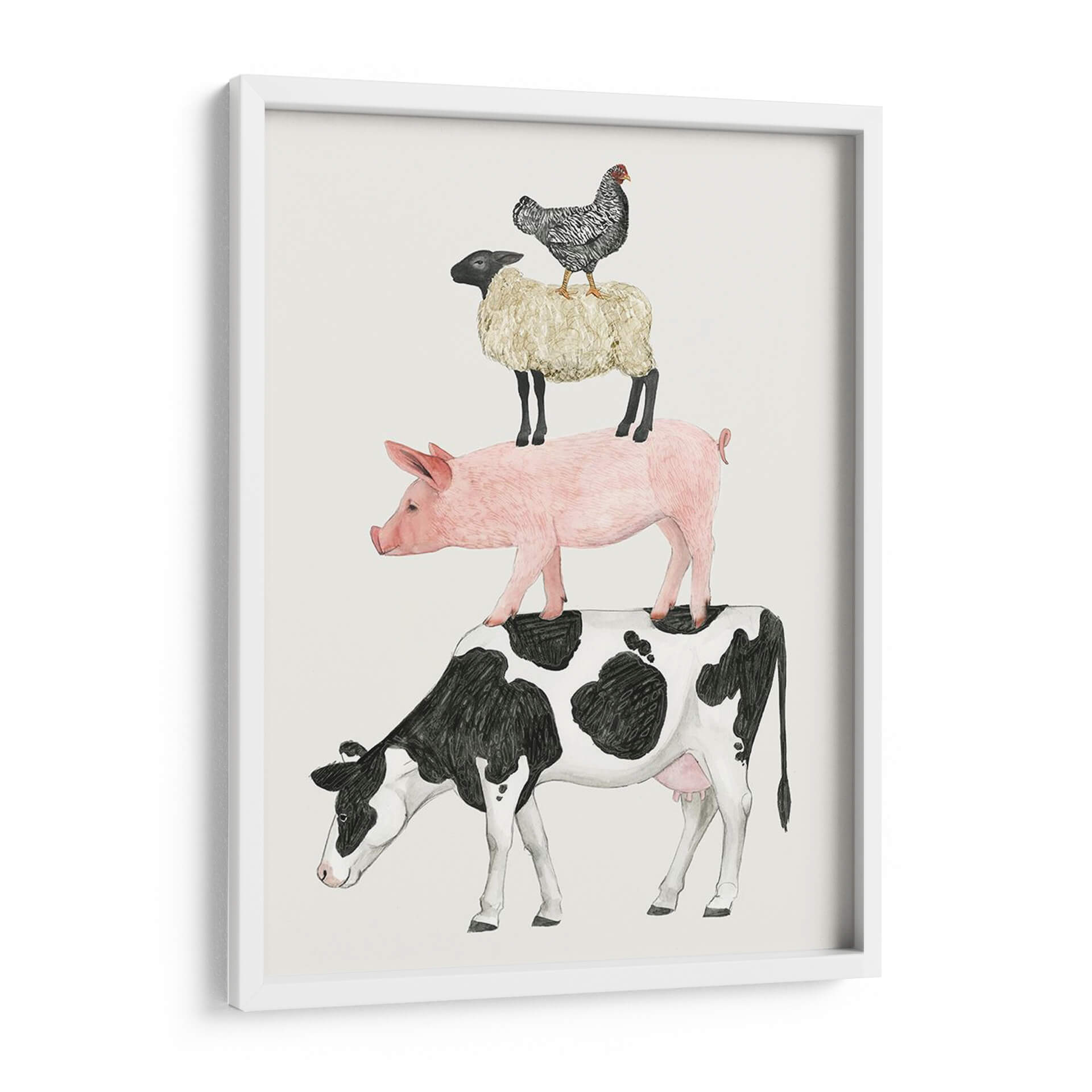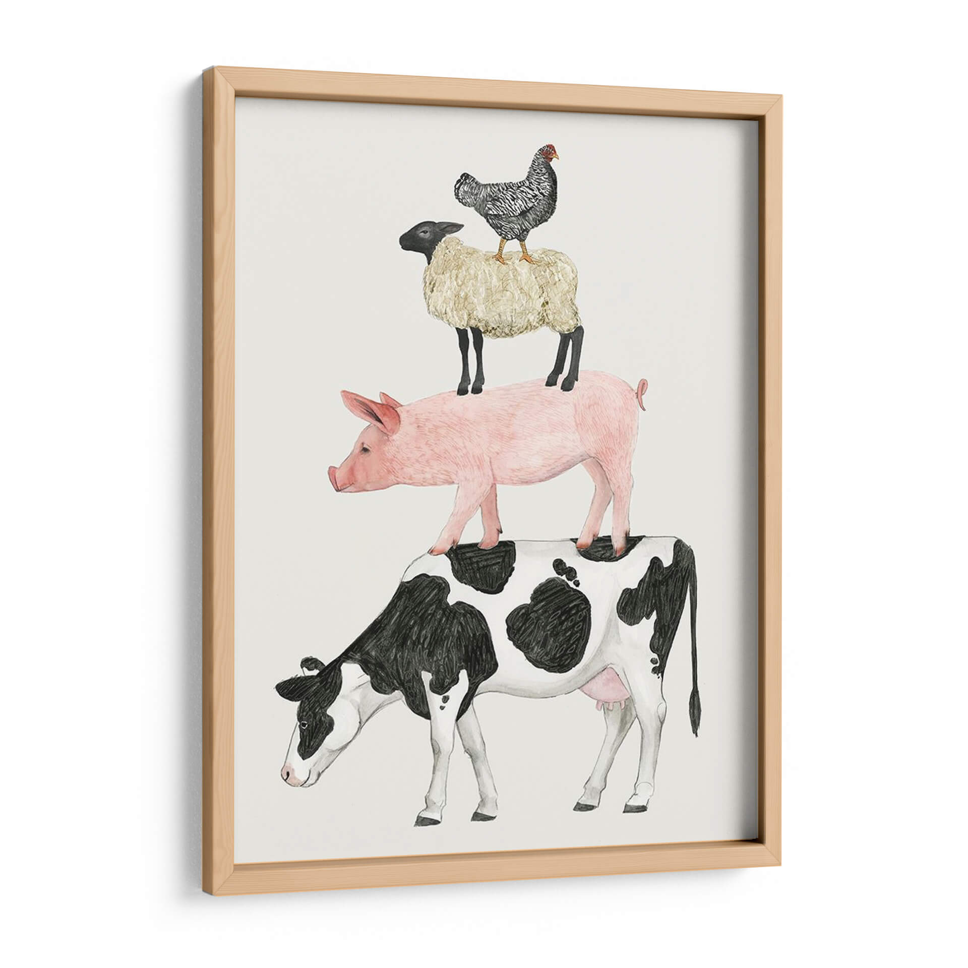 Sumérgete en el encanto rústico de "Familia De Tierras De Cultivo Vi", una obra de arte que celebra la armonía de la vida en la granja con un toque whimsical. Este cuadro decorativo presenta una encantadora pila de animales de granja: una vaca Holstein en la base, seguida de un cerdo rosado y coronada por una oveja lanuda y una gallina curiosa. La artista Grace Popp utiliza una paleta de colores suaves y naturales, dominada por tonos tierra, blancos y negros, que crean una atmósfera serena y acogedora. El estilo de ilustración, con un ligero aire de acuarela, aporta una delicadeza y calidez a la composición. Ideal para añadir un toque de carácter y alegría a la decoración de tu hogar, ya sea en la cocina, el comedor o incluso como un elemento divertido en la habitación de los niños. Este cuadro es una pieza que evoca la sencillez y la conexión con la naturaleza, perfecta para quienes buscan un arte que inspire sonrisas y converse con su entorno. Su diseño versátil se adapta a diversos estilos decorativos, desde el rústico y country hasta el moderno y ecléctico, aportando siempre un punto de interés visual y una narrativa única. Transforma tu espacio con esta entrañable representación de la vida rural.