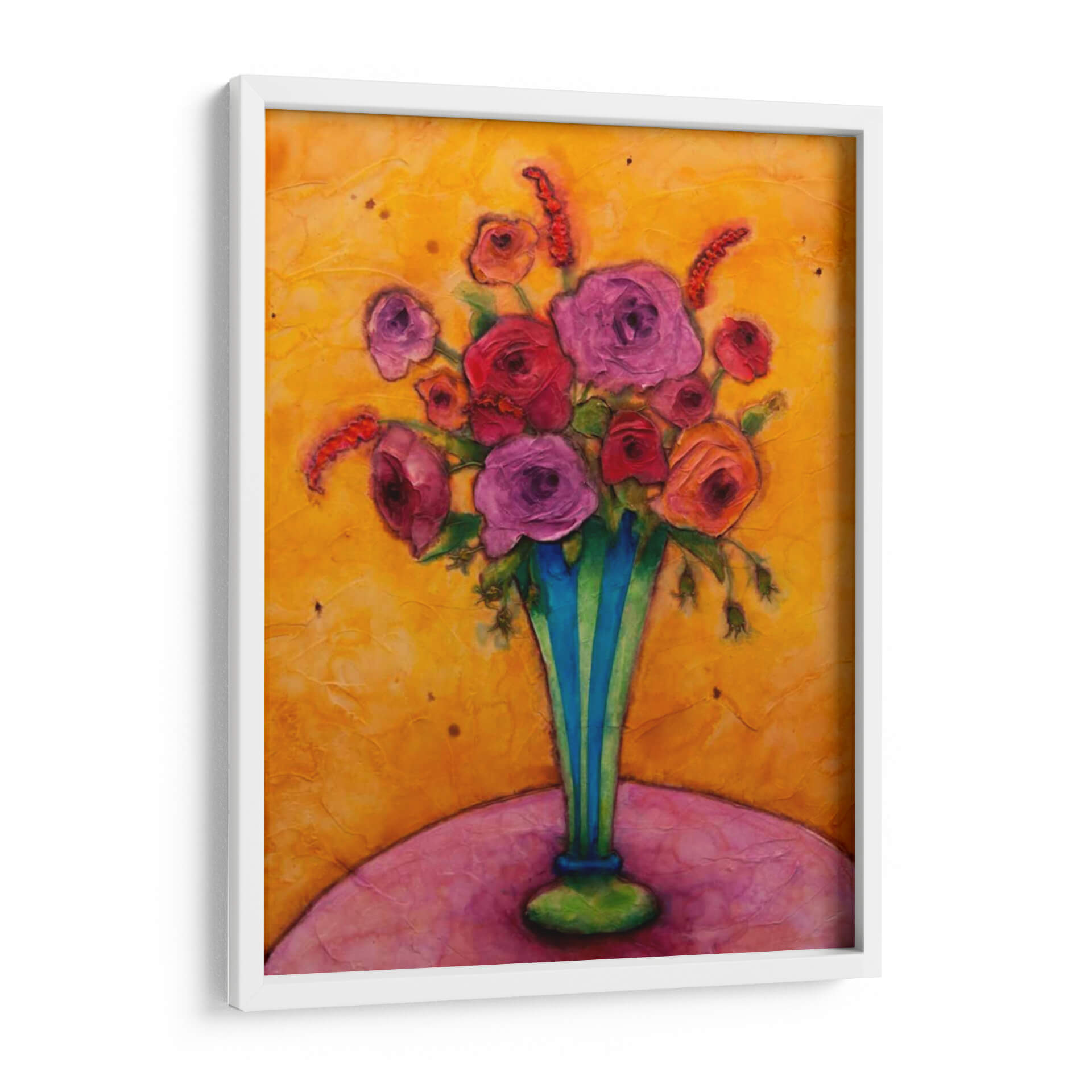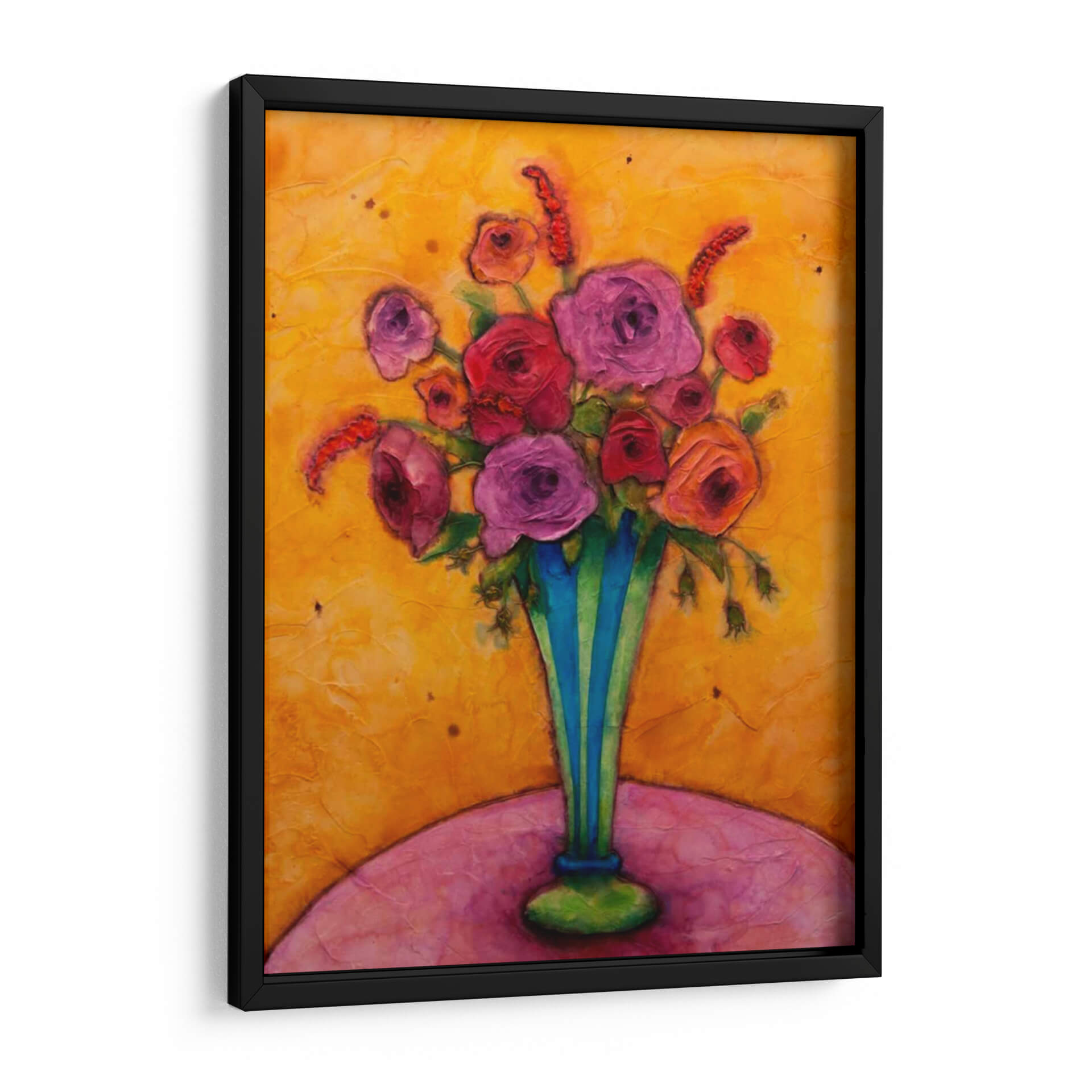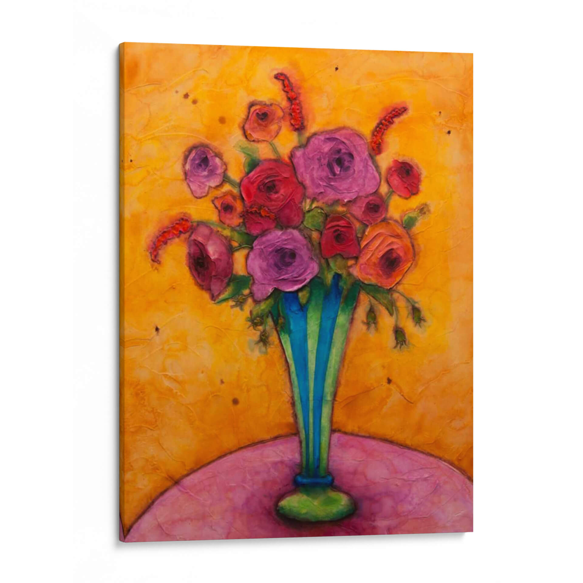 Sumérgete en la vibrante alegría de "Felicidad De Tallo Largo", una obra de arte cautivadora de Marabeth Quin que irradia calidez y vitalidad. Este cuadro decorativo es una explosión de color, dominado por un fondo texturizado en tonos dorados y ocres que evocan la luz del sol y la energía de un día radiante. En el centro, un exuberante ramo de flores en tonos fucsia, rosa y rojo se alza con orgullo dentro de un jarrón de rayas azules y verdes, aportando un contraste audaz y refrescante. Las flores, representadas con una pincelada expresiva y empastada, parecen casi palpables, invitando al espectador a apreciar su belleza y delicadeza. La composición, centrada en el arreglo floral, se apoya sobre una superficie curva en tonos rosados y púrpuras, creando una base suave y armónica. La obra transmite una sensación de optimismo y celebración, ideal para añadir un toque de felicidad y sofisticación a cualquier espacio. Perfecta para salones, comedores o incluso un estudio, "Felicidad De Tallo Largo" es una pieza que inspirará conversaciones y llenará de vida tu hogar. Su estilo contemporáneo y su rica paleta de colores la convierten en una adición excepcional para amantes del arte que buscan piezas únicas y llenas de emoción.