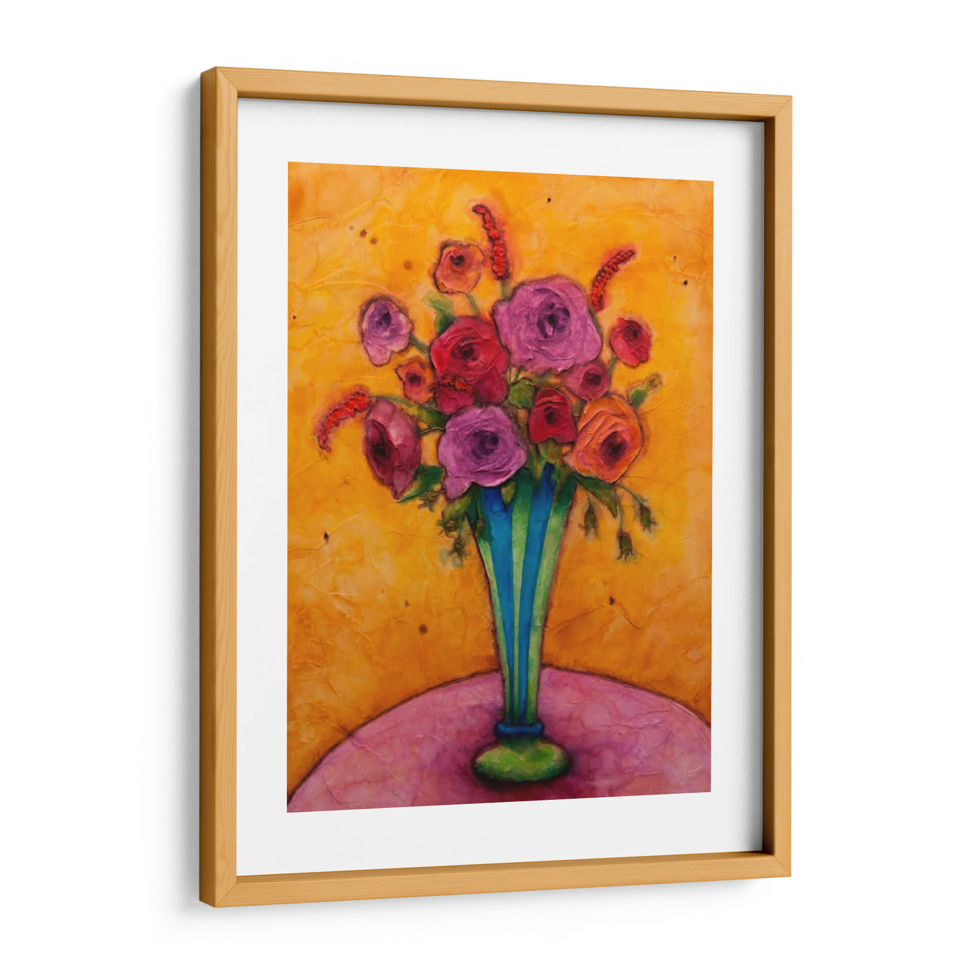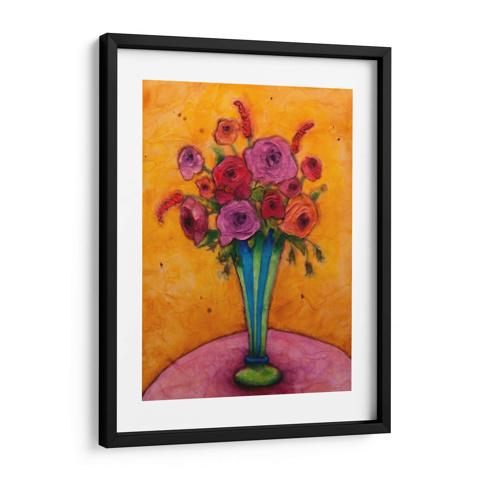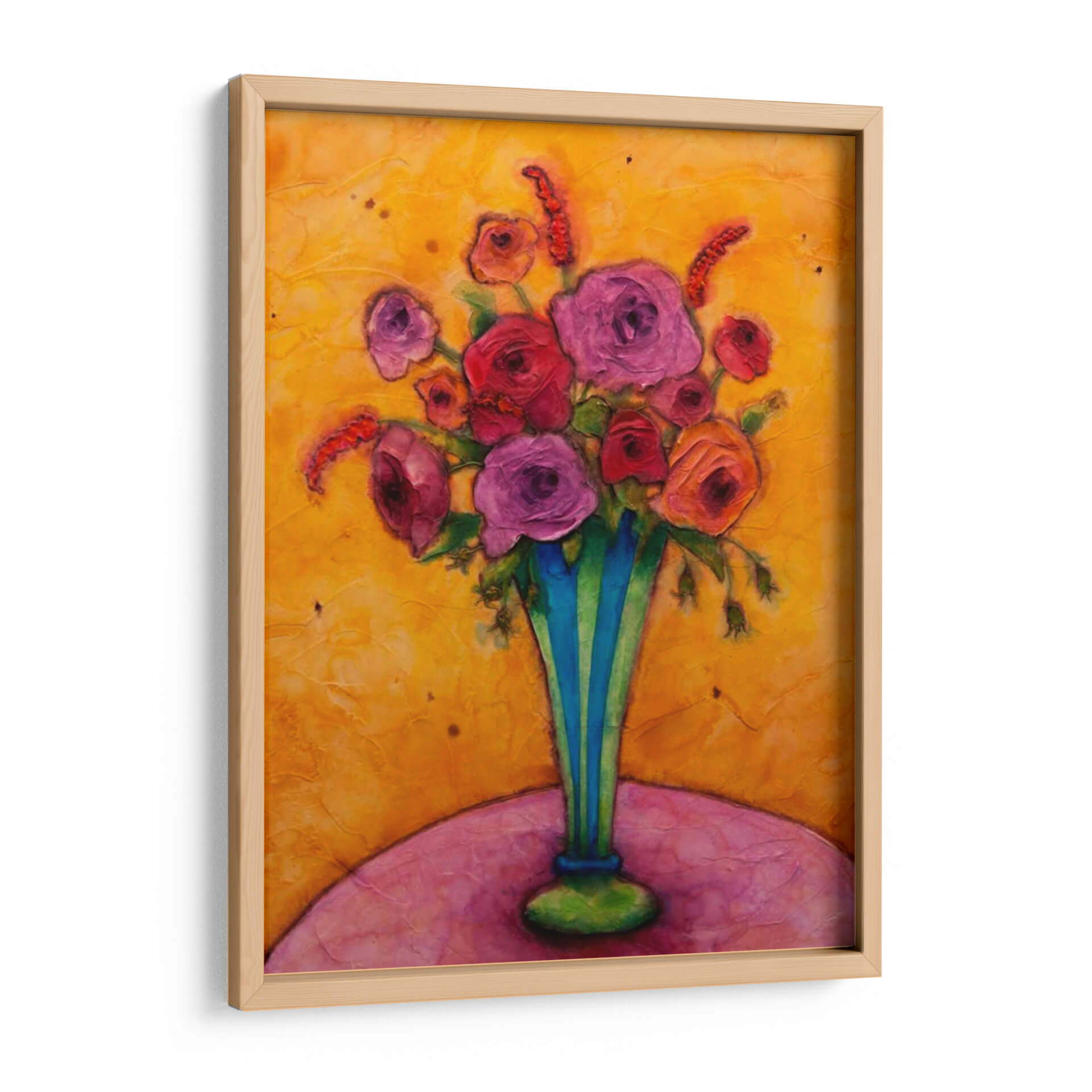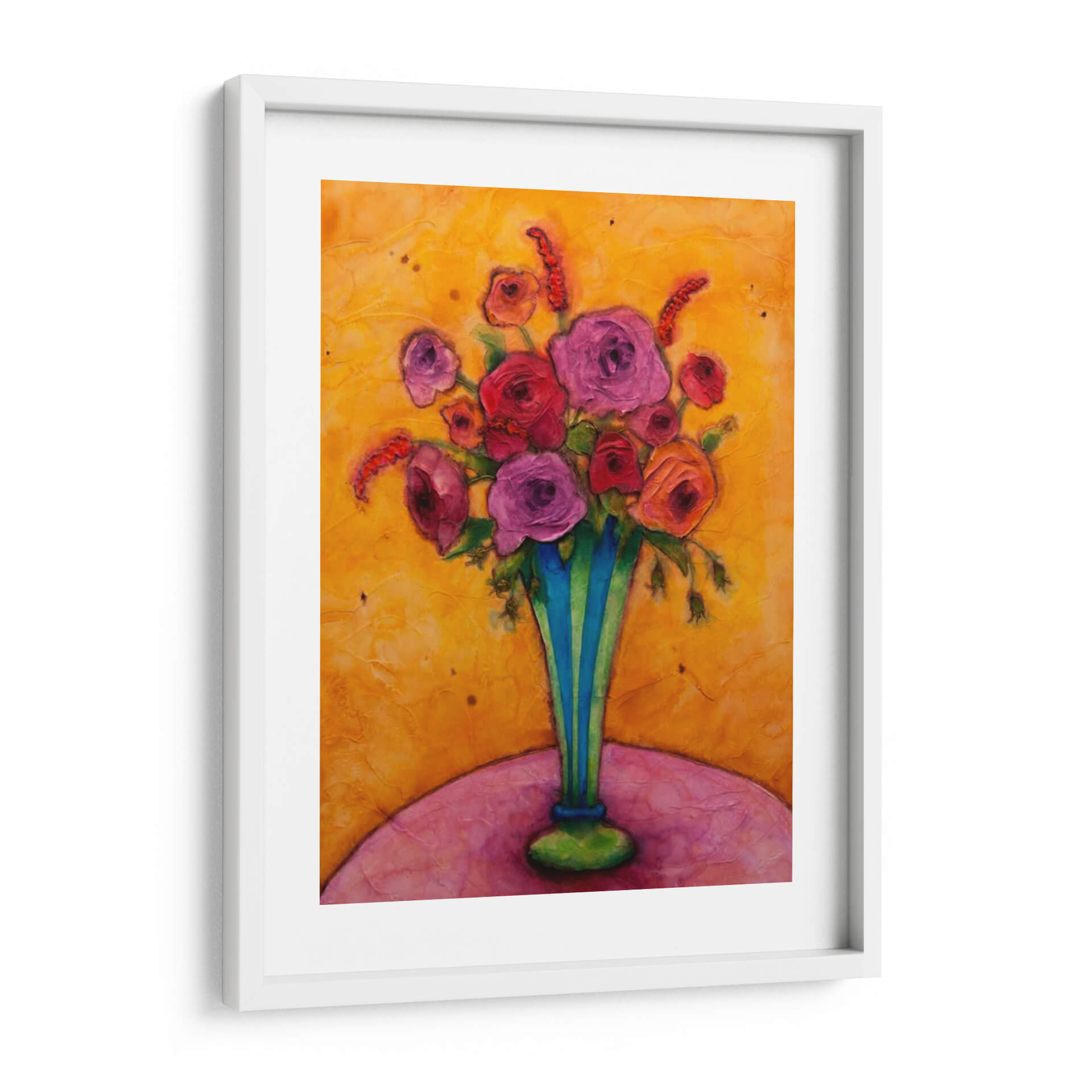 Sumérgete en la vibrante alegría de "Felicidad De Tallo Largo", una obra de arte cautivadora de Marabeth Quin que irradia calidez y vitalidad. Este cuadro decorativo es una explosión de color, dominado por un fondo texturizado en tonos dorados y ocres que evocan la luz del sol y la energía de un día radiante. En el centro, un exuberante ramo de flores en tonos fucsia, rosa y rojo se alza con orgullo dentro de un jarrón de rayas azules y verdes, aportando un contraste audaz y refrescante. Las flores, representadas con una pincelada expresiva y empastada, parecen casi palpables, invitando al espectador a apreciar su belleza y delicadeza. La composición, centrada en el arreglo floral, se apoya sobre una superficie curva en tonos rosados y púrpuras, creando una base suave y armónica. La obra transmite una sensación de optimismo y celebración, ideal para añadir un toque de felicidad y sofisticación a cualquier espacio. Perfecta para salones, comedores o incluso un estudio, "Felicidad De Tallo Largo" es una pieza que inspirará conversaciones y llenará de vida tu hogar. Su estilo contemporáneo y su rica paleta de colores la convierten en una adición excepcional para amantes del arte que buscan piezas únicas y llenas de emoción.