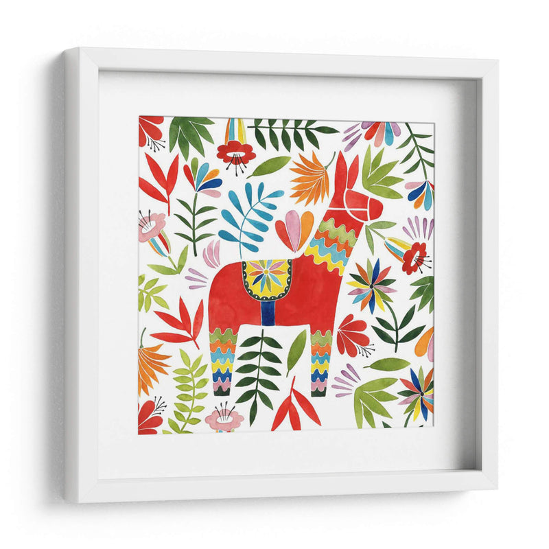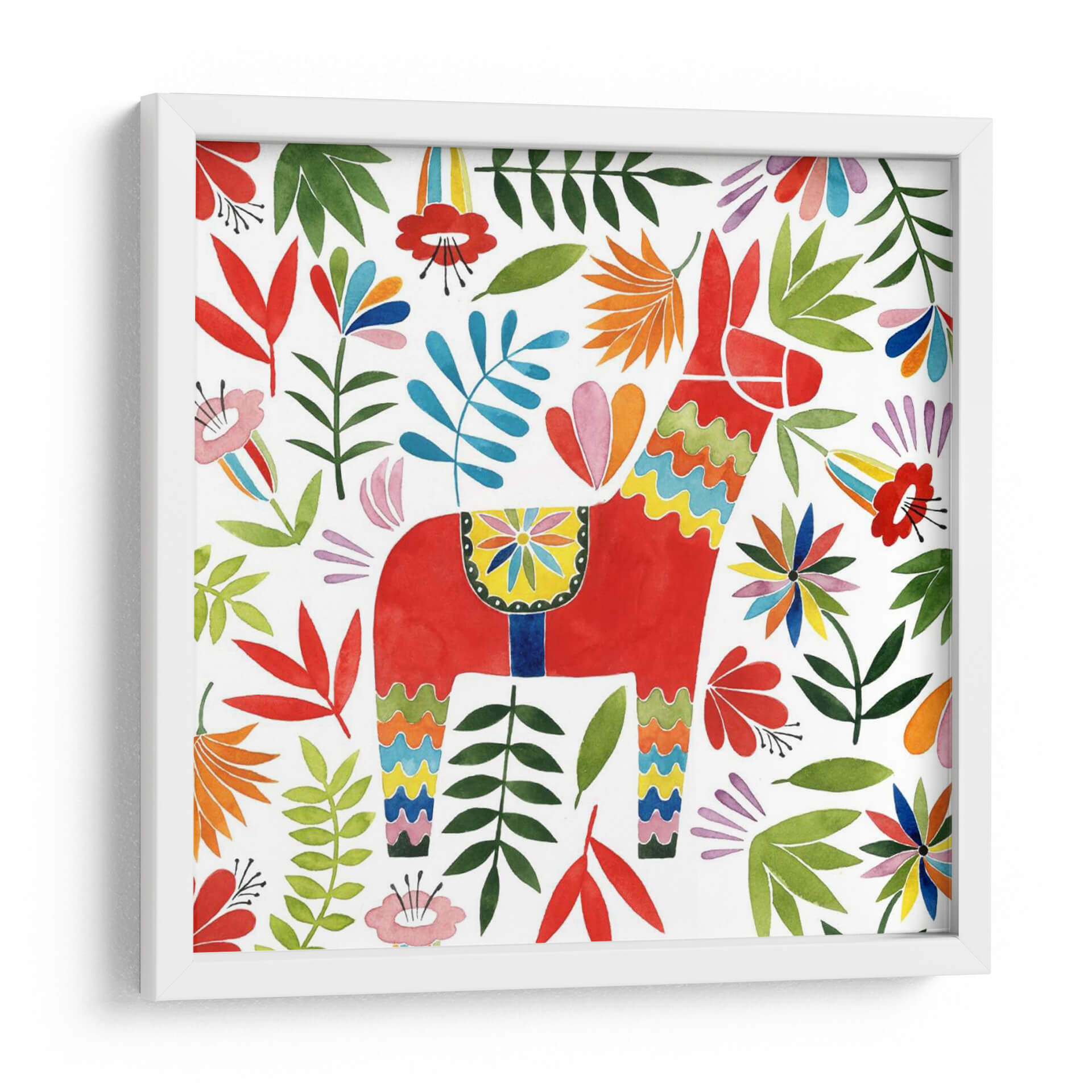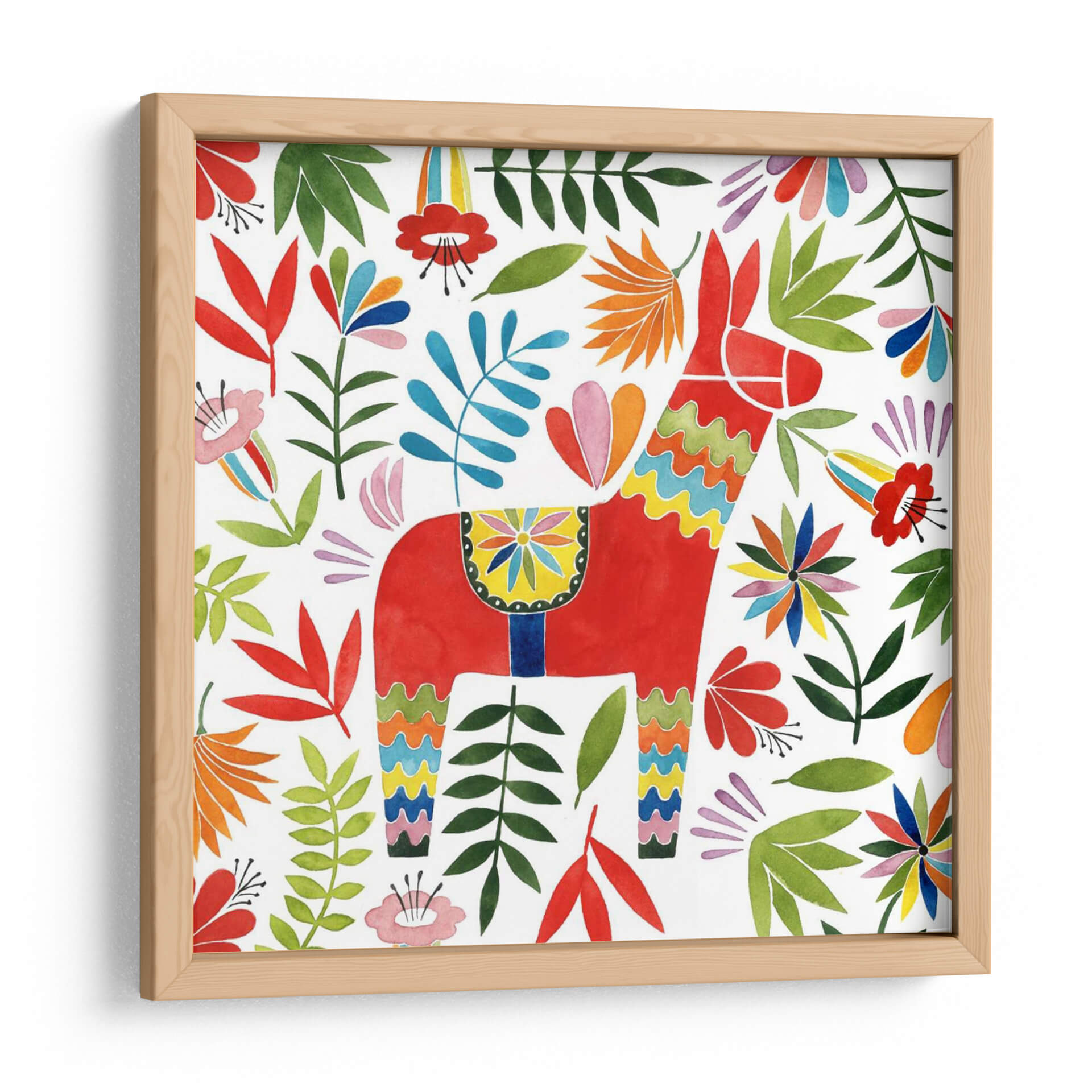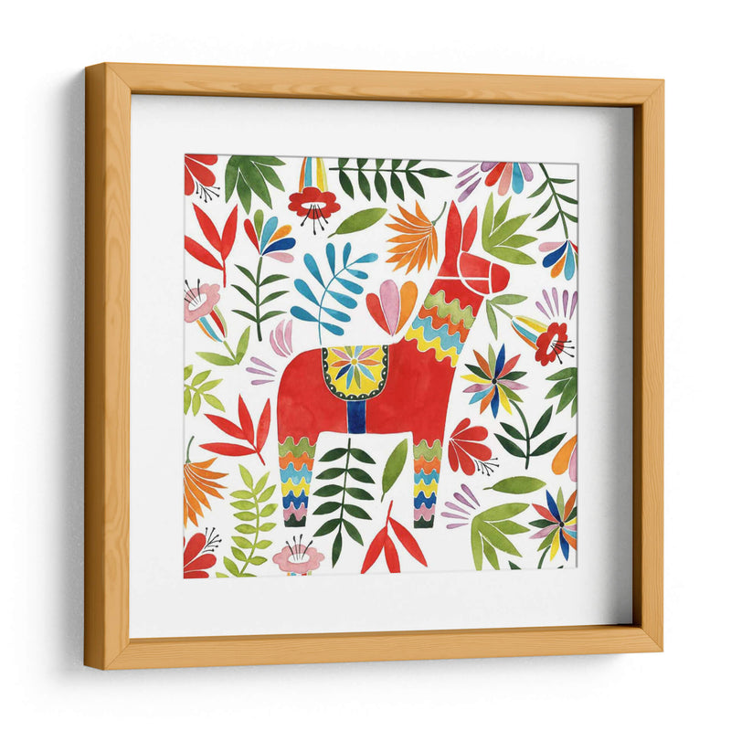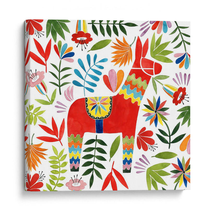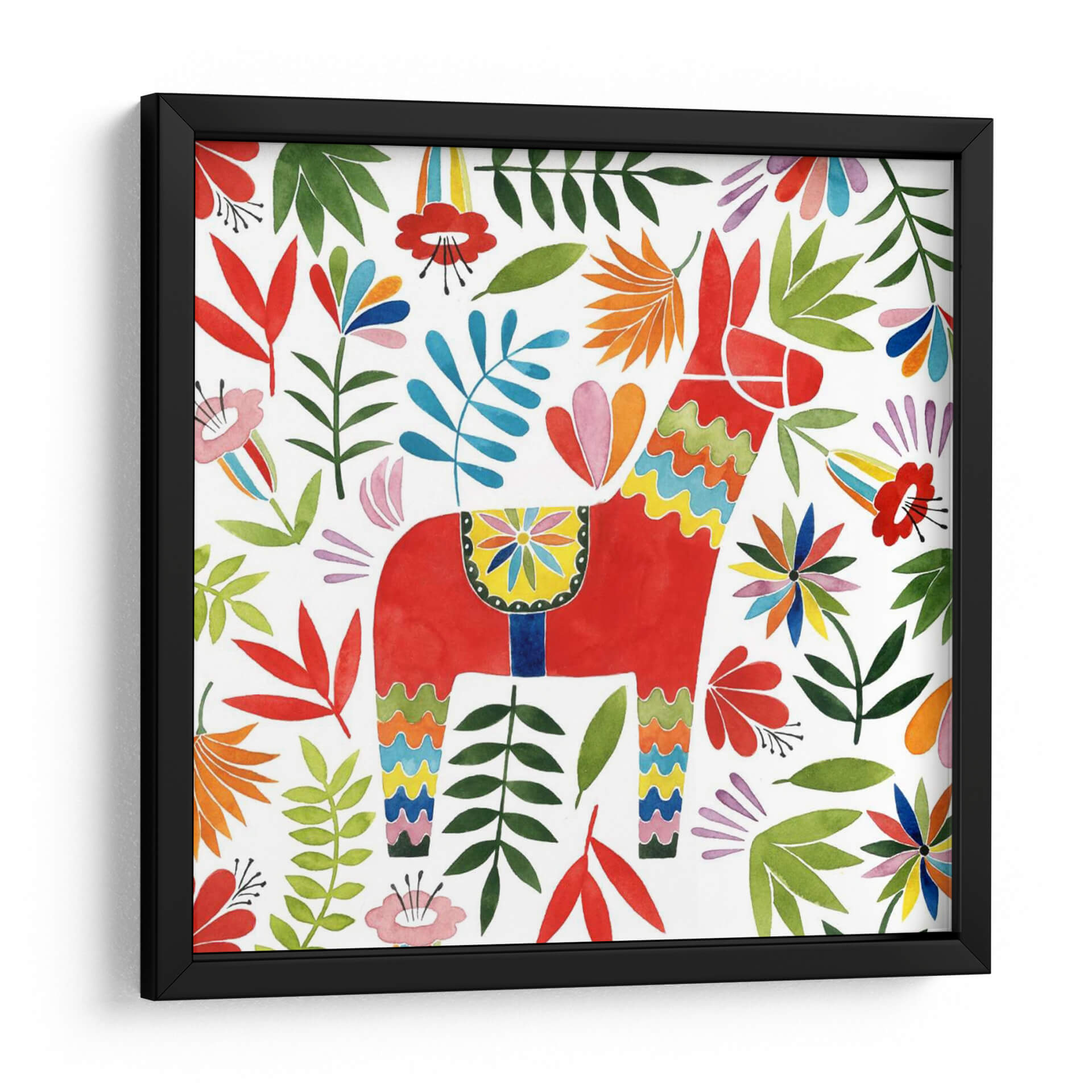 Sumérgete en la alegría vibrante de "Festivo Otomi II", una obra de arte de Grace Popp que captura la esencia de la celebración y la cultura. Este cuadro decorativo presenta una encantadora figura de animal rojo, adornada con patrones geométricos coloridos y vibrantes en su crin y patas, evocando la rica tradición de los otomi. Rodeando a la figura central, un exuberante follaje de hojas verdes y flores estilizadas en tonos de azul, naranja, rosa y rojo, crean un telón de fondo dinámico y alegre. La paleta de colores es audaz y optimista, inyectando energía y calidez a cualquier espacio. El estilo artístico, con sus contornos definidos y la técnica que recuerda a la acuarela, aporta un toque artesanal y auténtico. "Festivo Otomi II" es perfecto para añadir un toque de color y vida a salones, comedores o incluso espacios infantiles, invitando a la fiesta y la buena energía. Su composición equilibrada y sus motivos folclóricos lo convierten en una pieza de conversación ideal para aquellos que aprecian el arte con alma y carácter.