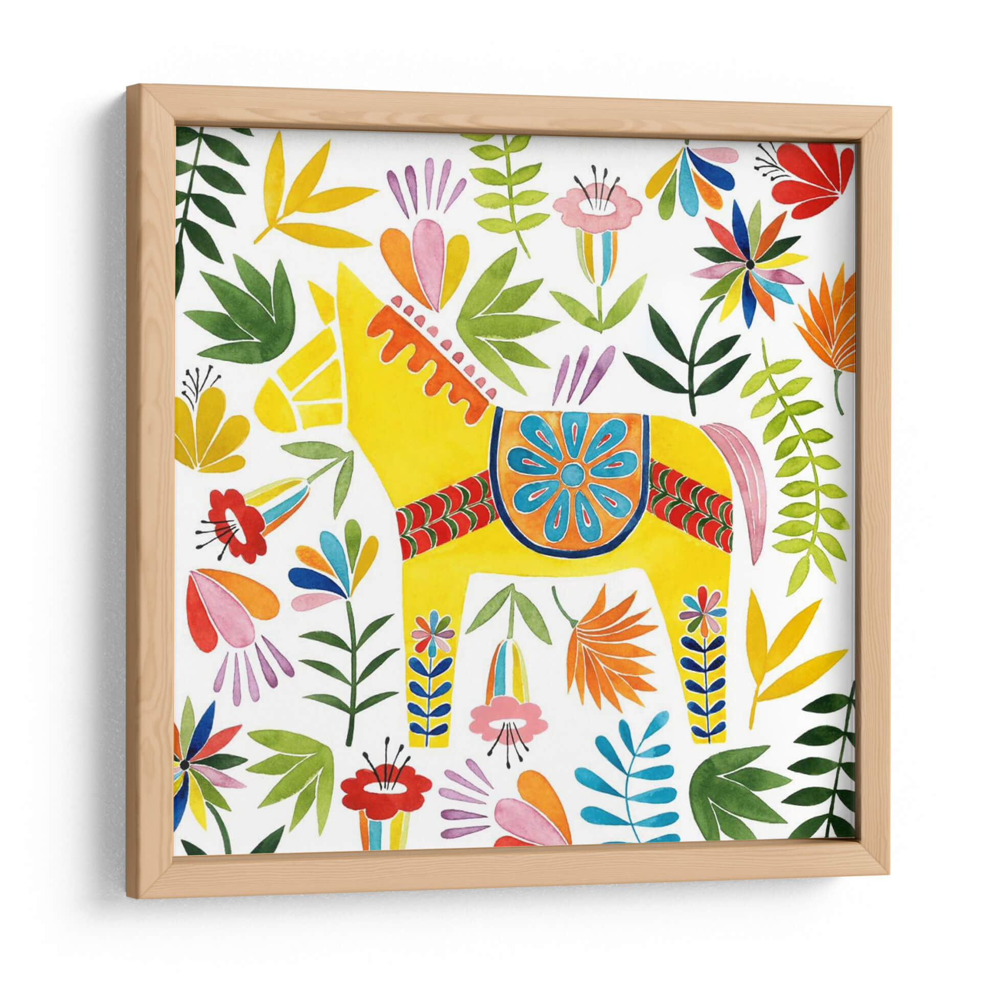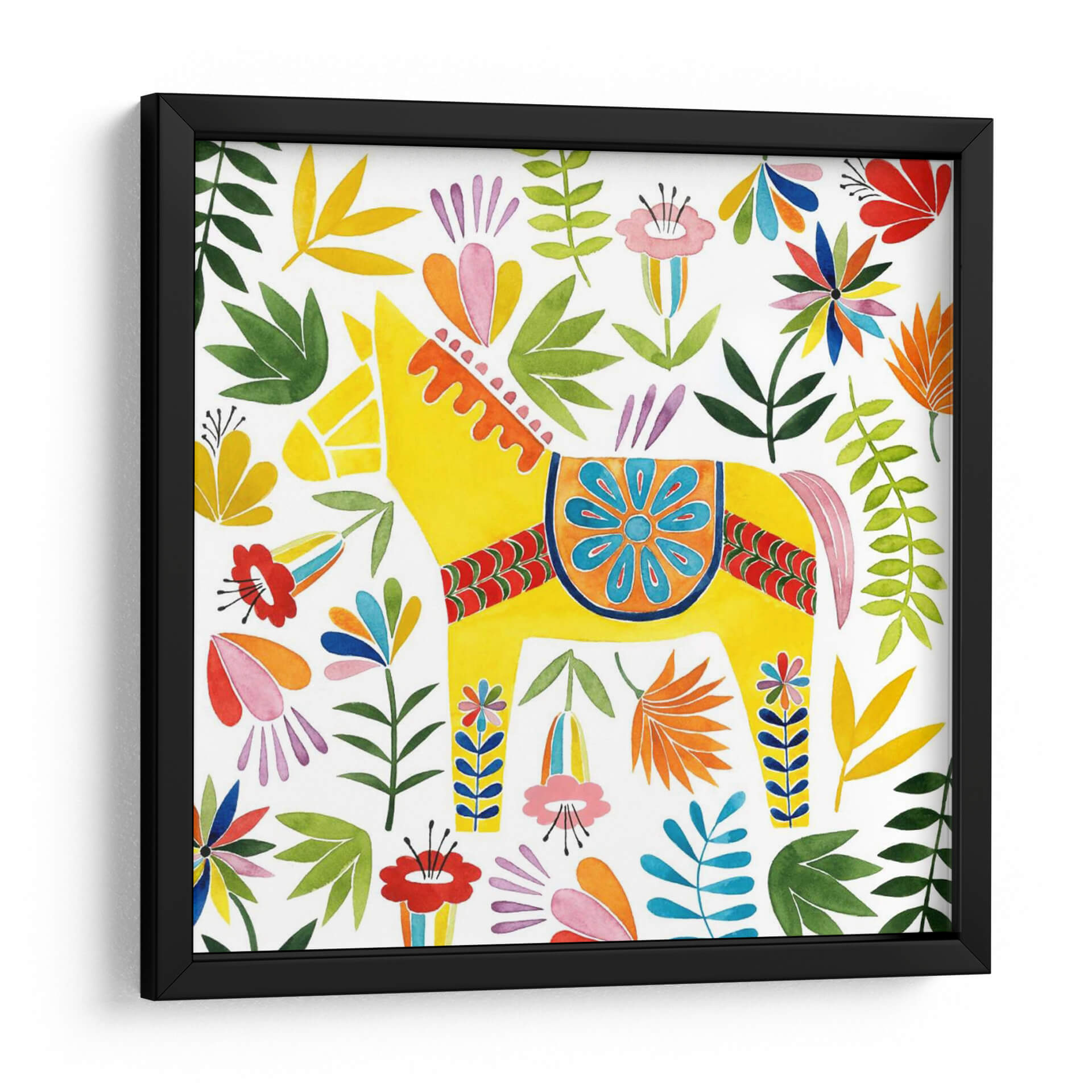 Inyecta una explosión de alegría y color en tu hogar con 'Festivo Otomi III', una cautivadora obra de arte de Grace Popp que celebra la vitalidad de la cultura Otomí a través de un diseño vibrante y folclórico. Este cuadro decorativo presenta un caballo estilizado en un brillante tono amarillo, adornado con un intrincado taparrabos de estilo floral en tonos azules y naranjas. La figura central está rodeada por una exuberante colección de flores y hojas estilizadas, pintadas en una paleta de acuarela que evoca la frescura y la exuberancia de la naturaleza. Los rojos intensos, naranjas cálidos, rosas delicados y verdes frondosos se entrelazan en un patrón armonioso sobre un fondo blanco limpio, creando un efecto visual dinámico y alegre. El estilo artístico, que fusiona elementos folclóricos con un toque moderno, lo hace perfecto para añadir un punto focal lleno de personalidad a cualquier sala de estar, dormitorio o espacio de trabajo. 'Festivo Otomi III' no es solo una pieza decorativa; es una invitación a celebrar la vida y la belleza de las tradiciones a través del arte contemporáneo. Ideal para quienes buscan un arte que irradie optimismo y sofisticación.