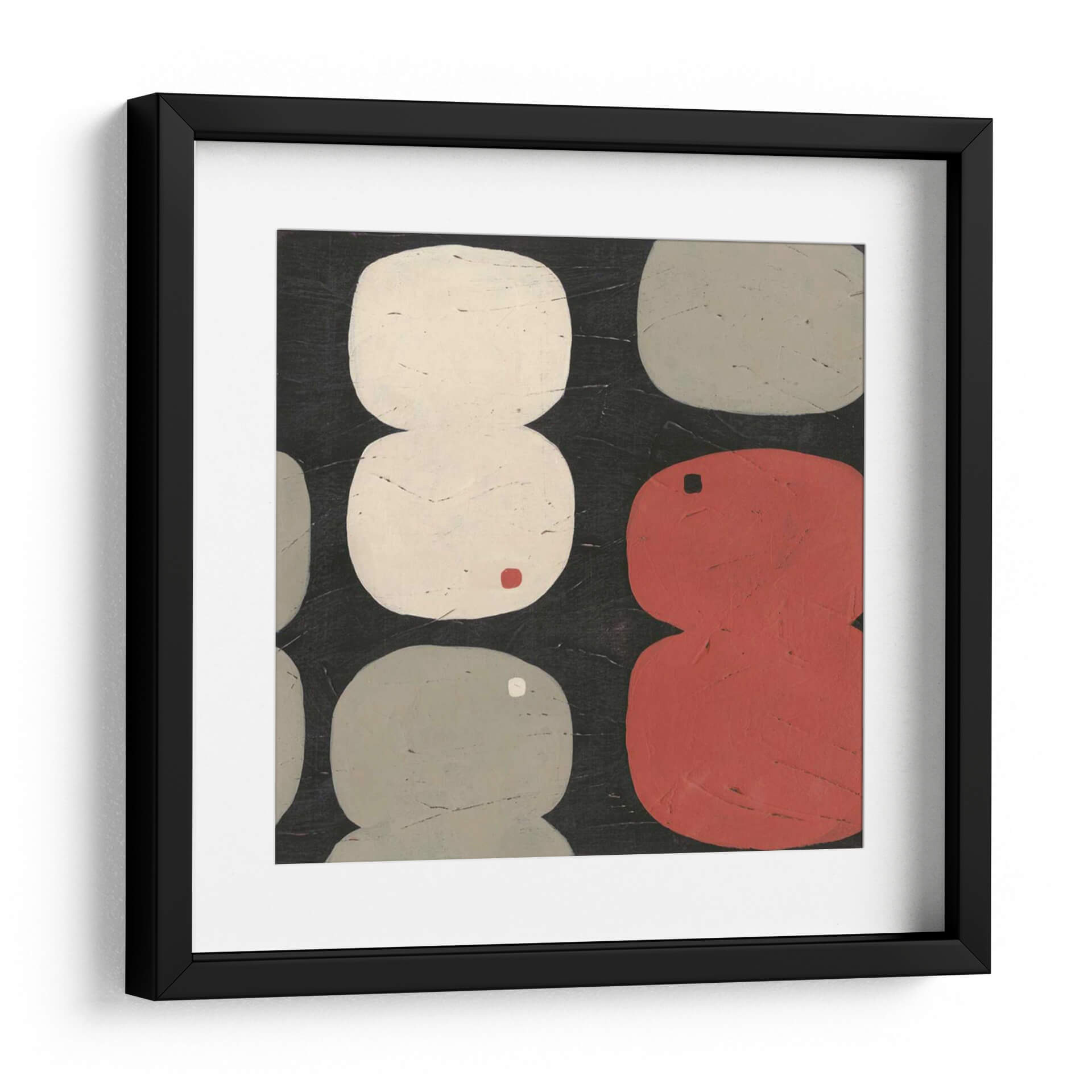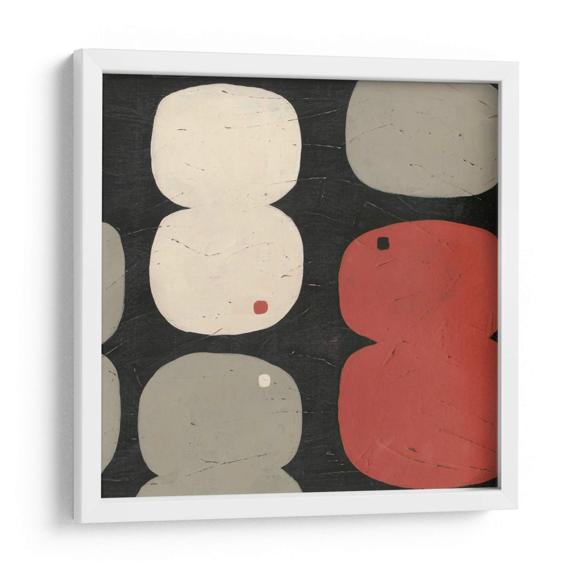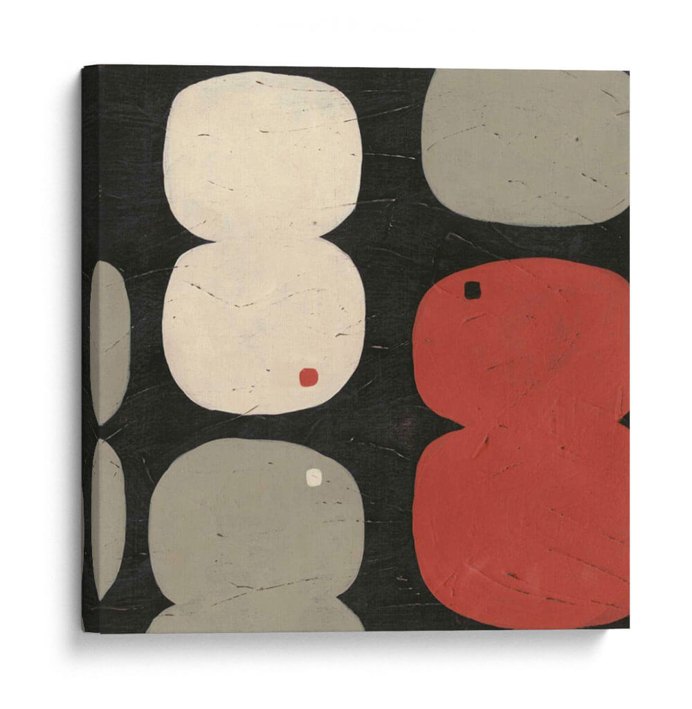 Sumérgete en la abstracción contemporánea con 'Figura Ocho I', una obra cautivadora de June Erica Vess. Este cuadro decorativo presenta una composición audaz y juguetona, dominada por formas orgánicas y redondeadas que evocan la simplicidad y la elegancia. La paleta de colores, centrada en tonos neutros como el blanco roto y el gris, se ve realzada por vibrantes acentos de rojo y un toque sutil de color ocre, creando un equilibrio visual fascinante sobre un fondo oscuro y texturizado. Las formas, dispuestas de manera casi rítmica, invitan a la contemplación, sugiriendo una narrativa abstracta que cada espectador puede interpretar a su manera. El estilo minimalista y la ejecución detallada hacen de 'Figura Ocho I' una pieza versátil, perfecta para añadir un punto de interés moderno y sofisticado a cualquier espacio. Ideal para salones contemporáneos, oficinas o estudios que buscan un toque de arte abstracto con personalidad. Este cuadro decorativo no solo embellece, sino que también estimula la conversación y la apreciación del arte moderno en tu hogar u oficina.