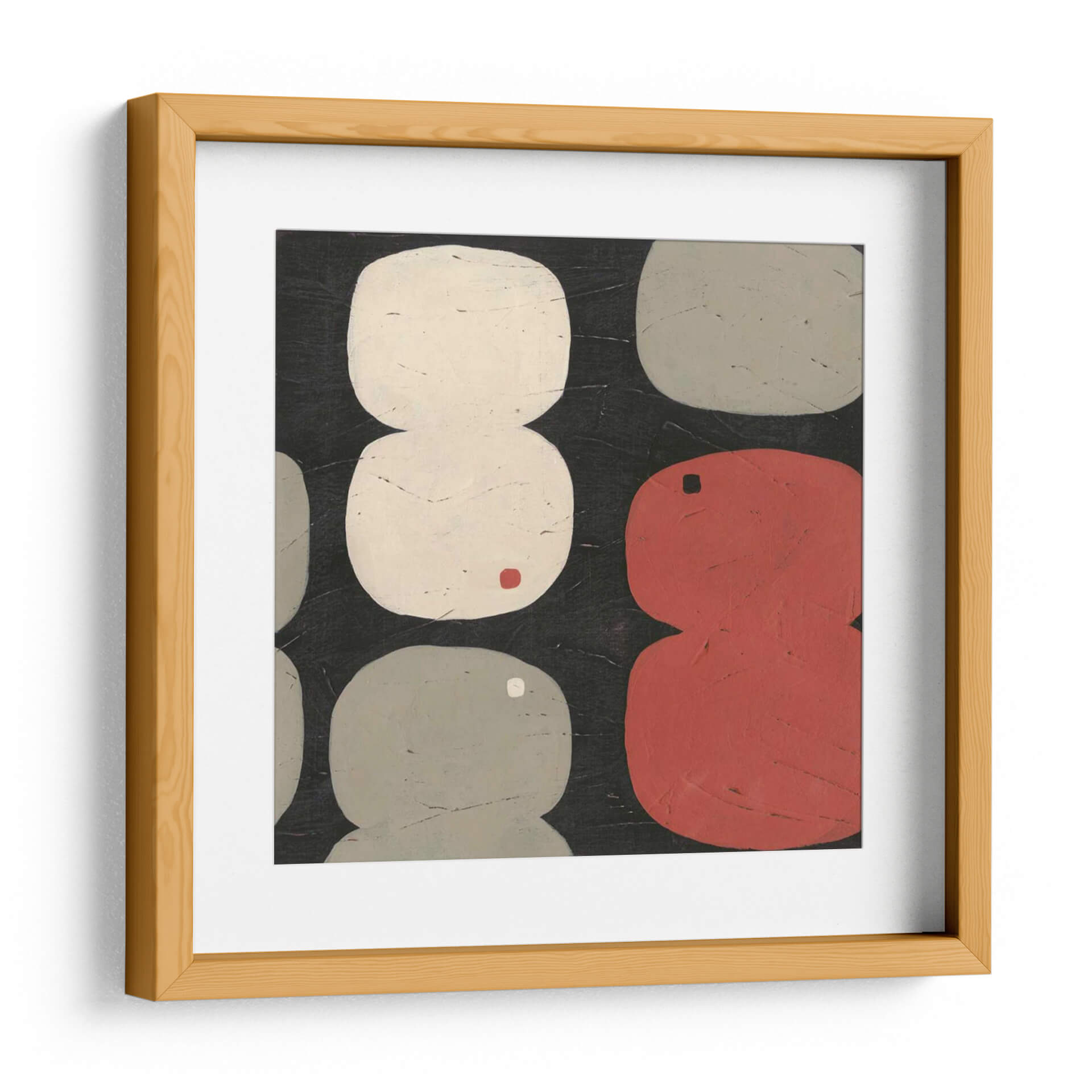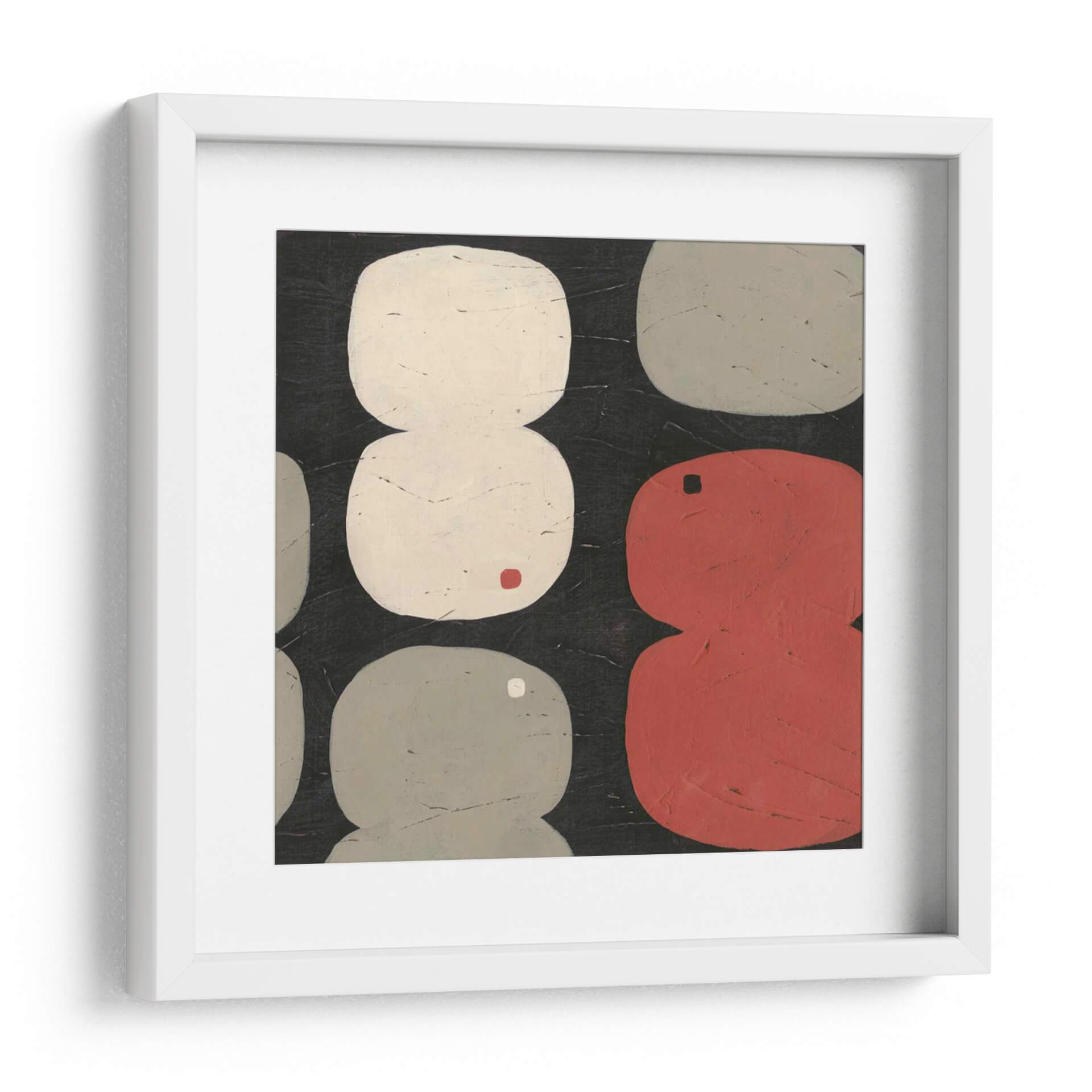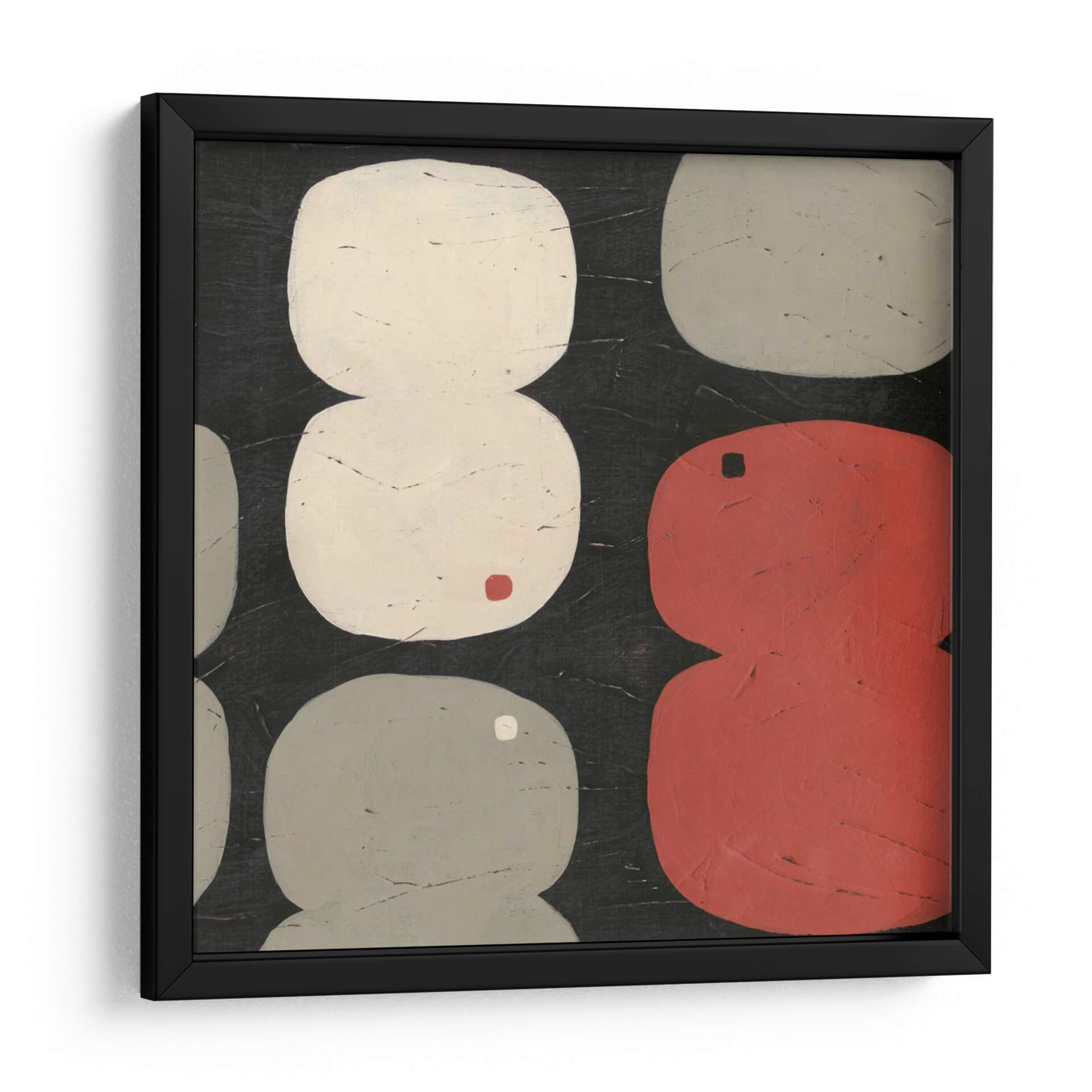 Sumérgete en la abstracción contemporánea con 'Figura Ocho I', una obra cautivadora de June Erica Vess. Este cuadro decorativo presenta una composición audaz y juguetona, dominada por formas orgánicas y redondeadas que evocan la simplicidad y la elegancia. La paleta de colores, centrada en tonos neutros como el blanco roto y el gris, se ve realzada por vibrantes acentos de rojo y un toque sutil de color ocre, creando un equilibrio visual fascinante sobre un fondo oscuro y texturizado. Las formas, dispuestas de manera casi rítmica, invitan a la contemplación, sugiriendo una narrativa abstracta que cada espectador puede interpretar a su manera. El estilo minimalista y la ejecución detallada hacen de 'Figura Ocho I' una pieza versátil, perfecta para añadir un punto de interés moderno y sofisticado a cualquier espacio. Ideal para salones contemporáneos, oficinas o estudios que buscan un toque de arte abstracto con personalidad. Este cuadro decorativo no solo embellece, sino que también estimula la conversación y la apreciación del arte moderno en tu hogar u oficina.