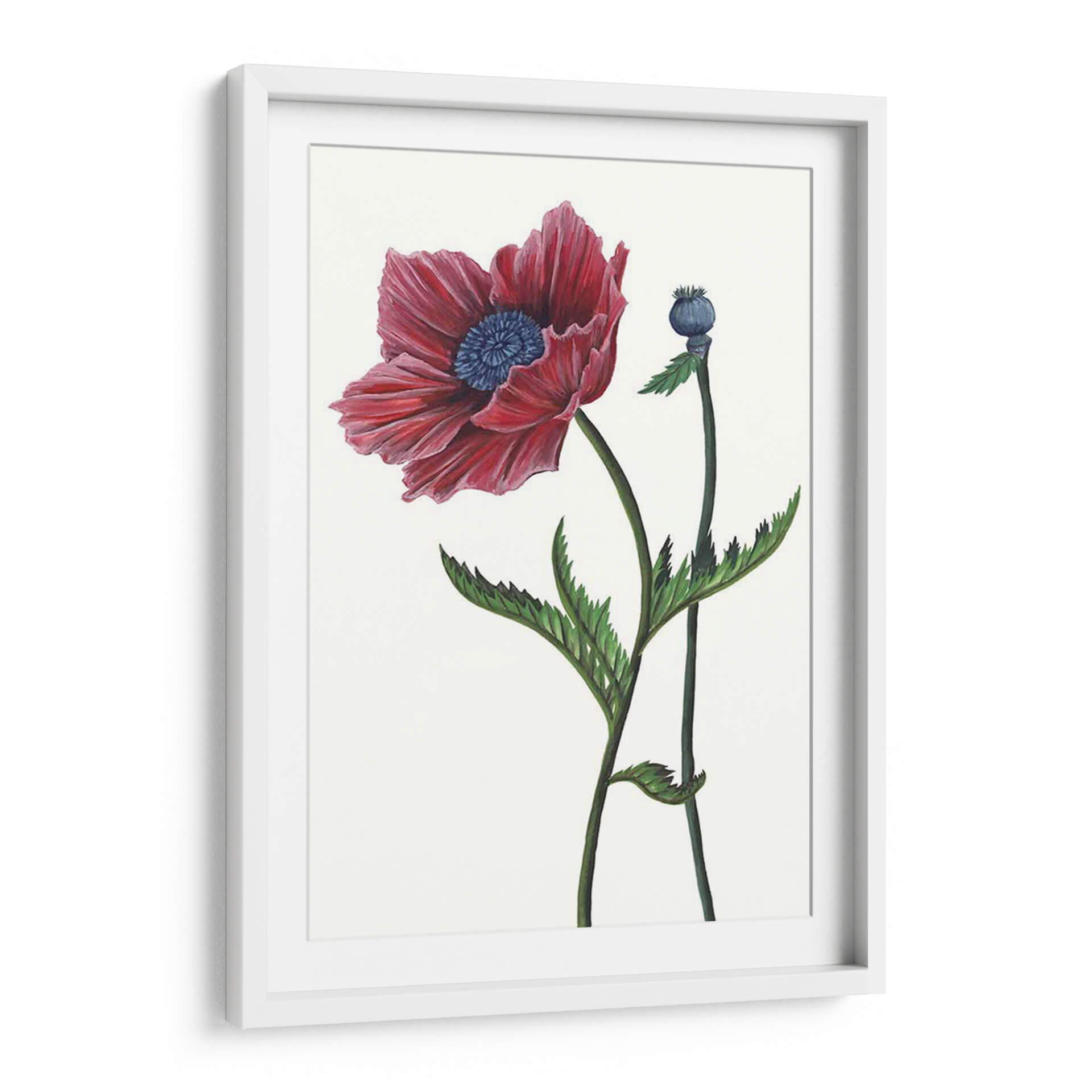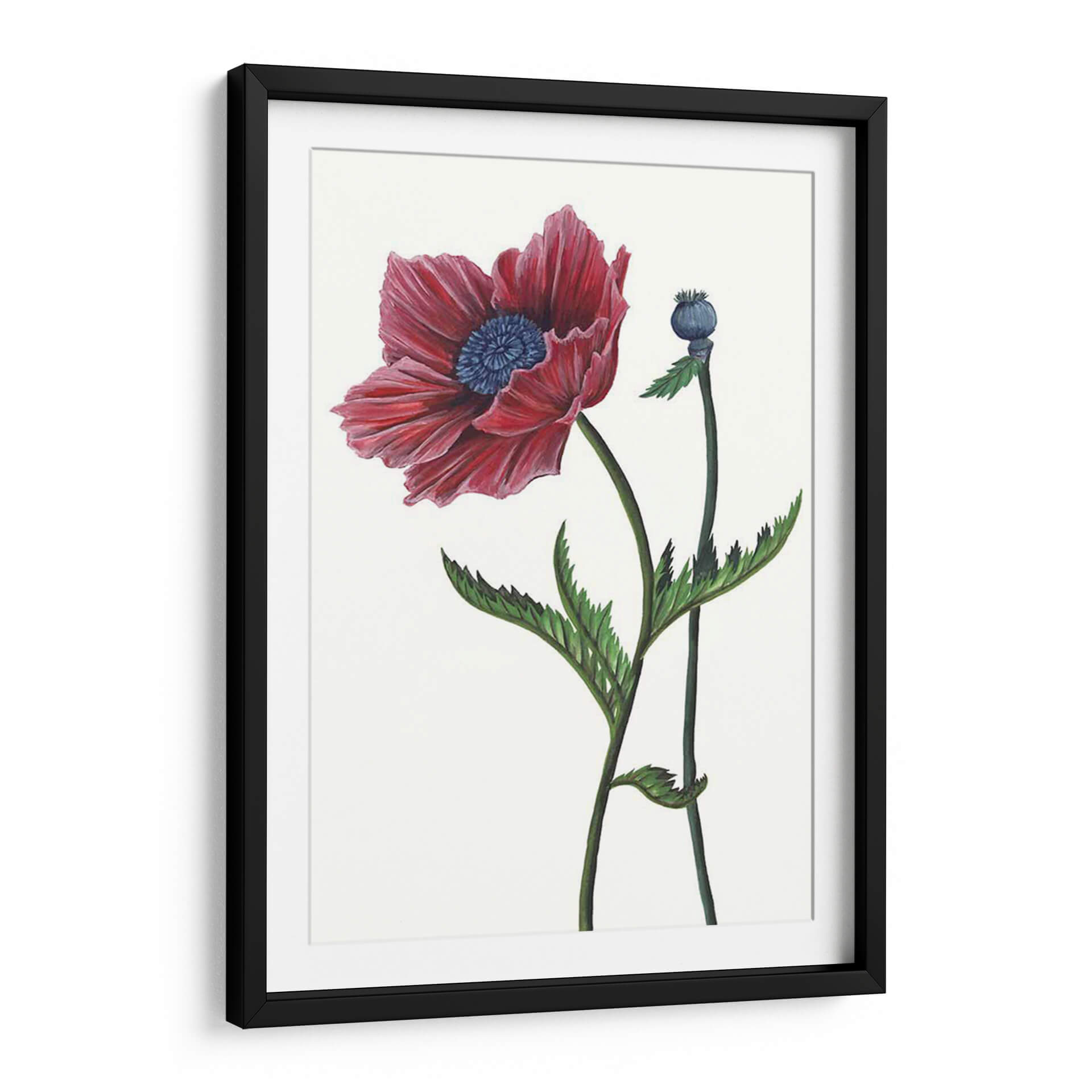 Este cautivador cuadro decorativo, titulado 'Flor de Amapola II' por Melissa Wang, captura la delicada belleza de una amapola en plena floración con un realismo exquisito. La obra presenta una vibrante amapola roja, cuyos pétalos arrugados y llenos de textura contrastan elegantemente con el centro azul profundo y detallado. A su lado, un capullo de amapola incipiente y hojas verdes frondosas complementan la composición, todo ello sobre un fondo neutro y claro que permite que la flor sea la protagonista indiscutible. La paleta de colores, dominada por rojos intensos, azules profundos y verdes naturales, crea una atmósfera de serenidad y elegancia natural. El estilo detallado y casi botánico de la obra evoca una sensación de contemplación y aprecio por la naturaleza. Este cuadro decorativo es perfecto para añadir un toque de color y sofisticación a cualquier espacio, ya sea una sala de estar, un dormitorio o una oficina. Su diseño atemporal y su ejecución artística lo convierten en una pieza de arte de pared ideal para quienes buscan infundir calma y belleza natural en su entorno, sirviendo como un punto focal que invita a la admiración y la tranquilidad.