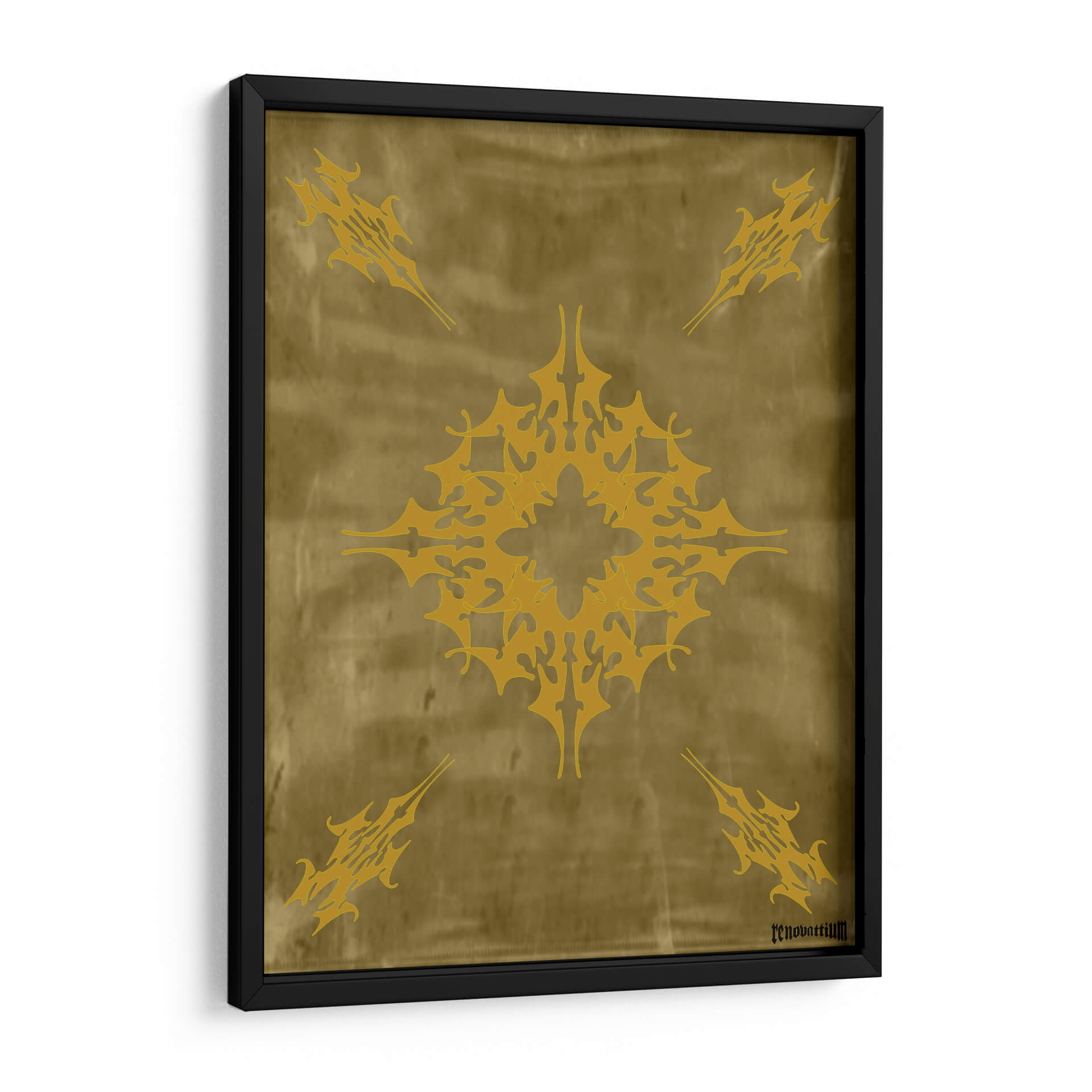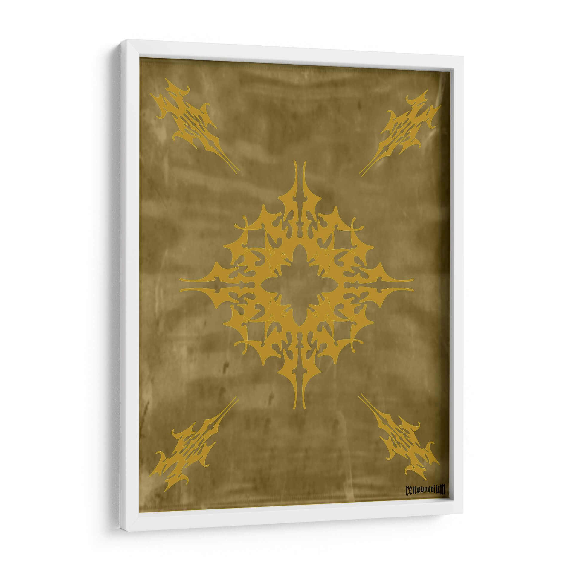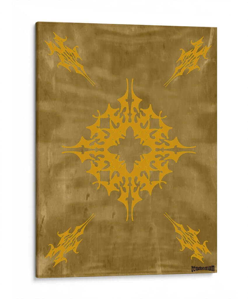 Descubre "Flor de Oro", una obra de arte abstracto de Carlos Pixley que evoca elegancia y misterio. Este cuadro decorativo presenta un intrincado diseño central en tonos dorados vibrantes, que recuerda a un mandala estilizado o un símbolo ancestral. Se repite este motivo en las cuatro esquinas, creando una composición simétrica y armónica sobre un fondo texturizado que imita el cuero o un pergamino envejecido en tonalidades ocres y doradas. La paleta de colores cálidos y terrosos, con el protagonista dorado, aporta una sensación de lujo, calidez y sofisticación a cualquier espacio. La atmósfera que transmite es una de misticismo y poder, invitando a la contemplación. Ideal para salas de estar modernas, comedores o estudios que busquen un toque de distinción y un punto focal impactante. Este cuadro abstracto es perfecto para quienes aprecian el diseño geométrico con un aire orgánico y atemporal, añadiendo un elemento de singularidad y riqueza visual a la decoración de paredes. Transforma tu hogar u oficina con esta pieza única que combina arte contemporáneo y una estética inspirada en lo etéreo y lo terrenal.