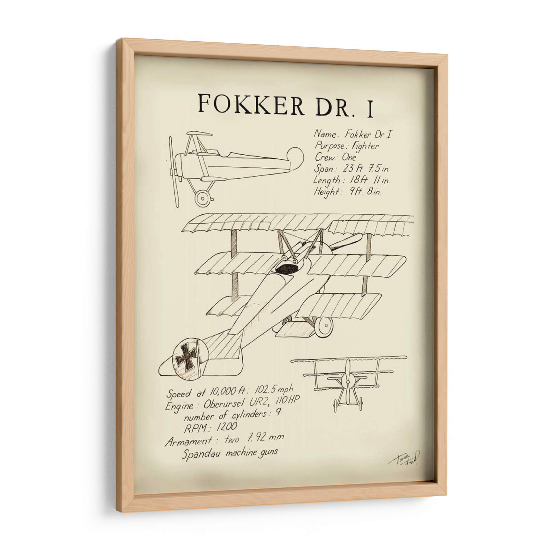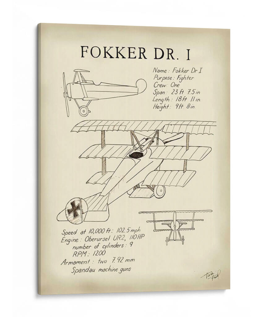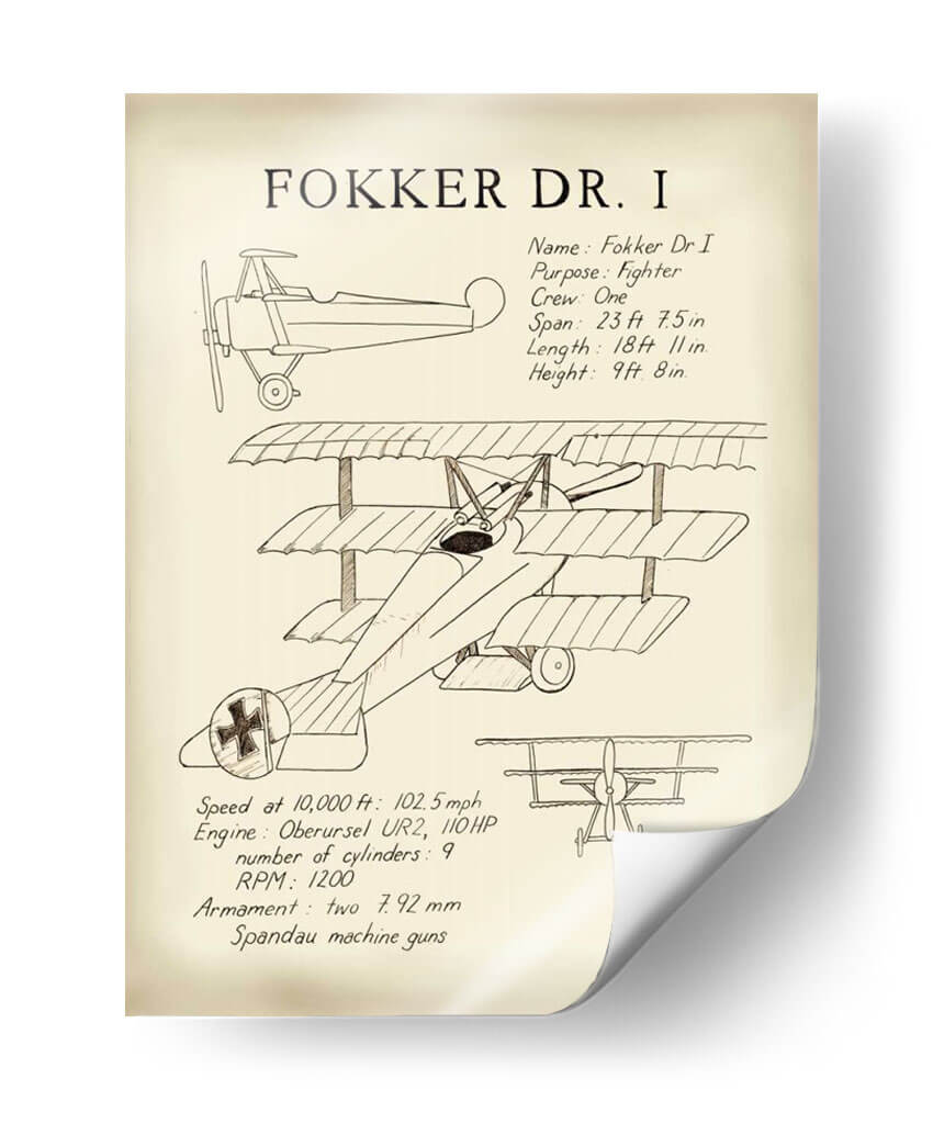 Sumérgete en la historia de la aviación con este evocador cuadro decorativo del Fokker Dr. I, una obra de arte que rinde homenaje a uno de los cazas más icónicos de la Primera Guerra Mundial. La ilustración detallada, realizada con un estilo que evoca los planos técnicos y bocetos de época, captura la esencia de esta legendaria aeronave triplano. Los trazos finos y la paleta de colores sepia y crema crean una atmósfera nostálgica y sofisticada, transportándote a una era de audacia y aventura en los cielos. Este cuadro decorativo es perfecto para espacios que buscan un toque de historia, carácter y un aire retro. Ideal para oficinas, estudios o cualquier rincón donde desees añadir un elemento de conversación y admiración por la ingeniería aeronáutica y el espíritu pionero. Su diseño atemporal lo convierte en una pieza versátil, capaz de complementar tanto decoraciones clásicas como modernas, aportando un elemento único y lleno de personalidad. Una pieza que celebra la ingeniería, la historia y el arte, lista para elevar la estética de tu hogar u oficina.