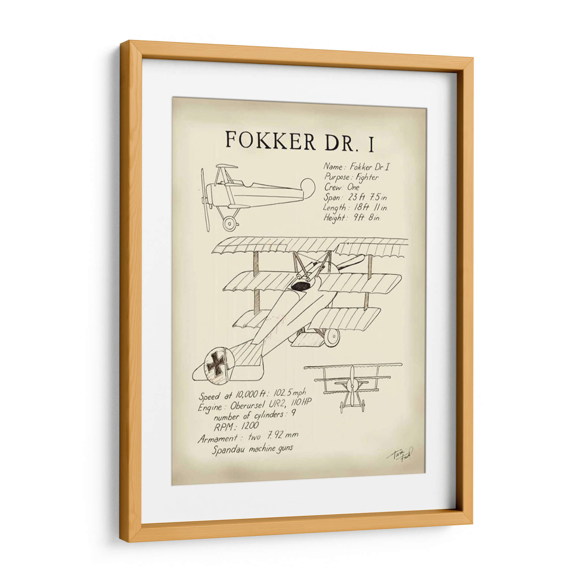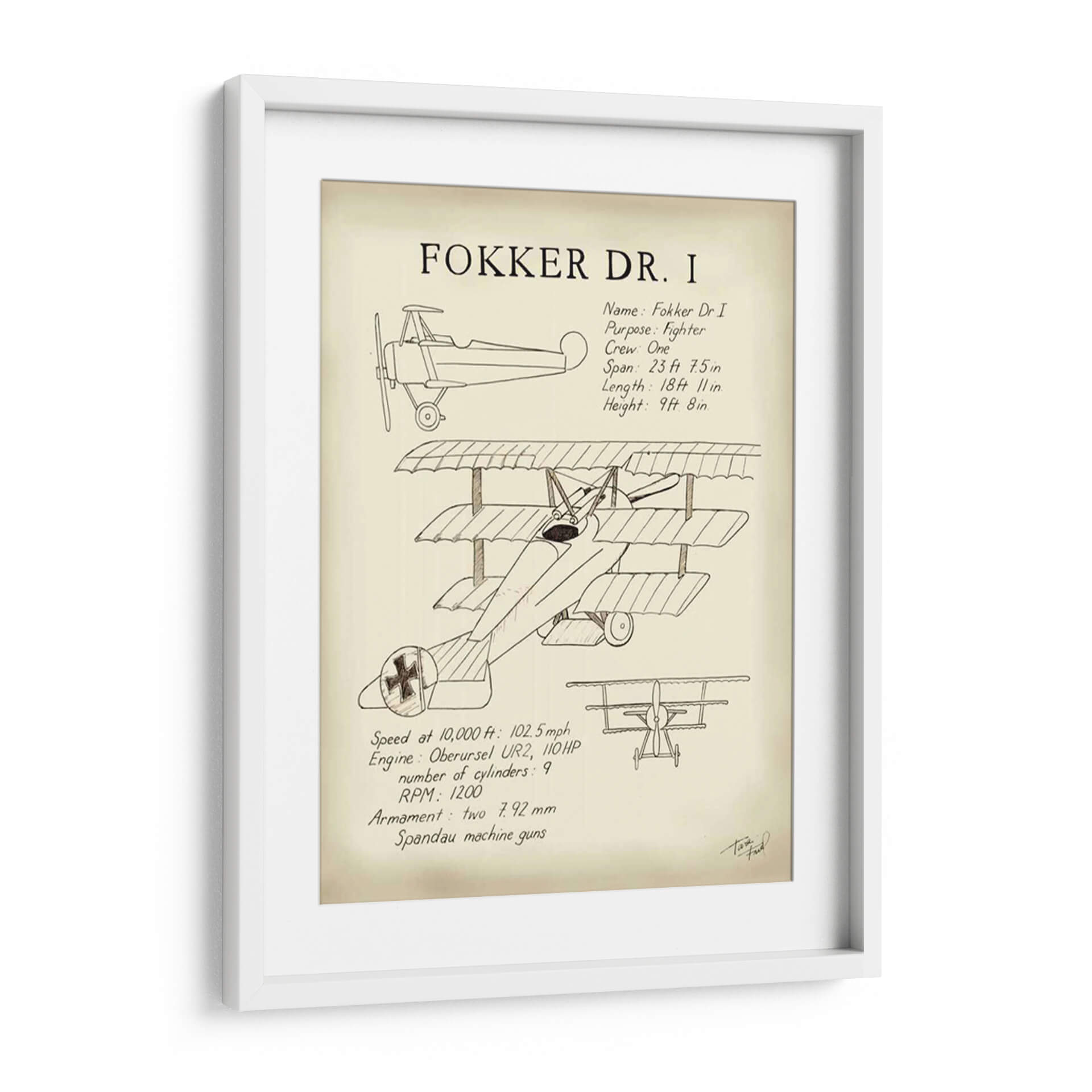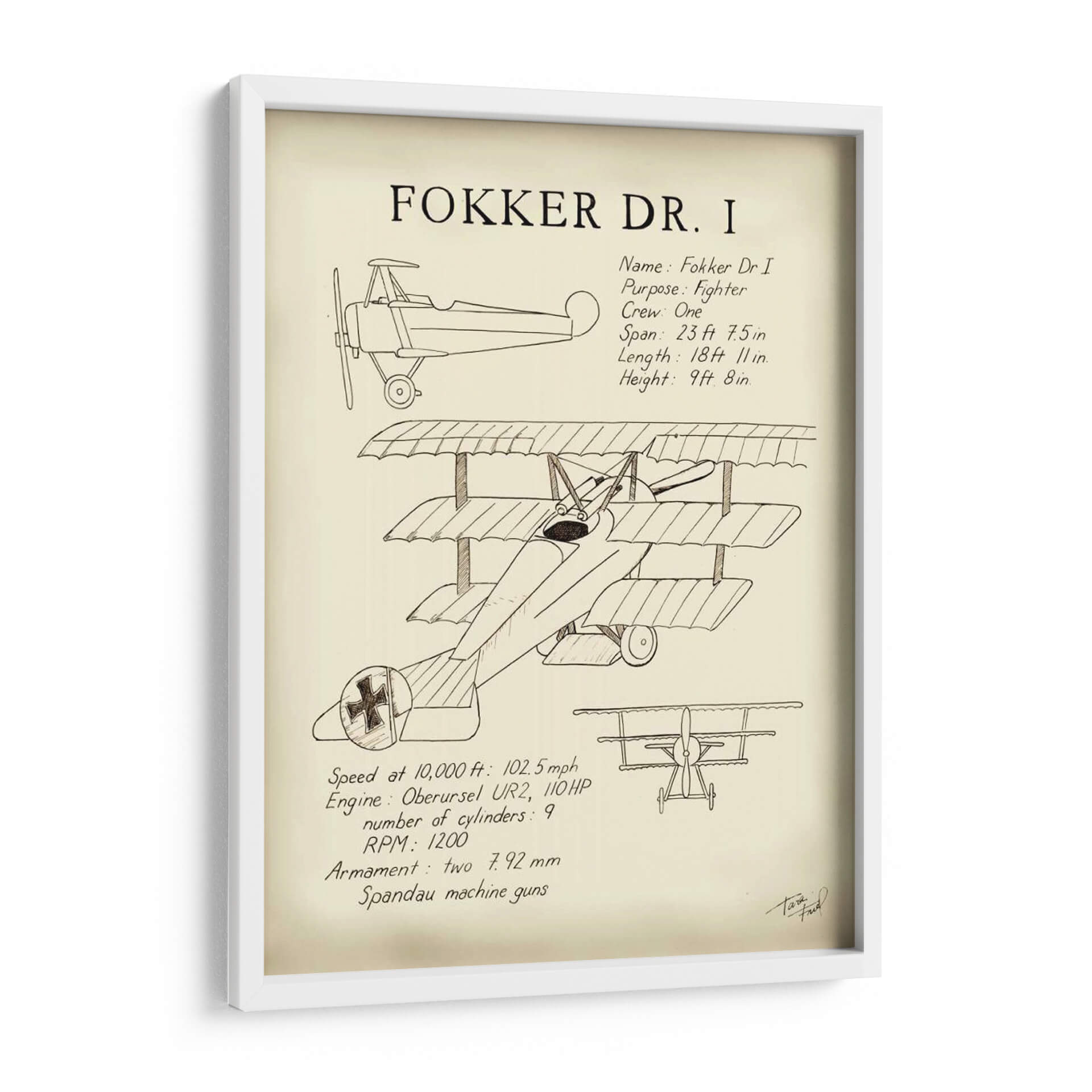 Sumérgete en la historia de la aviación con este evocador cuadro decorativo del Fokker Dr. I, una obra de arte que rinde homenaje a uno de los cazas más icónicos de la Primera Guerra Mundial. La ilustración detallada, realizada con un estilo que evoca los planos técnicos y bocetos de época, captura la esencia de esta legendaria aeronave triplano. Los trazos finos y la paleta de colores sepia y crema crean una atmósfera nostálgica y sofisticada, transportándote a una era de audacia y aventura en los cielos. Este cuadro decorativo es perfecto para espacios que buscan un toque de historia, carácter y un aire retro. Ideal para oficinas, estudios o cualquier rincón donde desees añadir un elemento de conversación y admiración por la ingeniería aeronáutica y el espíritu pionero. Su diseño atemporal lo convierte en una pieza versátil, capaz de complementar tanto decoraciones clásicas como modernas, aportando un elemento único y lleno de personalidad. Una pieza que celebra la ingeniería, la historia y el arte, lista para elevar la estética de tu hogar u oficina.