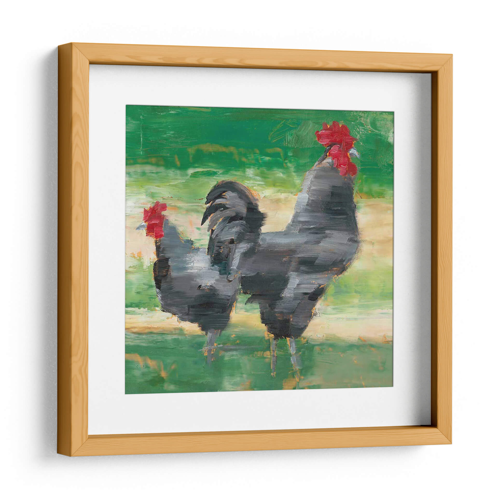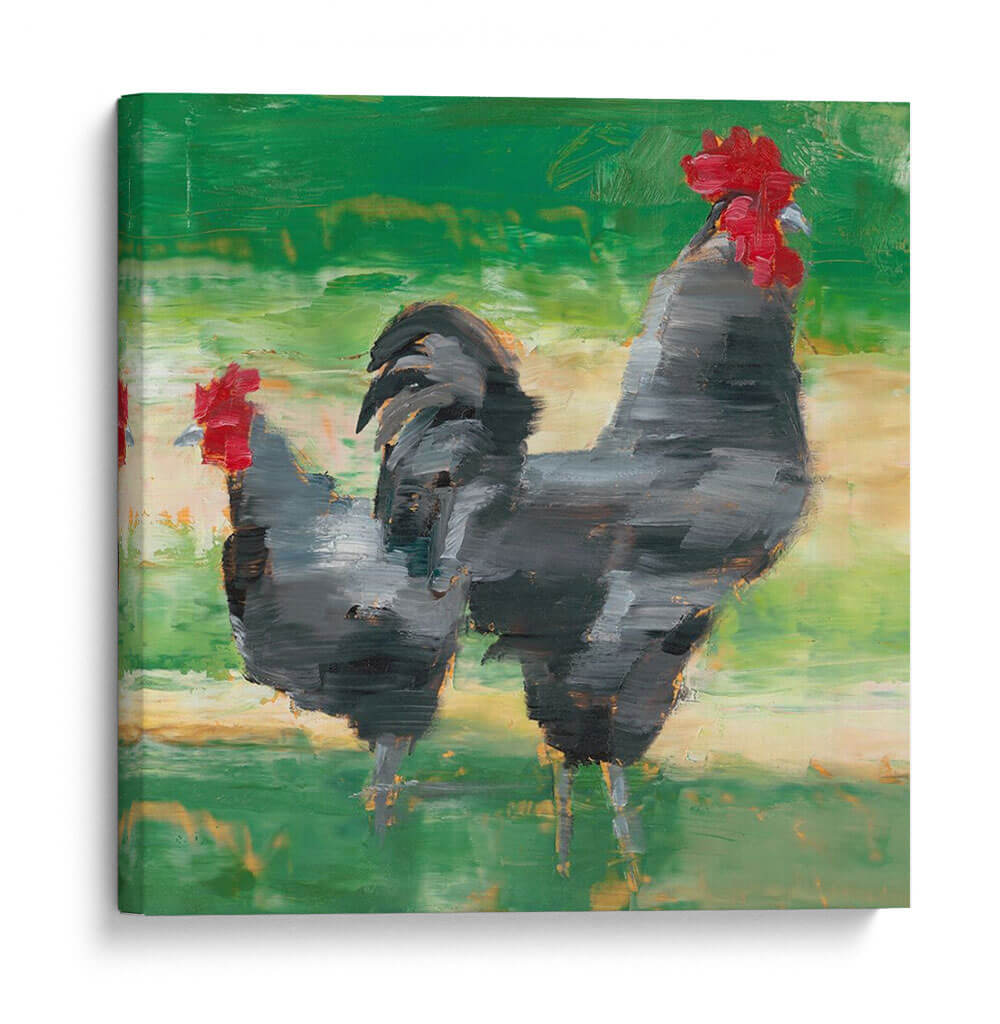 Este evocador cuadro decorativo de Ethan Harper captura la esencia de la vida rural con un estilo impresionista moderno. La obra presenta dos gallos, uno más prominente que el otro, con un plumaje detallado en tonos de gris oscuro y acentos de rojo vibrante en sus crestas y barbas. El fondo se compone de pinceladas audaces y texturizadas en variados tonos de verde y amarillo, sugiriendo un prado o un entorno natural con un juego de luces y sombras dinámico. La técnica pictórica, con trazos visibles y una aplicación expresiva de la pintura, añade profundidad y movimiento a la pieza, creando una atmósfera enérgica pero a la vez serena. Ideal para añadir un toque de carácter y color a cualquier estancia, este cuadro es perfecto para salones, comedores o incluso cocinas con un estilo rústico o contemporáneo. Su composición central y el fuerte contraste entre las figuras oscuras y el fondo luminoso lo convierten en un punto focal cautivador. Es una obra que invita a la contemplación y celebra la belleza de las formas naturales con una interpretación artística única.