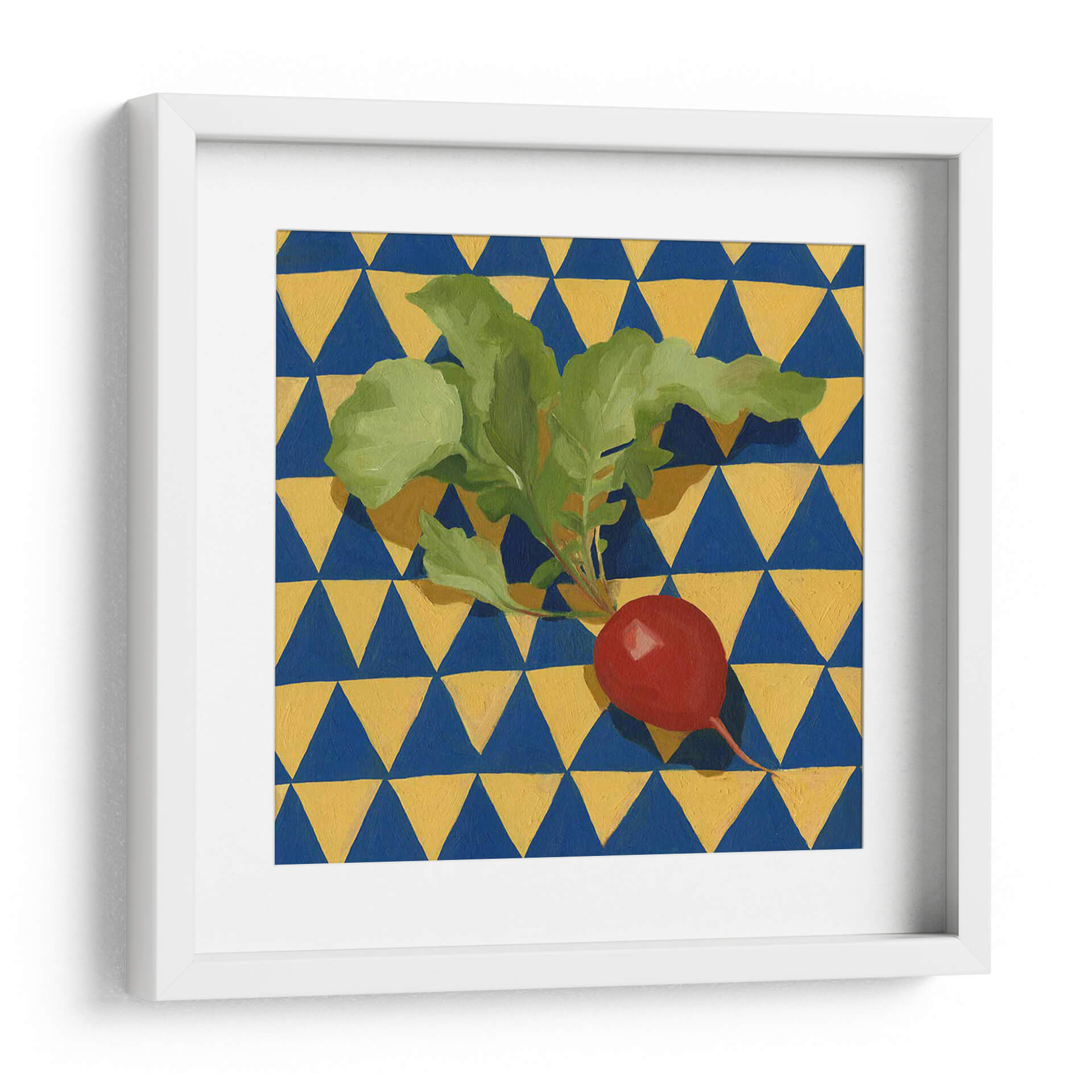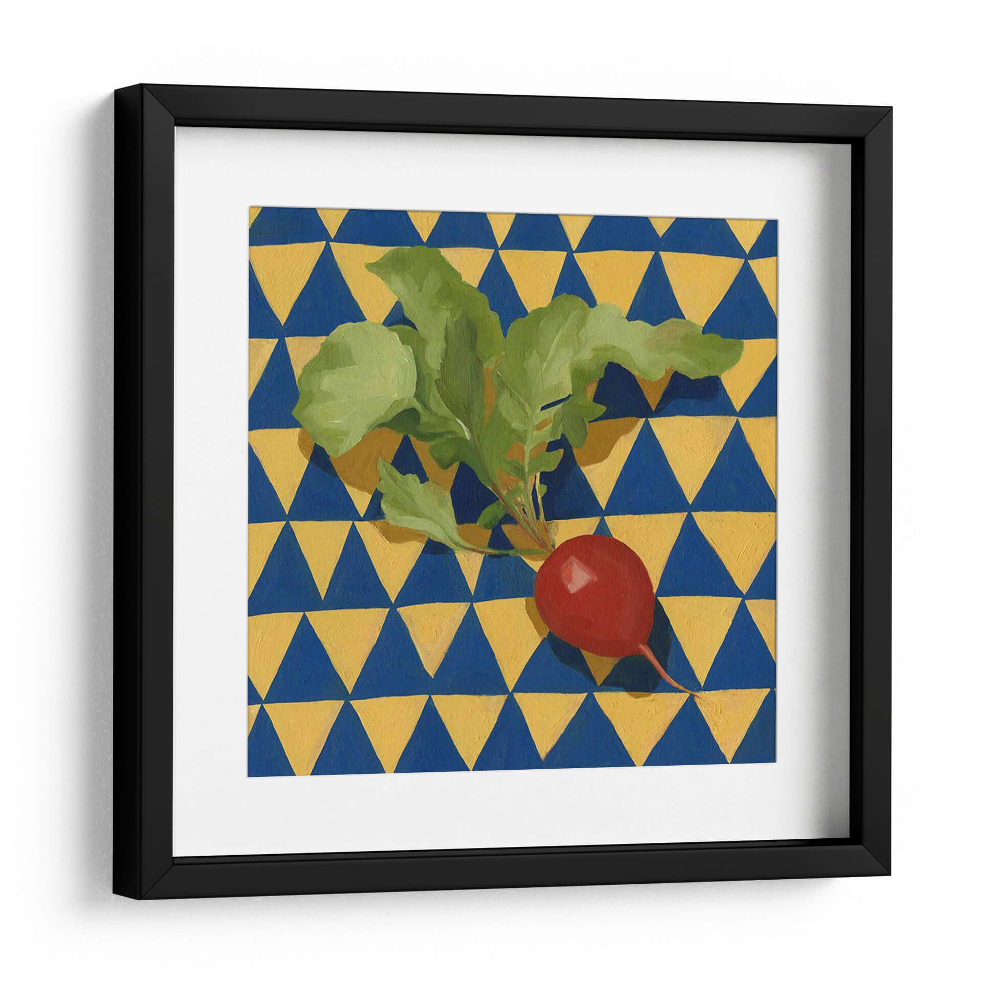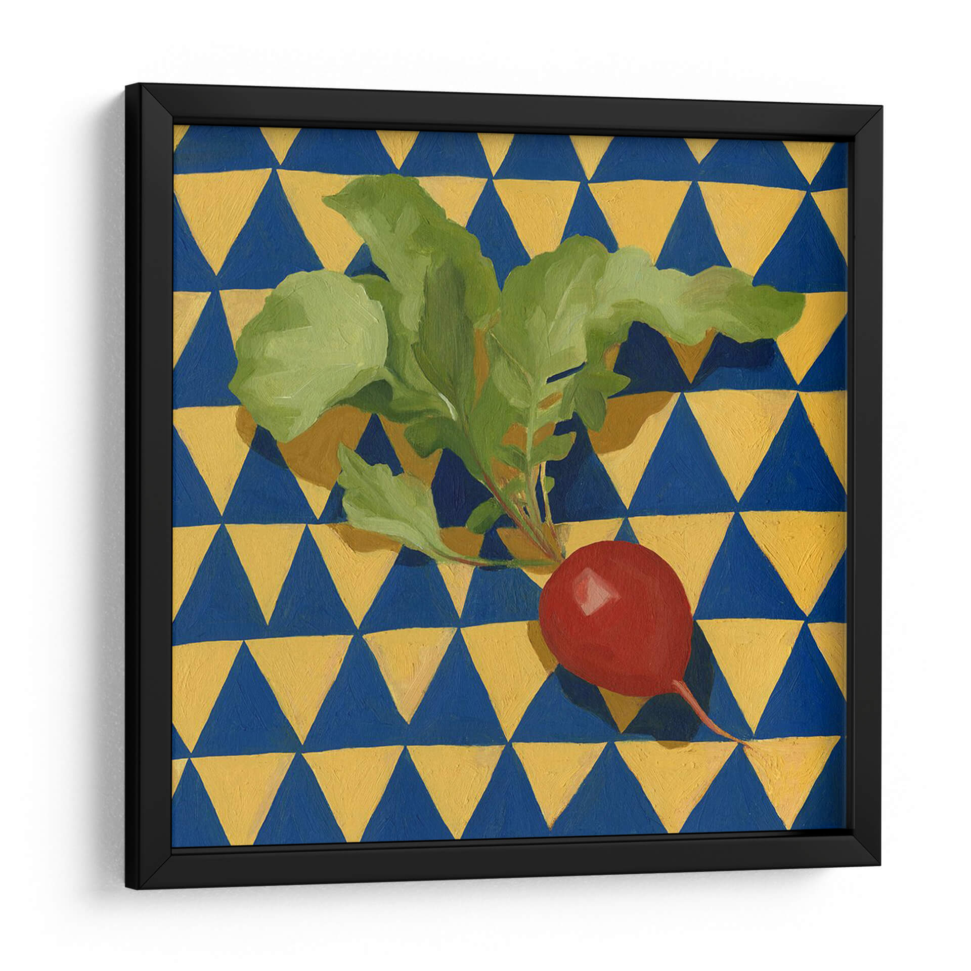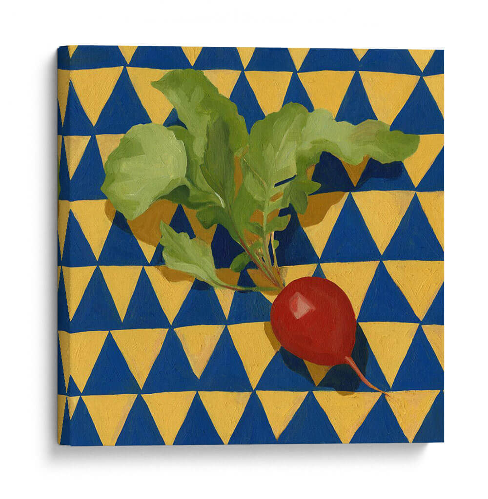 Embellezca su espacio con "Geo Vegetes II", una obra de arte cautivadora de Emma Scarvey. Esta pieza presenta un vibrante rábano rojo con sus hojas verdes frescas, posado sobre un fondo geométrico audaz de triángulos azules y amarillos. La composición crea un contraste llamativo entre lo orgánico y lo abstracto, lo que la convierte en un punto focal dinámico para cualquier habitación. Los colores vivos y el patrón repetitivo infunden energía y un toque de fantasía a la decoración de su hogar u oficina. El estilo de Scarvey, que combina elementos de la naturaleza muerta con un diseño gráfico moderno, resulta en una obra de arte única que desafía las convenciones. Este cuadro decorativo es perfecto para quienes buscan añadir un toque de color y personalidad a sus paredes, evocando sensaciones de vitalidad y frescura. Imagínese este cuadro aportando alegría a su cocina, un toque de color a su sala de estar, o un acento moderno a su estudio. "Geo Vegetes II" es más que una simple imagen; es una declaración de estilo que transforma un espacio ordinario en algo extraordinario.