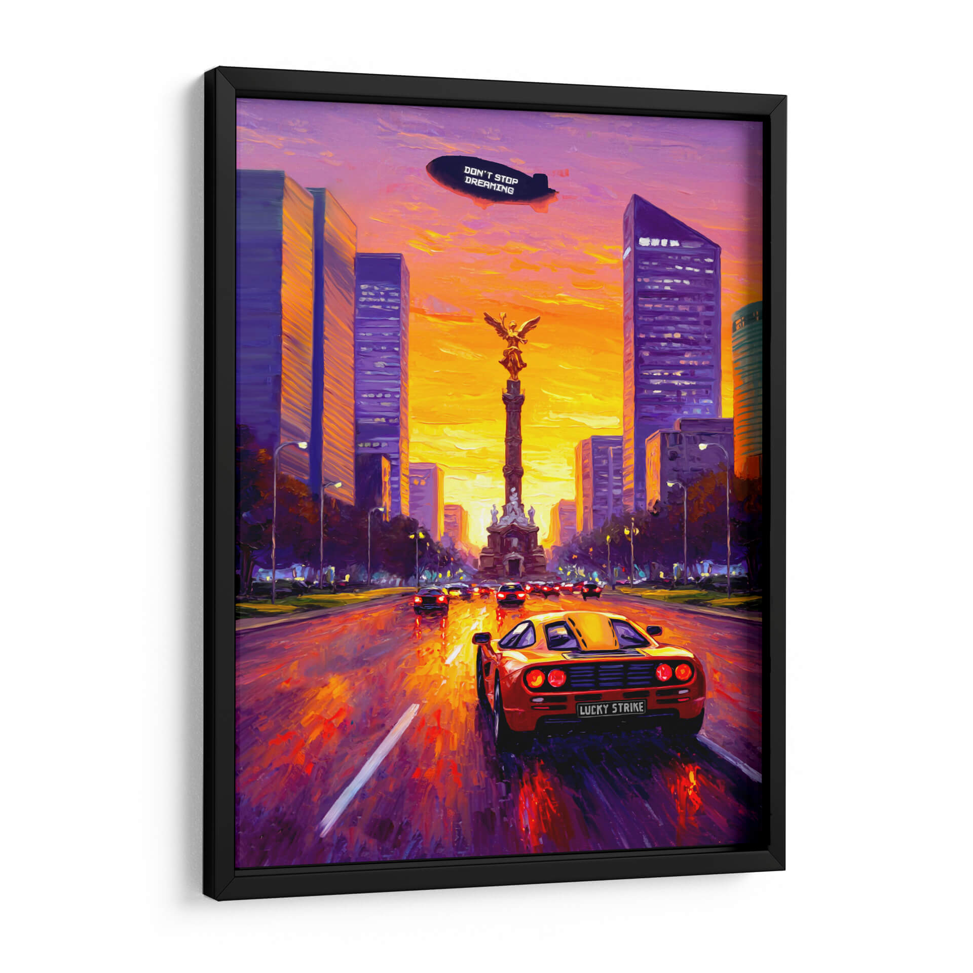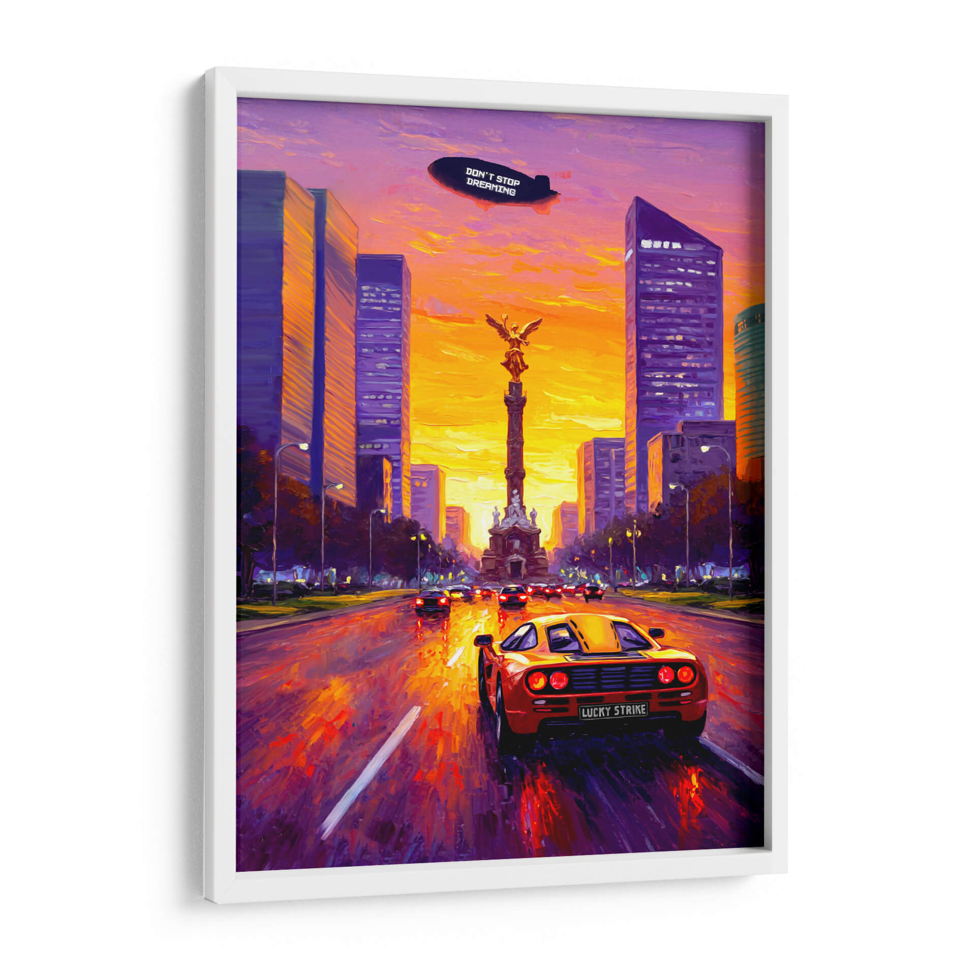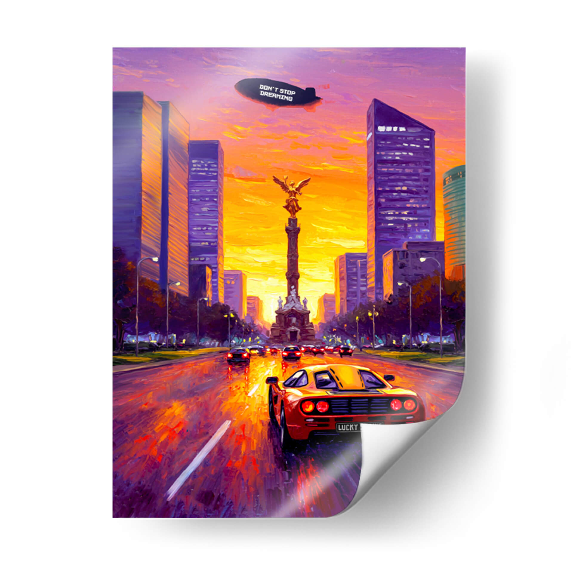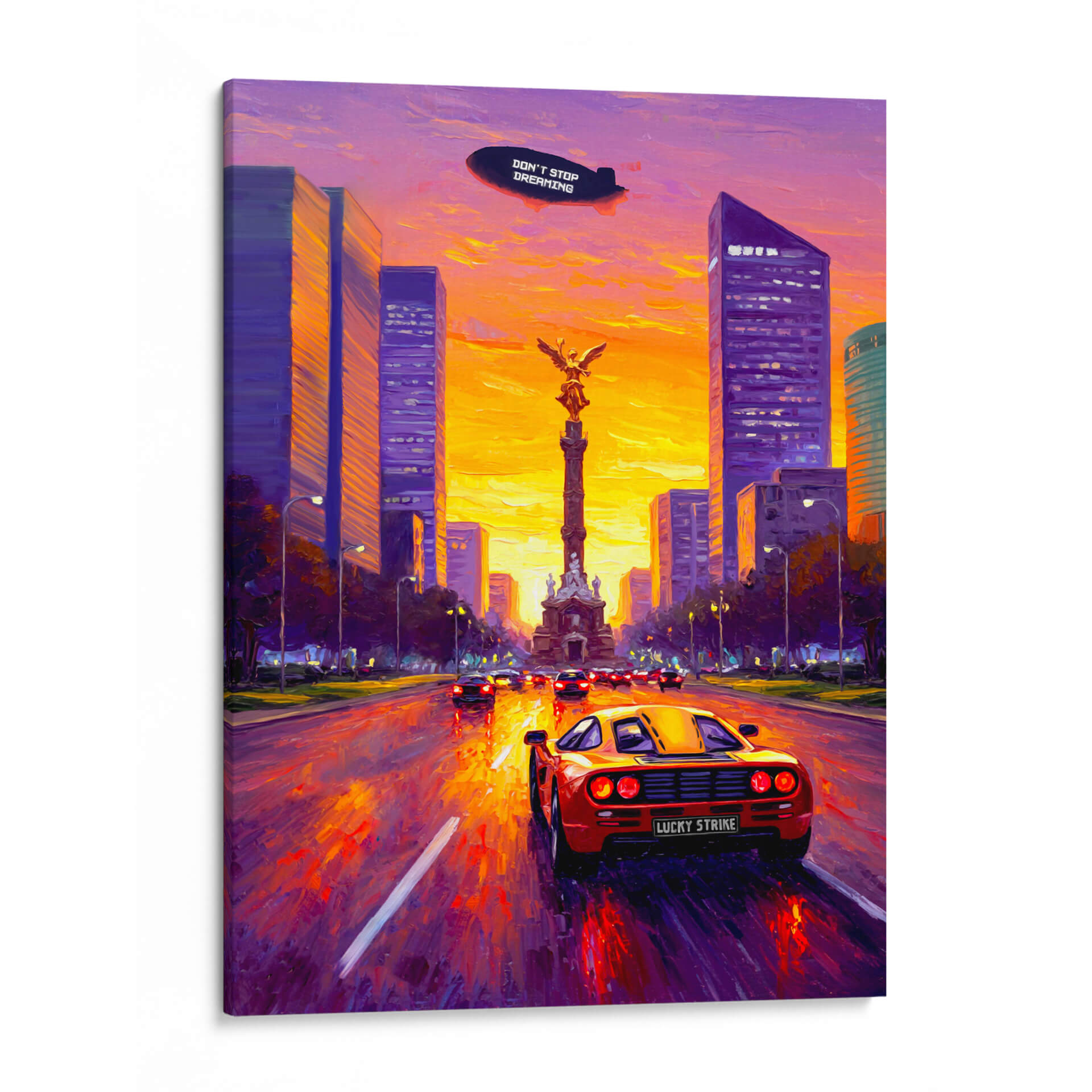 Emb rque en un viaje futurista con "Soñando en San Peter", una obra de arte digital que captura la esencia de la aventura y la visión de futuro. Este cuadro decorativo presenta un ic uevo coche deportivo de los a ios 80, con sus puertas de alas de gaviota abiertas, en pleno movimiento por una carretera que se pierde en el horizonte de una ciudad futurista al atardecer. La paleta de colores vibrantes, dominada por tonos anaranjados, rojos intensos y azules profundos del cielo estrellado, crea una atm oldsfera din mica y en erg ica. Las siluetas estilizadas de los rascacielos y un puente de dise o moderno contrastan con la majestuosidad de las monta ias al fondo, evocando un sentido de ambici <0xC3><0xB3>n y descubrimiento. Un dirigible en el cielo con el lema "DON'T STOP DREAMING" refuerza el mensaje inspirador de la pieza. Ideal para espacios que buscan un toque de nostalgia retro-futurista y un impulso a la imaginaci <0xF3>n, como salas de estar, oficinas o estudios. Este cuadro decorativo es perfecto para los amantes de la ciencia ficci <0xF3>n, el dise o automotriz y las visiones audaces del ma <0xC3><0xB1>ana.