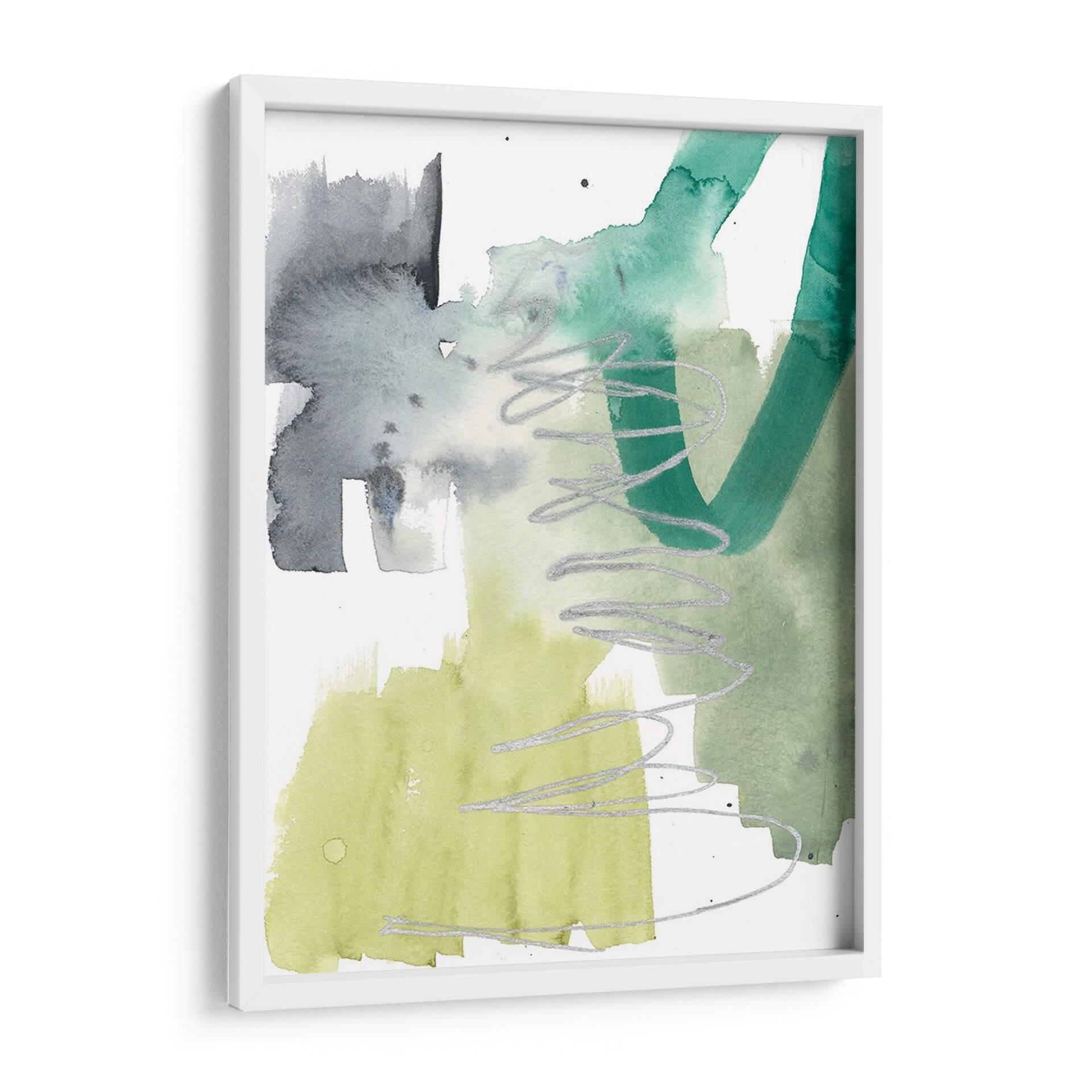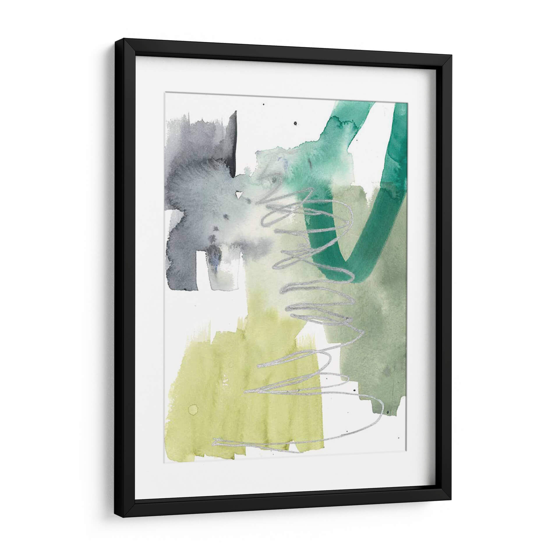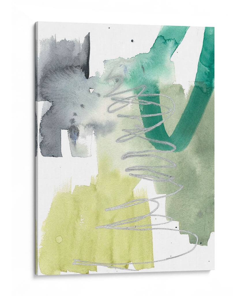 Sumérgete en la vibrante energía de 'Graffiti Green IV', una obra de arte contemporáneo que fusiona la expresividad del graffiti con la delicadeza de la acuarela. Jennifer Goldberger crea una composición dinámica donde bloques de color verde esmeralda, verde lima y grises profundos interactúan con trazos plateados fluidos, evocando una sensación de movimiento y espontaneidad. La técnica de acuarela aporta una luminosidad etérea, mientras que las líneas audaces añaden un toque urbano y moderno. Este cuadro decorativo es perfecto para añadir un acento de color y carácter a cualquier espacio, desde una sala de estar moderna hasta una oficina creativa. Su estilo abstracto invita a la interpretación personal, convirtiéndose en un punto focal que inspira conversación y refleja una personalidad audaz y contemporánea. Añade un toque de arte vanguardista a tu decoración con esta pieza única.